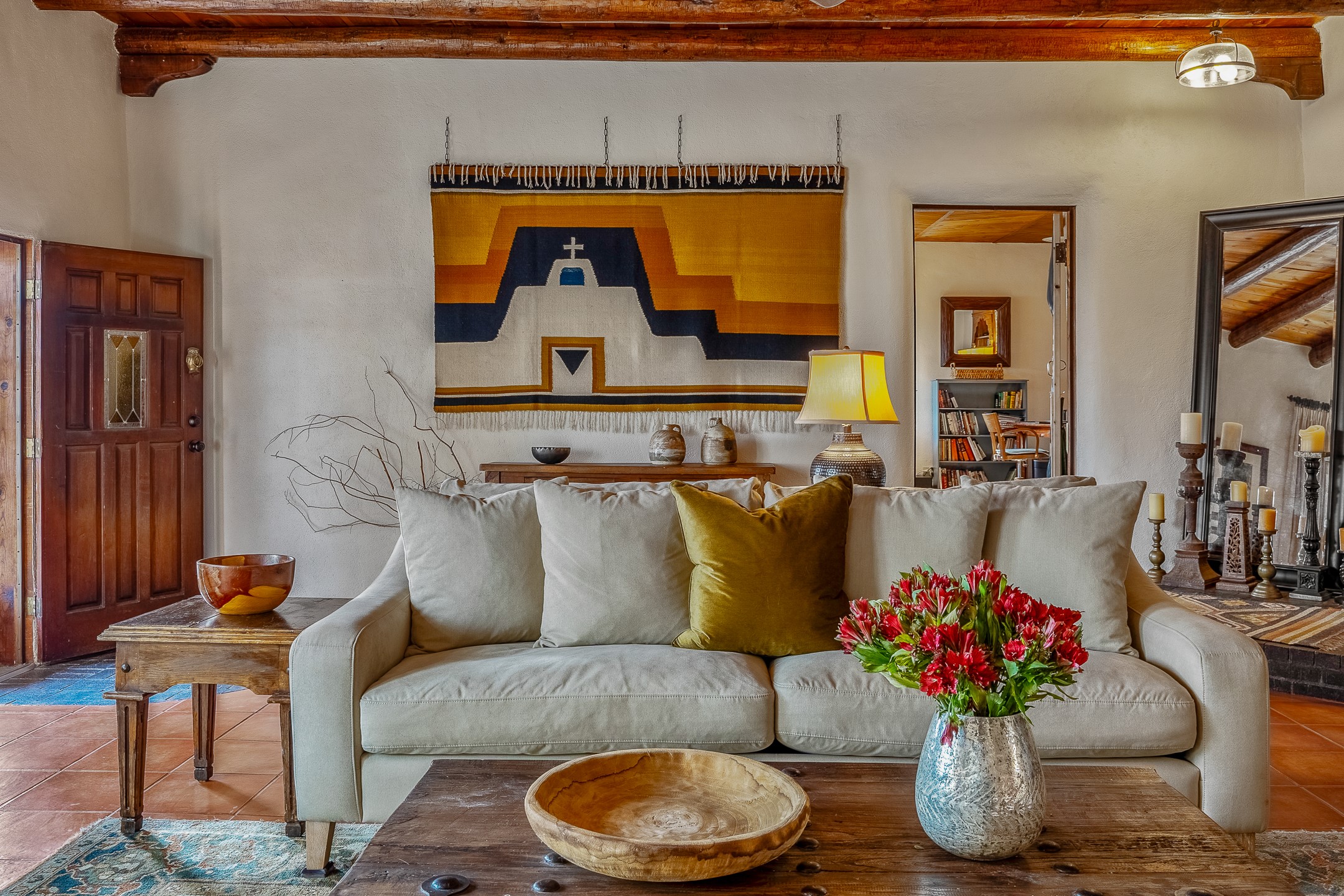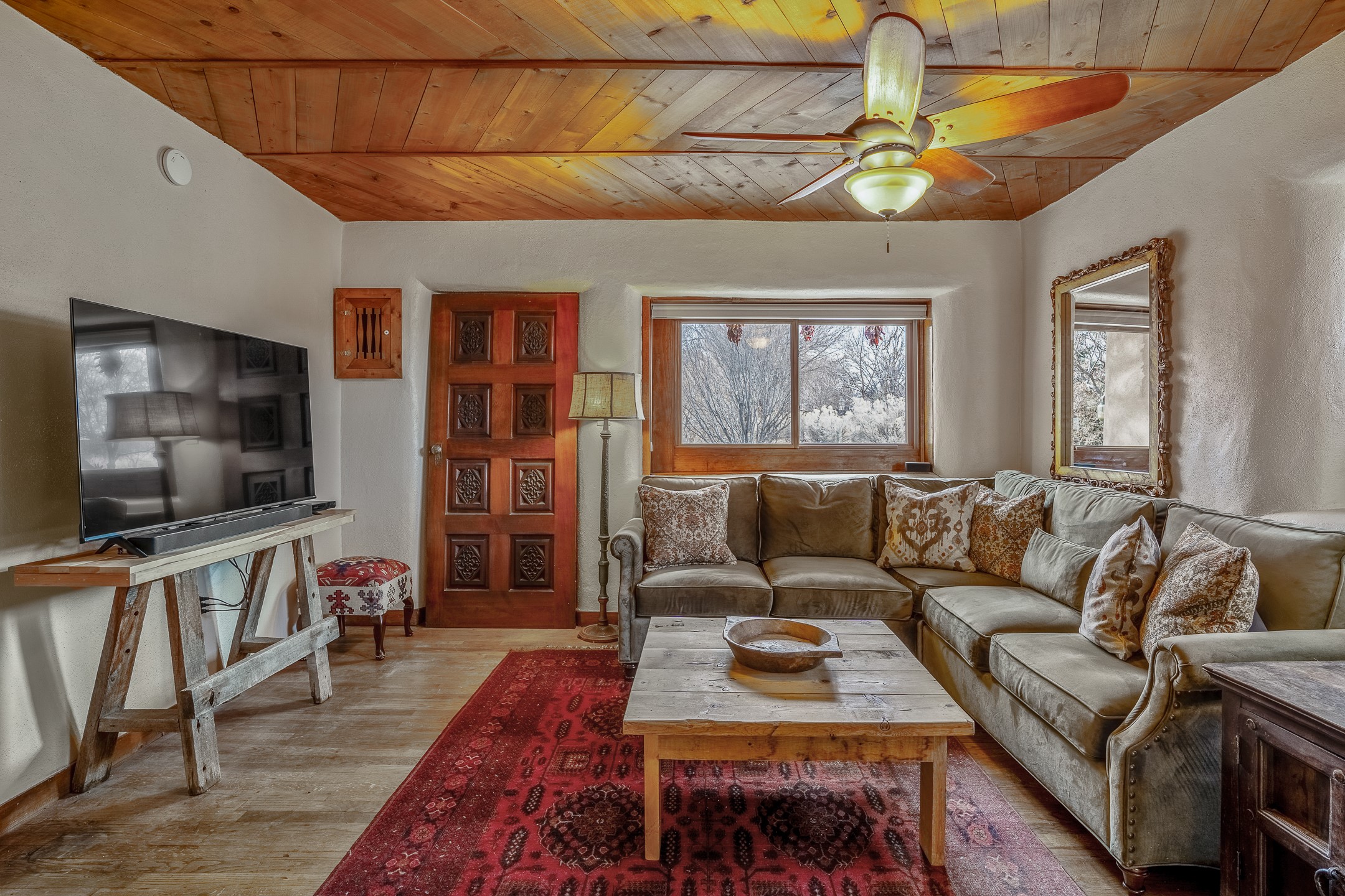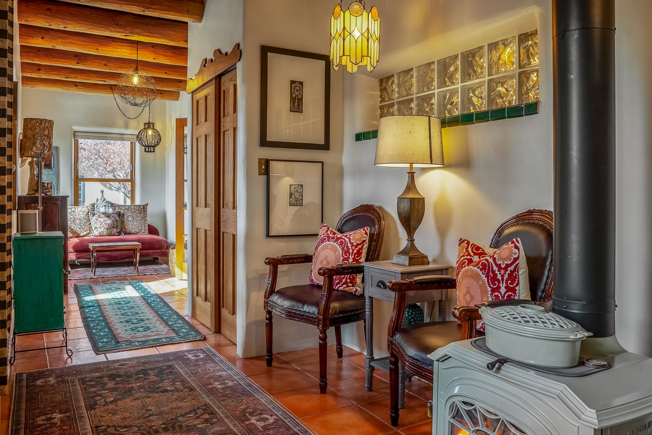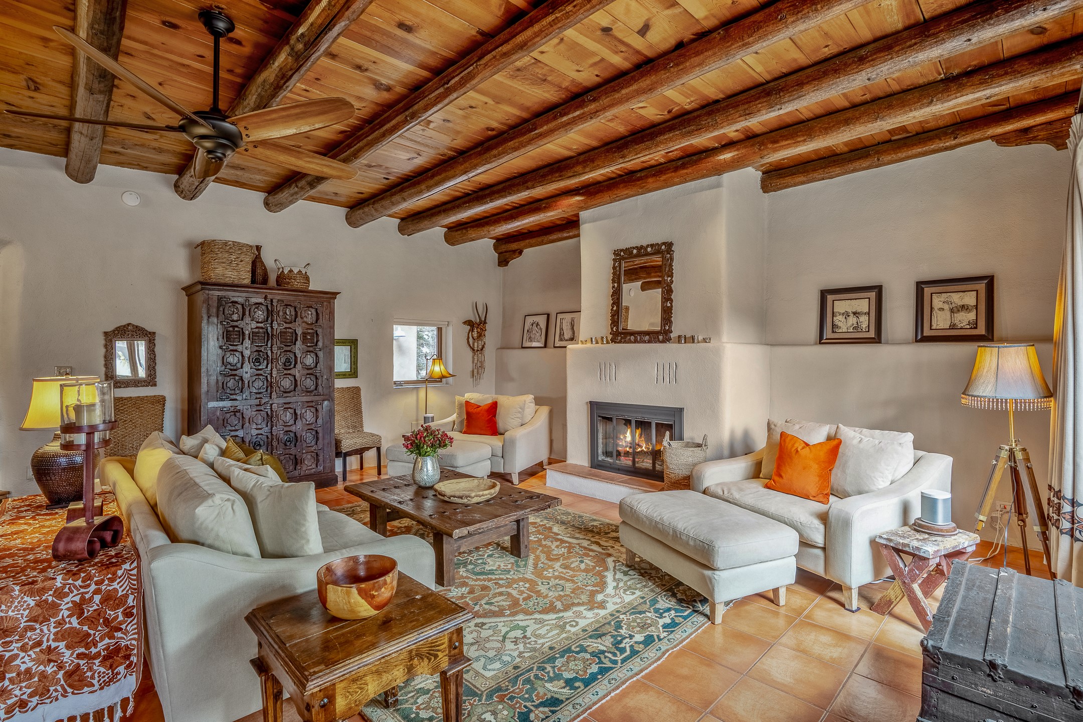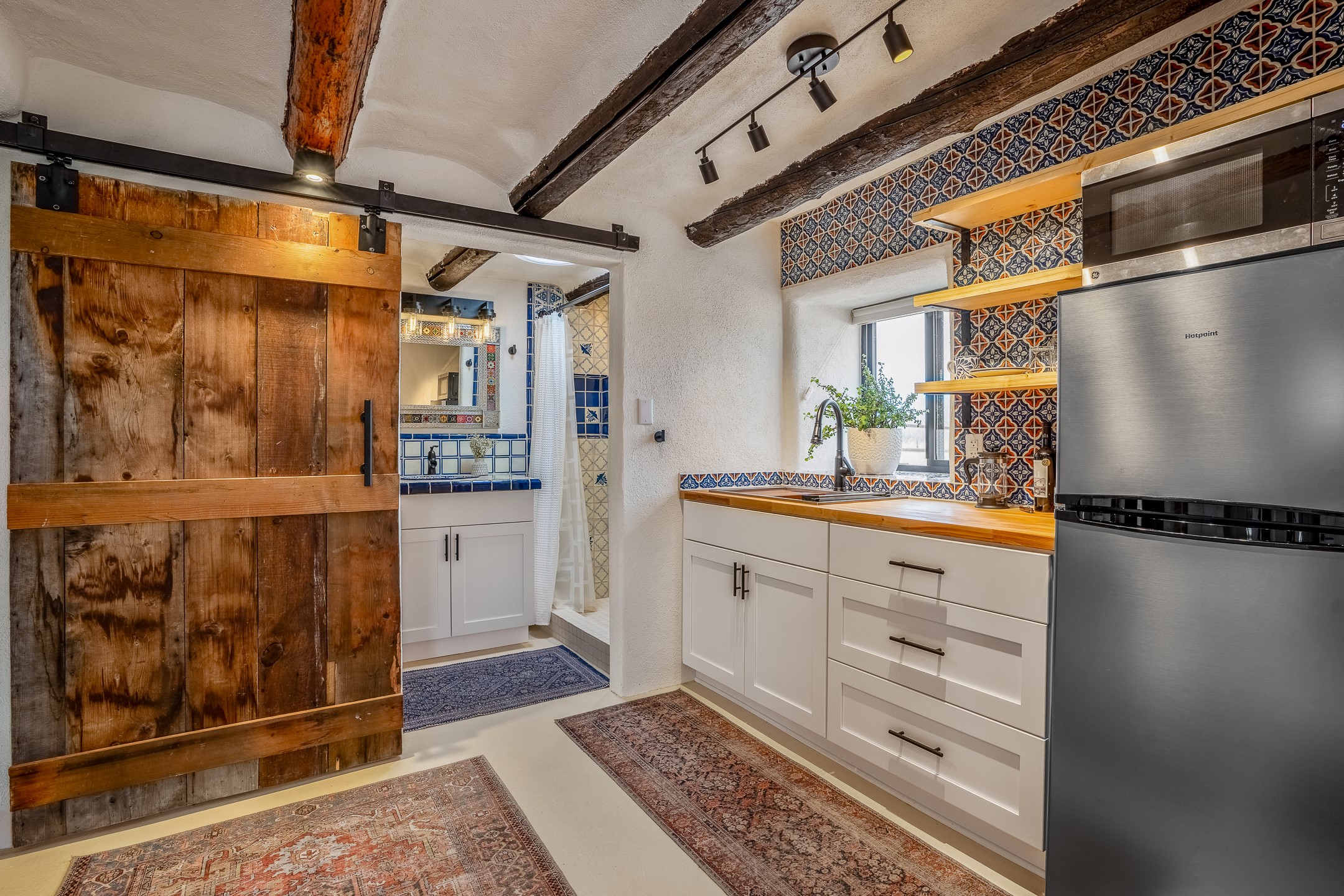 Charming, yet elegant, Alcalde adobe compound just steps from the Rio Grande Bosque. Experience refined farm living in this meticulously restored northern New Mexico property, which includes a main house, detached casita, and artist studio with a 3-car garage on 4.2 acres--2 acres of which are arable farmland. The acreage stretches from the Acequia de Alcalde to the Rio Grande Bosque and offers sweeping 180-degree views of the Jemez Mountains, Black Mesa, and the RG Bosque. The 3-bedroom, 2-bath adobe main house dates back to the early 1900s but has undergone thoughtful renovations and system upgrades in 2004 and again between 2022 and 2025. Finishes include vigas, coved ceilings, tile, brick, and wood floors, plus new high-end appliances in the kitchen and laundry. Equally charming is the 1-BD, 1-BA detached casita--perfect for guests or rental income. The double-adobe casita, the oldest structure on the property, was completely reimagined in 2024 and features custom tile work, a functional kitchenette, a new mini-split for heating and cooling, a screened-in porch, and front-row views of the Bosque. The property also includes a 3-car detached garage with an attached artist studio, making this property truly the complete package. The approximately 500 sq. ft. studio is heated and cooled by a mini-split and serves as an ideal space to create--or would serve as a great workshop. The grounds near the residences are landscaped with native grasses, flowers, a variety of fruit trees, and are watered by an 8-zone automated drip irrigation system. Water fountains grace both the front and back of the main house for added ambiance. Additional features include a private well, net-metered solar panels on the main house, and 3-acre feet of acequia water rights. Whether you're seeking an agricultural dream or a lush, retreat from city life, this property offers tranquility and the splendor of northern New Mexico--just 35 minutes from downtown Santa Fe.