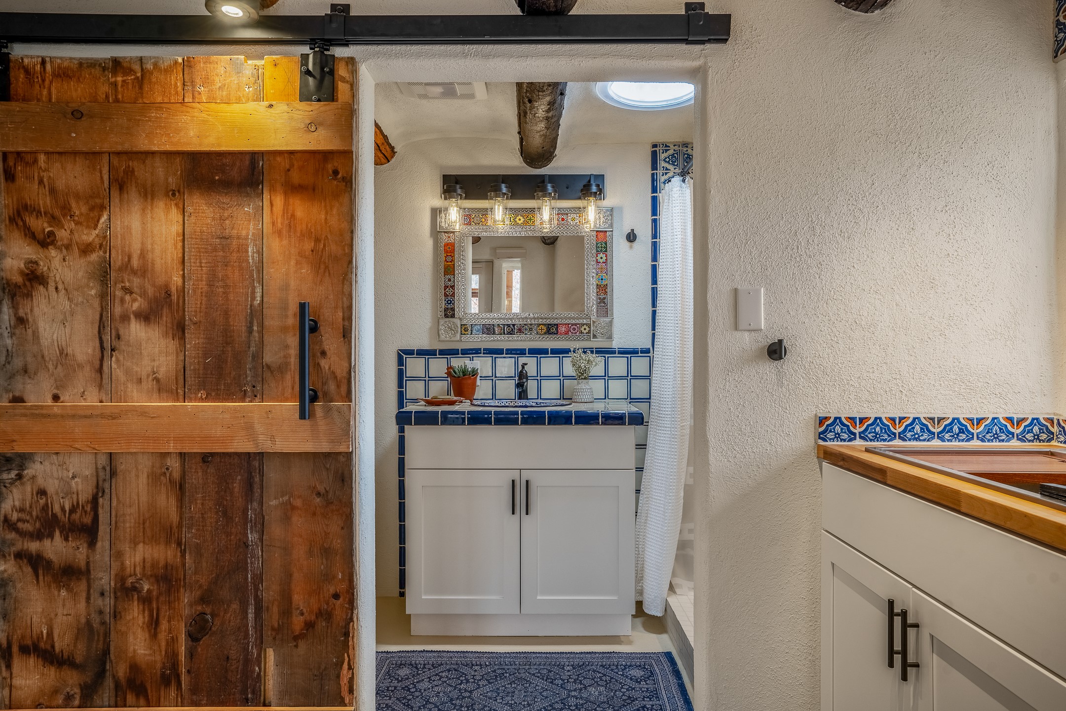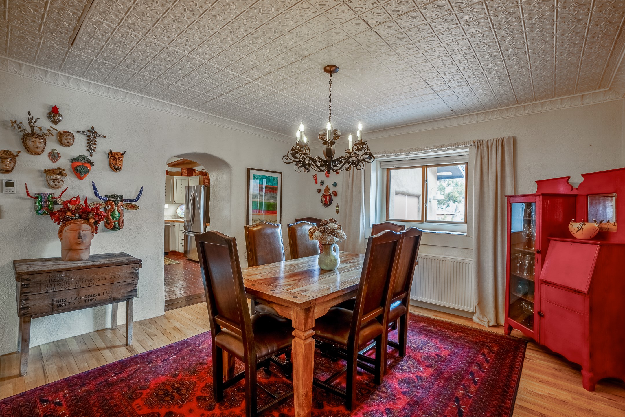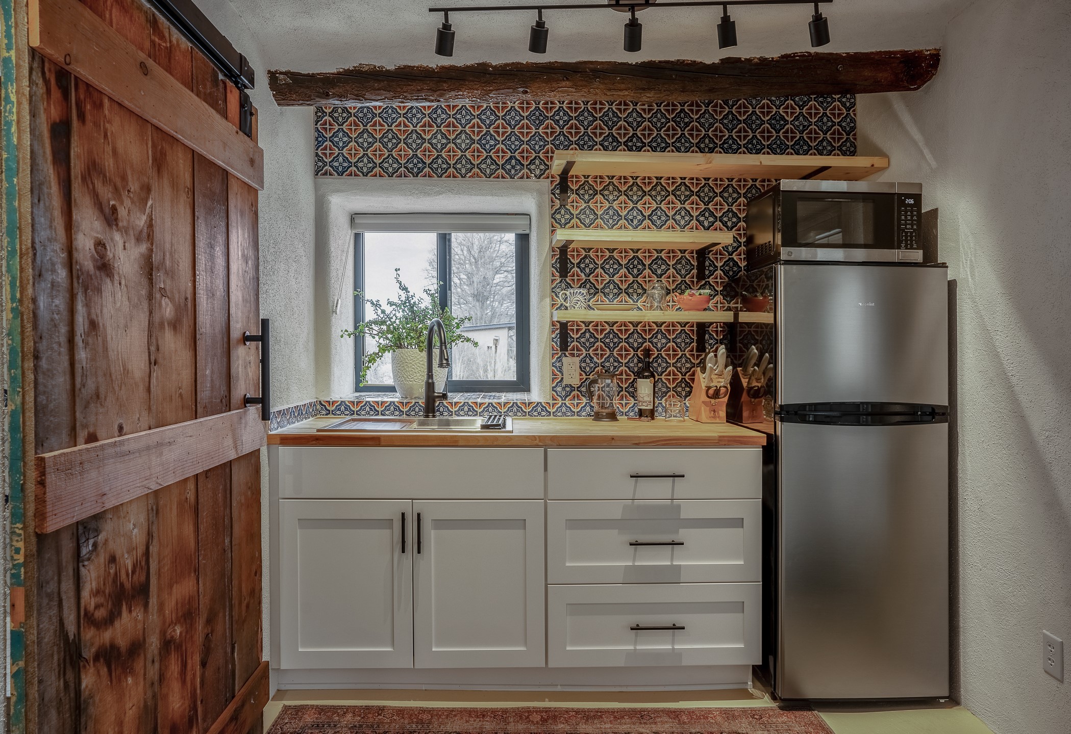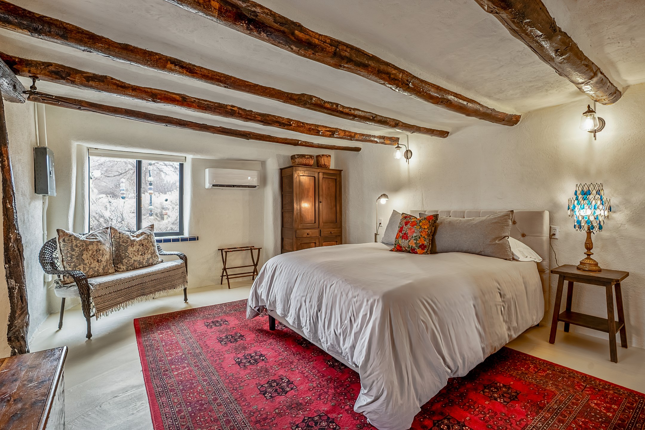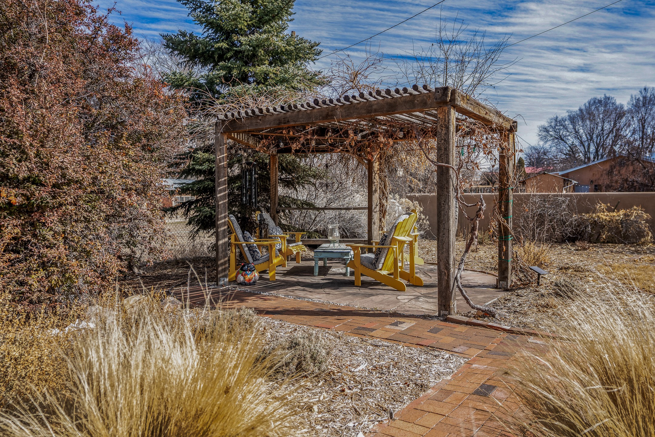 Charming, yet elegant, Alcalde adobe compound just steps from the Rio Grande Bosque. Experience refined farm living in this meticulously restored northern New Mexico property, which includes a main house, detached casita, and artist studio with a 3-car garage on 4.2 acres--2 acres of which are arable farmland. The acreage stretches from the Acequia de Alcalde to the Rio Grande Bosque and offers sweeping 180-degree views of the Jemez Mountains, Black Mesa, and the RG Bosque. The 3-bedroom, 2-bath adobe main house dates back to the early 1900s but has undergone thoughtful renovations and system upgrades in 2004 and again between 2022 and 2025. Finishes include vigas, coved ceilings, tile, brick, and wood floors, plus new high-end appliances in the kitchen and laundry. Equally charming is the 1-BD, 1-BA detached casita--perfect for guests or rental income. The double-adobe casita, the oldest structure on the property, was completely reimagined in 2024 and features custom tile work, a functional kitchenette, a new mini-split for heating and cooling, a screened-in porch, and front-row views of the Bosque. The property also includes a 3-car detached garage with an attached artist studio, making this property truly the complete package. The approximately 500 sq. ft. studio is heated and cooled by a mini-split and serves as an ideal space to create--or would serve as a great workshop. The grounds near the residences are landscaped with native grasses, flowers, a variety of fruit trees, and are watered by an 8-zone automated drip irrigation system. Water fountains grace both the front and back of the main house for added ambiance. Additional features include a private well, net-metered solar panels on the main house, and 3-acre feet of acequia water rights. Whether you're seeking an agricultural dream or a lush, retreat from city life, this property offers tranquility and the splendor of northern New Mexico--just 35 minutes from downtown Santa Fe.