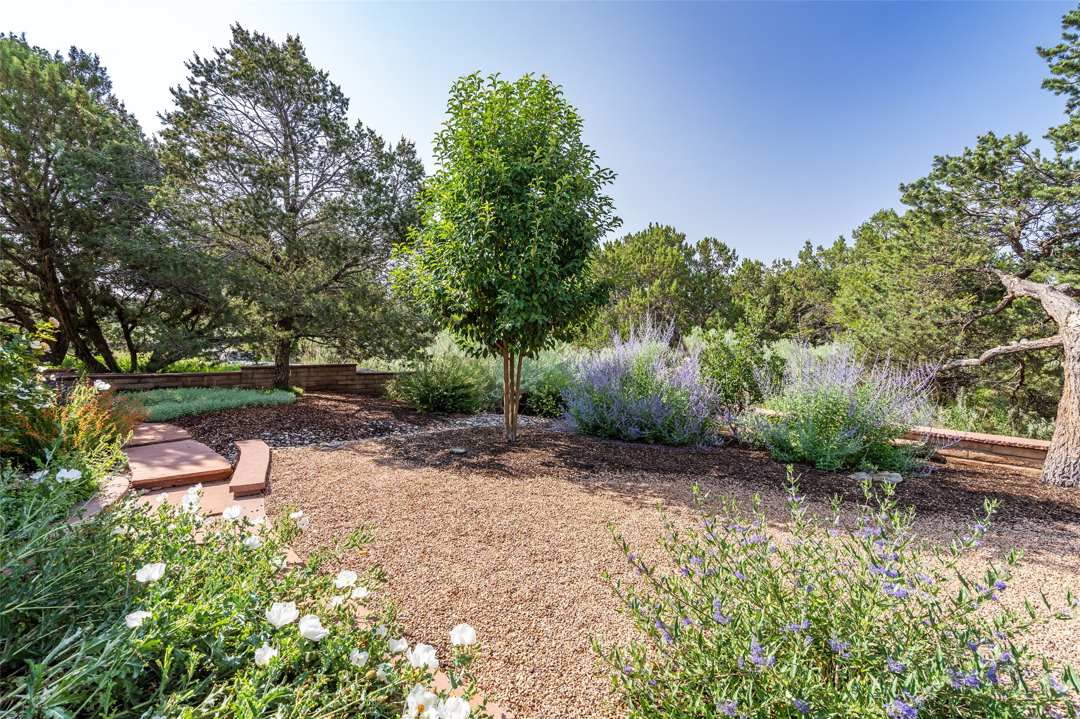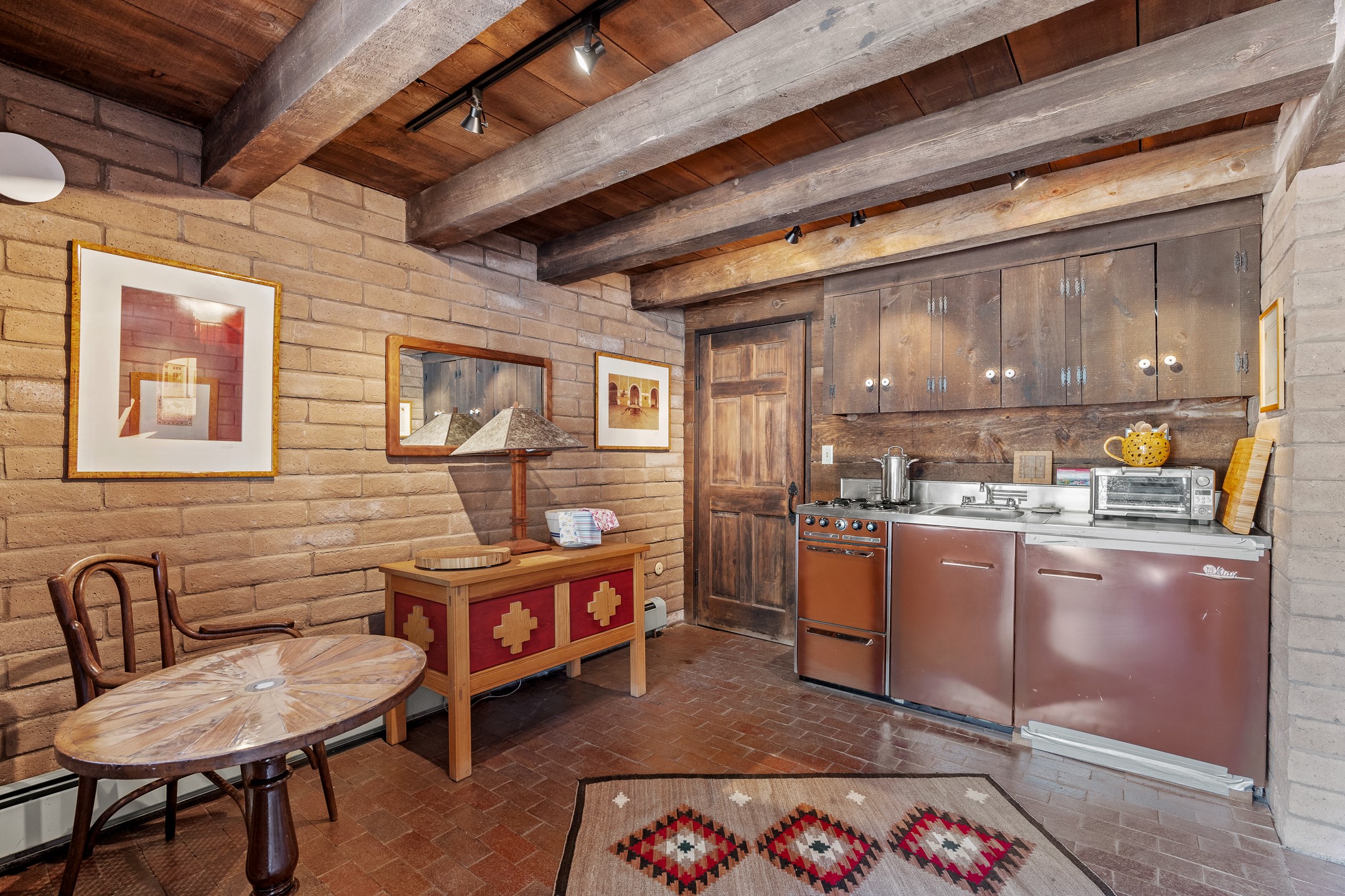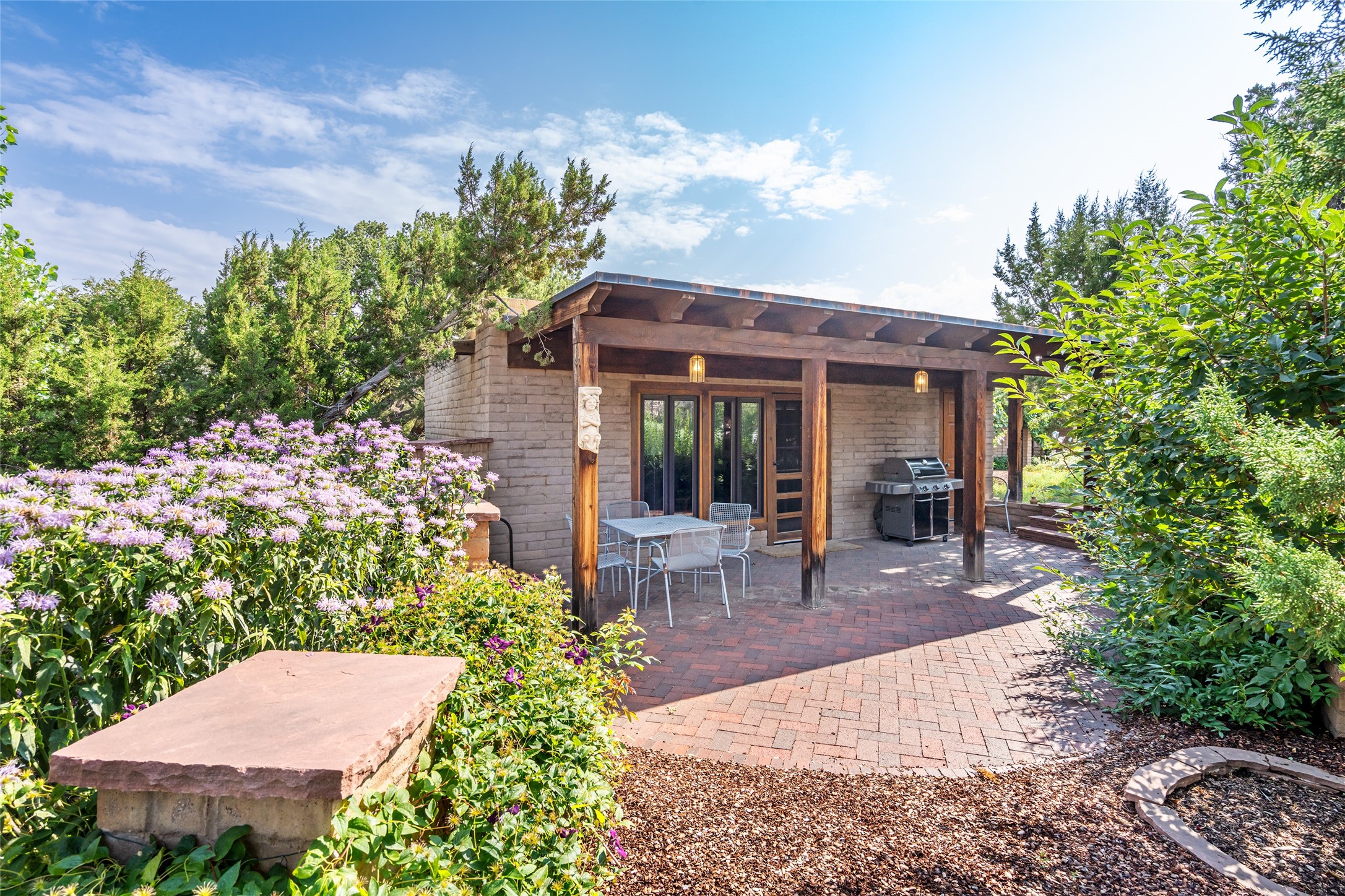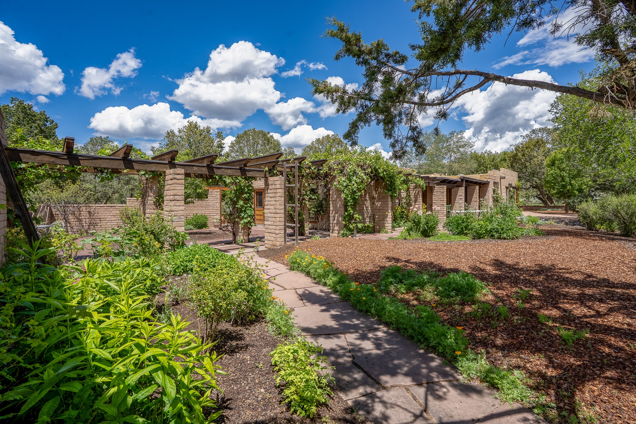 Nestled on 1.46 acres in the coveted Sol Y Lomas neighborhood, this exceptional property blends the earthy beauty of the Southwest with organic lines reminiscent of Frank Lloyd Wright. Thoughtfully curated by a master gardener, the grounds bloom with color and life--an oasis of natural wonder. Lovingly owned by the same family since 1978, the property includes an updated 2-bedroom, 2-bathroom main house (2,063 sq. ft.) and a charming 1-bedroom, 1-bathroom guest house (563 sq. ft.), connected by a breezeway draped in grapevines. Inside the main house, brick flooring and beamed ceilings carry a sense of grounded elegance throughout. At the heart of the home is the kitchen, with open shelving that connects seamlessly to the generous dining and sitting areas--perfect for casual gatherings or quiet evenings. The main living room, with views of the lush front courtyard, is anchored by a wood-burning fireplace and exudes warmth and comfort. The primary suite also features a fireplace and direct access to the western patio, inviting you to enjoy the surrounding beauty. Its bathroom is filled with natural light and includes a sculpted vessel soaking tub and a glass-walled walk-in shower. The guest bedroom, currently used as an office, offers yet another fireplace and the same warm, organic charm. The guest house feels like a step back in time, with its vintage full kitchen, spacious bedroom with ensuite bath, and access to a private patio--ideal for guests or creative retreat space. With timeless presence and inspired design, this remarkable property is a sanctuary of comfort, natural elegance, and casual sophistication.