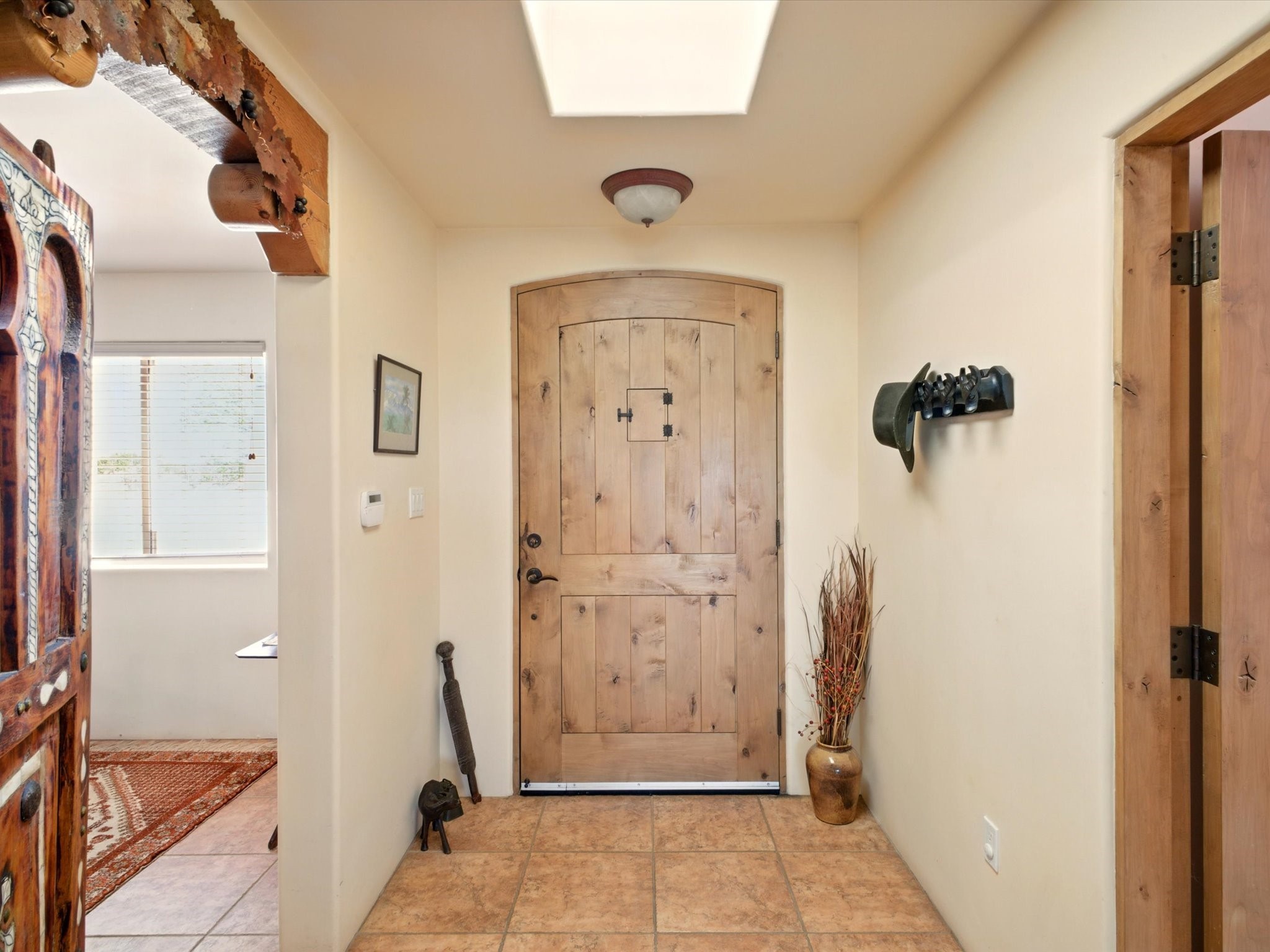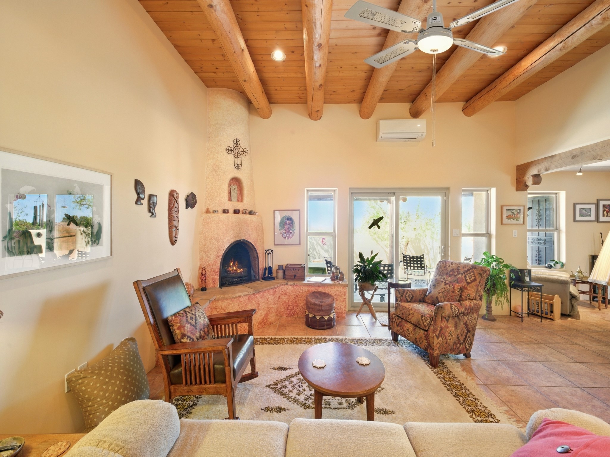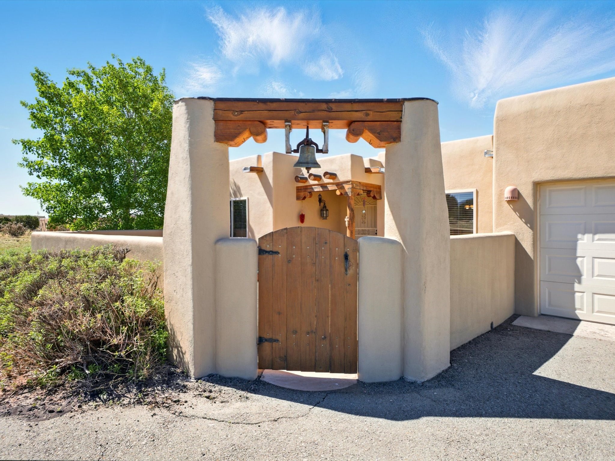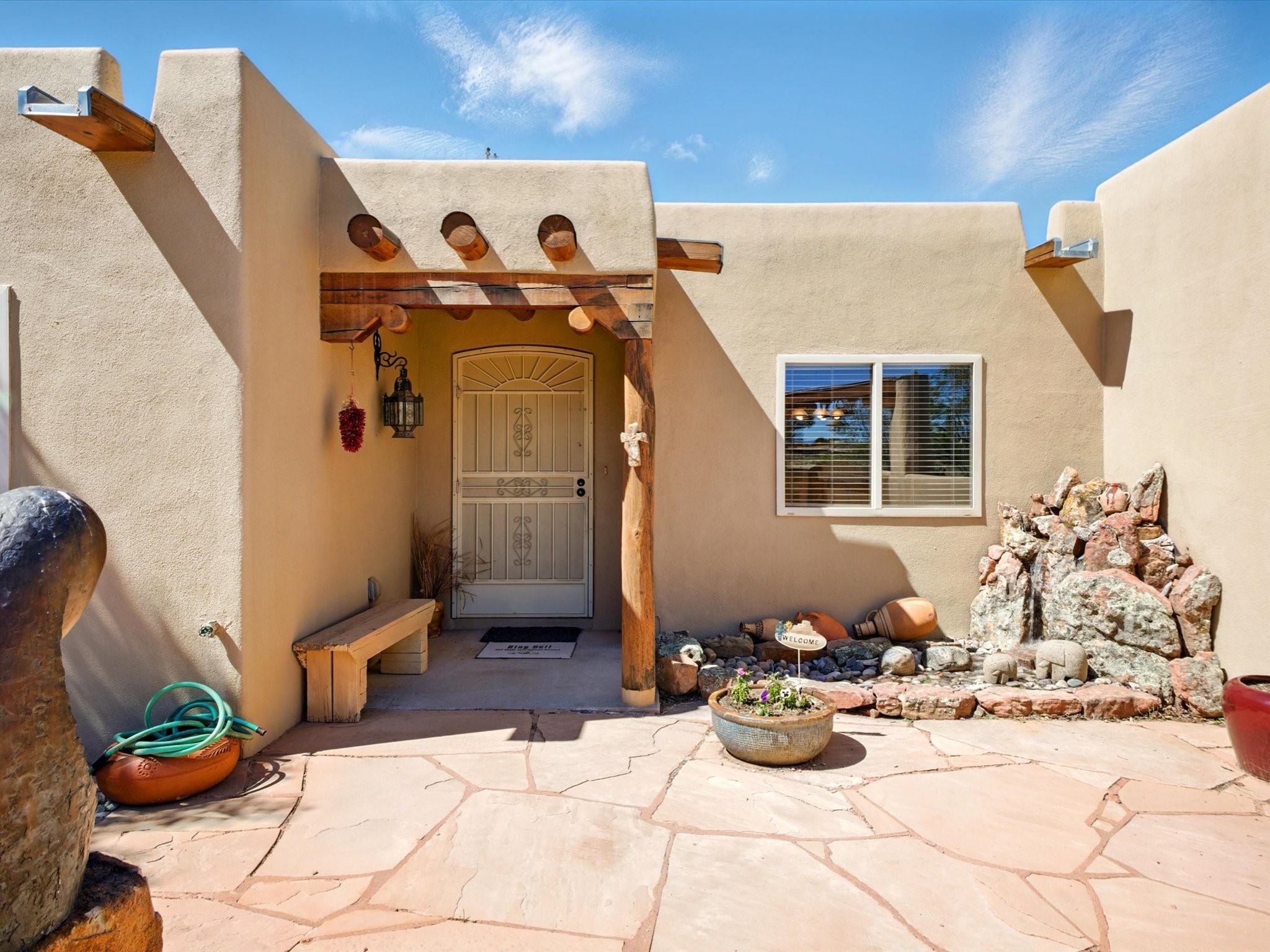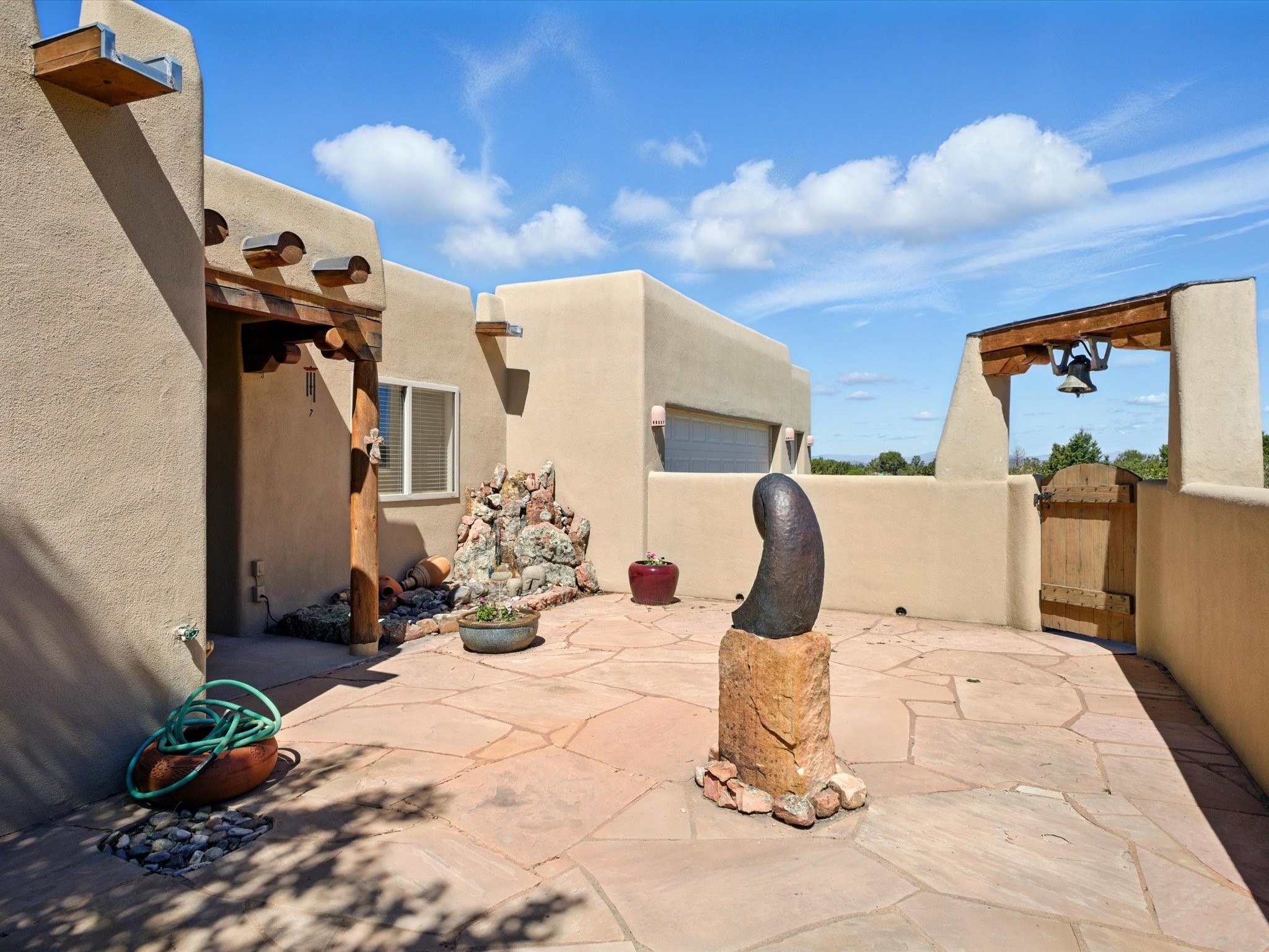 A Serene Santa Fe Artist Retreat set on 1.26 acres in the desirable Eldorado community. This stunning 3-bedroom, 2.5 bath home with a dedicated office for remote work offers the perfect blend of Southwestern charm and modern comfort. Inside, you'll find rich wood interior doors, vigas, beams and a classic kiva fireplace to create an atmosphere of warmth and relaxation. Skylights throughout the home invite an abundance of natural light. The spacious 3-car garage includes a unique 374 sq ft attached heated and air conditioned artist studio with sink-perfect for painting, crafting, mixed media or extra living space. Be a part of the vibrant, art-loving Eldorado community and thriving Eldorado Studio Tour every September. Outside, take in dramatic sunset views of the Jemez Mountains on the back portal. Enjoy the tranquil sounds of the custom water feature along with the sculpture of the late local artist Timothy Roundy and Sangre de Cristo views in the front courtyard, all set against the backdrop of Santa Fe's iconic high desert landscape. Don't miss this opportunity to own a thoughtfully designed home that celebrates the beauty of Northern New Mexico. Recently reduced - offered as-is at this new price point, presenting a great opportunity.