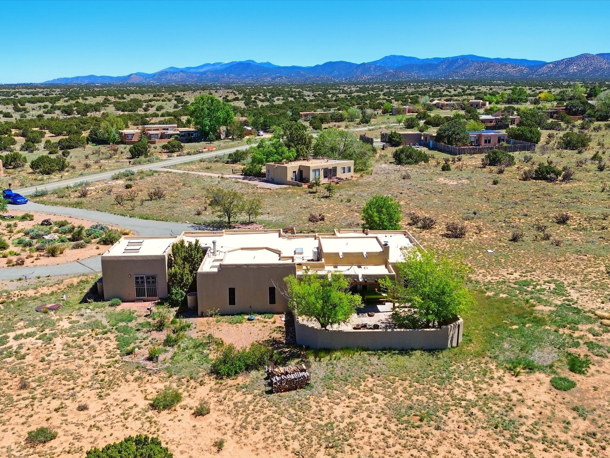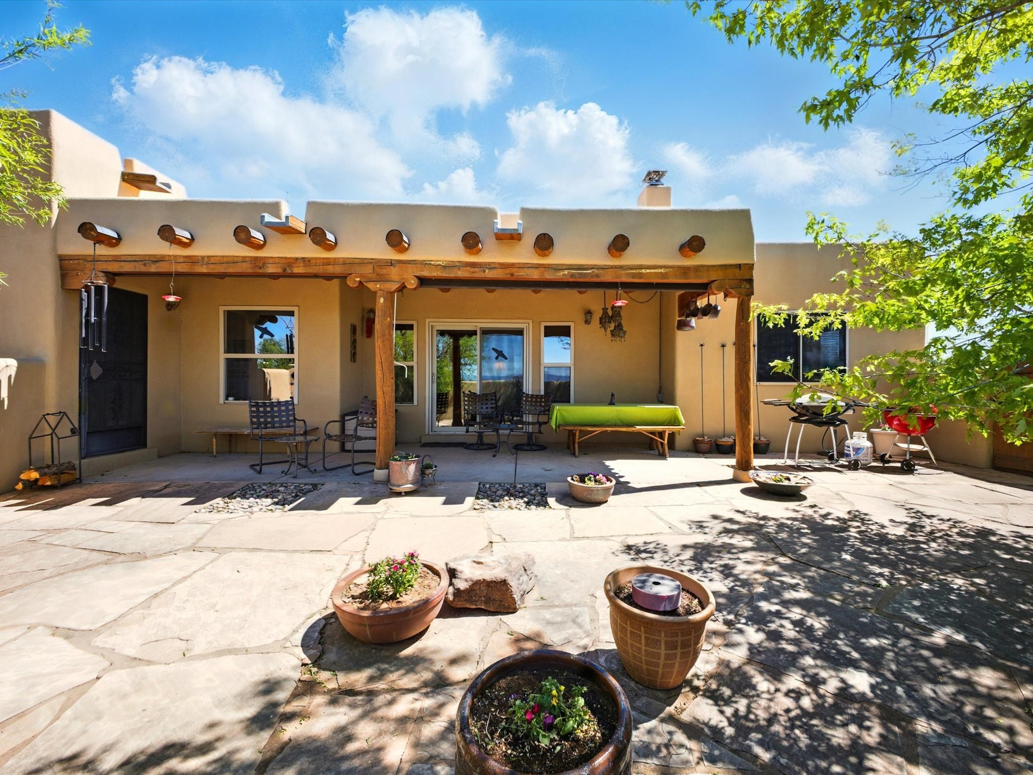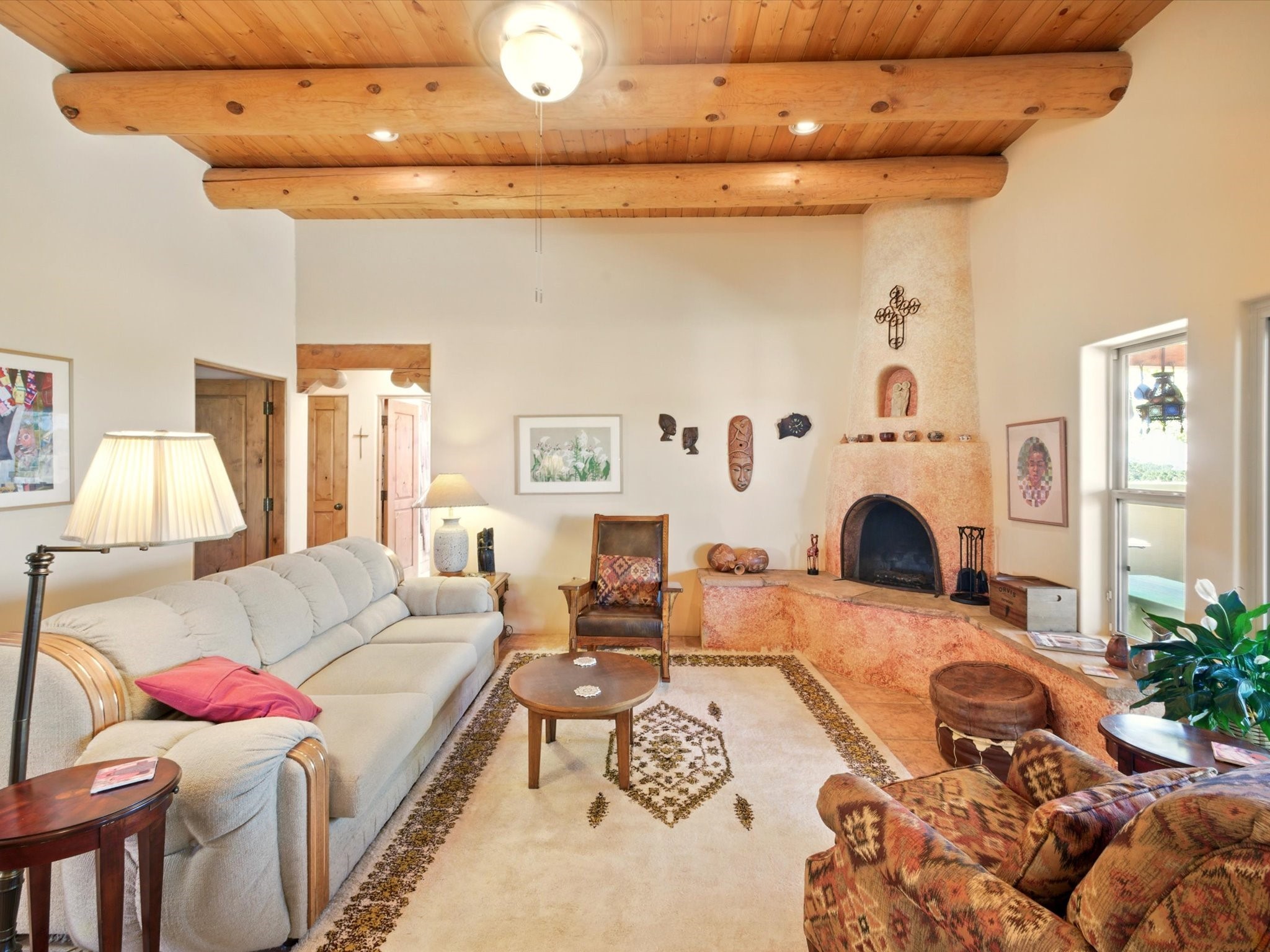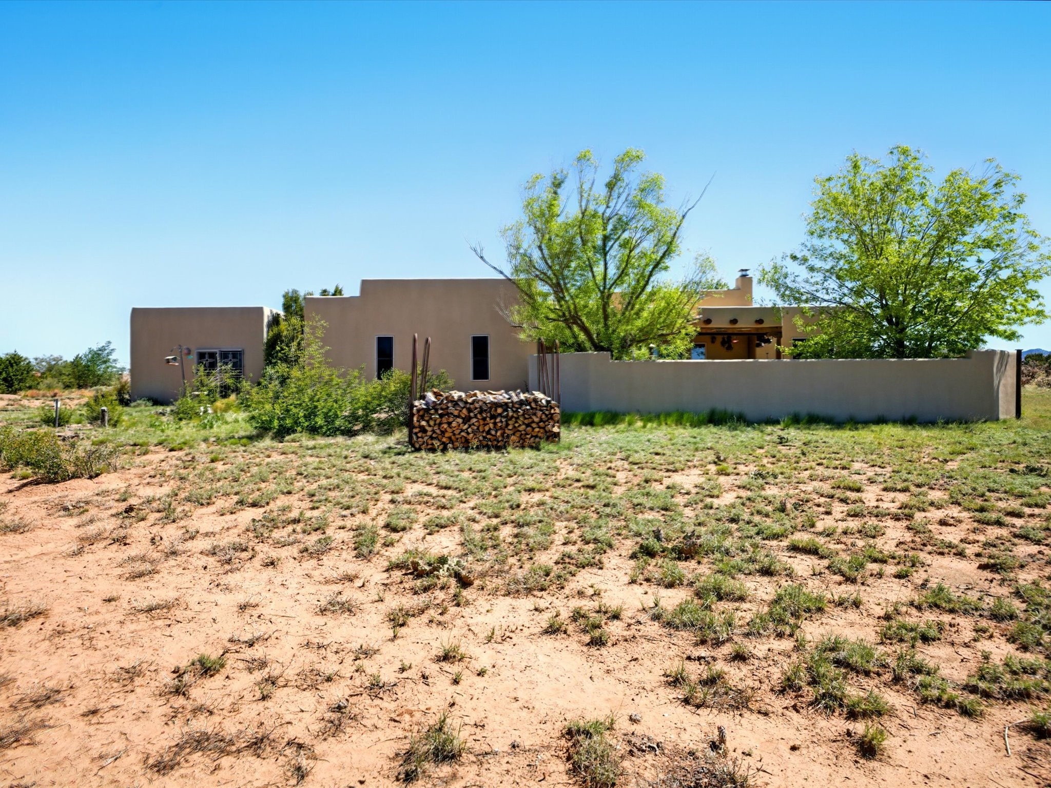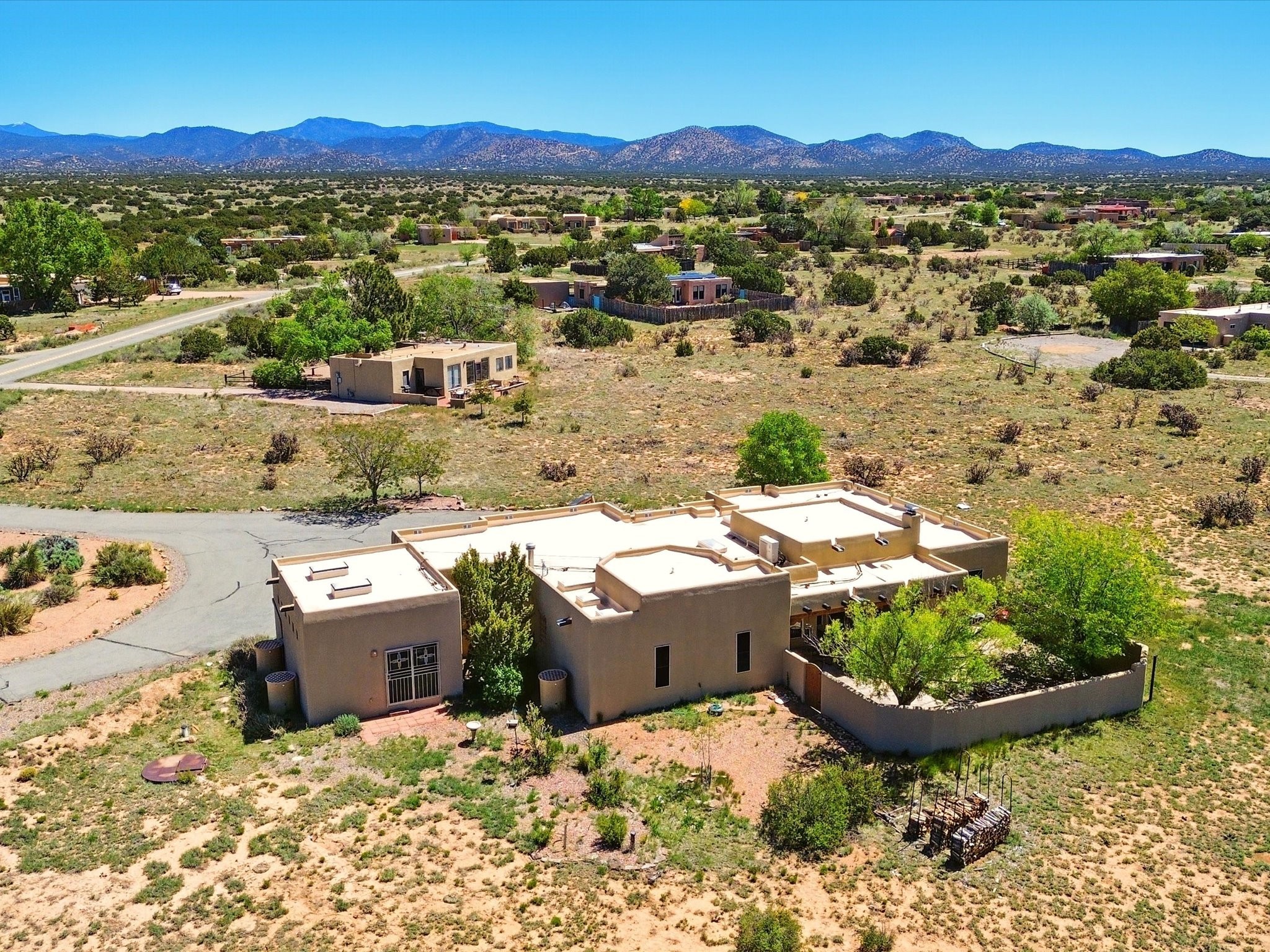 A Serene Santa Fe Artist Retreat set on 1.26 acres in the desirable Eldorado community. This stunning 3-bedroom, 2.5 bath home with a dedicated office for remote work offers the perfect blend of Southwestern charm and modern comfort. Inside, you'll find rich wood interior doors, vigas, beams and a classic kiva fireplace to create an atmosphere of warmth and relaxation. Skylights throughout the home invite an abundance of natural light. The spacious 3-car garage includes a unique 374 sq ft attached heated and air conditioned artist studio with sink-perfect for painting, crafting, mixed media or extra living space. Be a part of the vibrant, art-loving Eldorado community and thriving Eldorado Studio Tour every September. Outside, take in dramatic sunset views of the Jemez Mountains on the back portal. Enjoy the tranquil sounds of the custom water feature along with the sculpture of the late local artist Timothy Roundy and Sangre de Cristo views in the front courtyard, all set against the backdrop of Santa Fe's iconic high desert landscape. Don't miss this opportunity to own a thoughtfully designed home that celebrates the beauty of Northern New Mexico. Recently reduced - offered as-is at this new price point, presenting a great opportunity.