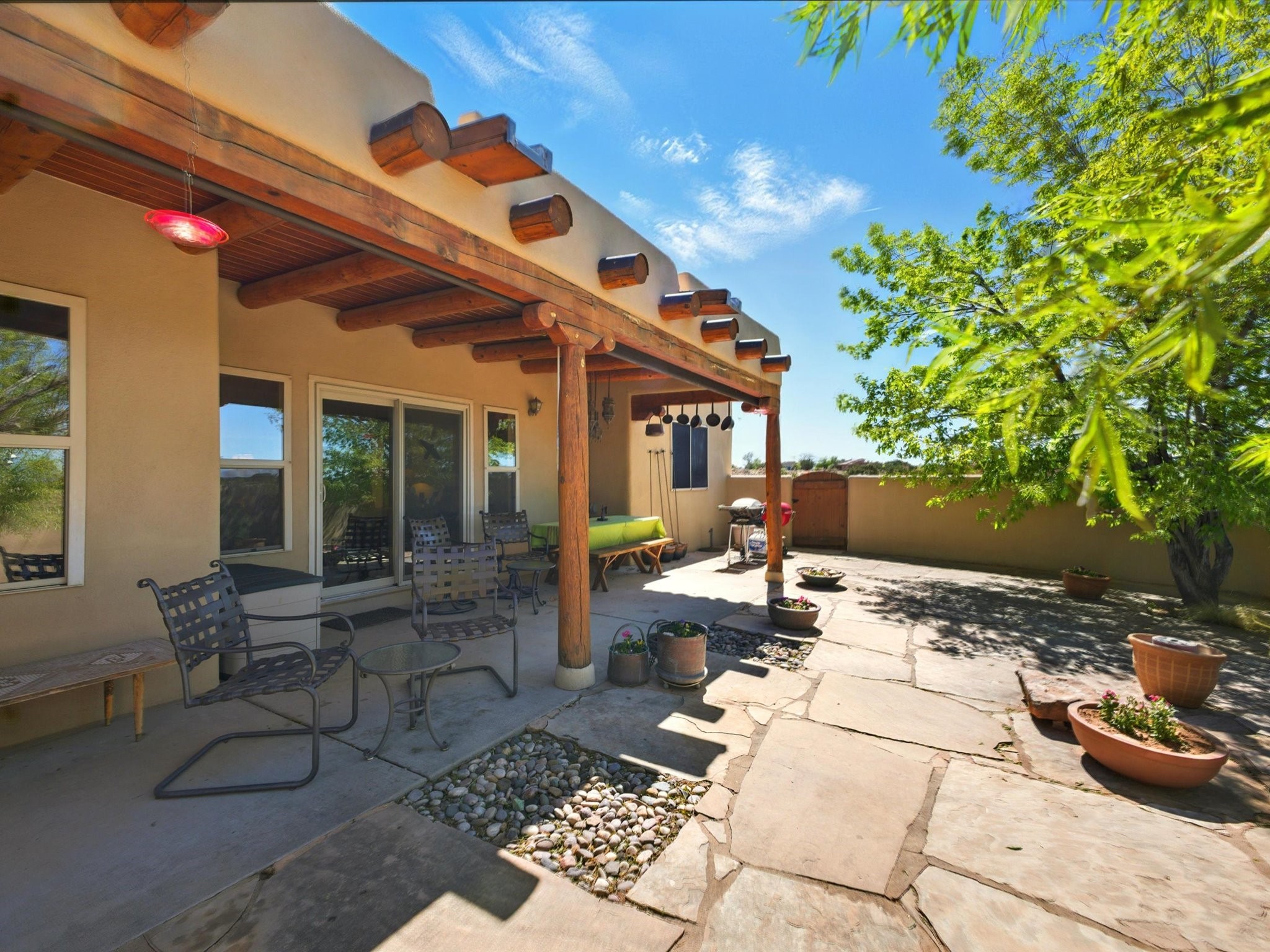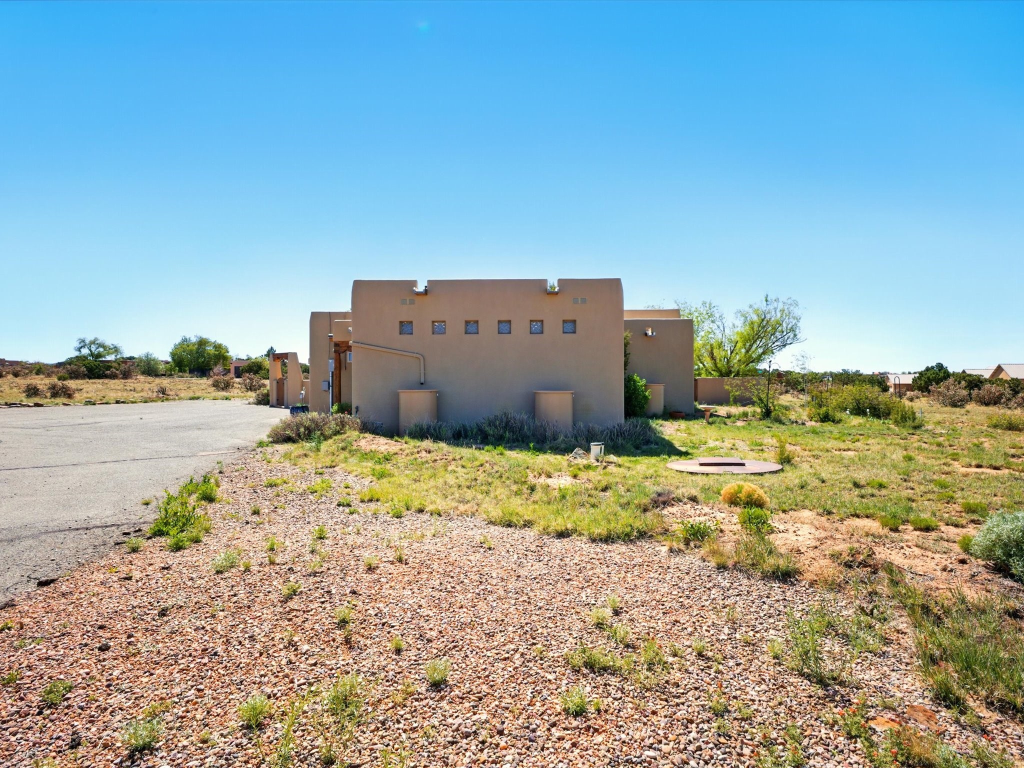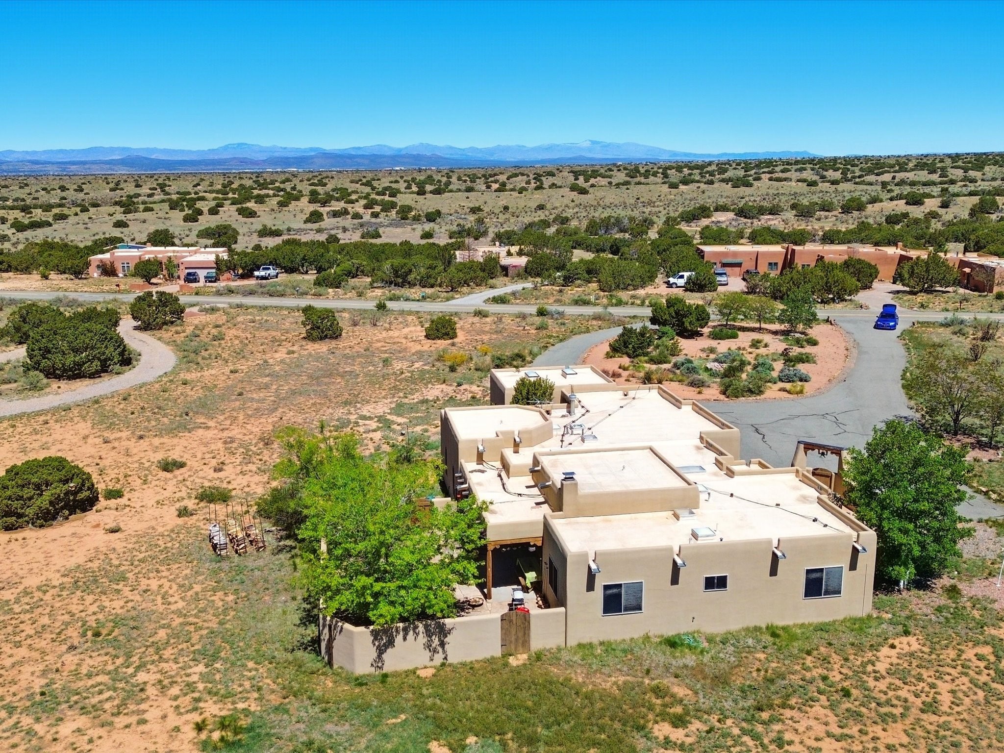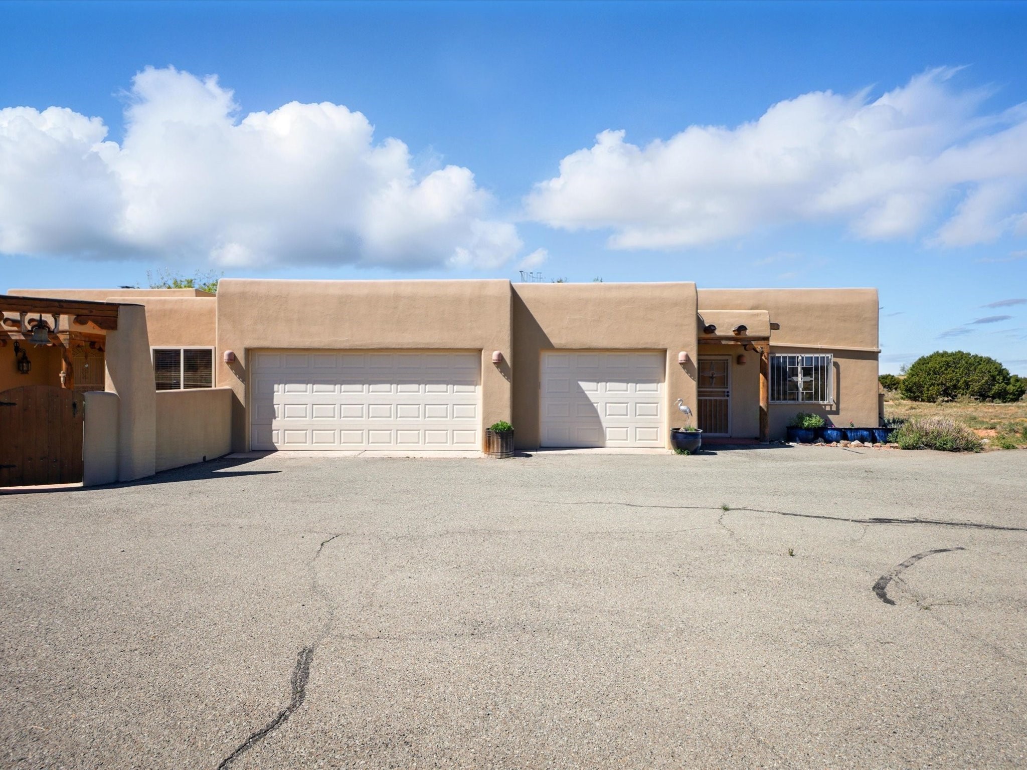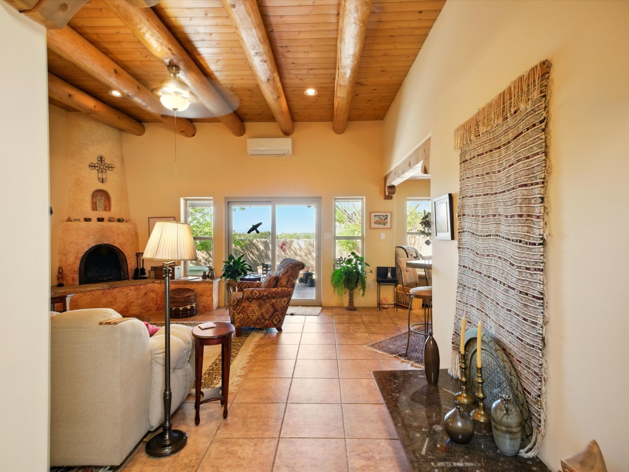 A Serene Santa Fe Artist Retreat set on 1.26 acres in the desirable Eldorado community. This stunning 3-bedroom, 2.5 bath home with a dedicated office for remote work offers the perfect blend of Southwestern charm and modern comfort. Inside, you'll find rich wood interior doors, vigas, beams and a classic kiva fireplace to create an atmosphere of warmth and relaxation. Skylights throughout the home invite an abundance of natural light. The spacious 3-car garage includes a unique 374 sq ft attached heated and air conditioned artist studio with sink-perfect for painting, crafting, mixed media or extra living space. Be a part of the vibrant, art-loving Eldorado community and thriving Eldorado Studio Tour every September. Outside, take in dramatic sunset views of the Jemez Mountains on the back portal. Enjoy the tranquil sounds of the custom water feature along with the sculpture of the late local artist Timothy Roundy and Sangre de Cristo views in the front courtyard, all set against the backdrop of Santa Fe's iconic high desert landscape. Don't miss this opportunity to own a thoughtfully designed home that celebrates the beauty of Northern New Mexico. Recently reduced - offered as-is at this new price point, presenting a great opportunity.