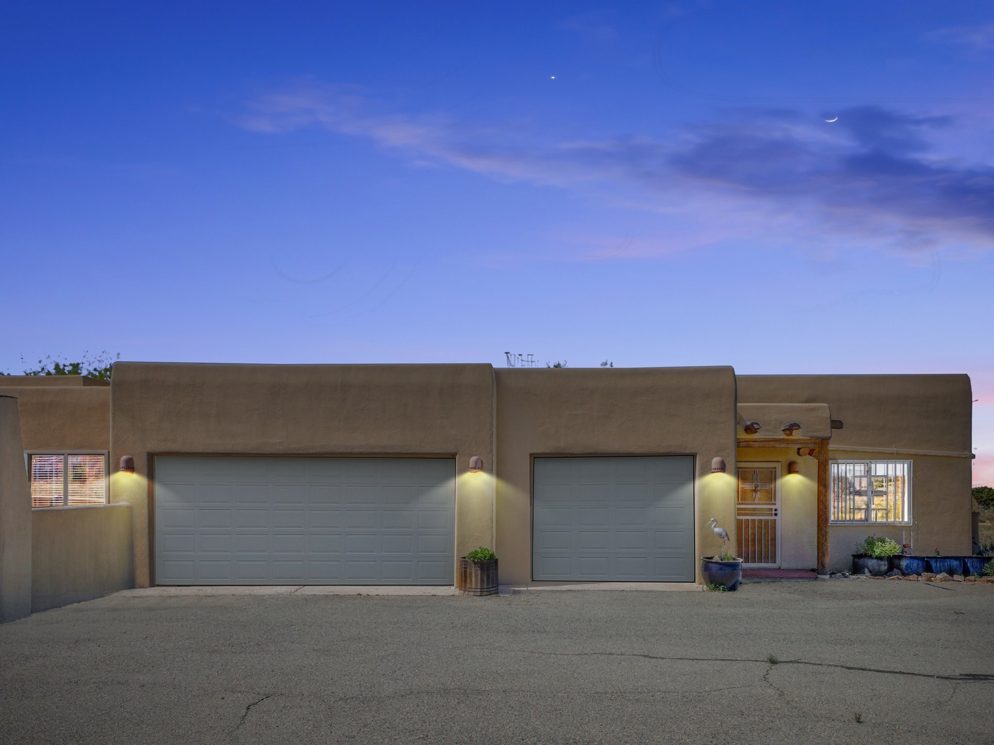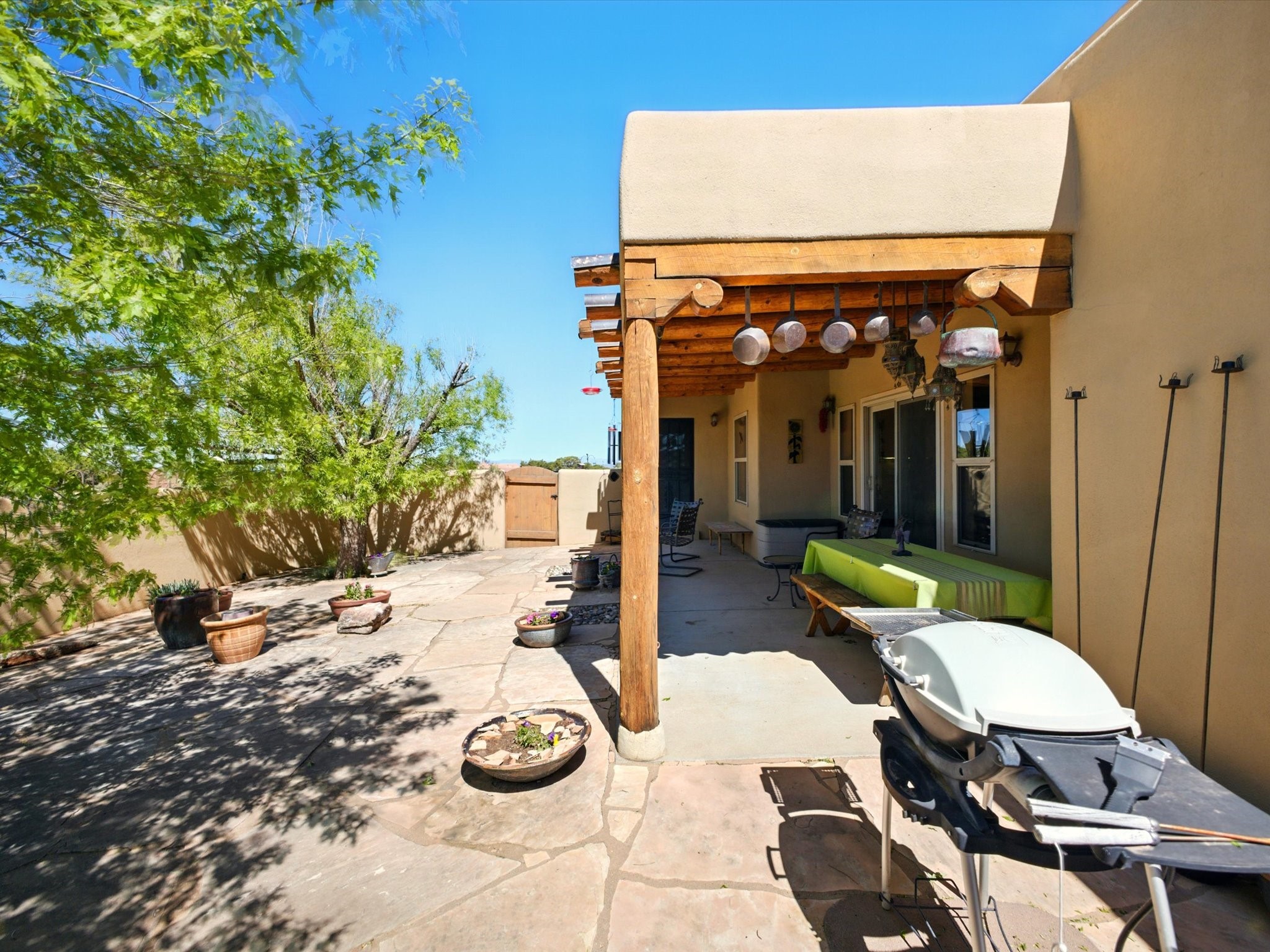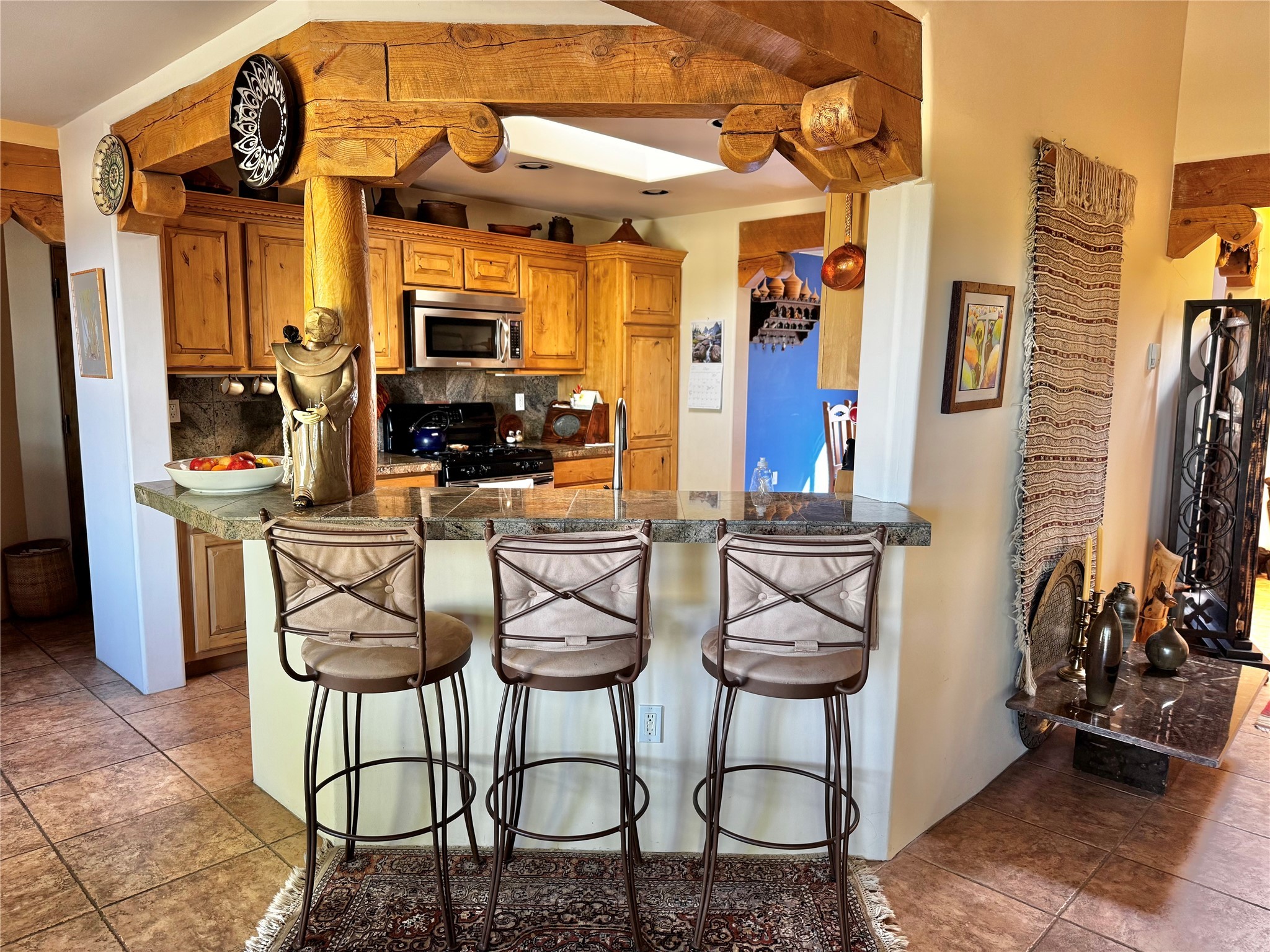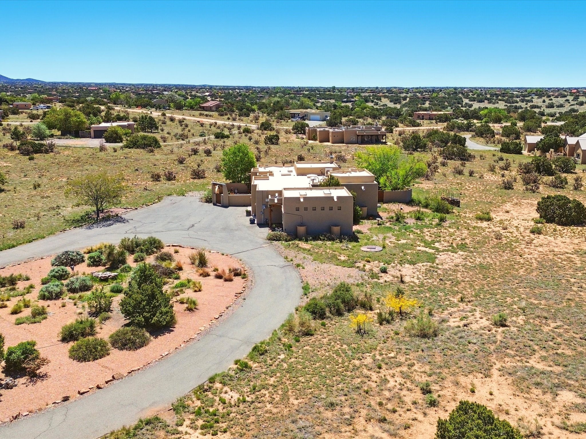 A Serene Santa Fe Artist Retreat set on 1.26 acres in the desirable Eldorado community. This stunning 3-bedroom, 2.5 bath home with a dedicated office for remote work offers the perfect blend of Southwestern charm and modern comfort. Inside, you'll find rich wood interior doors, vigas, beams and a classic kiva fireplace to create an atmosphere of warmth and relaxation. Skylights throughout the home invite an abundance of natural light. The spacious 3-car garage includes a unique 374 sq ft attached heated and air conditioned artist studio with sink-perfect for painting, crafting, mixed media or extra living space. Be a part of the vibrant, art-loving Eldorado community and thriving Eldorado Studio Tour every September. Outside, take in dramatic sunset views of the Jemez Mountains on the back portal. Enjoy the tranquil sounds of the custom water feature along with the sculpture of the late local artist Timothy Roundy and Sangre de Cristo views in the front courtyard, all set against the backdrop of Santa Fe's iconic high desert landscape. Don't miss this opportunity to own a thoughtfully designed home that celebrates the beauty of Northern New Mexico. Recently reduced - offered as-is at this new price point, presenting a great opportunity.