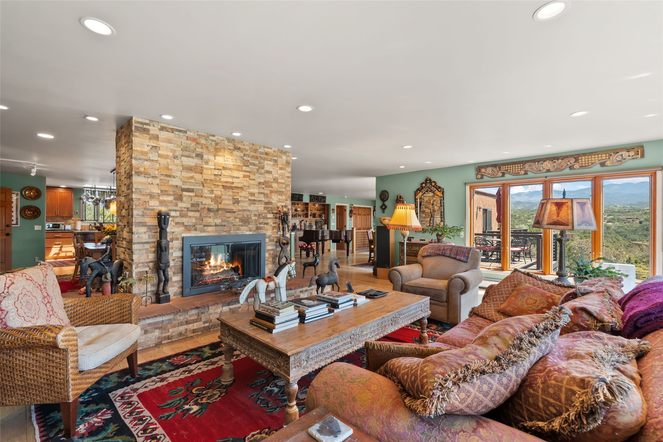 Located on 1.26 acres, a mile from the Plaza in the classic view filled Vista Encantada neighborhood, this home has been beautifully updated and landscaped. With the main living areas all on one level, there is also a one-bedroom lower-level casita with separate entry, full kitchen, big Sangre view and outdoor space. This makes for excellent privacy and separation for either guests, an income producing rental or a home office/studio situation. Entering the main house through a wide front veranda, there is a gracious entry and nice open feel between the living and dining rooms which both enjoy the stacked Anasazi stone fireplace, huge banks of windows to all the mountain views, fantastic light as well as open access to the kitchen. The cook's kitchen has new stainless appliances, granite counters, wine cooler, walk in pantry and plenty of storage. Super mud room/laundry off the kitchen leads to a large office or family room with separate entry and a breezeway to the two-car garage. Off the dining is a private covered bricked patio with views to Sun and Moon mountains, Atalaya, Picacho and the Sangres. Not to mention a private hot tub spot from which to enjoy sunrise or moonrise over the mountains with the sound of the fountain in the background! A sweet music room/game room leads back to the bedroom wing, with great storage for linens and extra outerwear. The two guest bedrooms share a full bath and the primary suite enjoys the big views, opens to a high wrap around ipe wood (a hard wood from South America) deck, gorgeous stacked stone bathroom with bidet and walk in closet with built ins. Down the stairs from the music room is a cozy office or study with a wall of bookcases and an incredible bonus storage room. There are mini splits throughout for summer cooling and solar to nearly eliminate your electric bill!
