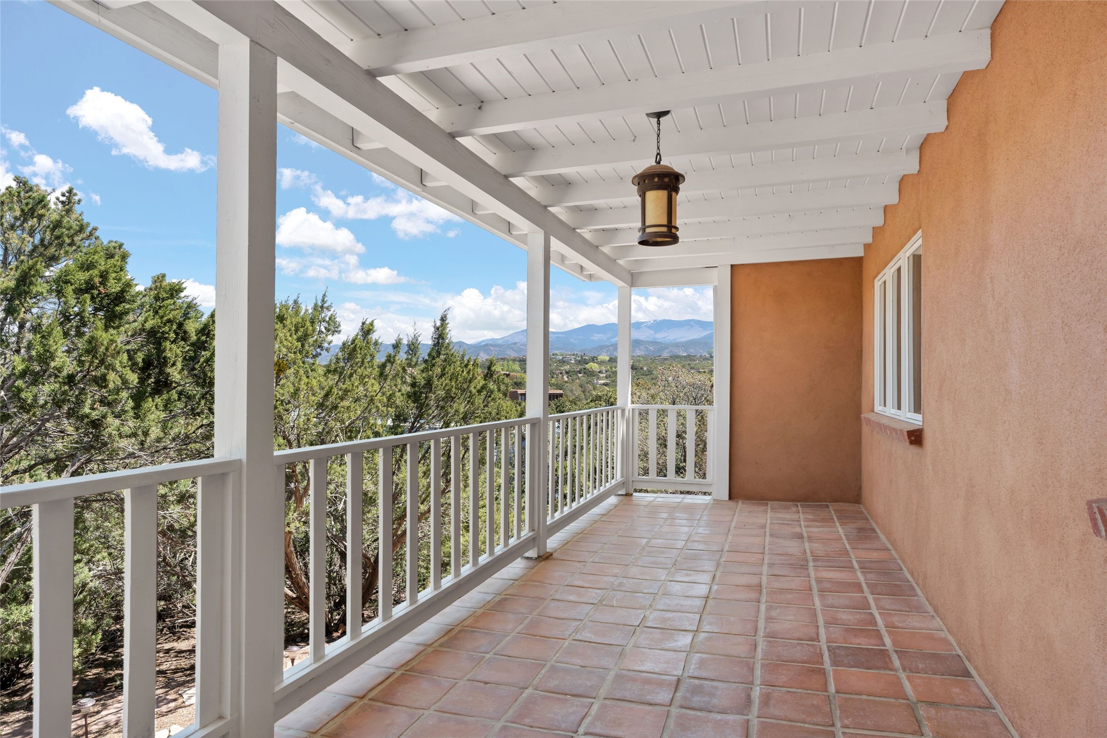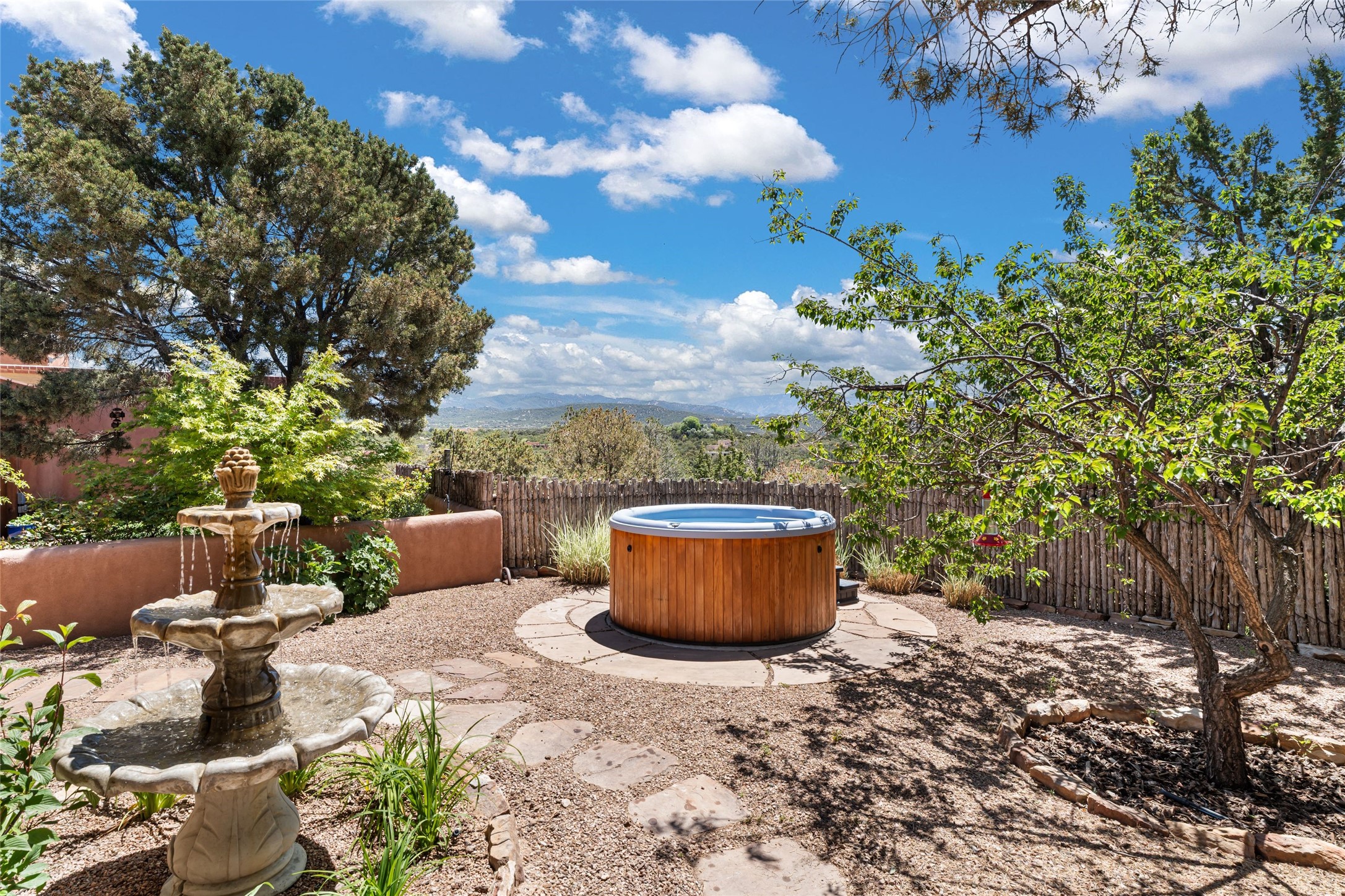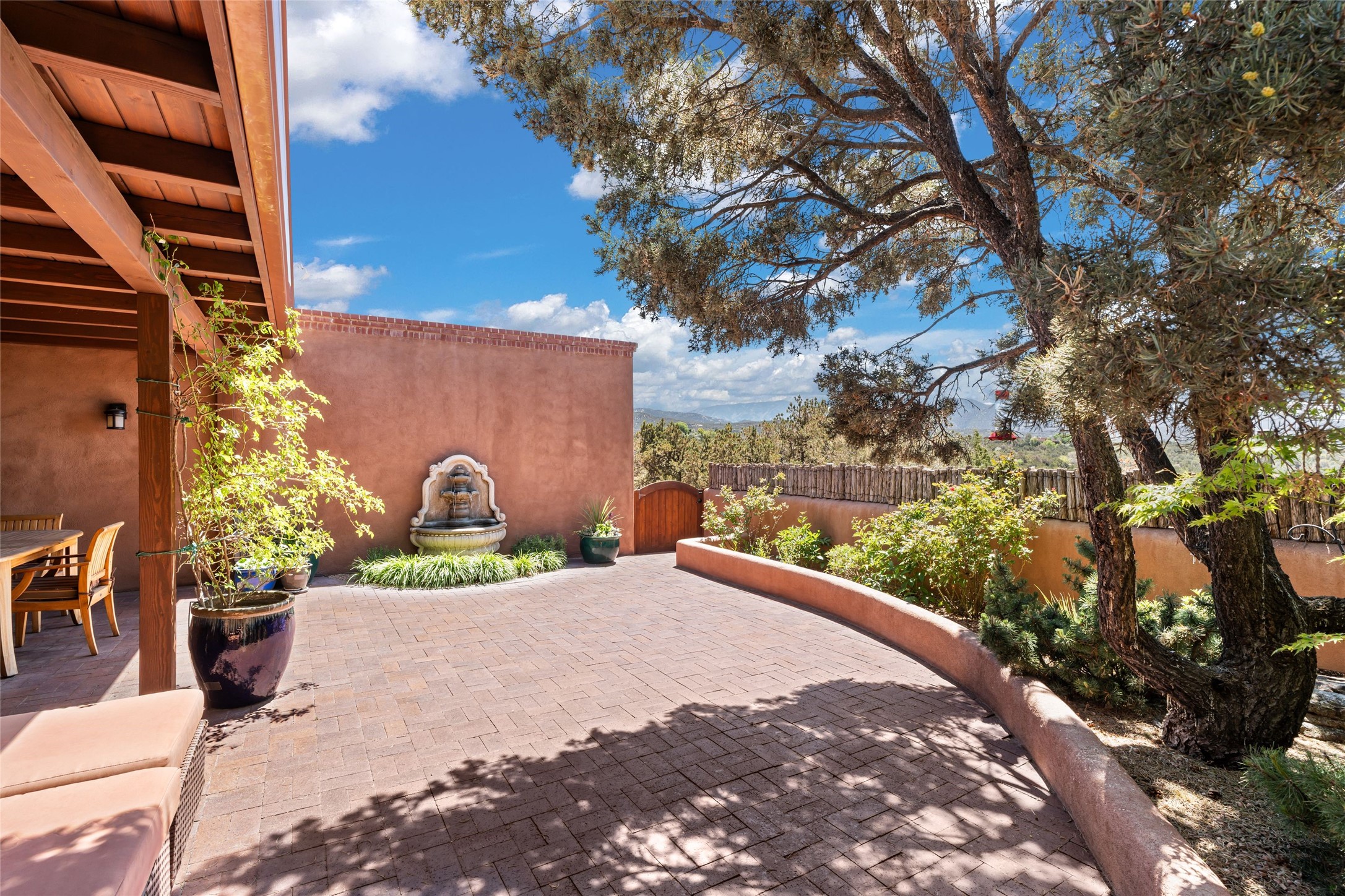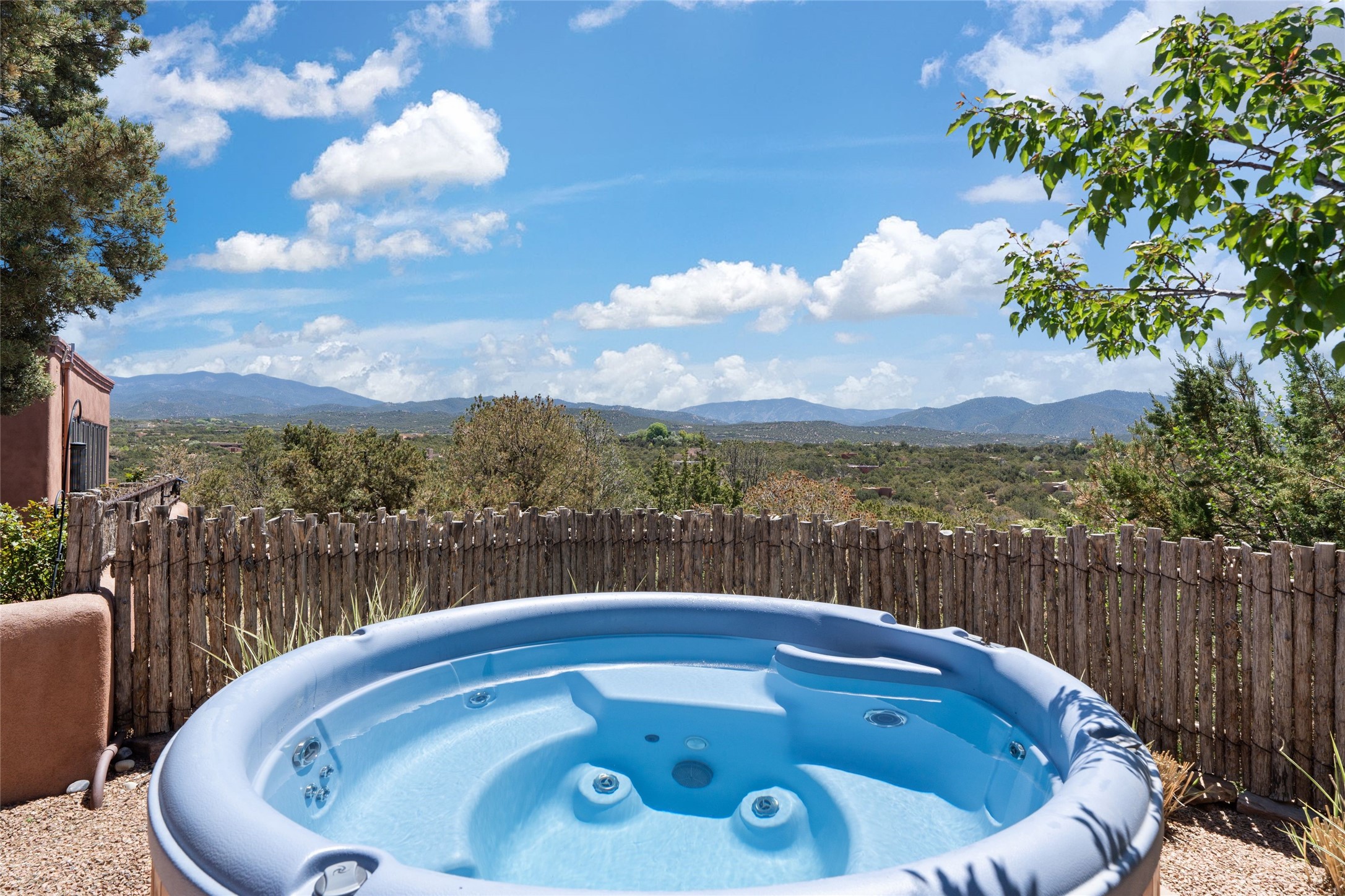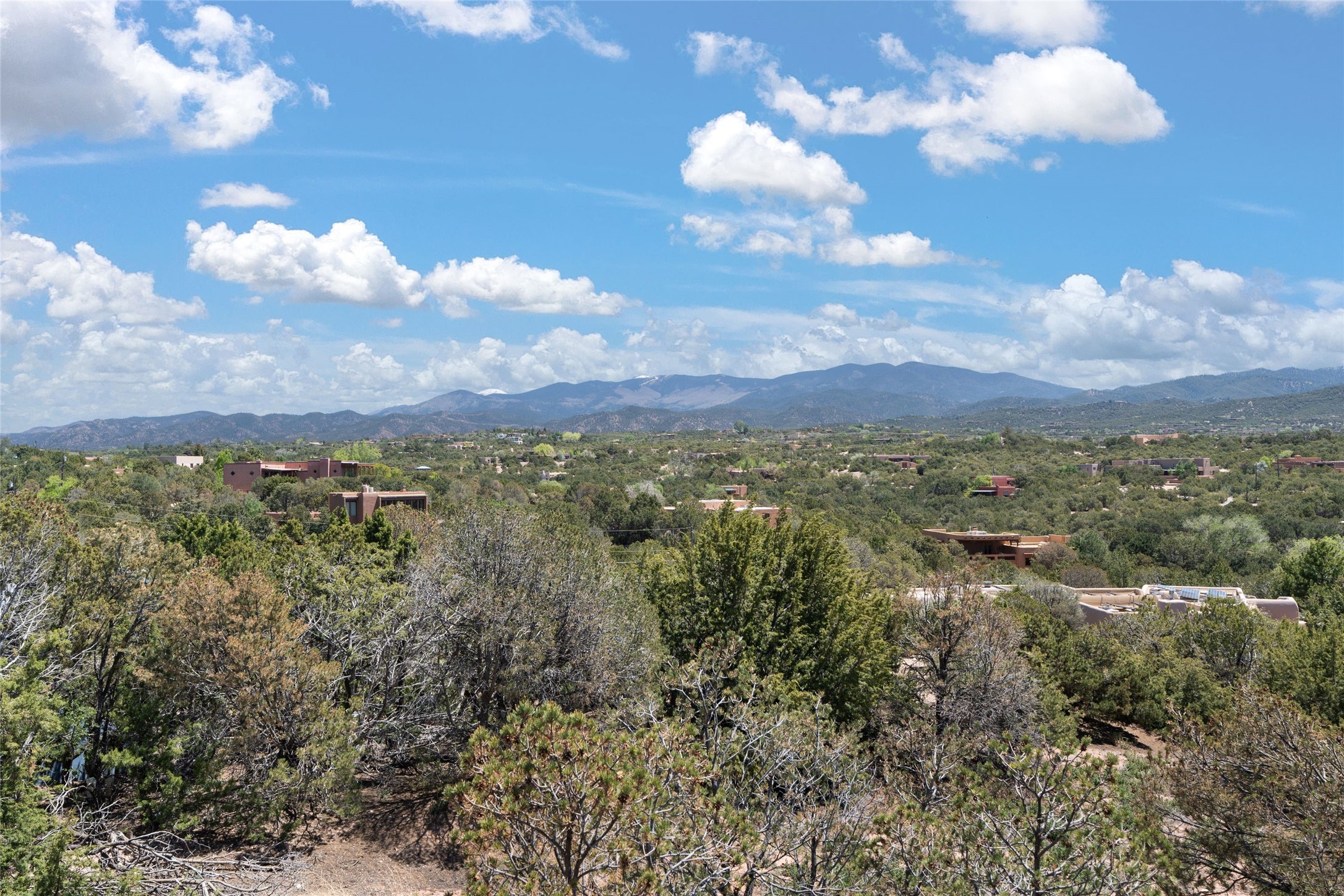Located on 1.26 acres, a mile from the Plaza in the classic view filled Vista Encantada neighborhood, this home has been beautifully updated and landscaped. With the main living areas all on one level, there is also a one-bedroom lower-level casita with separate entry, full kitchen, big Sangre view and outdoor space. This makes for excellent privacy and separation for either guests, an income producing rental or a home office/studio situation. Entering the main house through a wide front veranda, there is a gracious entry and nice open feel between the living and dining rooms which both enjoy the stacked Anasazi stone fireplace, huge banks of windows to all the mountain views, fantastic light as well as open access to the kitchen. The cook's kitchen has new stainless appliances, granite counters, wine cooler, walk in pantry and plenty of storage. Super mud room/laundry off the kitchen leads to a large office or family room with separate entry and a breezeway to the two-car garage. Off the dining is a private covered bricked patio with views to Sun and Moon mountains, Atalaya, Picacho and the Sangres. Not to mention a private hot tub spot from which to enjoy sunrise or moonrise over the mountains with the sound of the fountain in the background! A sweet music room/game room leads back to the bedroom wing, with great storage for linens and extra outerwear. The two guest bedrooms share a full bath and the primary suite enjoys the big views, opens to a high wrap around ipe wood (a hard wood from South America) deck, gorgeous stacked stone bathroom with bidet and walk in closet with built ins. Down the stairs from the music room is a cozy office or study with a wall of bookcases and an incredible bonus storage room. There are mini splits throughout for summer cooling and solar to nearly eliminate your electric bill!