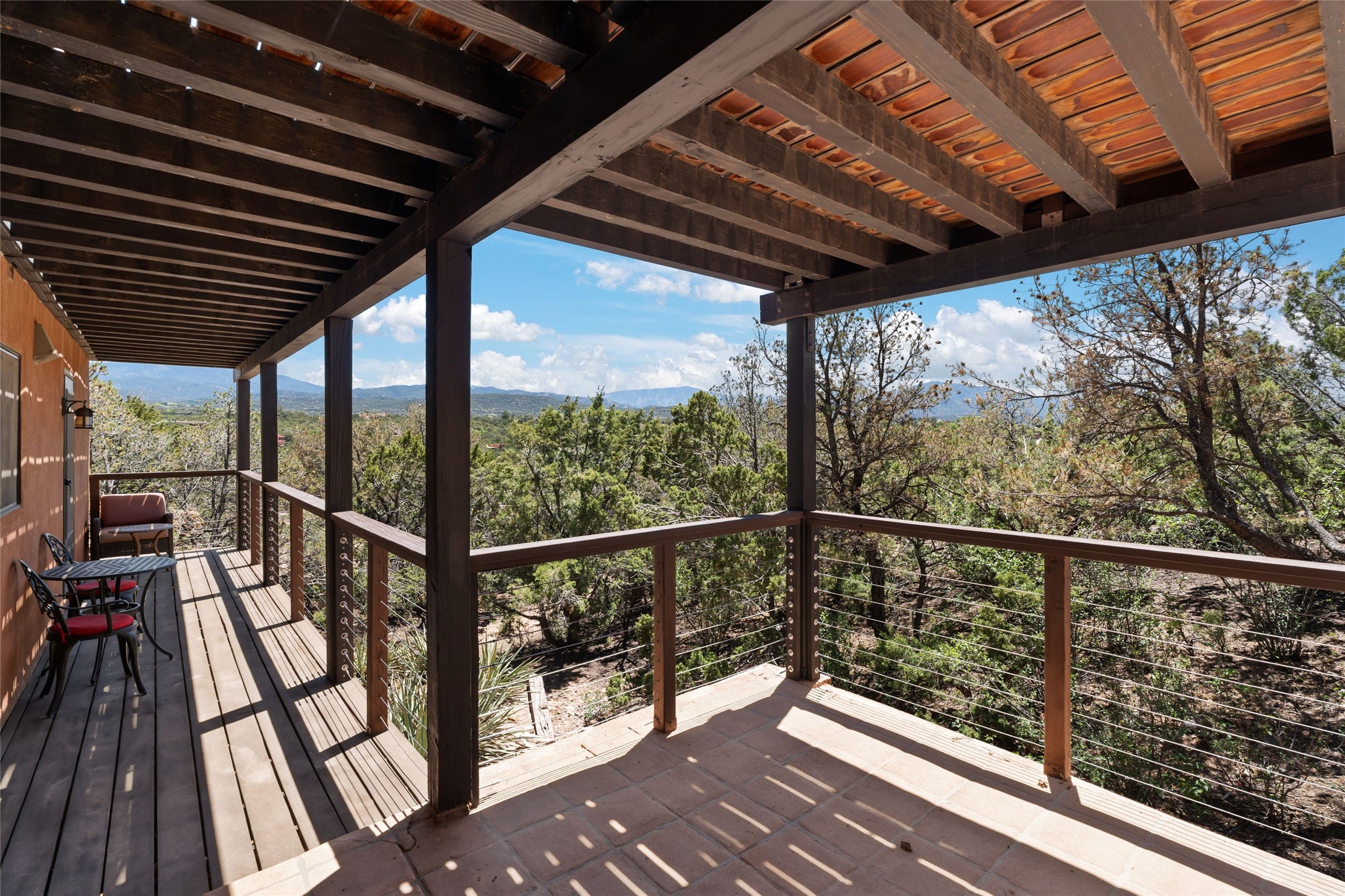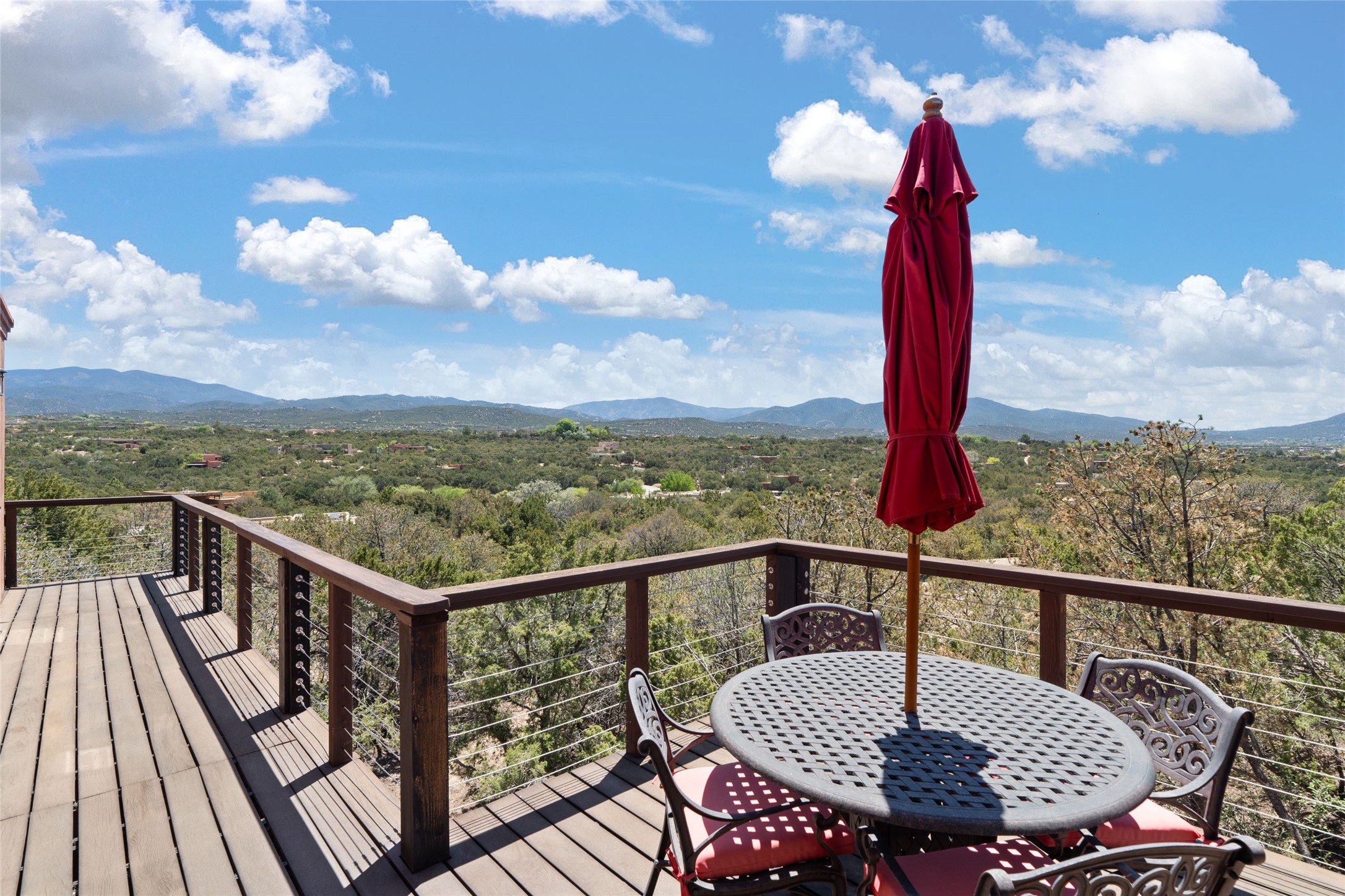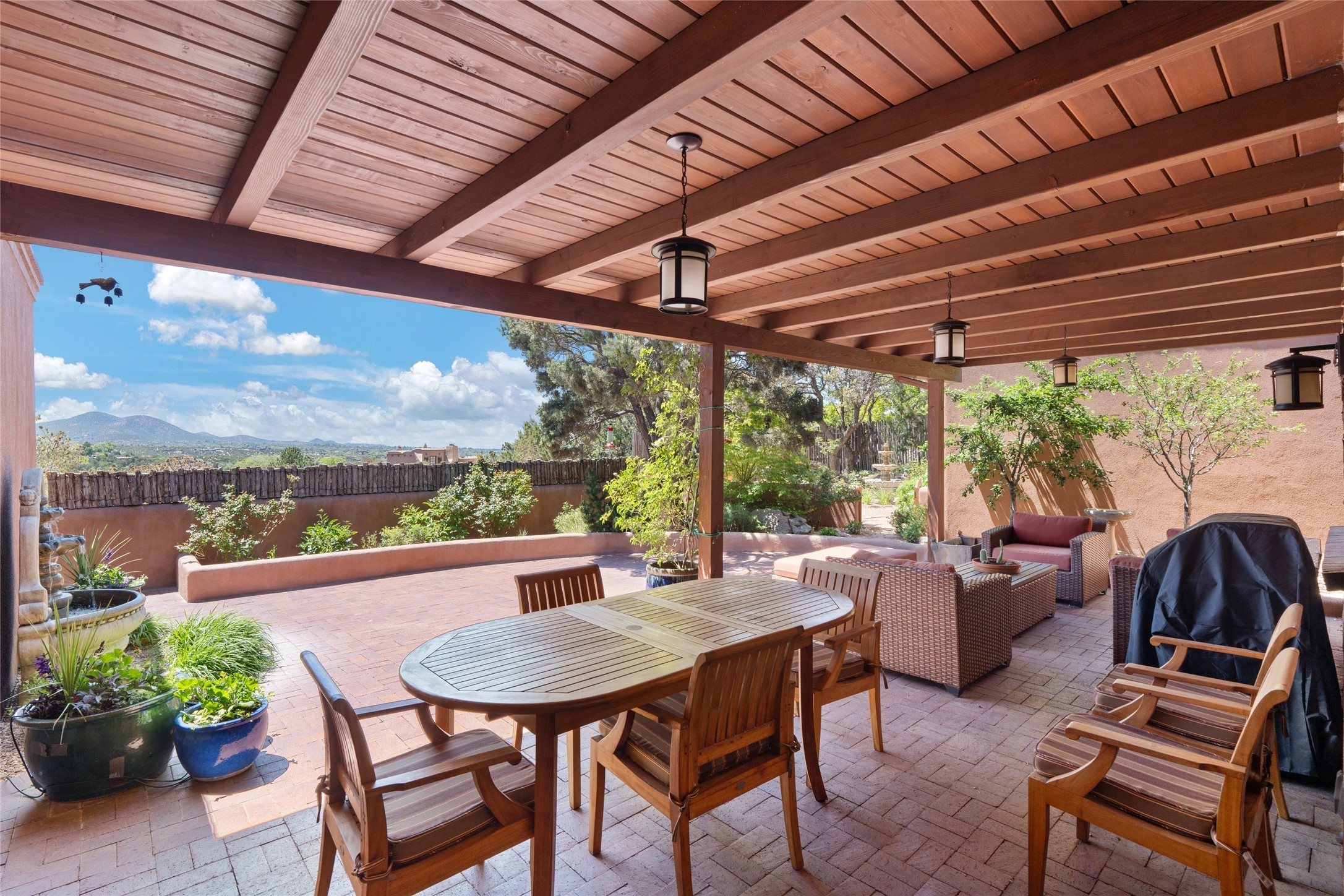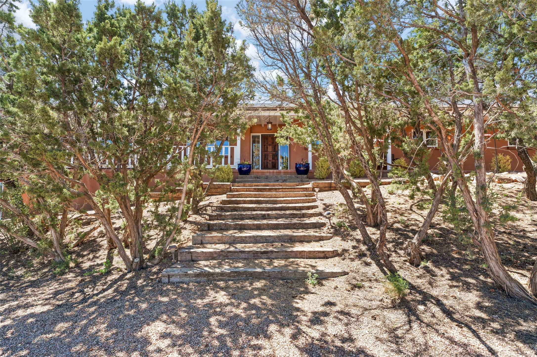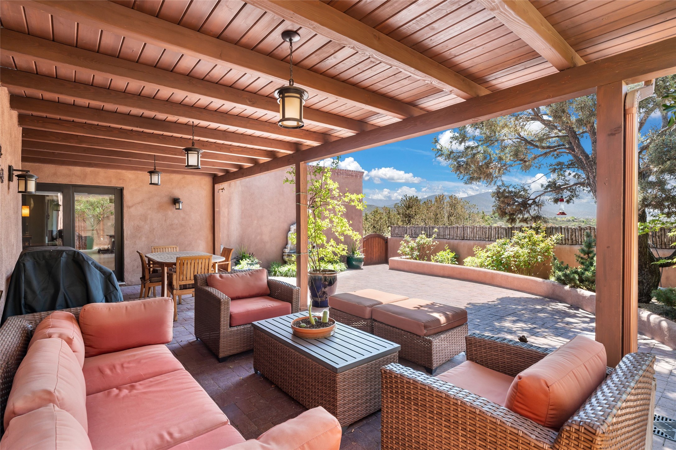 Located on 1.26 acres, a mile from the Plaza in the classic view filled Vista Encantada neighborhood, this home has been beautifully updated and landscaped. With the main living areas all on one level, there is also a one-bedroom lower-level casita with separate entry, full kitchen, big Sangre view and outdoor space. This makes for excellent privacy and separation for either guests, an income producing rental or a home office/studio situation. Entering the main house through a wide front veranda, there is a gracious entry and nice open feel between the living and dining rooms which both enjoy the stacked Anasazi stone fireplace, huge banks of windows to all the mountain views, fantastic light as well as open access to the kitchen. The cook's kitchen has new stainless appliances, granite counters, wine cooler, walk in pantry and plenty of storage. Super mud room/laundry off the kitchen leads to a large office or family room with separate entry and a breezeway to the two-car garage. Off the dining is a private covered bricked patio with views to Sun and Moon mountains, Atalaya, Picacho and the Sangres. Not to mention a private hot tub spot from which to enjoy sunrise or moonrise over the mountains with the sound of the fountain in the background! A sweet music room/game room leads back to the bedroom wing, with great storage for linens and extra outerwear. The two guest bedrooms share a full bath and the primary suite enjoys the big views, opens to a high wrap around ipe wood (a hard wood from South America) deck, gorgeous stacked stone bathroom with bidet and walk in closet with built ins. Down the stairs from the music room is a cozy office or study with a wall of bookcases and an incredible bonus storage room. There are mini splits throughout for summer cooling and solar to nearly eliminate your electric bill!
