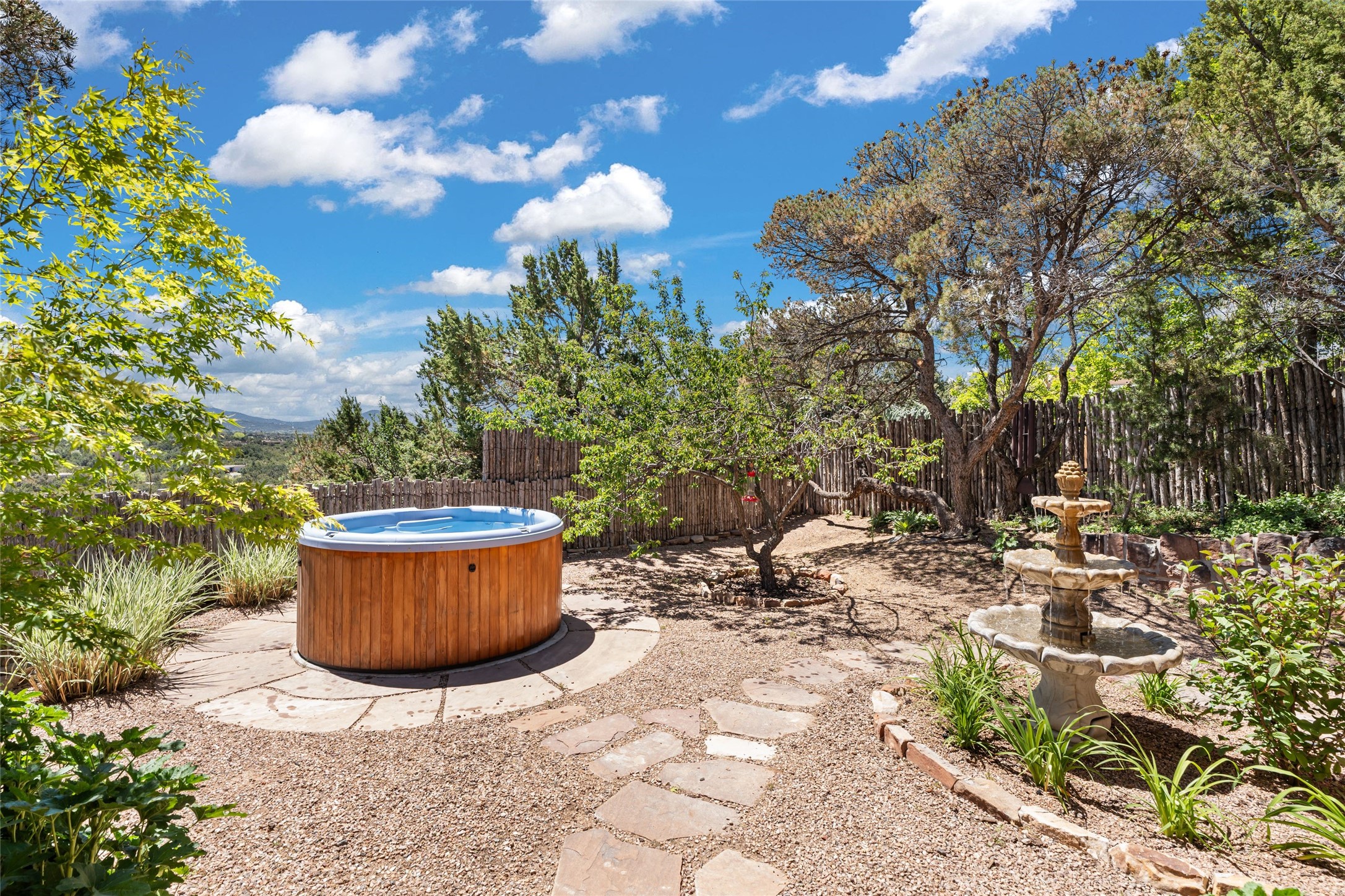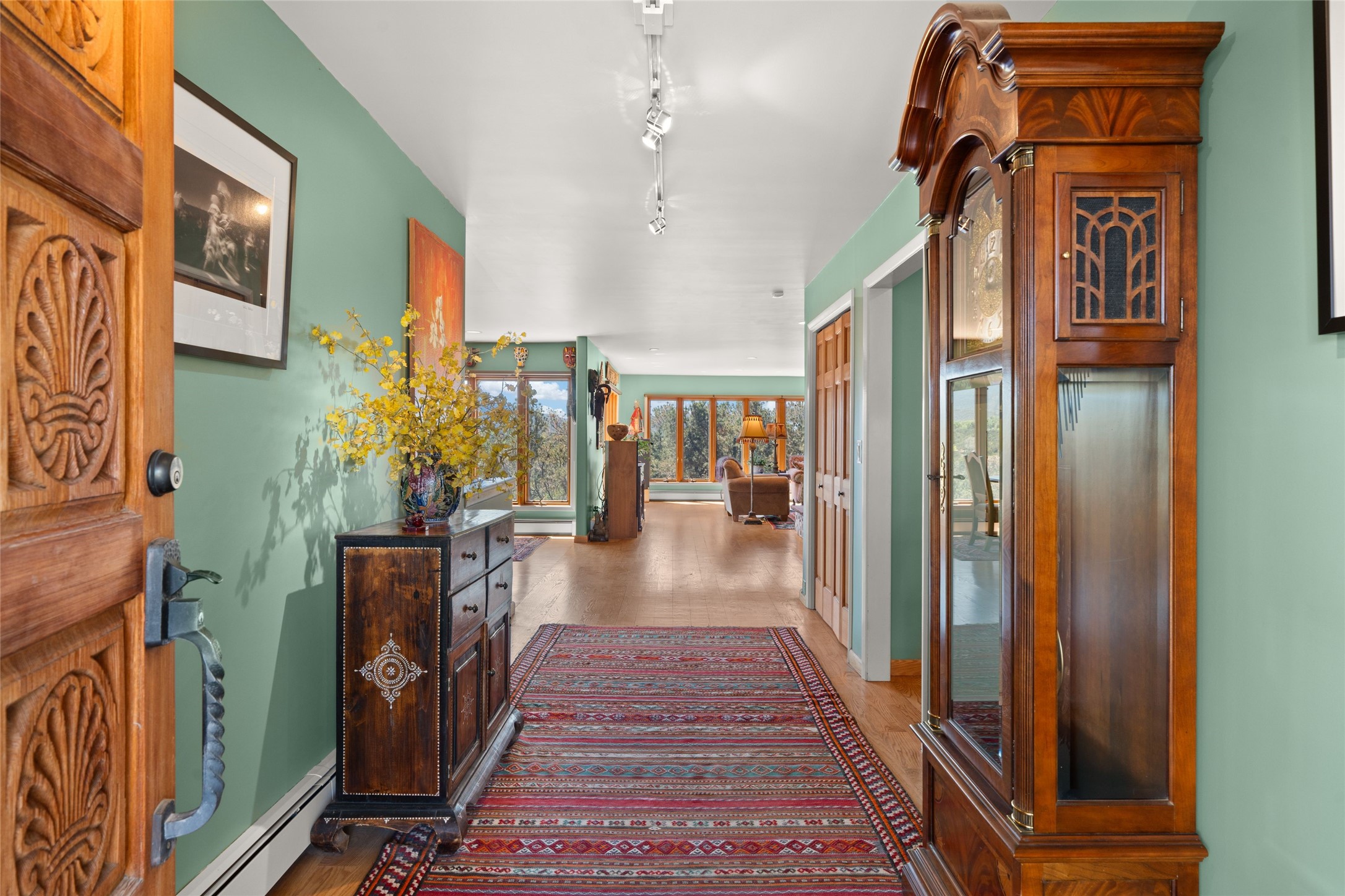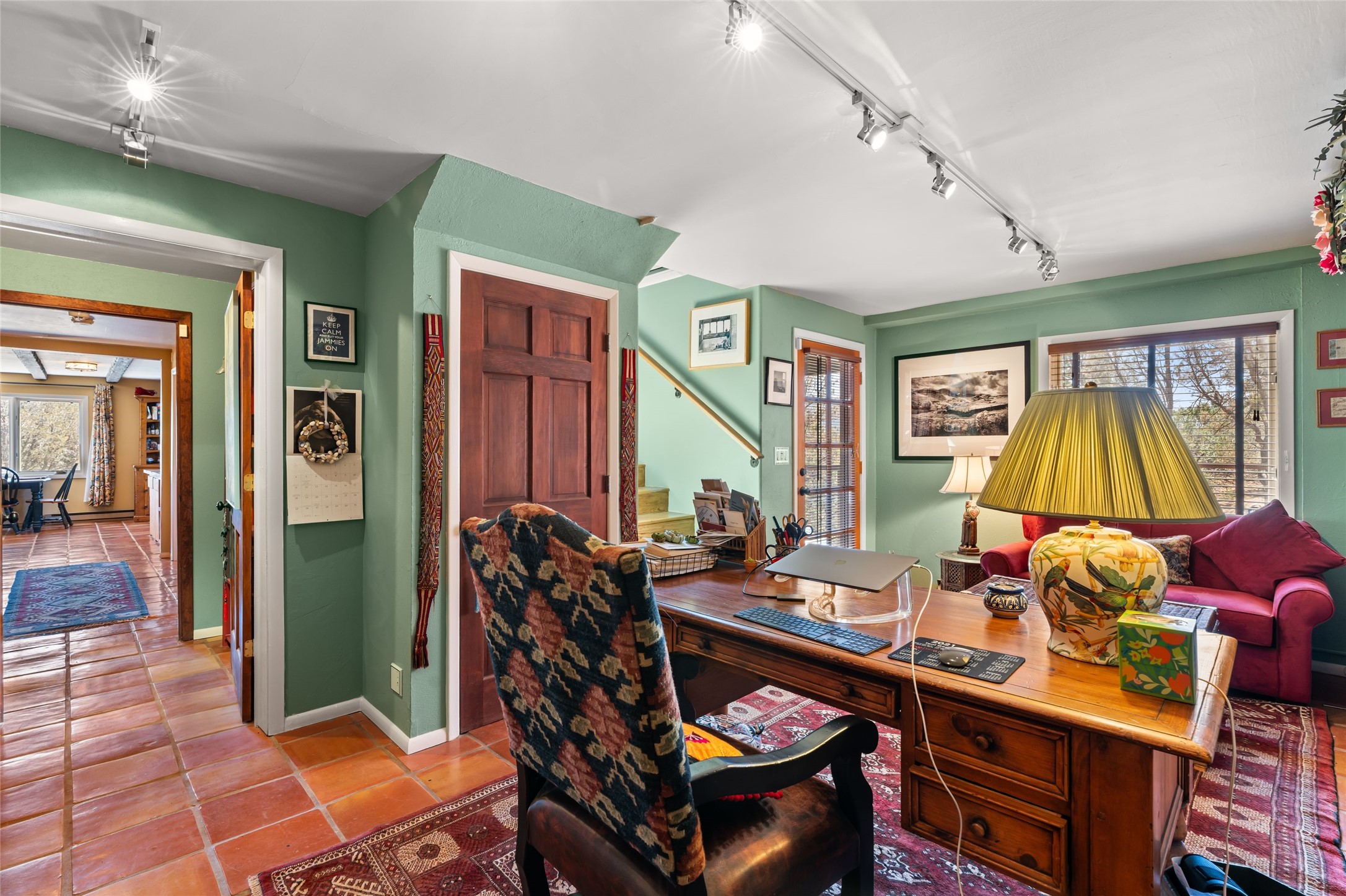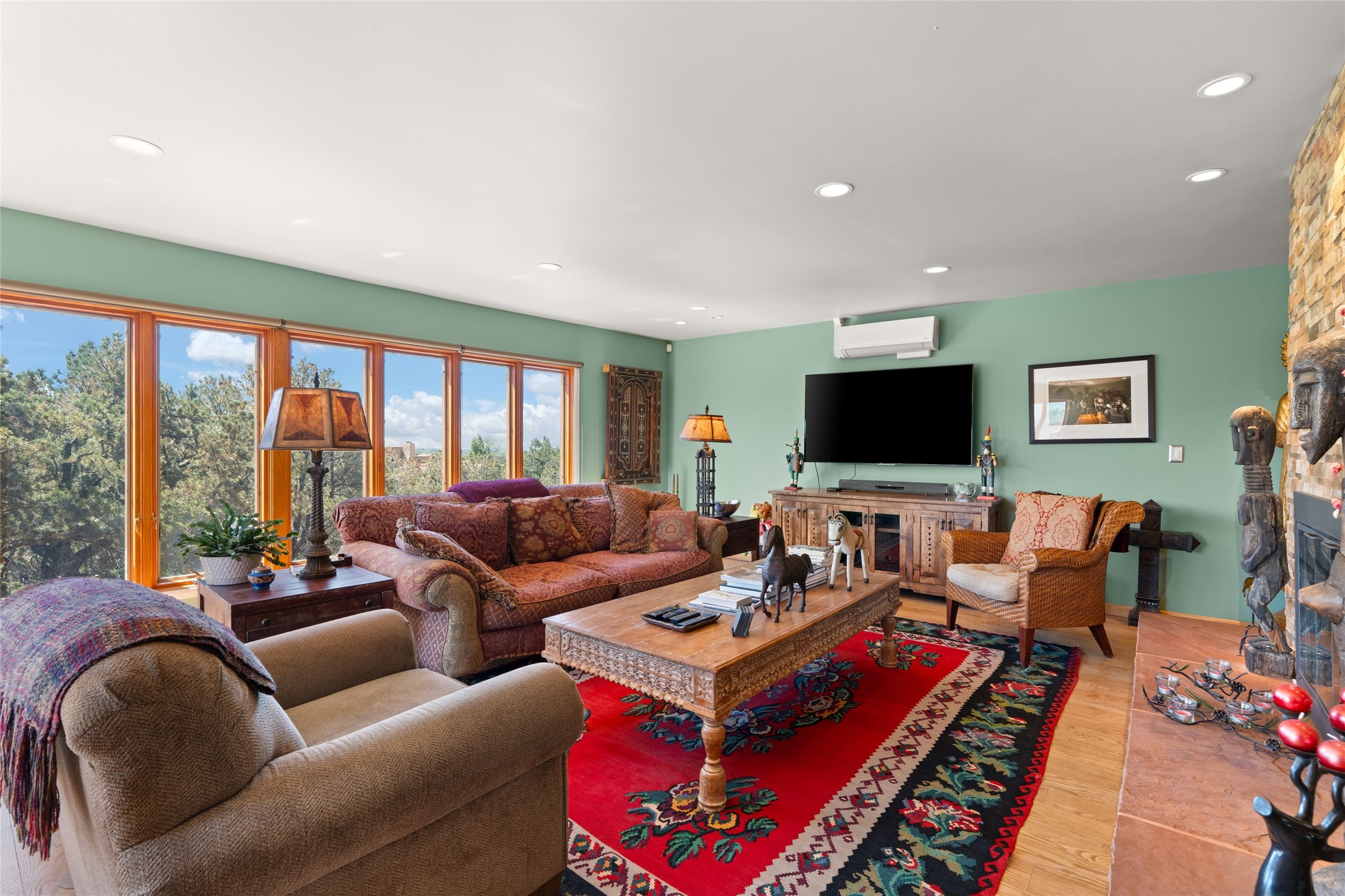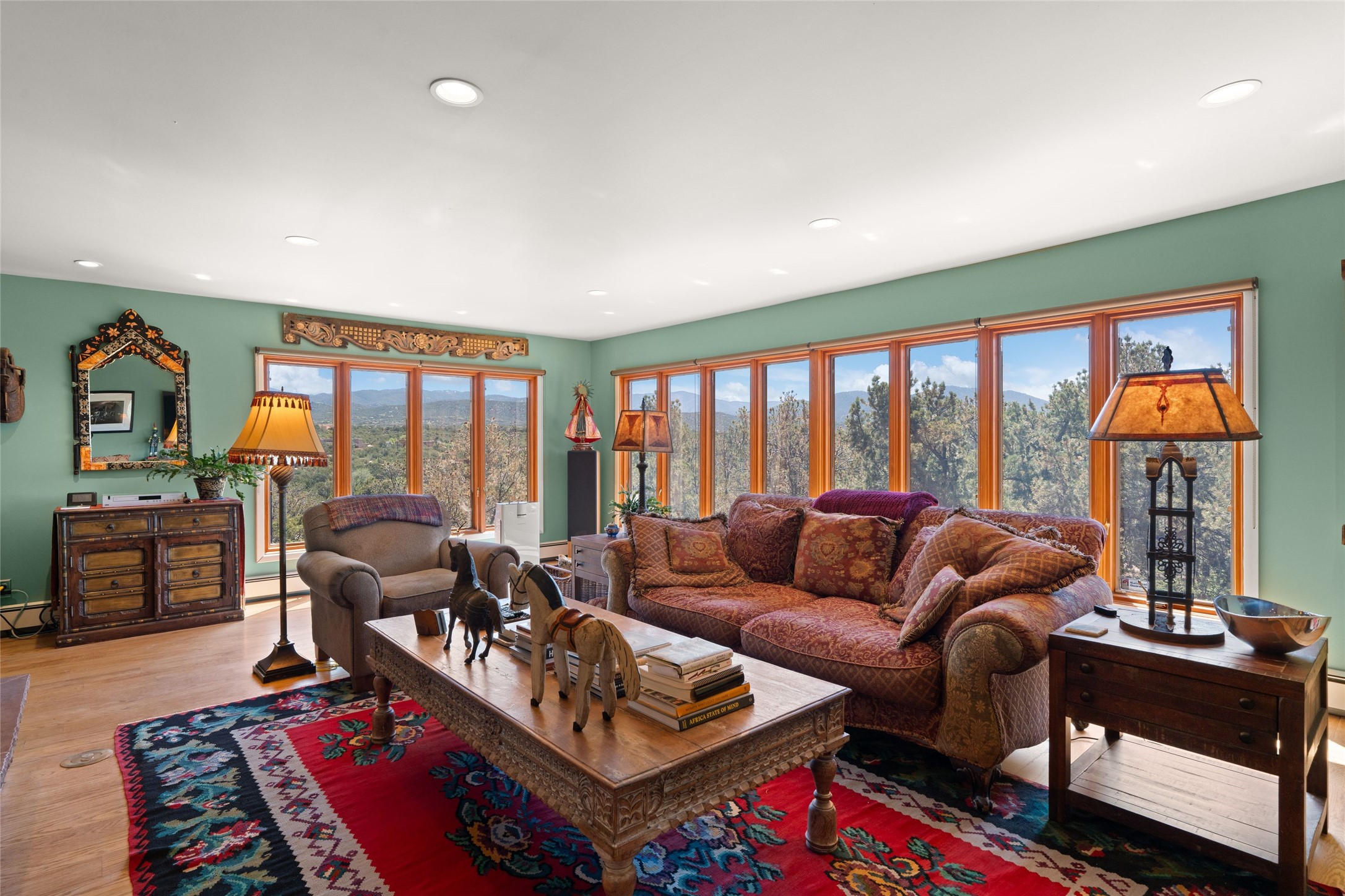 Located on 1.26 acres, a mile from the Plaza in the classic view filled Vista Encantada neighborhood, this home has been beautifully updated and landscaped. With the main living areas all on one level, there is also a one-bedroom lower-level casita with separate entry, full kitchen, big Sangre view and outdoor space. This makes for excellent privacy and separation for either guests, an income producing rental or a home office/studio situation. Entering the main house through a wide front veranda, there is a gracious entry and nice open feel between the living and dining rooms which both enjoy the stacked Anasazi stone fireplace, huge banks of windows to all the mountain views, fantastic light as well as open access to the kitchen. The cook's kitchen has new stainless appliances, granite counters, wine cooler, walk in pantry and plenty of storage. Super mud room/laundry off the kitchen leads to a large office or family room with separate entry and a breezeway to the two-car garage. Off the dining is a private covered bricked patio with views to Sun and Moon mountains, Atalaya, Picacho and the Sangres. Not to mention a private hot tub spot from which to enjoy sunrise or moonrise over the mountains with the sound of the fountain in the background! A sweet music room/game room leads back to the bedroom wing, with great storage for linens and extra outerwear. The two guest bedrooms share a full bath and the primary suite enjoys the big views, opens to a high wrap around ipe wood (a hard wood from South America) deck, gorgeous stacked stone bathroom with bidet and walk in closet with built ins. Down the stairs from the music room is a cozy office or study with a wall of bookcases and an incredible bonus storage room. There are mini splits throughout for summer cooling and solar to nearly eliminate your electric bill!