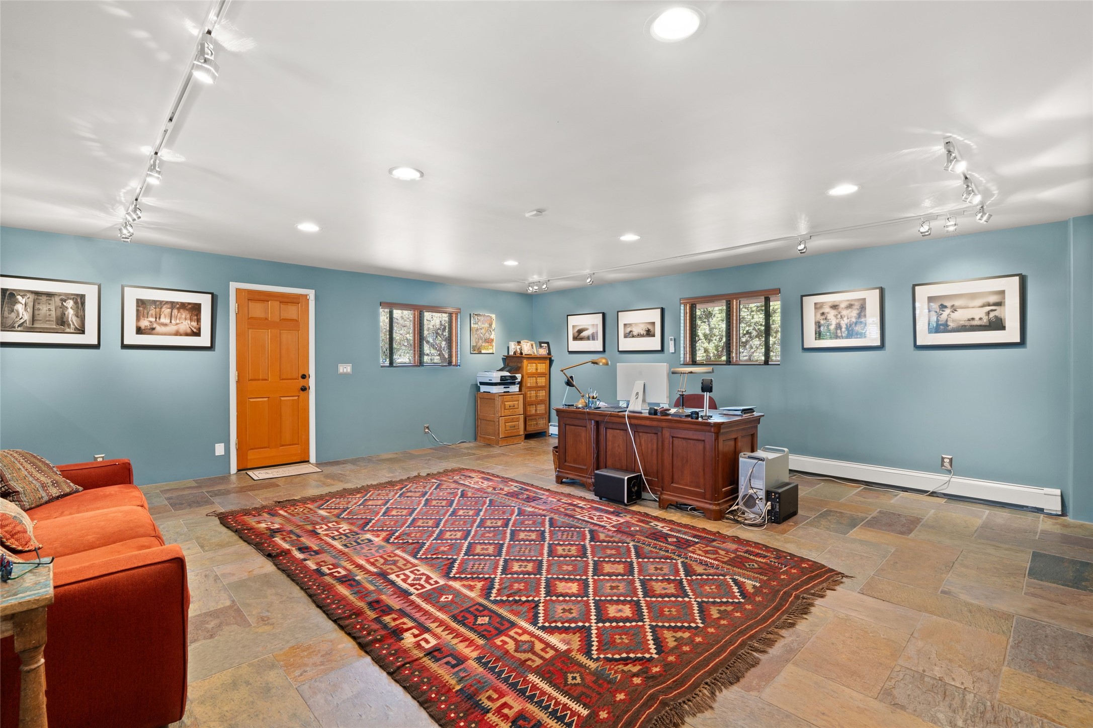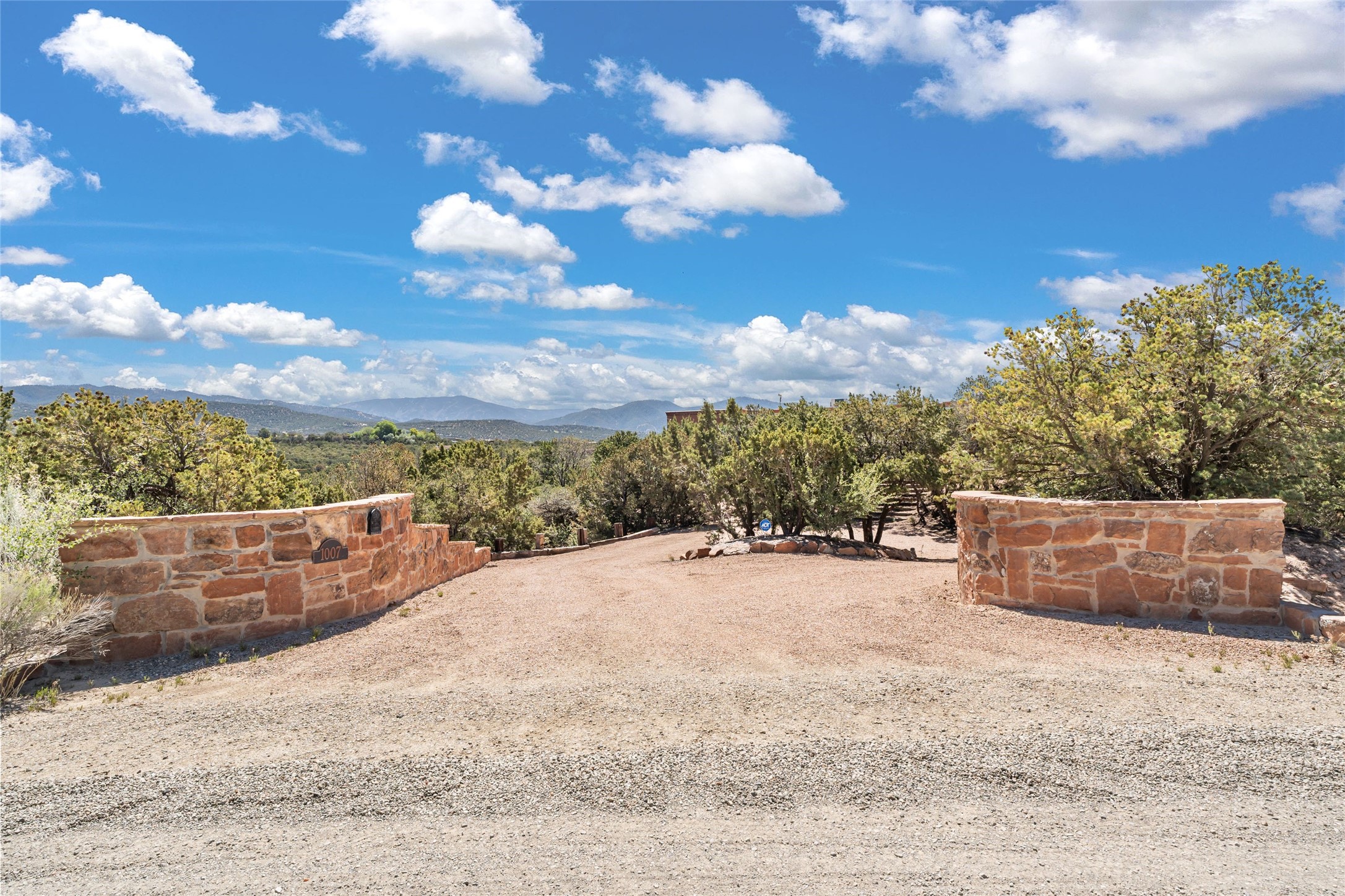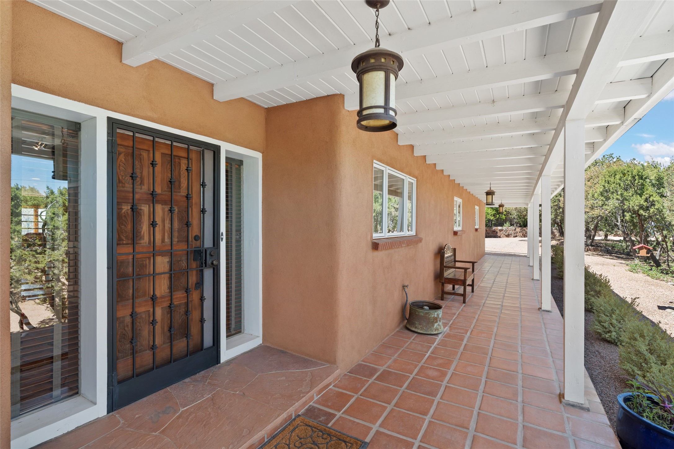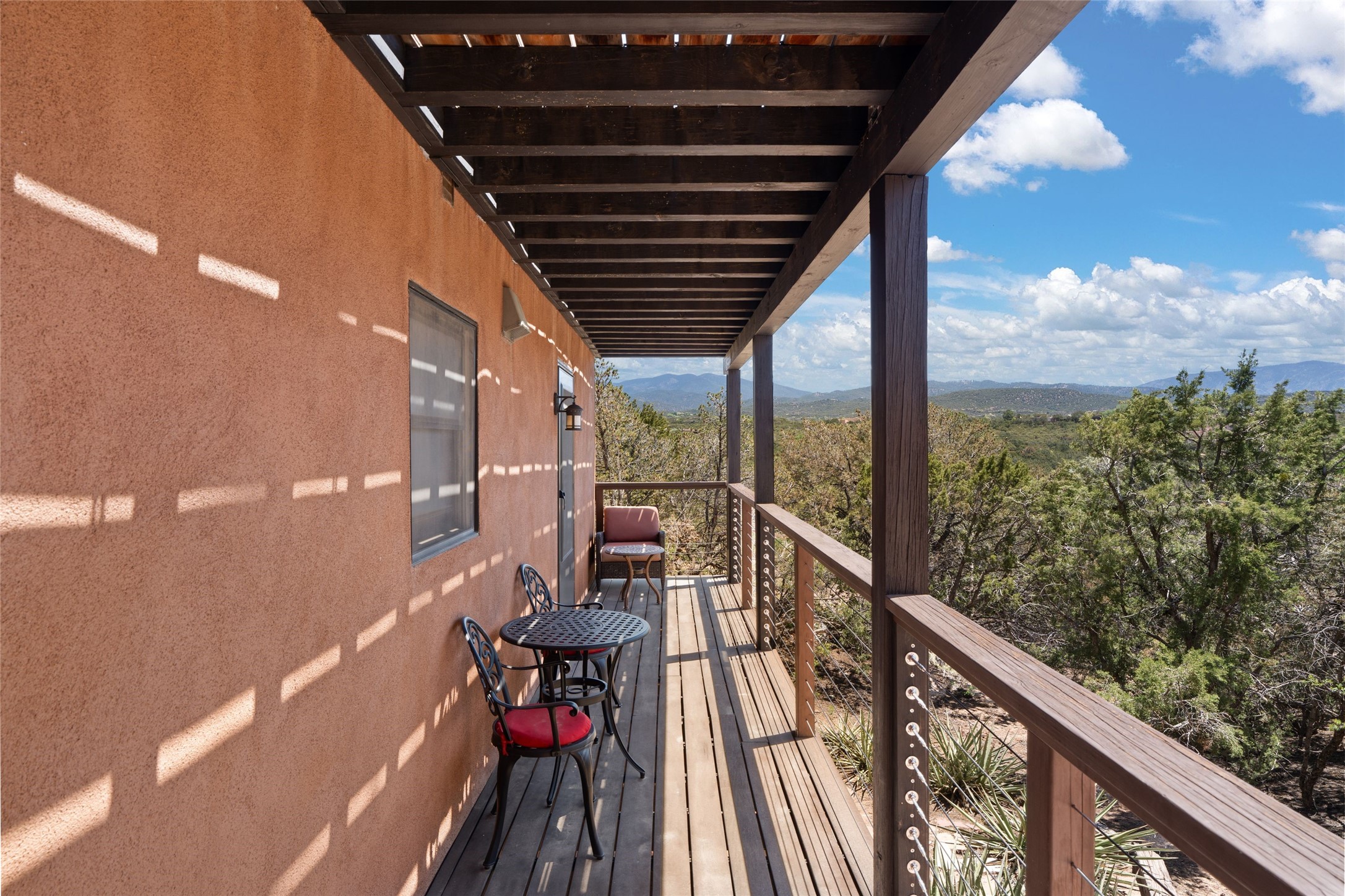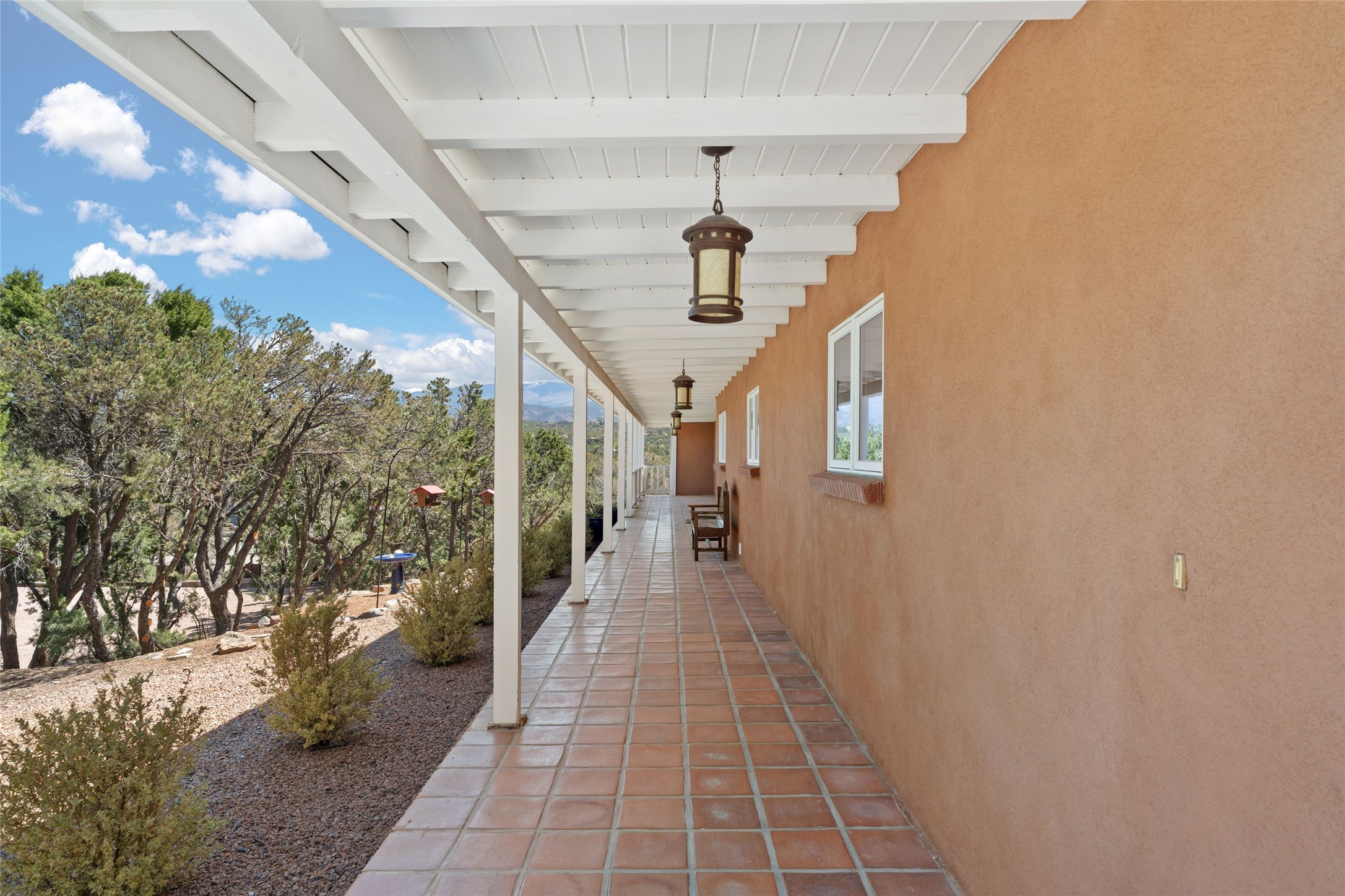 Located on 1.26 acres, a mile from the Plaza in the classic view filled Vista Encantada neighborhood, this home has been beautifully updated and landscaped. With the main living areas all on one level, there is also a one-bedroom lower-level casita with separate entry, full kitchen, big Sangre view and outdoor space. This makes for excellent privacy and separation for either guests, an income producing rental or a home office/studio situation. Entering the main house through a wide front veranda, there is a gracious entry and nice open feel between the living and dining rooms which both enjoy the stacked Anasazi stone fireplace, huge banks of windows to all the mountain views, fantastic light as well as open access to the kitchen. The cook's kitchen has new stainless appliances, granite counters, wine cooler, walk in pantry and plenty of storage. Super mud room/laundry off the kitchen leads to a large office or family room with separate entry and a breezeway to the two-car garage. Off the dining is a private covered bricked patio with views to Sun and Moon mountains, Atalaya, Picacho and the Sangres. Not to mention a private hot tub spot from which to enjoy sunrise or moonrise over the mountains with the sound of the fountain in the background! A sweet music room/game room leads back to the bedroom wing, with great storage for linens and extra outerwear. The two guest bedrooms share a full bath and the primary suite enjoys the big views, opens to a high wrap around ipe wood (a hard wood from South America) deck, gorgeous stacked stone bathroom with bidet and walk in closet with built ins. Down the stairs from the music room is a cozy office or study with a wall of bookcases and an incredible bonus storage room. There are mini splits throughout for summer cooling and solar to nearly eliminate your electric bill!