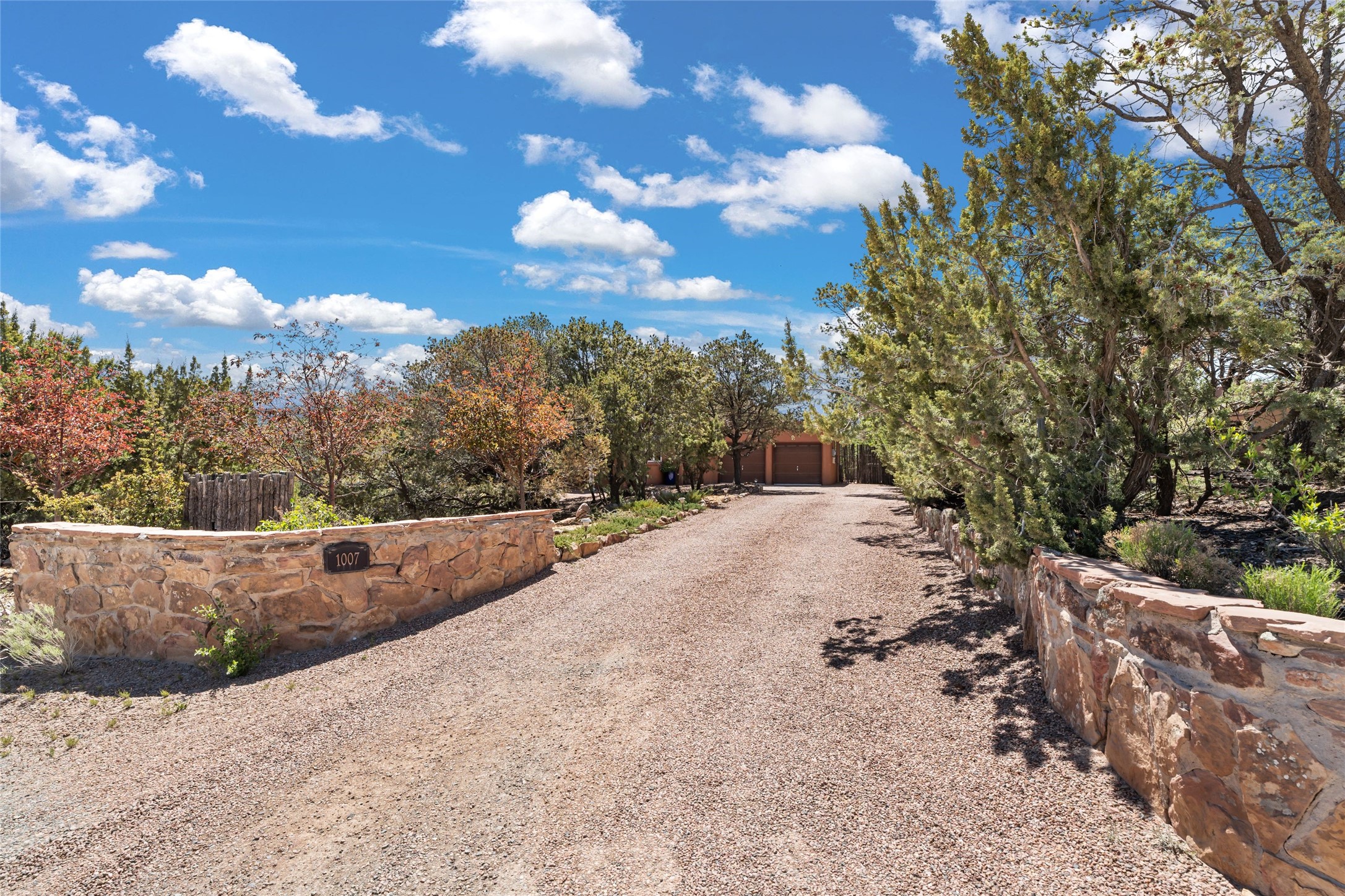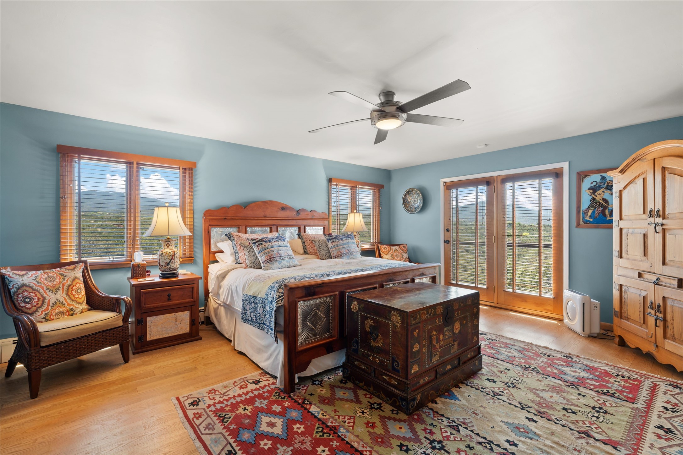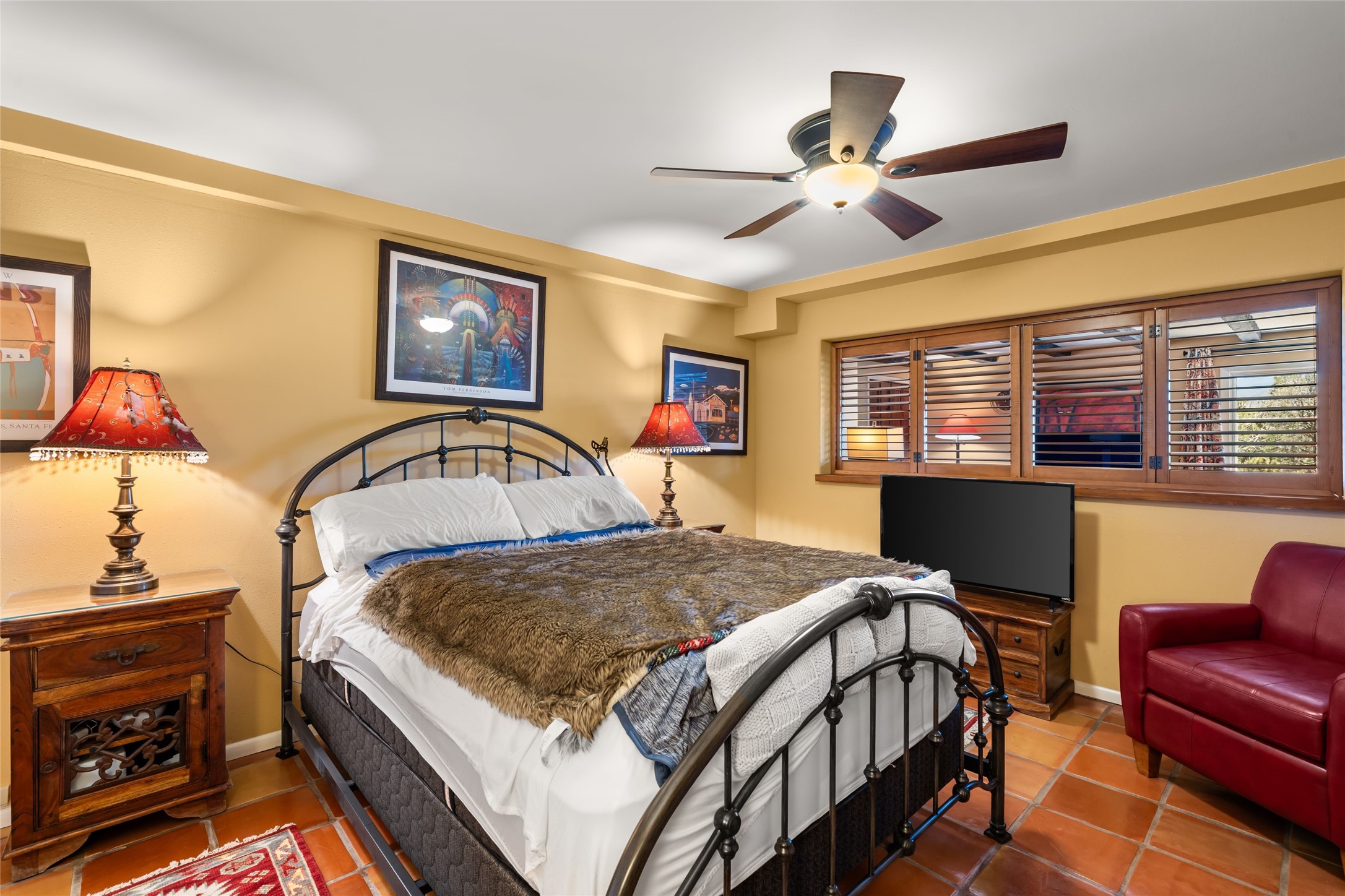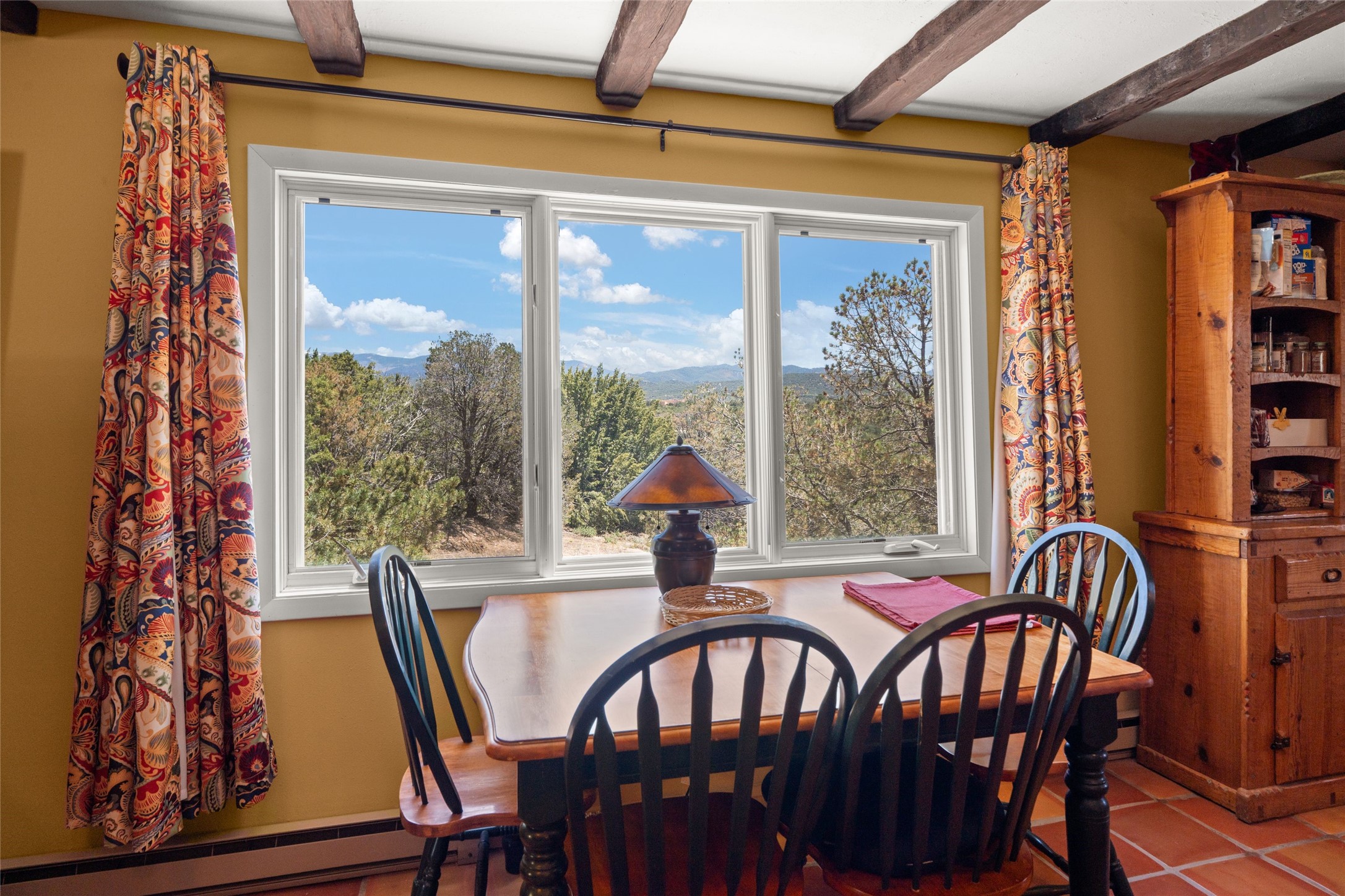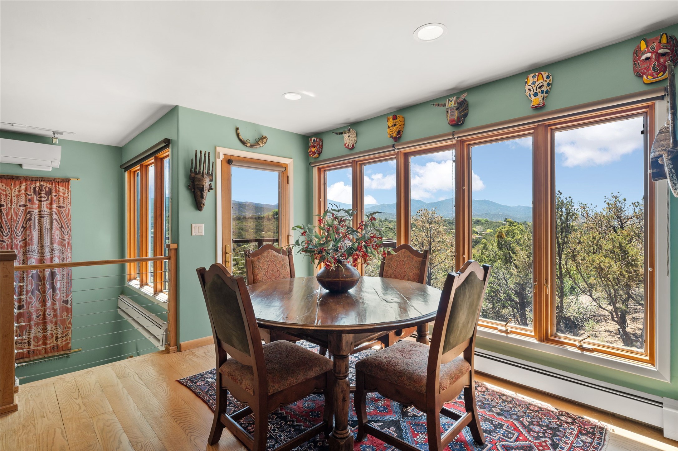 Located on 1.26 acres, a mile from the Plaza in the classic view filled Vista Encantada neighborhood, this home has been beautifully updated and landscaped. With the main living areas all on one level, there is also a one-bedroom lower-level casita with separate entry, full kitchen, big Sangre view and outdoor space. This makes for excellent privacy and separation for either guests, an income producing rental or a home office/studio situation. Entering the main house through a wide front veranda, there is a gracious entry and nice open feel between the living and dining rooms which both enjoy the stacked Anasazi stone fireplace, huge banks of windows to all the mountain views, fantastic light as well as open access to the kitchen. The cook's kitchen has new stainless appliances, granite counters, wine cooler, walk in pantry and plenty of storage. Super mud room/laundry off the kitchen leads to a large office or family room with separate entry and a breezeway to the two-car garage. Off the dining is a private covered bricked patio with views to Sun and Moon mountains, Atalaya, Picacho and the Sangres. Not to mention a private hot tub spot from which to enjoy sunrise or moonrise over the mountains with the sound of the fountain in the background! A sweet music room/game room leads back to the bedroom wing, with great storage for linens and extra outerwear. The two guest bedrooms share a full bath and the primary suite enjoys the big views, opens to a high wrap around ipe wood (a hard wood from South America) deck, gorgeous stacked stone bathroom with bidet and walk in closet with built ins. Down the stairs from the music room is a cozy office or study with a wall of bookcases and an incredible bonus storage room. There are mini splits throughout for summer cooling and solar to nearly eliminate your electric bill!