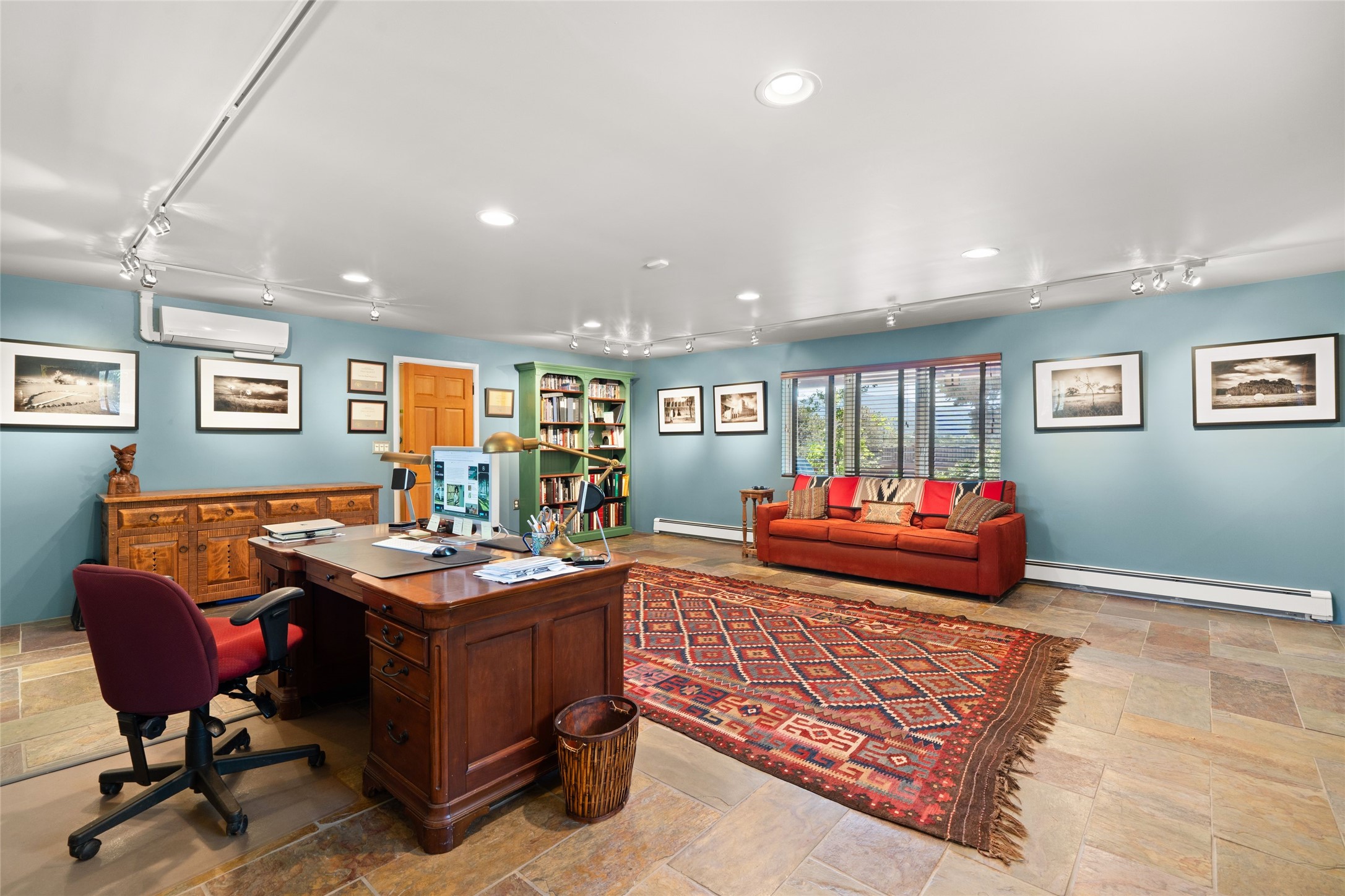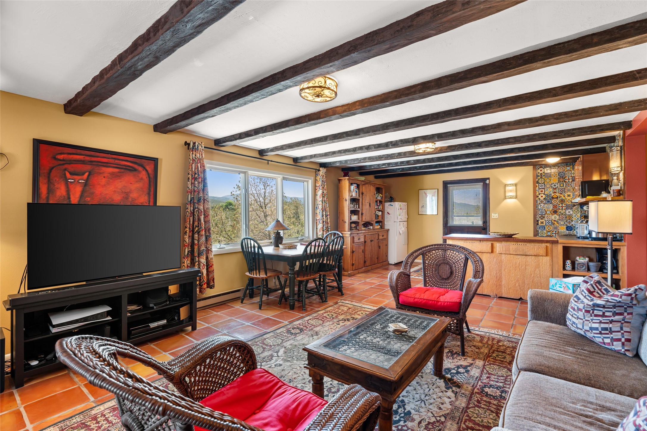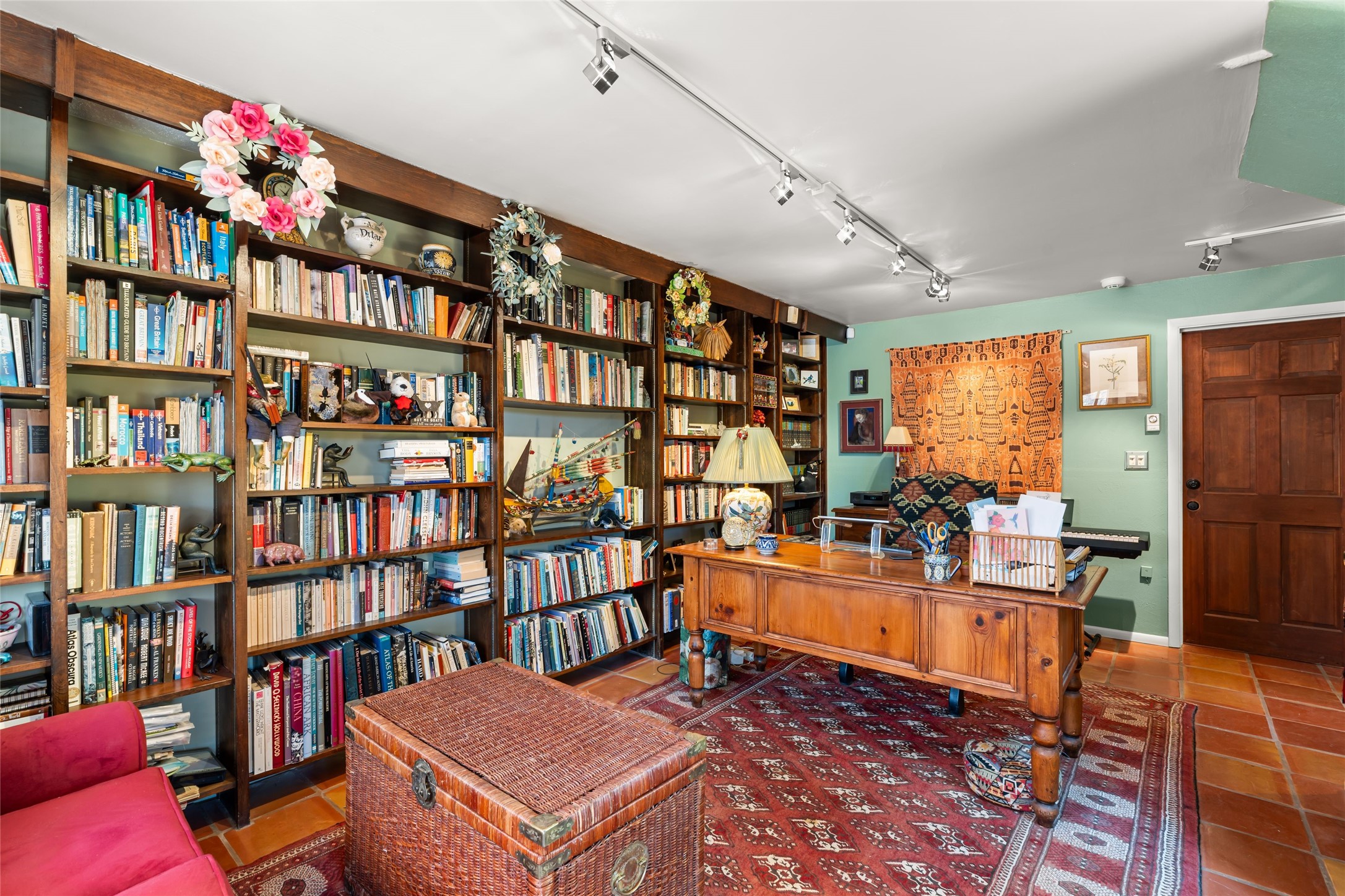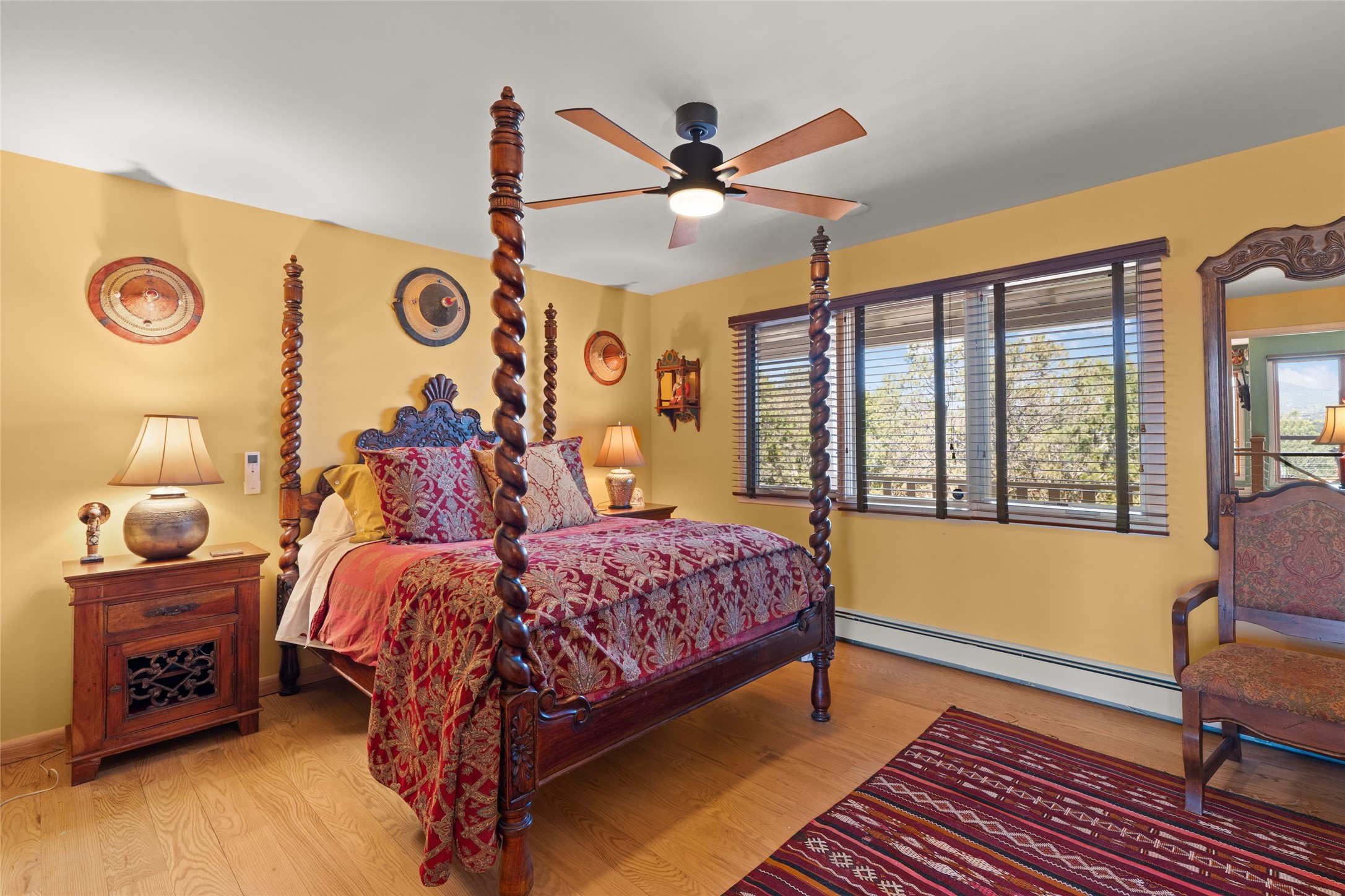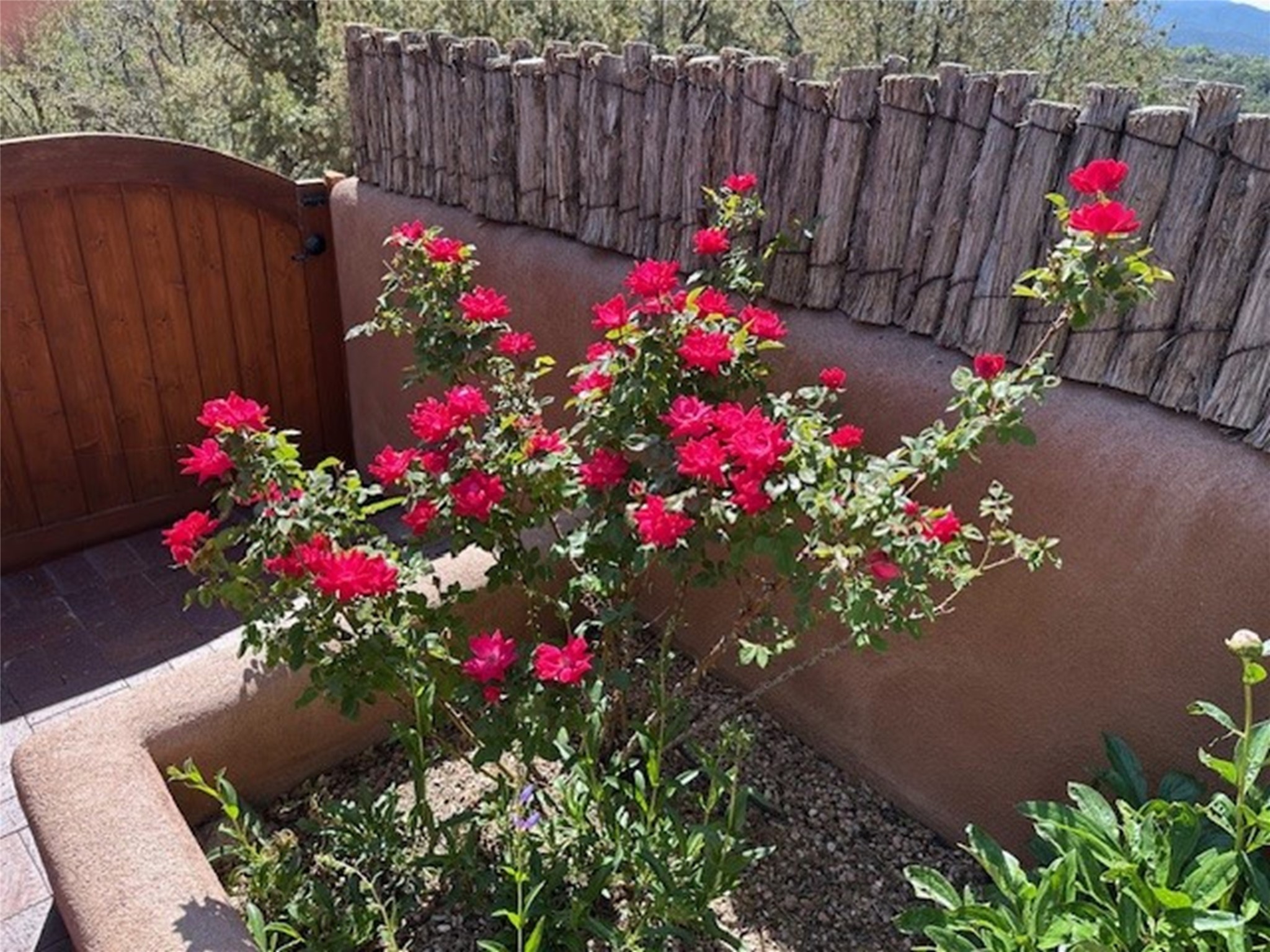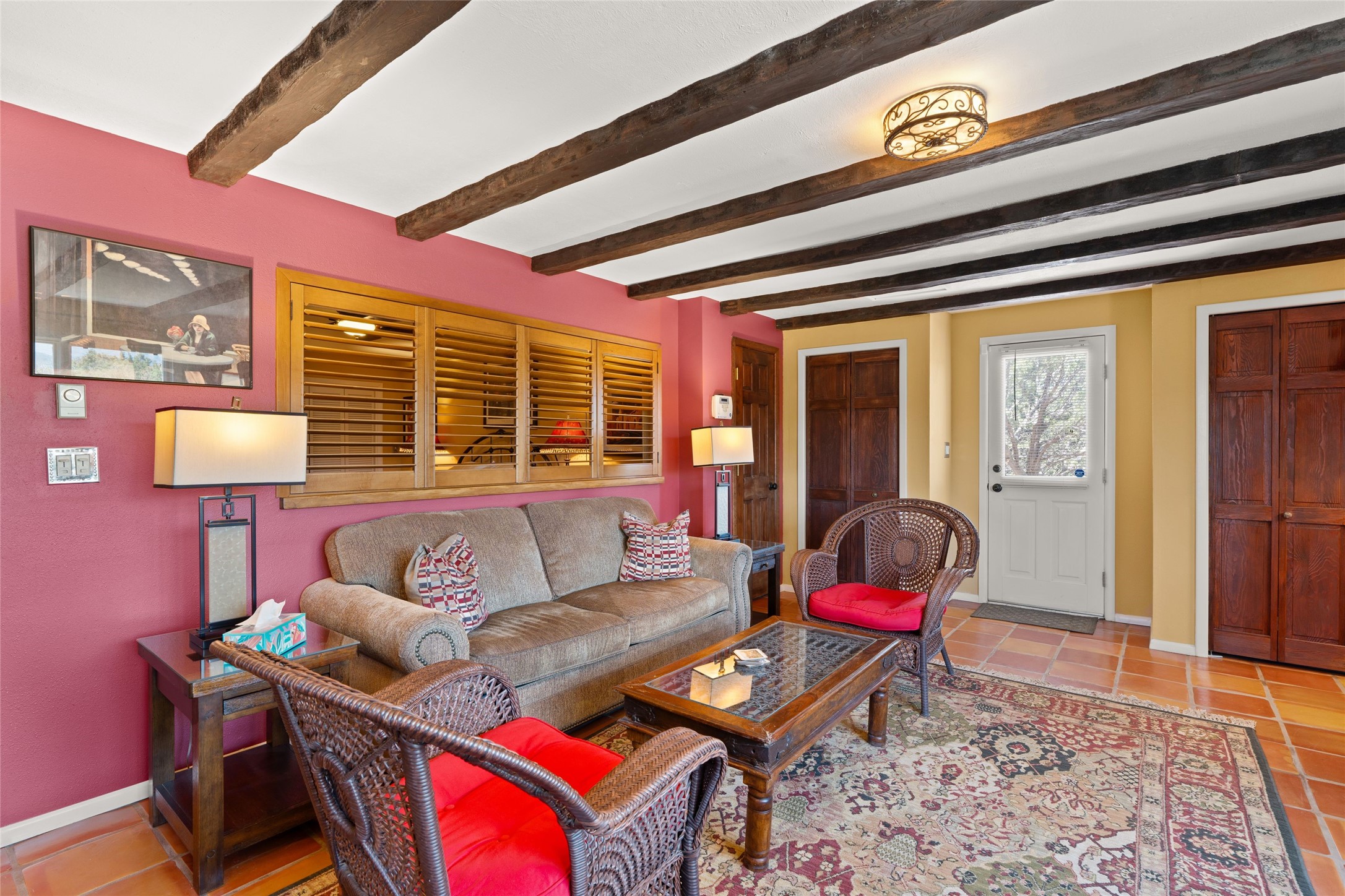 Located on 1.26 acres, a mile from the Plaza in the classic view filled Vista Encantada neighborhood, this home has been beautifully updated and landscaped. With the main living areas all on one level, there is also a one-bedroom lower-level casita with separate entry, full kitchen, big Sangre view and outdoor space. This makes for excellent privacy and separation for either guests, an income producing rental or a home office/studio situation. Entering the main house through a wide front veranda, there is a gracious entry and nice open feel between the living and dining rooms which both enjoy the stacked Anasazi stone fireplace, huge banks of windows to all the mountain views, fantastic light as well as open access to the kitchen. The cook's kitchen has new stainless appliances, granite counters, wine cooler, walk in pantry and plenty of storage. Super mud room/laundry off the kitchen leads to a large office or family room with separate entry and a breezeway to the two-car garage. Off the dining is a private covered bricked patio with views to Sun and Moon mountains, Atalaya, Picacho and the Sangres. Not to mention a private hot tub spot from which to enjoy sunrise or moonrise over the mountains with the sound of the fountain in the background! A sweet music room/game room leads back to the bedroom wing, with great storage for linens and extra outerwear. The two guest bedrooms share a full bath and the primary suite enjoys the big views, opens to a high wrap around ipe wood (a hard wood from South America) deck, gorgeous stacked stone bathroom with bidet and walk in closet with built ins. Down the stairs from the music room is a cozy office or study with a wall of bookcases and an incredible bonus storage room. There are mini splits throughout for summer cooling and solar to nearly eliminate your electric bill!