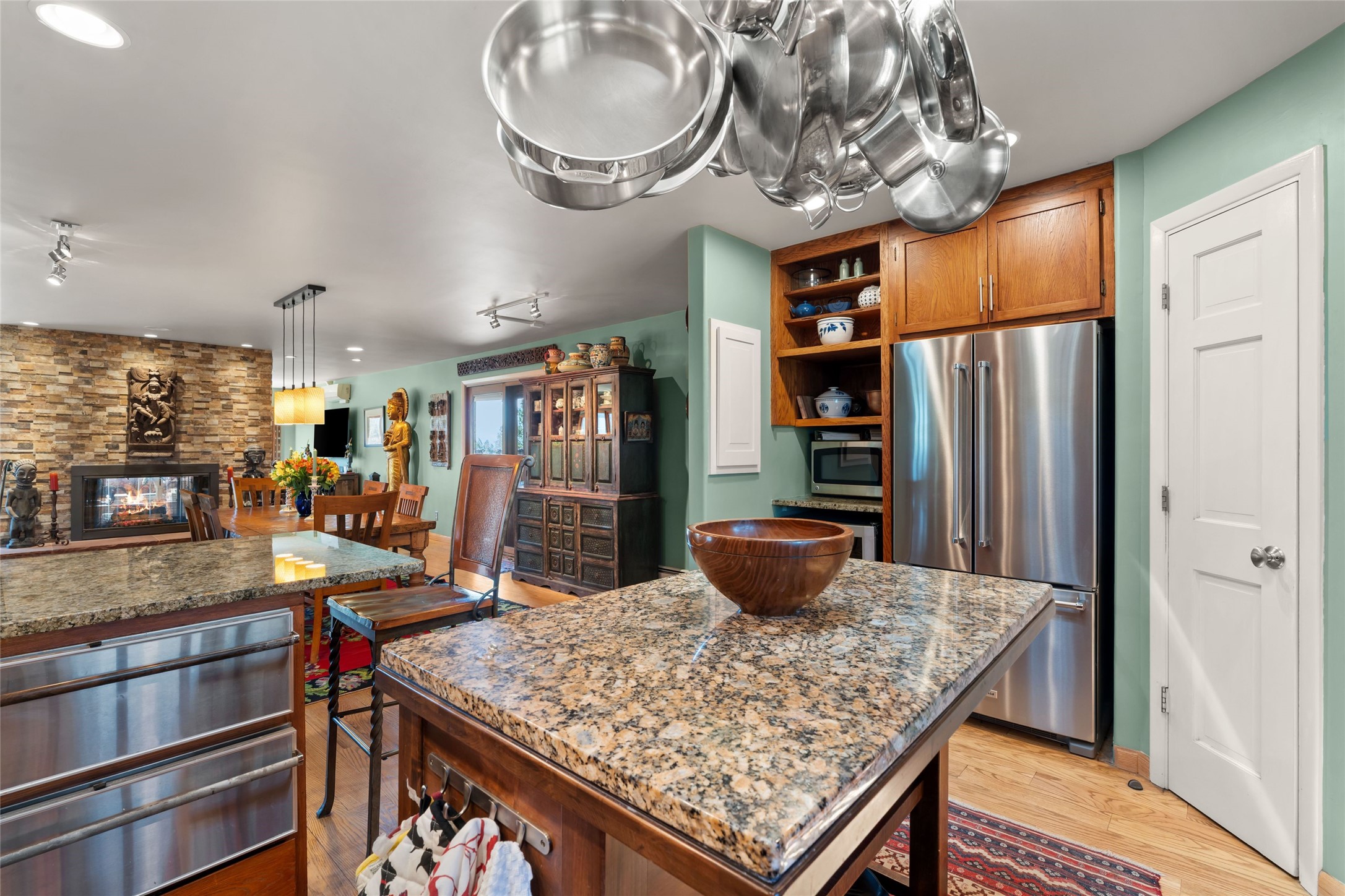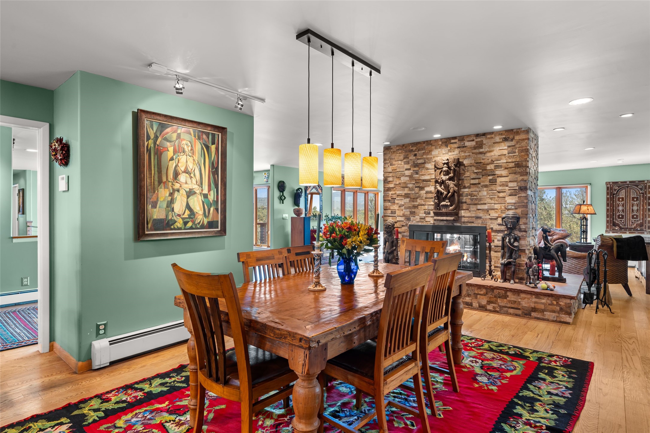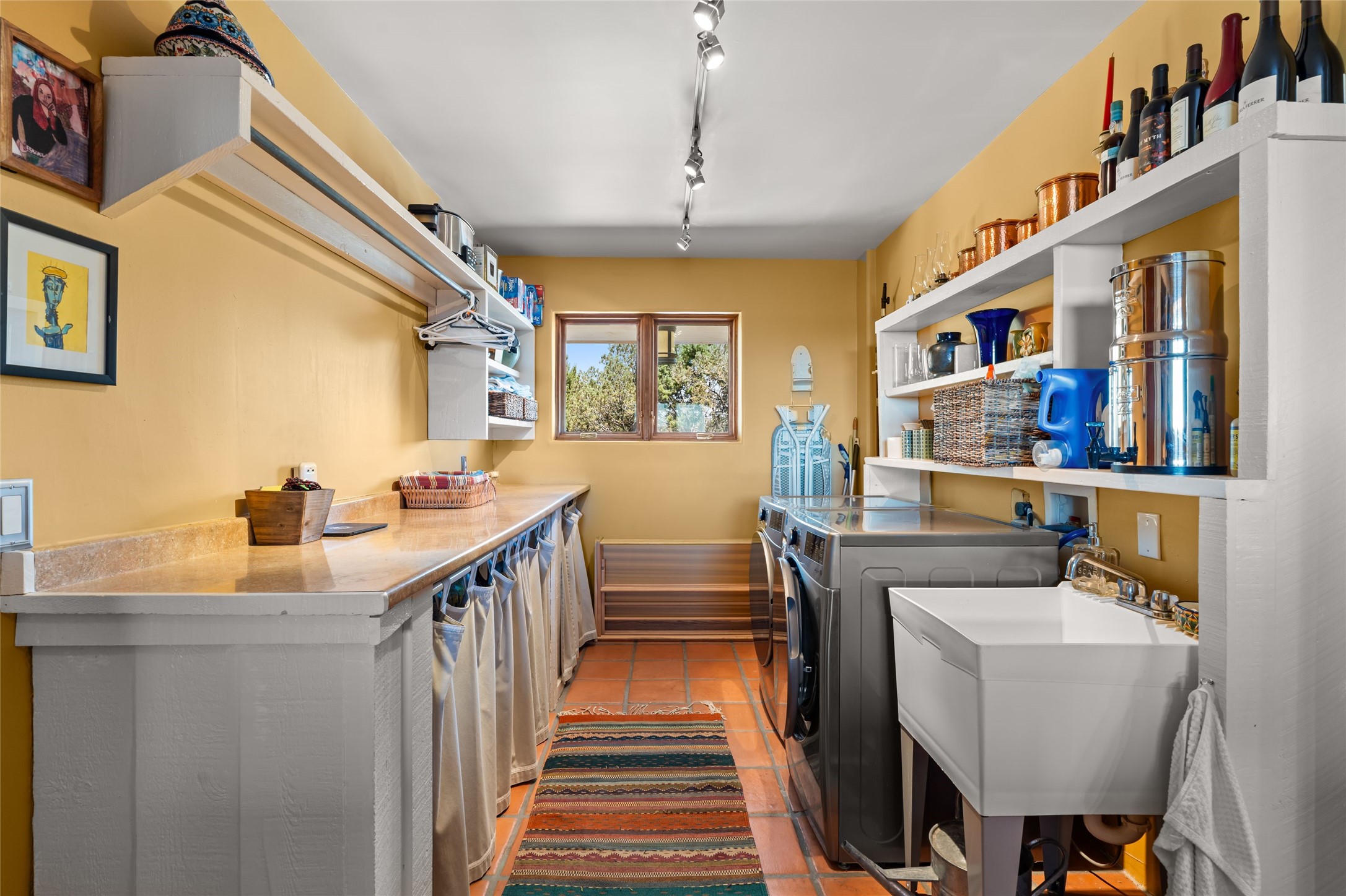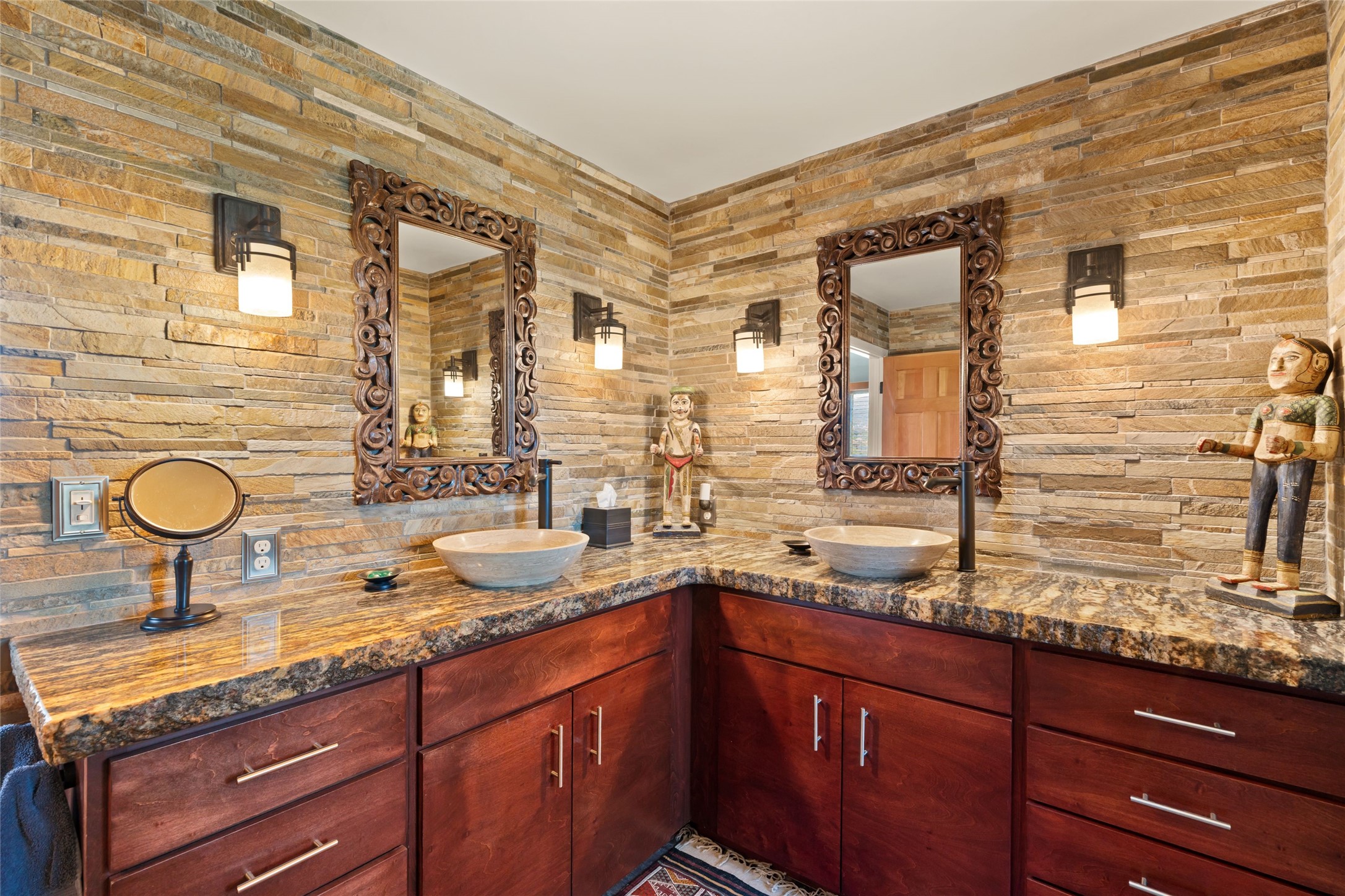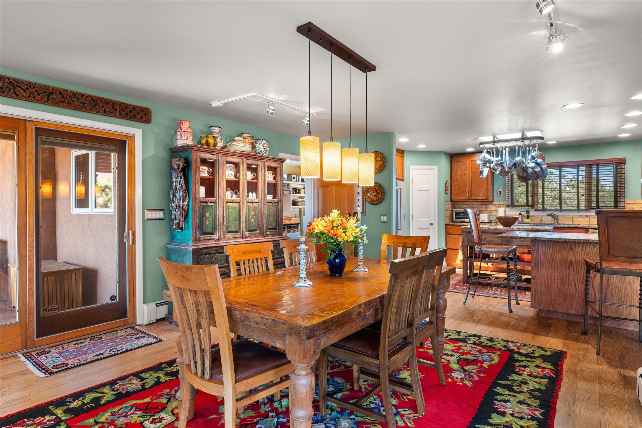Located on 1.26 acres, a mile from the Plaza in the classic view filled Vista Encantada neighborhood, this home has been beautifully updated and landscaped. With the main living areas all on one level, there is also a one-bedroom lower-level casita with separate entry, full kitchen, big Sangre view and outdoor space. This makes for excellent privacy and separation for either guests, an income producing rental or a home office/studio situation. Entering the main house through a wide front veranda, there is a gracious entry and nice open feel between the living and dining rooms which both enjoy the stacked Anasazi stone fireplace, huge banks of windows to all the mountain views, fantastic light as well as open access to the kitchen. The cook's kitchen has new stainless appliances, granite counters, wine cooler, walk in pantry and plenty of storage. Super mud room/laundry off the kitchen leads to a large office or family room with separate entry and a breezeway to the two-car garage. Off the dining is a private covered bricked patio with views to Sun and Moon mountains, Atalaya, Picacho and the Sangres. Not to mention a private hot tub spot from which to enjoy sunrise or moonrise over the mountains with the sound of the fountain in the background! A sweet music room/game room leads back to the bedroom wing, with great storage for linens and extra outerwear. The two guest bedrooms share a full bath and the primary suite enjoys the big views, opens to a high wrap around ipe wood (a hard wood from South America) deck, gorgeous stacked stone bathroom with bidet and walk in closet with built ins. Down the stairs from the music room is a cozy office or study with a wall of bookcases and an incredible bonus storage room. There are mini splits throughout for summer cooling and solar to nearly eliminate your electric bill!