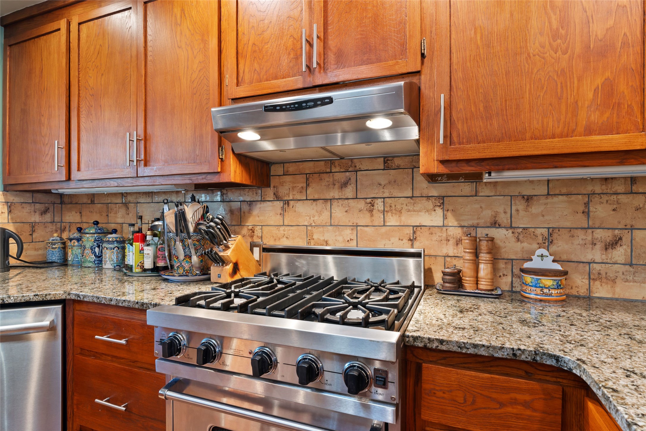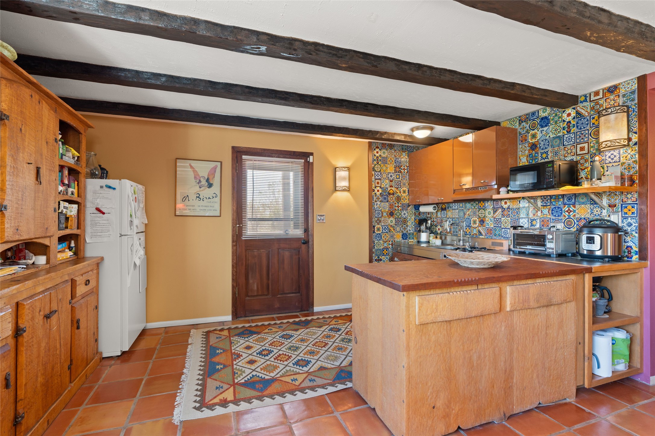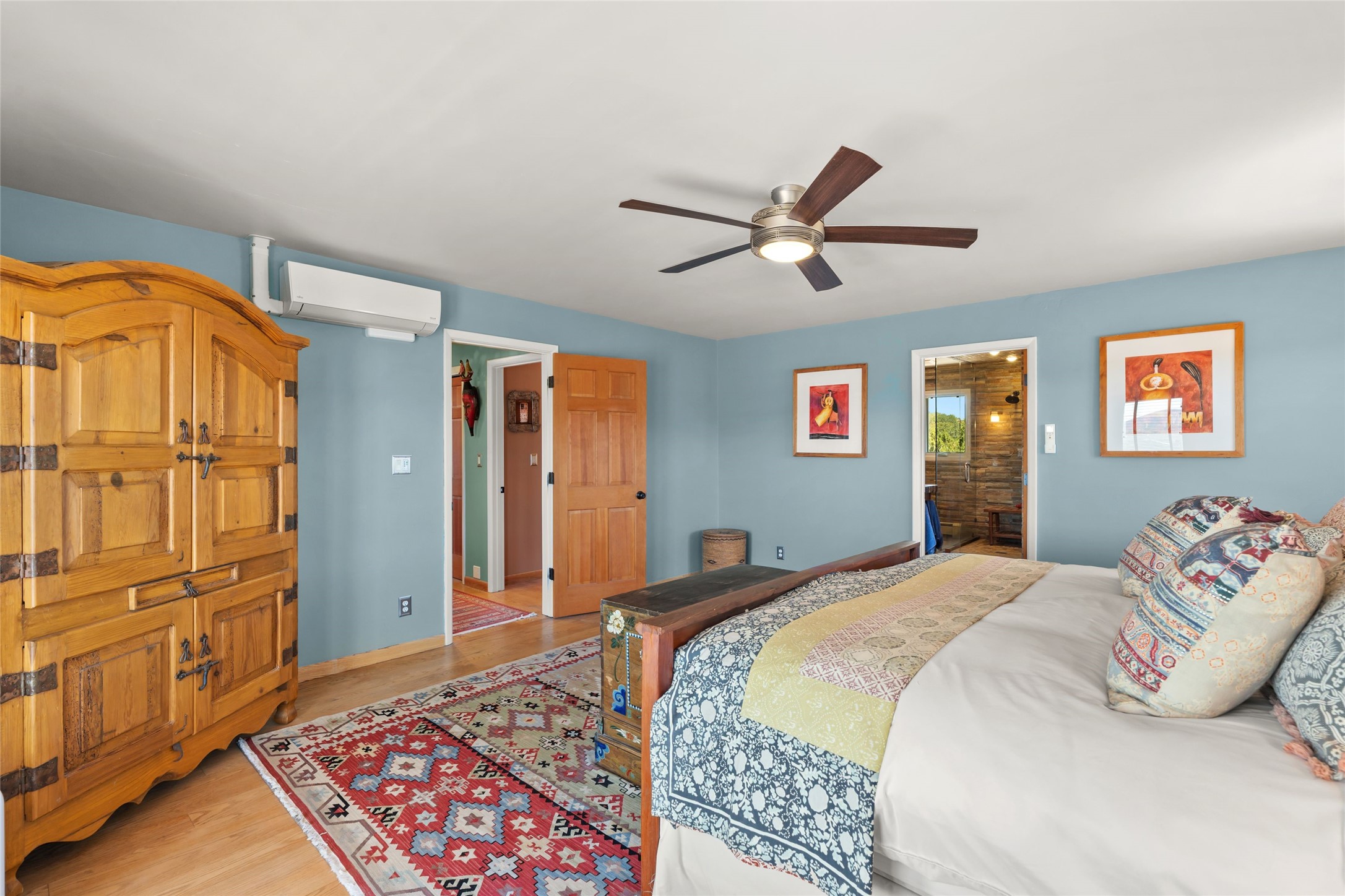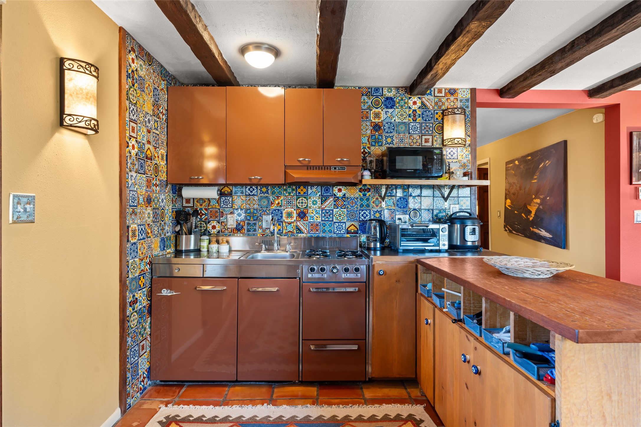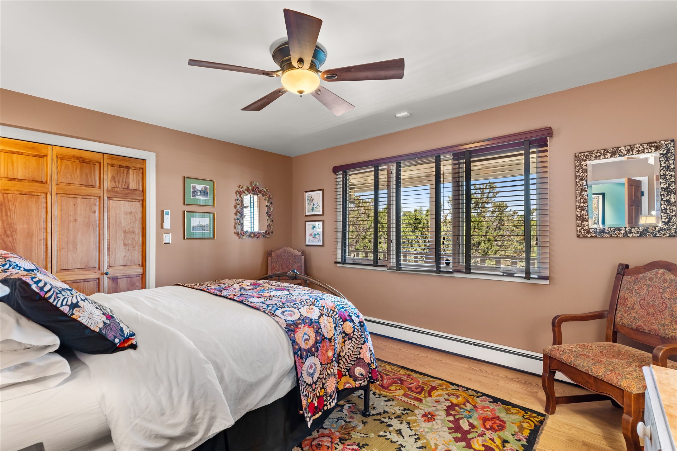 Located on 1.26 acres, a mile from the Plaza in the classic view filled Vista Encantada neighborhood, this home has been beautifully updated and landscaped. With the main living areas all on one level, there is also a one-bedroom lower-level casita with separate entry, full kitchen, big Sangre view and outdoor space. This makes for excellent privacy and separation for either guests, an income producing rental or a home office/studio situation. Entering the main house through a wide front veranda, there is a gracious entry and nice open feel between the living and dining rooms which both enjoy the stacked Anasazi stone fireplace, huge banks of windows to all the mountain views, fantastic light as well as open access to the kitchen. The cook's kitchen has new stainless appliances, granite counters, wine cooler, walk in pantry and plenty of storage. Super mud room/laundry off the kitchen leads to a large office or family room with separate entry and a breezeway to the two-car garage. Off the dining is a private covered bricked patio with views to Sun and Moon mountains, Atalaya, Picacho and the Sangres. Not to mention a private hot tub spot from which to enjoy sunrise or moonrise over the mountains with the sound of the fountain in the background! A sweet music room/game room leads back to the bedroom wing, with great storage for linens and extra outerwear. The two guest bedrooms share a full bath and the primary suite enjoys the big views, opens to a high wrap around ipe wood (a hard wood from South America) deck, gorgeous stacked stone bathroom with bidet and walk in closet with built ins. Down the stairs from the music room is a cozy office or study with a wall of bookcases and an incredible bonus storage room. There are mini splits throughout for summer cooling and solar to nearly eliminate your electric bill!