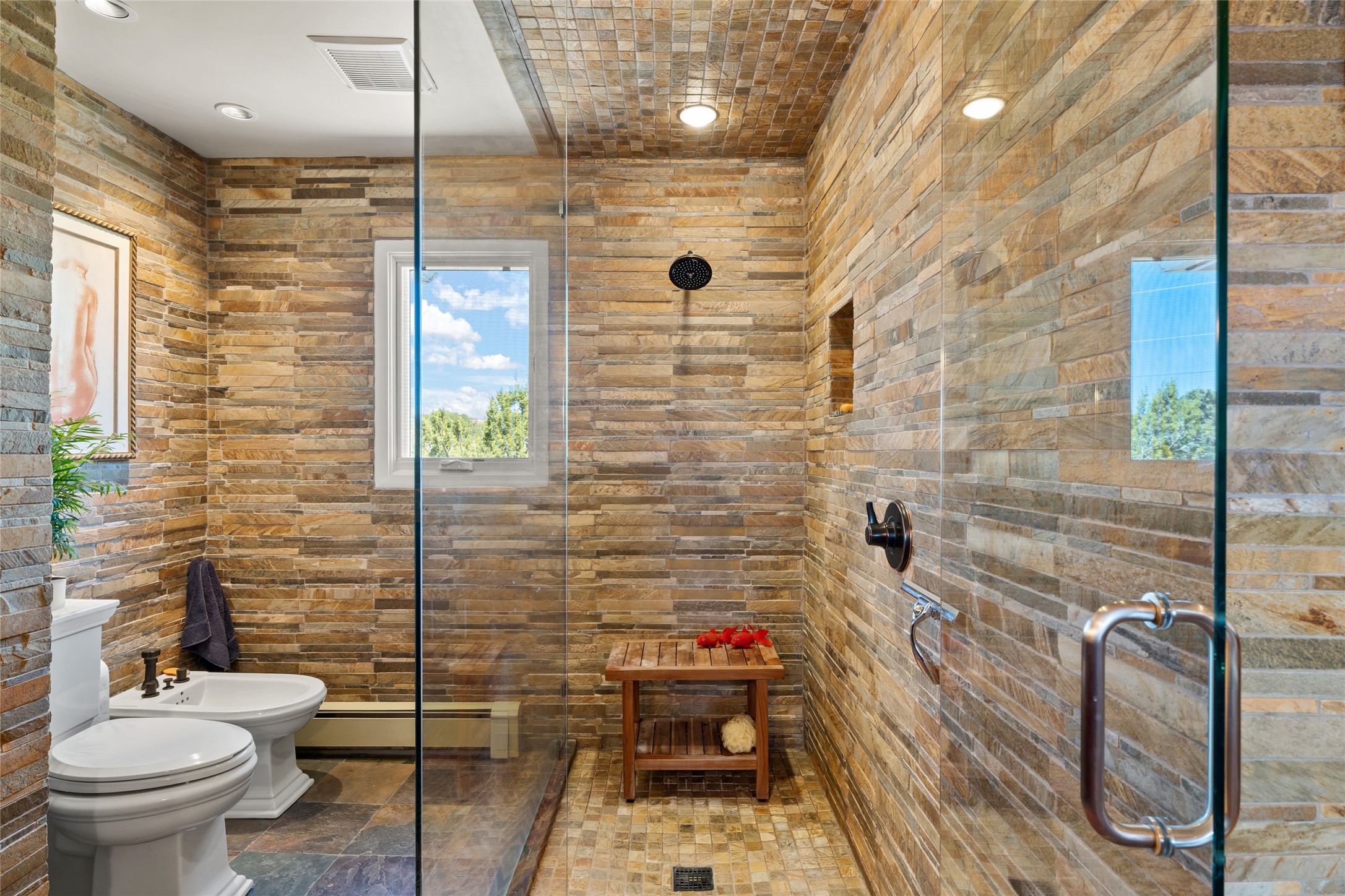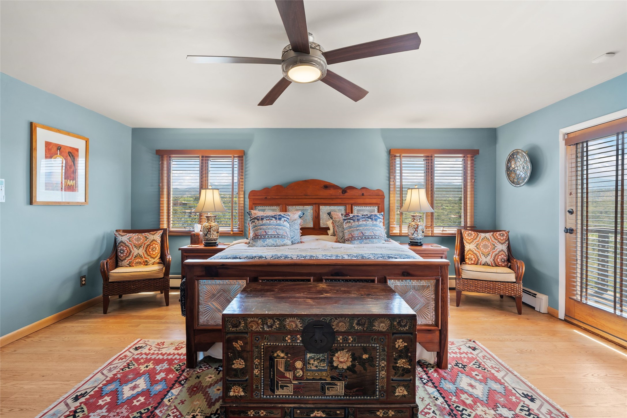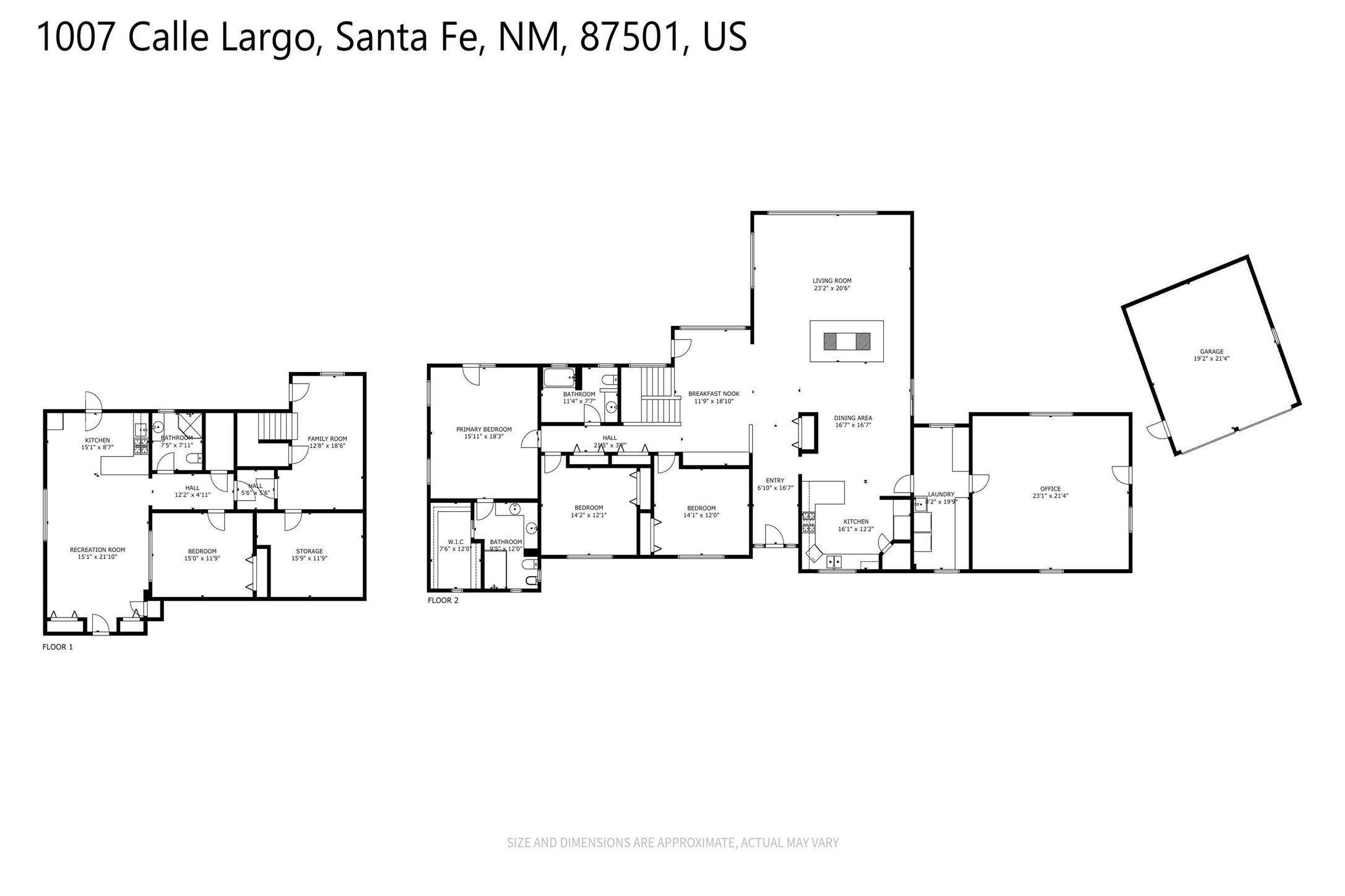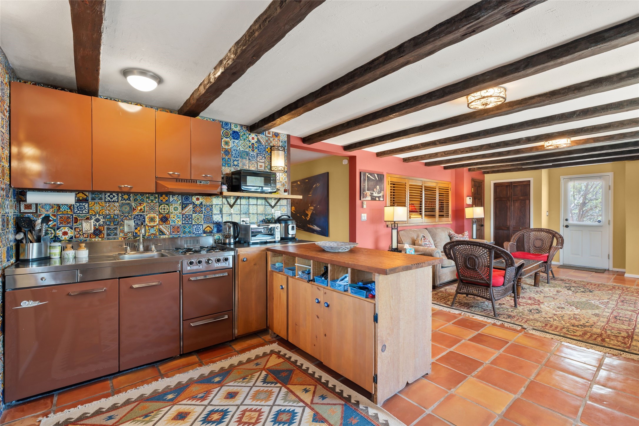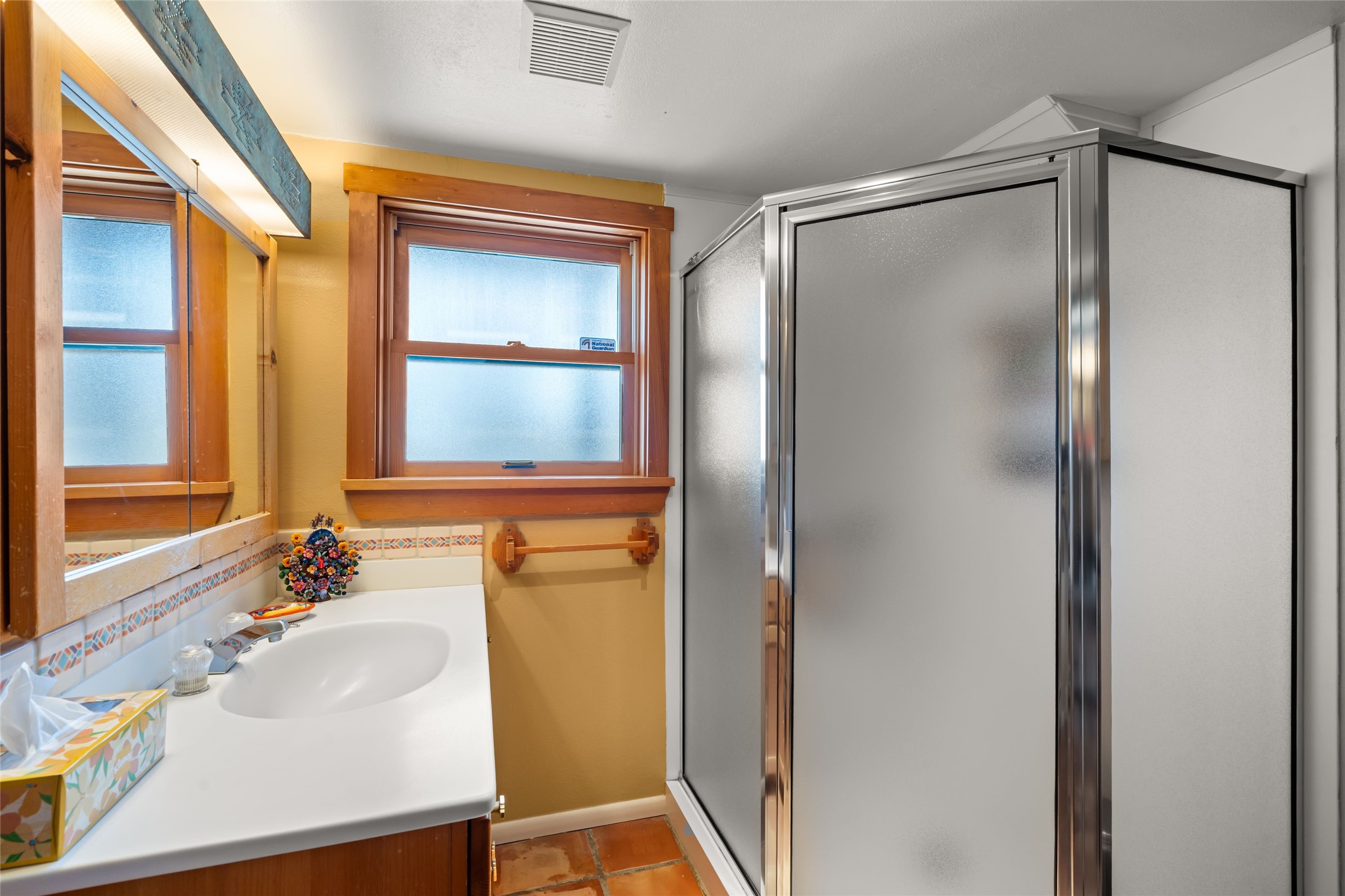 Located on 1.26 acres, a mile from the Plaza in the classic view filled Vista Encantada neighborhood, this home has been beautifully updated and landscaped. With the main living areas all on one level, there is also a one-bedroom lower-level casita with separate entry, full kitchen, big Sangre view and outdoor space. This makes for excellent privacy and separation for either guests, an income producing rental or a home office/studio situation. Entering the main house through a wide front veranda, there is a gracious entry and nice open feel between the living and dining rooms which both enjoy the stacked Anasazi stone fireplace, huge banks of windows to all the mountain views, fantastic light as well as open access to the kitchen. The cook's kitchen has new stainless appliances, granite counters, wine cooler, walk in pantry and plenty of storage. Super mud room/laundry off the kitchen leads to a large office or family room with separate entry and a breezeway to the two-car garage. Off the dining is a private covered bricked patio with views to Sun and Moon mountains, Atalaya, Picacho and the Sangres. Not to mention a private hot tub spot from which to enjoy sunrise or moonrise over the mountains with the sound of the fountain in the background! A sweet music room/game room leads back to the bedroom wing, with great storage for linens and extra outerwear. The two guest bedrooms share a full bath and the primary suite enjoys the big views, opens to a high wrap around ipe wood (a hard wood from South America) deck, gorgeous stacked stone bathroom with bidet and walk in closet with built ins. Down the stairs from the music room is a cozy office or study with a wall of bookcases and an incredible bonus storage room. There are mini splits throughout for summer cooling and solar to nearly eliminate your electric bill!