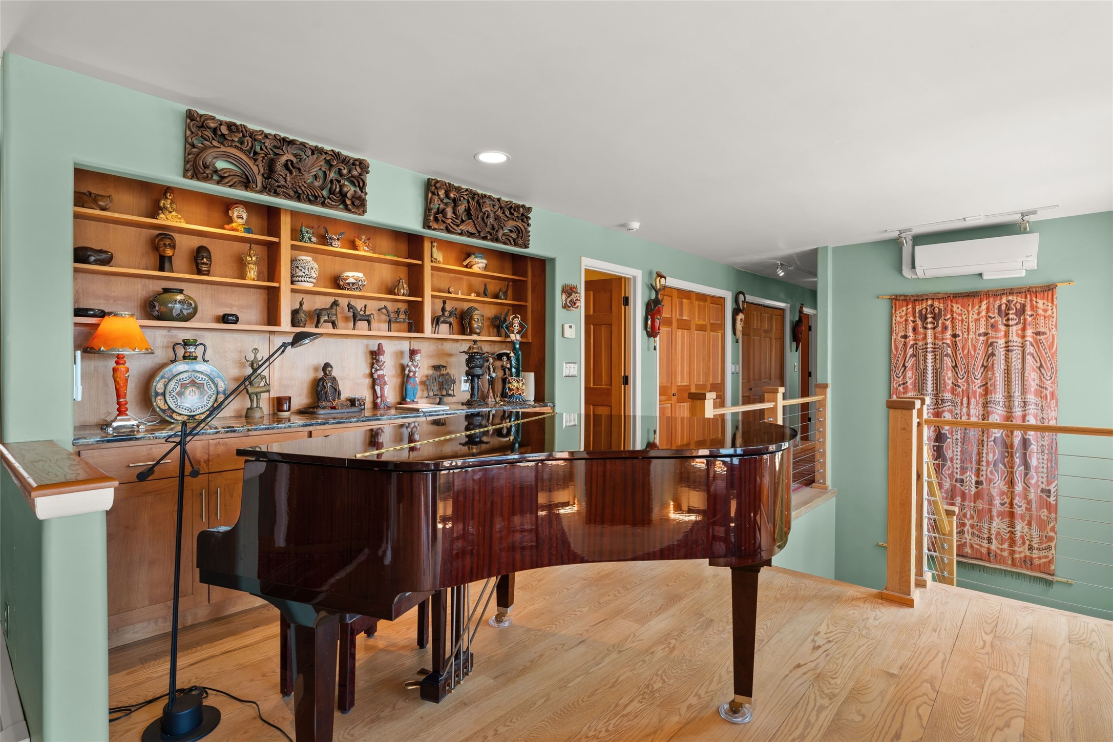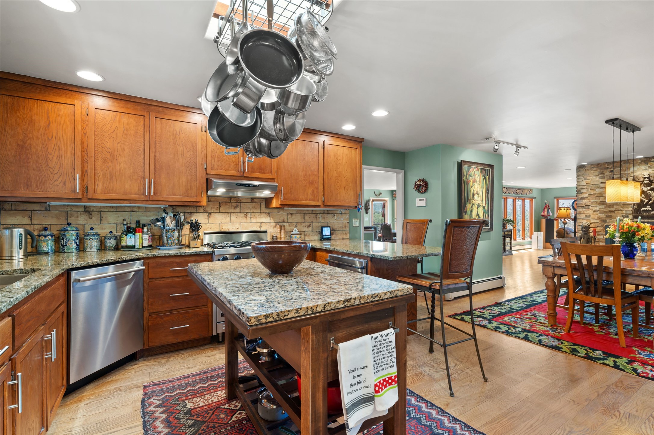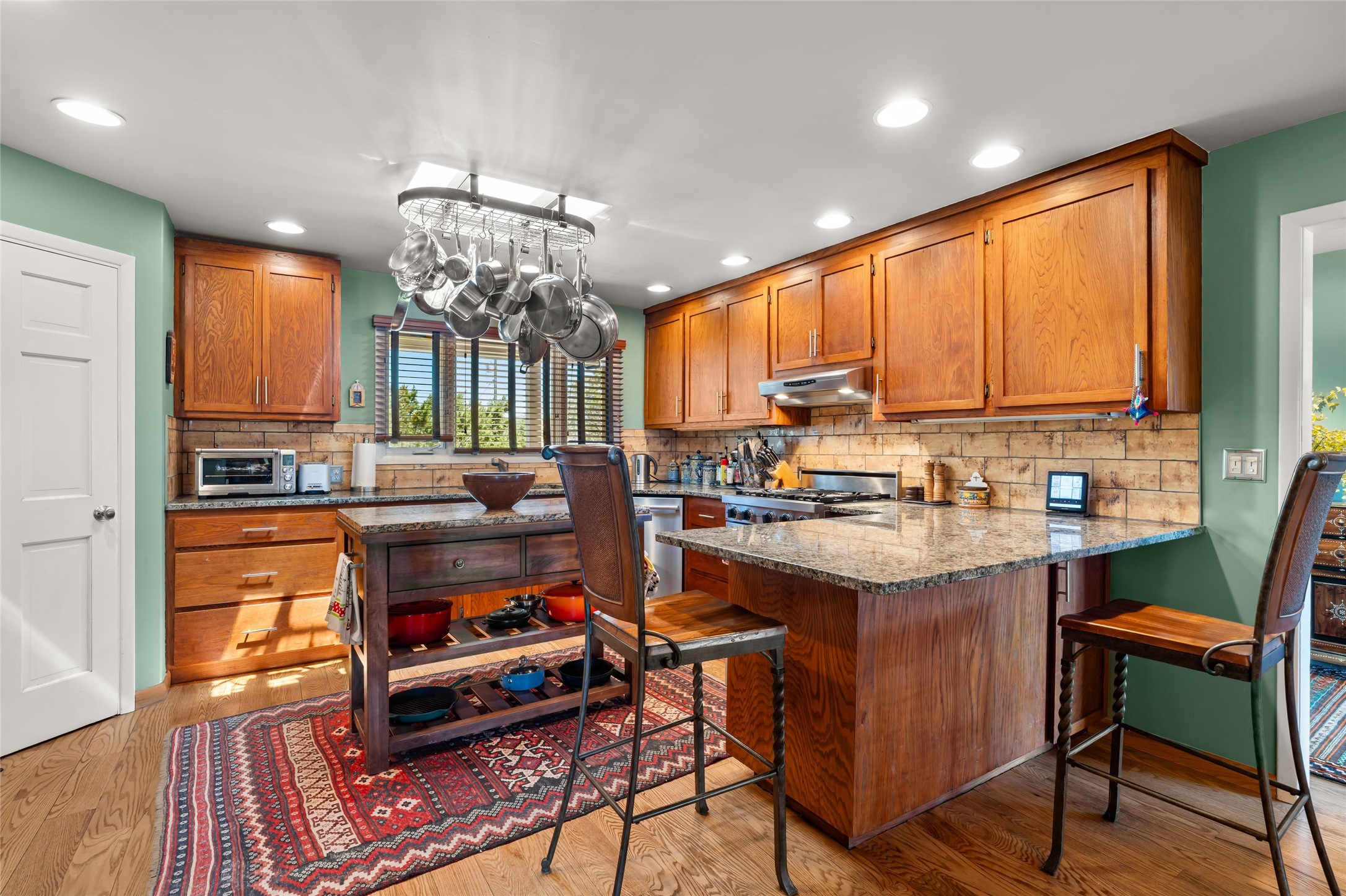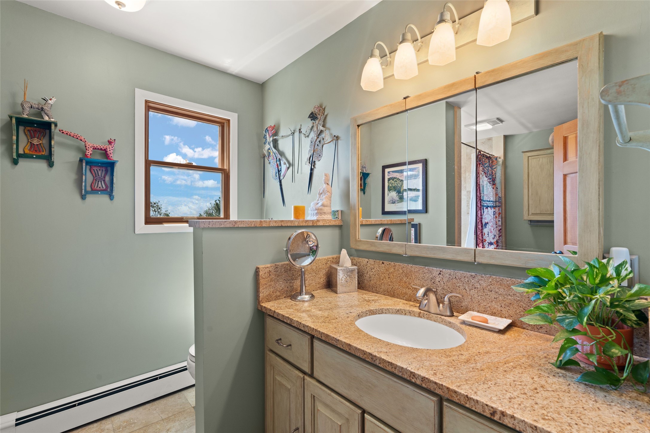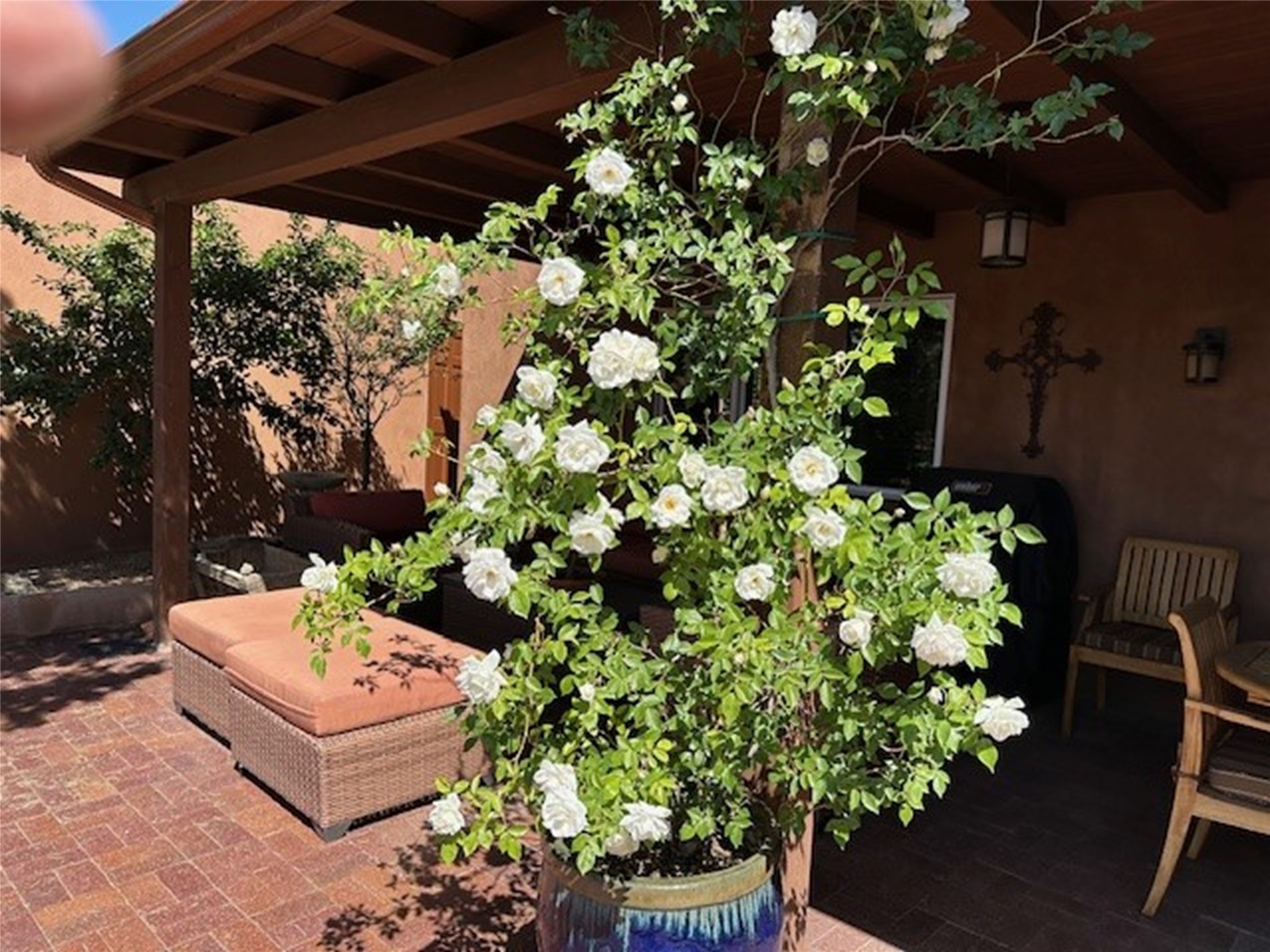 Located on 1.26 acres, a mile from the Plaza in the classic view filled Vista Encantada neighborhood, this home has been beautifully updated and landscaped. With the main living areas all on one level, there is also a one-bedroom lower-level casita with separate entry, full kitchen, big Sangre view and outdoor space. This makes for excellent privacy and separation for either guests, an income producing rental or a home office/studio situation. Entering the main house through a wide front veranda, there is a gracious entry and nice open feel between the living and dining rooms which both enjoy the stacked Anasazi stone fireplace, huge banks of windows to all the mountain views, fantastic light as well as open access to the kitchen. The cook's kitchen has new stainless appliances, granite counters, wine cooler, walk in pantry and plenty of storage. Super mud room/laundry off the kitchen leads to a large office or family room with separate entry and a breezeway to the two-car garage. Off the dining is a private covered bricked patio with views to Sun and Moon mountains, Atalaya, Picacho and the Sangres. Not to mention a private hot tub spot from which to enjoy sunrise or moonrise over the mountains with the sound of the fountain in the background! A sweet music room/game room leads back to the bedroom wing, with great storage for linens and extra outerwear. The two guest bedrooms share a full bath and the primary suite enjoys the big views, opens to a high wrap around ipe wood (a hard wood from South America) deck, gorgeous stacked stone bathroom with bidet and walk in closet with built ins. Down the stairs from the music room is a cozy office or study with a wall of bookcases and an incredible bonus storage room. There are mini splits throughout for summer cooling and solar to nearly eliminate your electric bill!