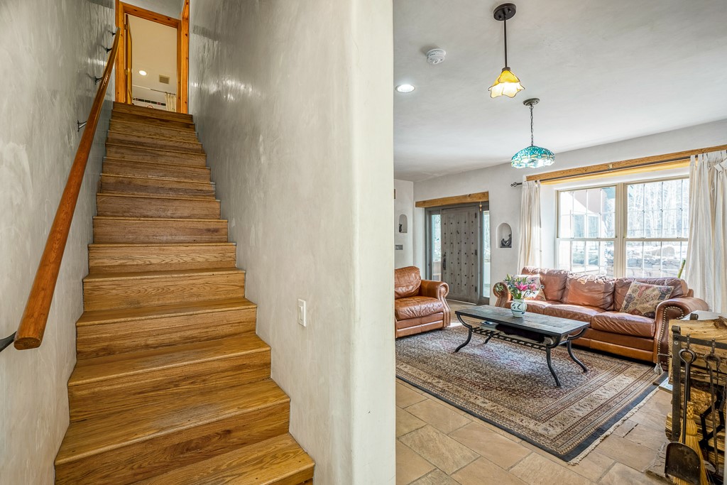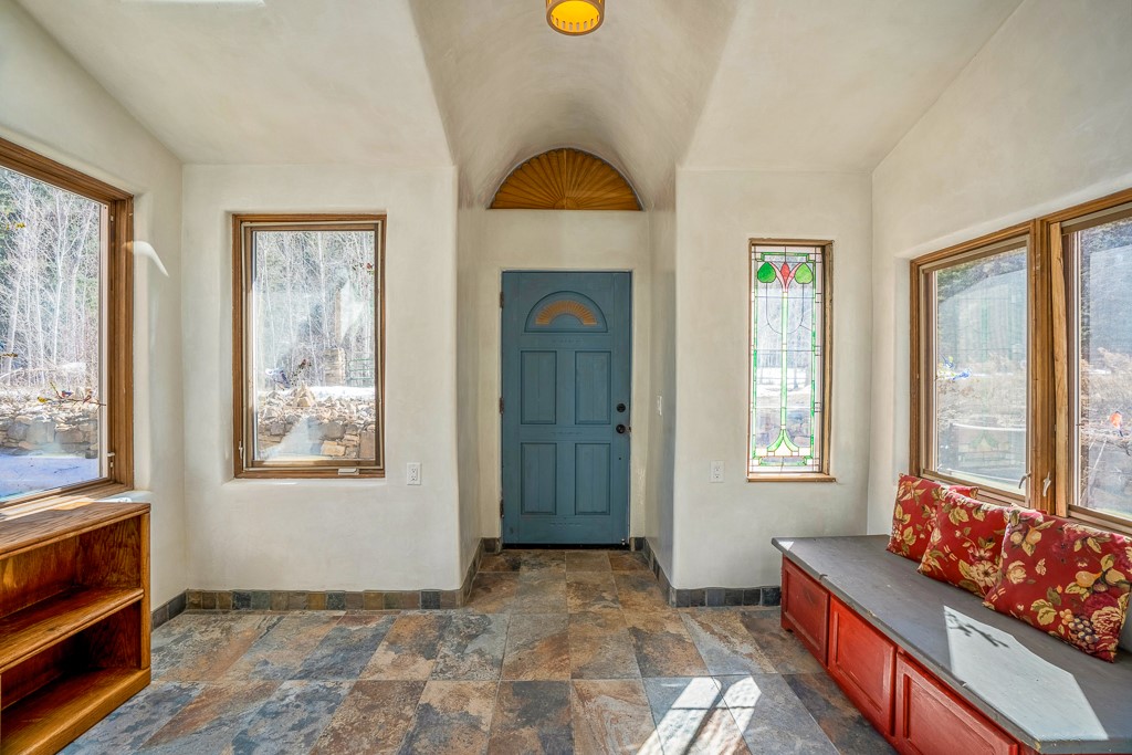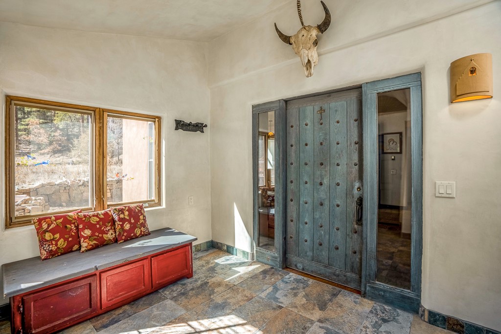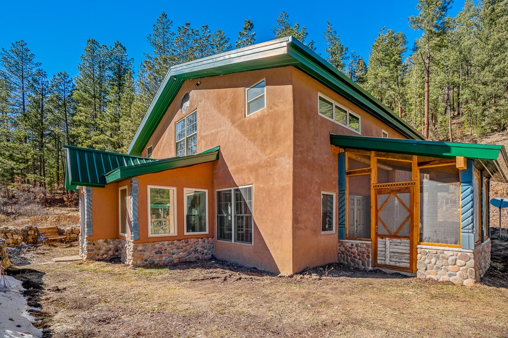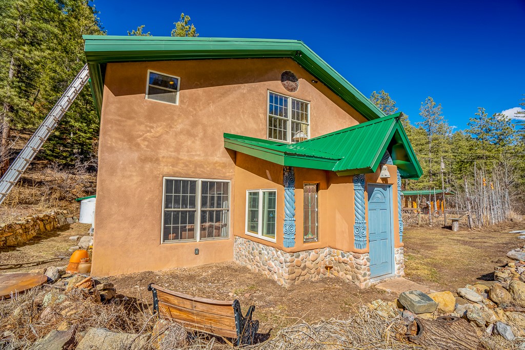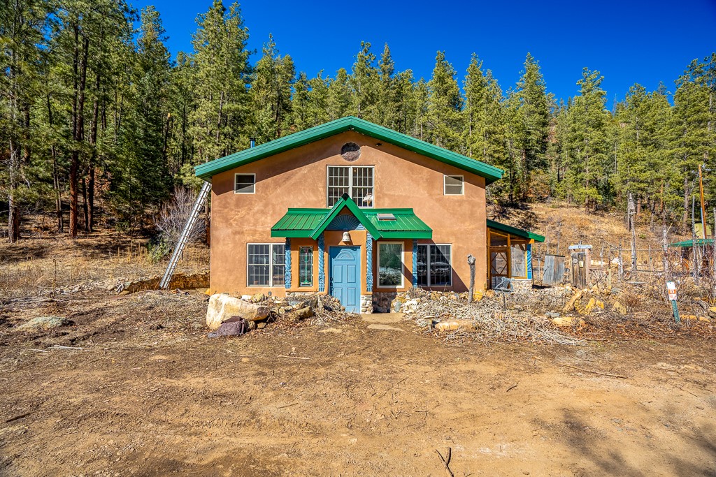 This exceptional pumice-crete home is a handcrafted sanctuary in the heart of the Santa Fe National Forest--set in a gated, 12-home enclave surrounded by thousands of acres of woodland and close to the gorgeous Pecos Wilderness and world class fishing in the Pecos River. Inside, Santa Fe-style elegance includes diamond plaster walls, hand-carved vigas, and flagstone floors. Built to endure, its 11-inch non-combustible walls and metal roof offer exceptional wildfire resilience.Just outside, an intermittent mountain stream runs through with aspen, ponderosa, and wildflower-filled canyon. Wildlife and serenity abound, and trails begin at your doorstep. Fully on-grid but off the beaten path--no cell service, no noise, total peace, with satellite internet available for those who need to check in with the world. The arts and culture of Santa Fe is just an hour away. Property features two large, high-ceilinged bedrooms upstairs, with 100-year old oak floors, as well as a bonus room perfect for art studio or office space. A smaller bedroom is on the first floor. Outdoor spaces abound, with an attached sunroom, fenced garden area, and gazebo perfect for summer cookouts. Two adjacent parcels also available. This is a one-of-a-kind chance to create a secure, nature-connected lifestyle in a rapidly changing world.