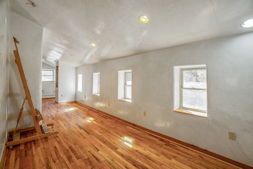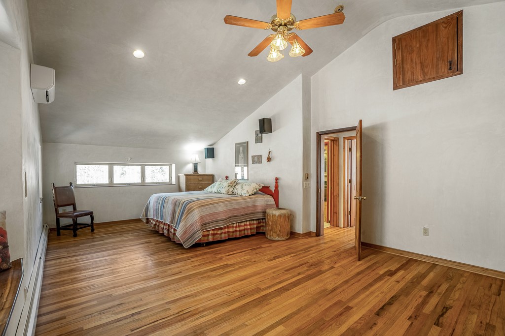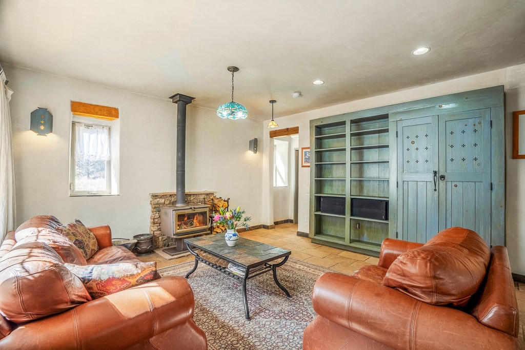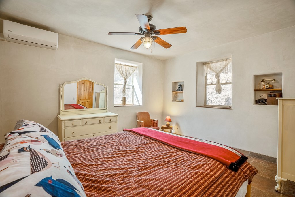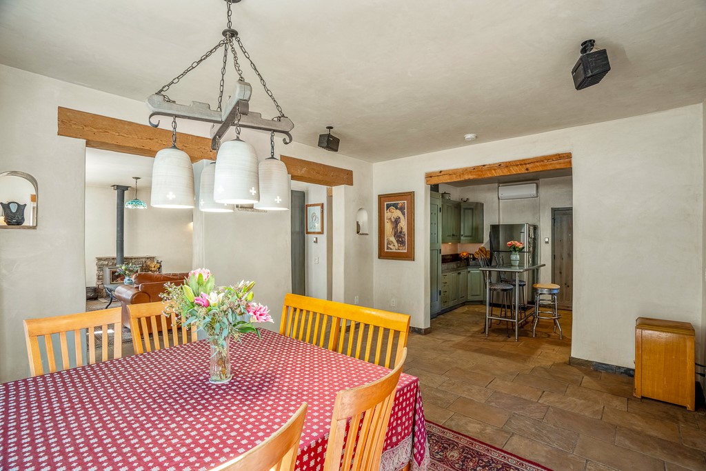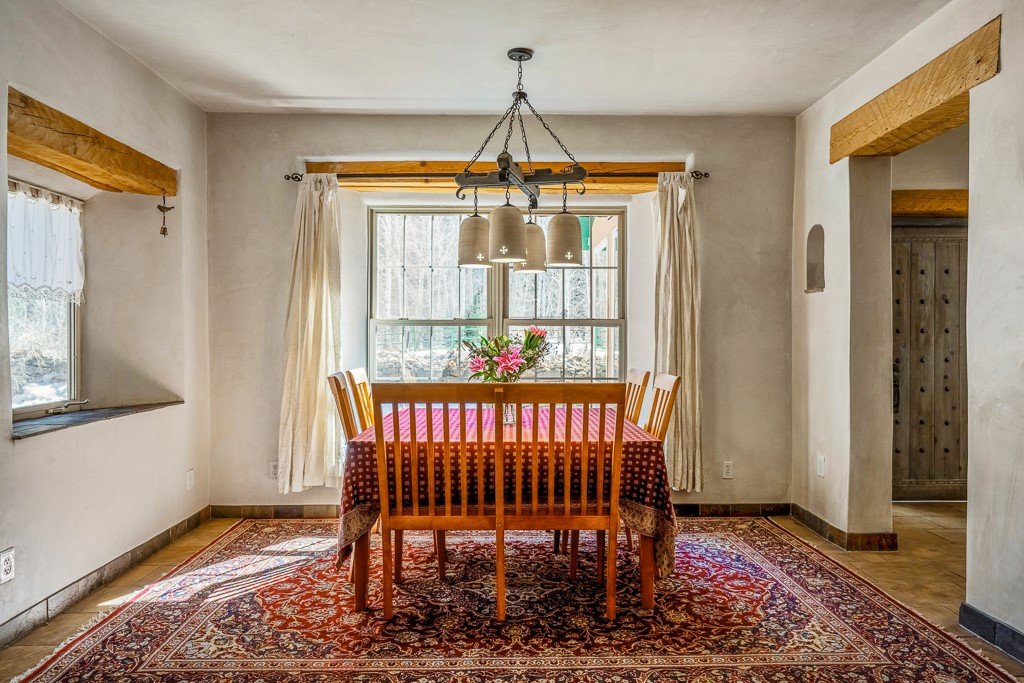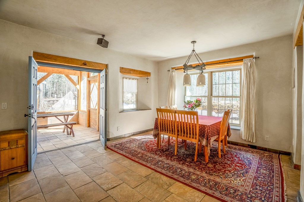 This exceptional pumice-crete home is a handcrafted sanctuary in the heart of the Santa Fe National Forest--set in a gated, 12-home enclave surrounded by thousands of acres of woodland and close to the gorgeous Pecos Wilderness and world class fishing in the Pecos River. Inside, Santa Fe-style elegance includes diamond plaster walls, hand-carved vigas, and flagstone floors. Built to endure, its 11-inch non-combustible walls and metal roof offer exceptional wildfire resilience.Just outside, an intermittent mountain stream runs through with aspen, ponderosa, and wildflower-filled canyon. Wildlife and serenity abound, and trails begin at your doorstep. Fully on-grid but off the beaten path--no cell service, no noise, total peace, with satellite internet available for those who need to check in with the world. The arts and culture of Santa Fe is just an hour away. Property features two large, high-ceilinged bedrooms upstairs, with 100-year old oak floors, as well as a bonus room perfect for art studio or office space. A smaller bedroom is on the first floor. Outdoor spaces abound, with an attached sunroom, fenced garden area, and gazebo perfect for summer cookouts. Two adjacent parcels also available. This is a one-of-a-kind chance to create a secure, nature-connected lifestyle in a rapidly changing world.