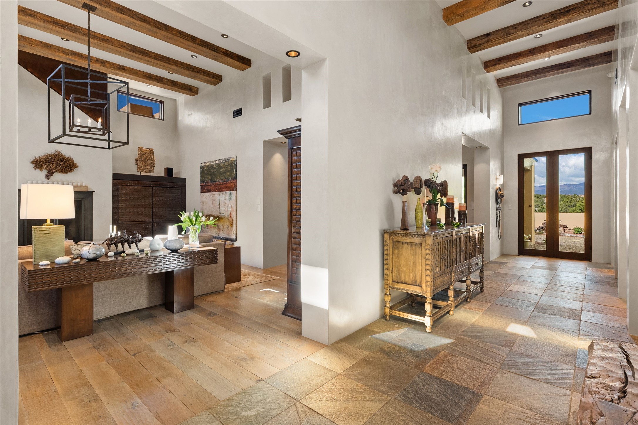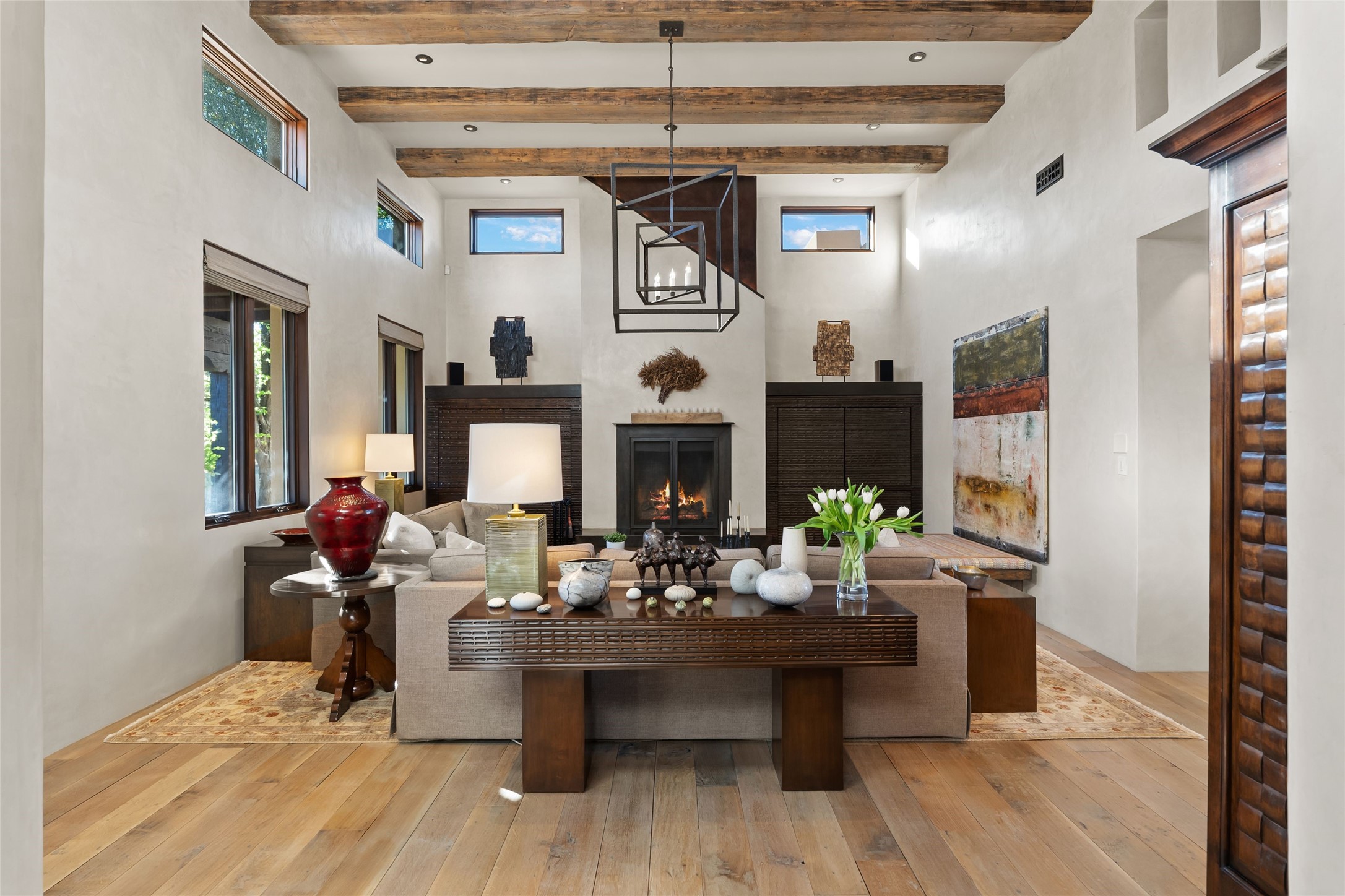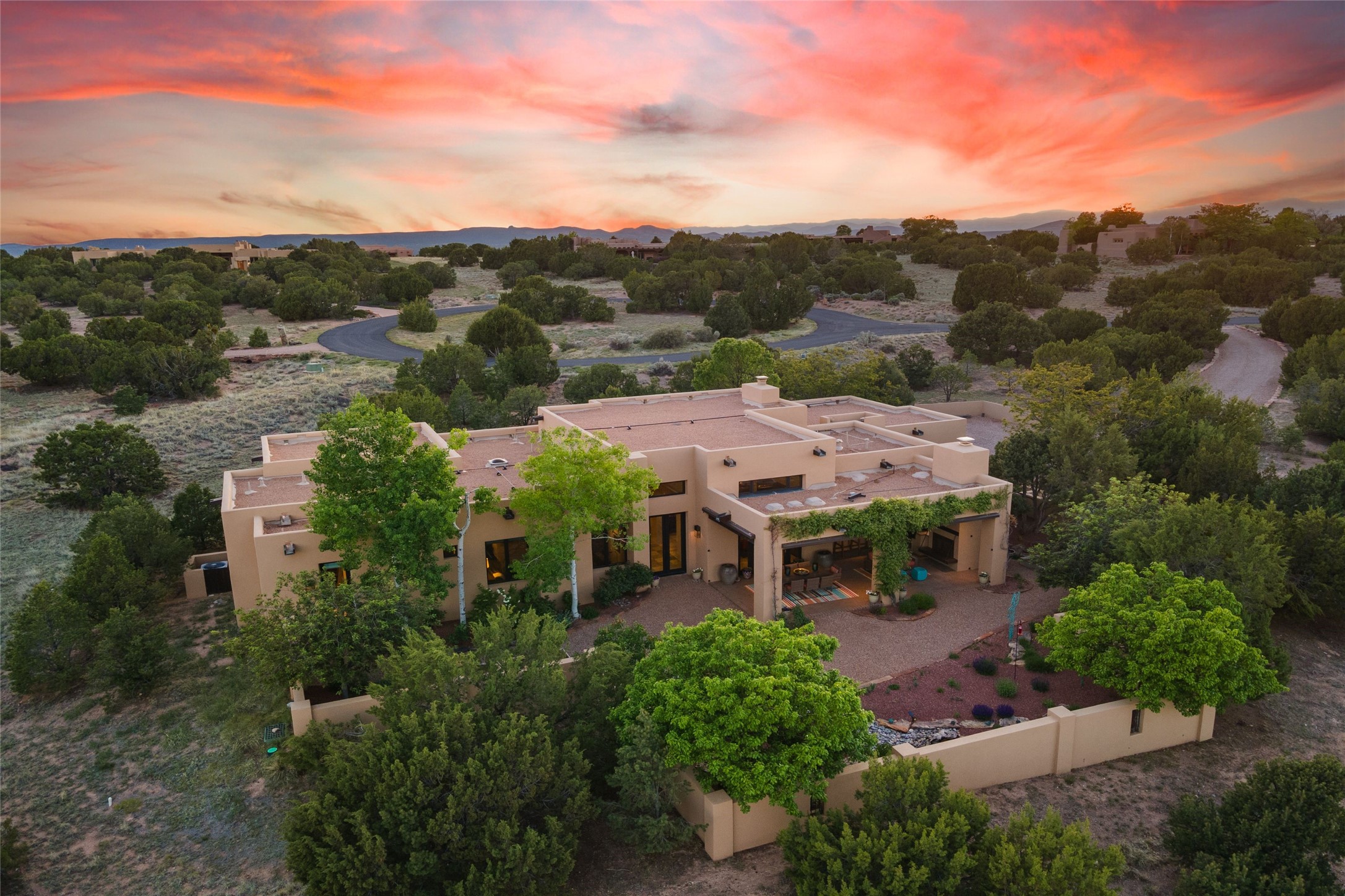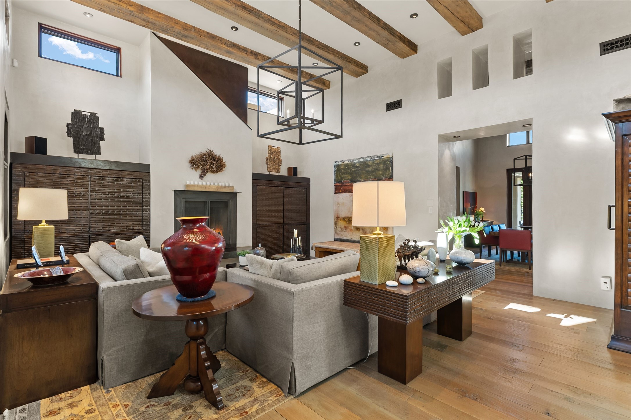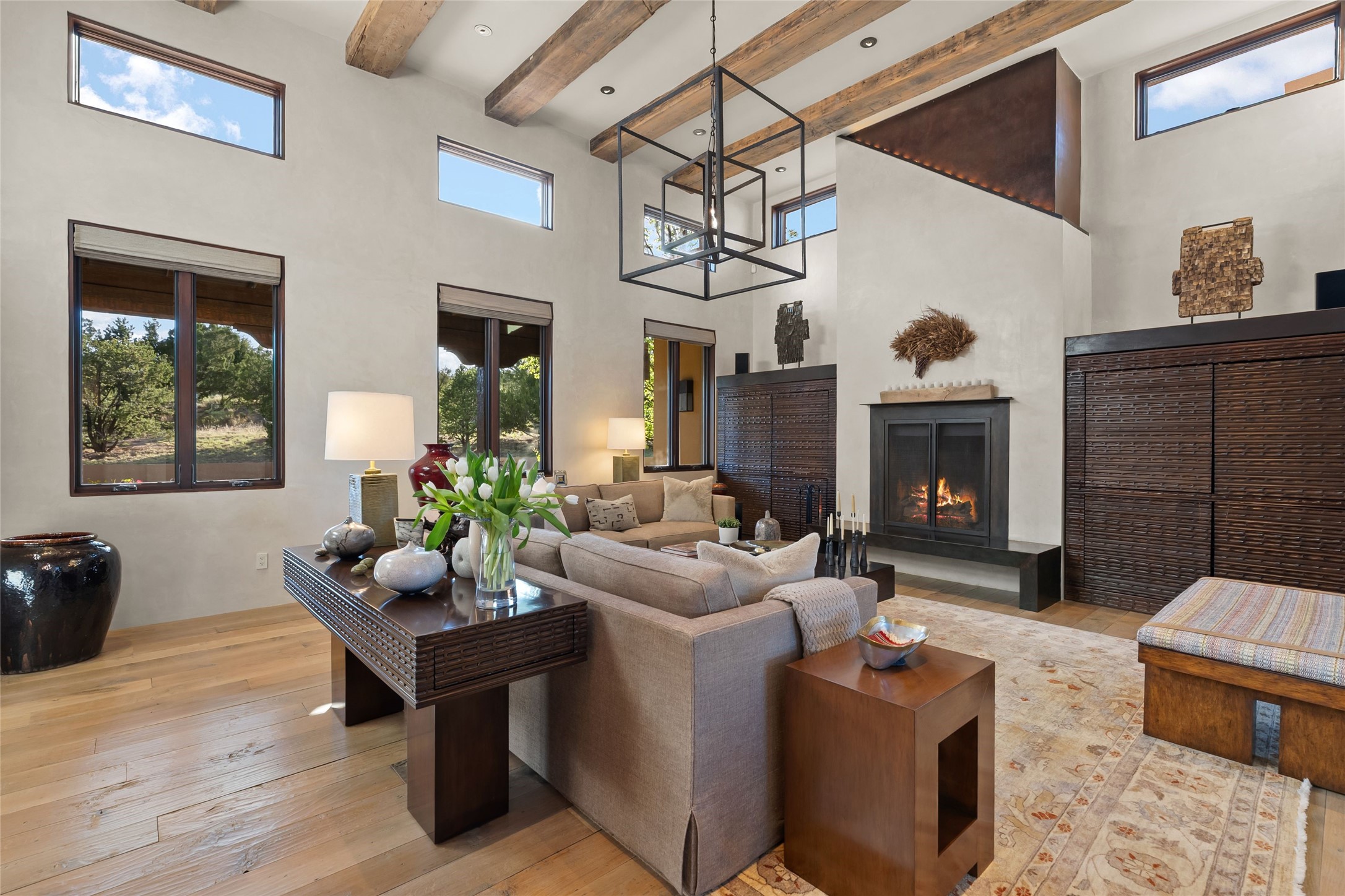 Nestled on nearly two secluded acres in prestigious Las Campanas, this extraordinary, custom interior designer's residence offers an unparalleled connection to Santa Fe's natural splendor. Wake to the majestic Sangre de Cristo mountains, painting an ever-changing canvas outside your window--snow-capped peaks in winter, golden sunset light at dusk, and songbirds as your daily companions. This isn't just a home; it's a masterpiece where every custom detail tells a story. The architecture is by acclaimed architect David Lorimer, and the interiors and furnishings are by award-winning ASID interior designer Jeannie Brown. From century-old reclaimed beams, antique Mexican doors to hand-hewn oak floors, each element was personally selected and designed. The result? A living work of art that only a designer's own sanctuary can achieve.The heart of the home flows seamlessly from the stunning Rumford fireplace to the gourmet kitchen with professional-grade appliances to an entertainer's portal, where you'll find yourself lingering over morning coffee or evening wine, mesmerized by the mountain vistas. Three thoughtfully designed bedrooms include a luxurious master retreat and private guest suite. Premium finishes throughout feature diamond plaster and custom lighting that creates pure magic at the golden hour. When you're ready, downtown Santa Fe's acclaimed restaurants and galleries await just minutes away. This home is more than luxury living--it's a lifestyle immersed in beauty, nature, and the unique spirit of Santa Fe, where luxury meets the land of enchantment.