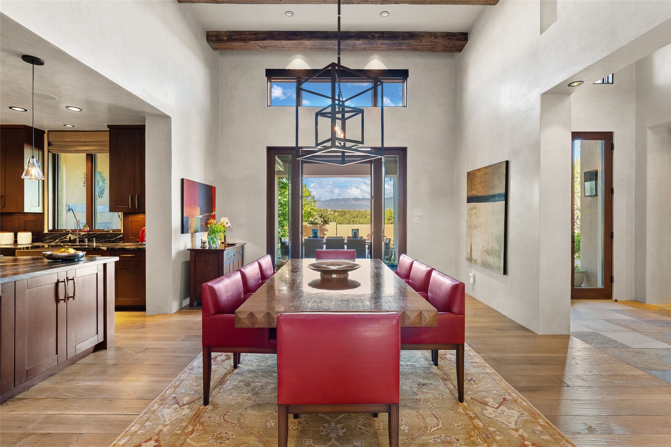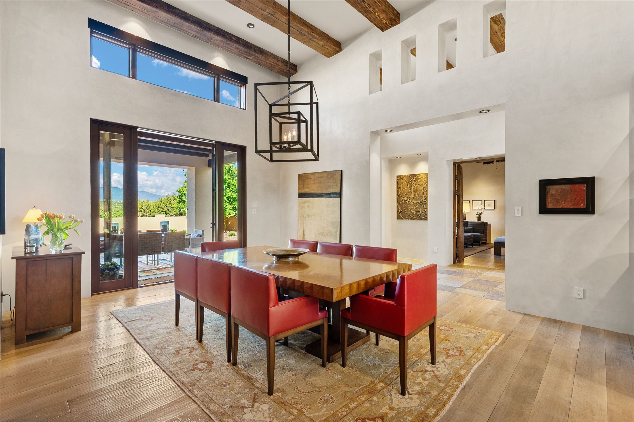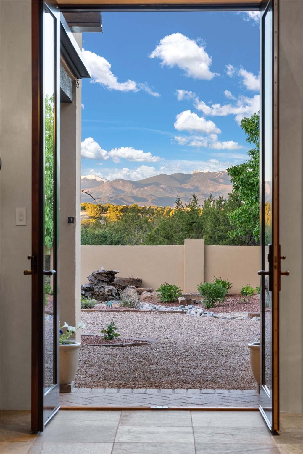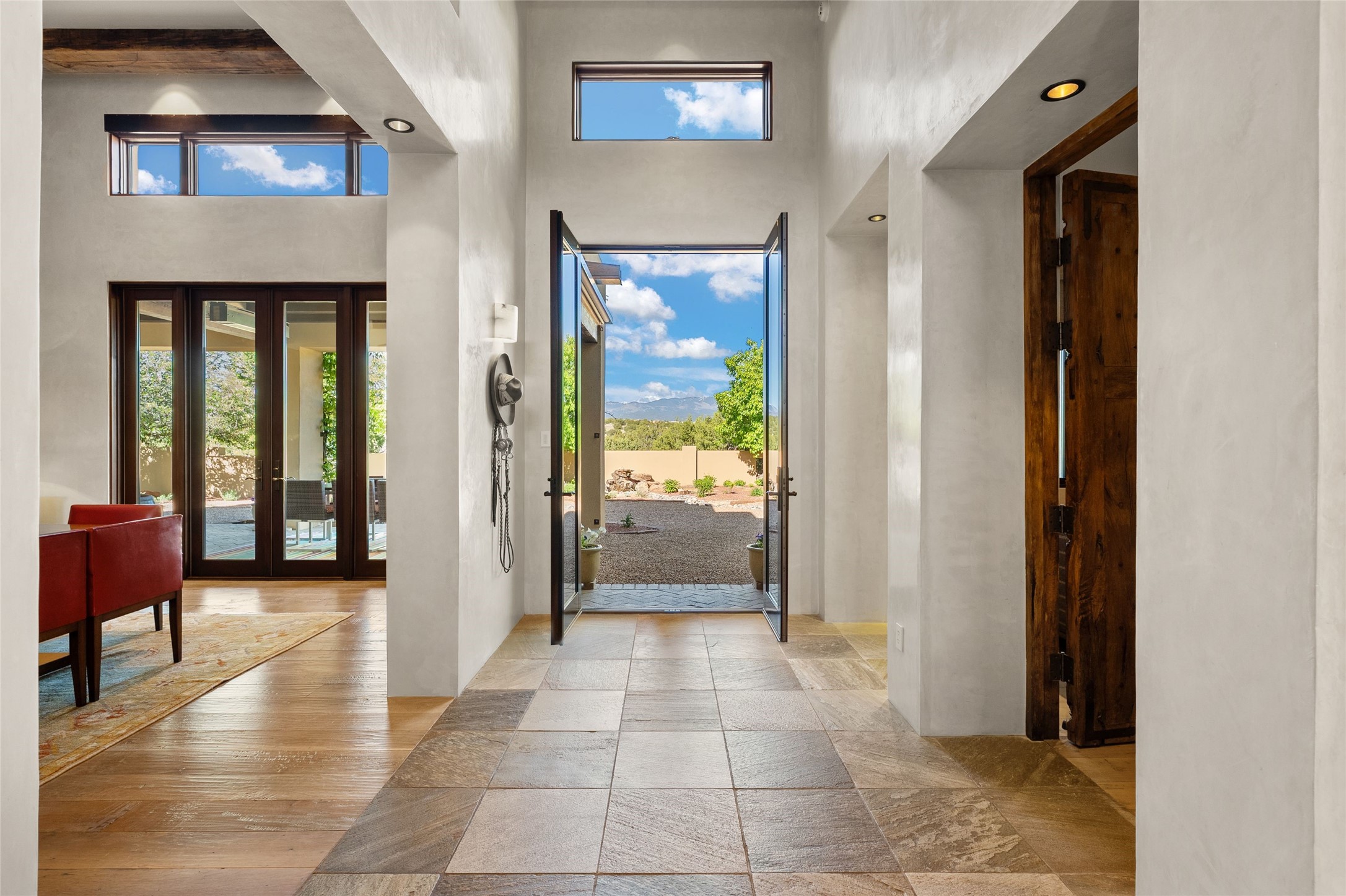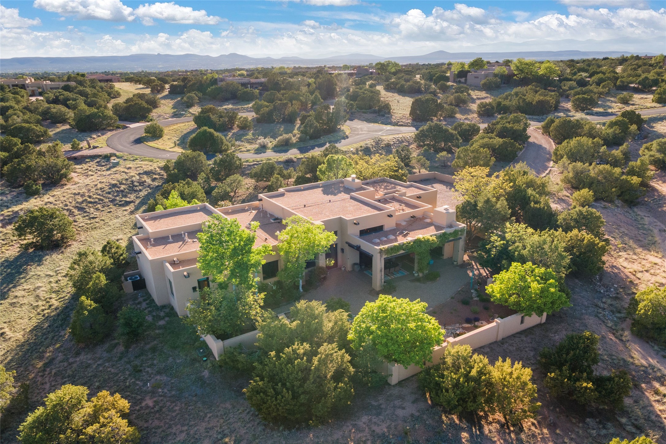 Nestled on nearly two secluded acres in prestigious Las Campanas, this extraordinary, custom interior designer's residence offers an unparalleled connection to Santa Fe's natural splendor. Wake to the majestic Sangre de Cristo mountains, painting an ever-changing canvas outside your window--snow-capped peaks in winter, golden sunset light at dusk, and songbirds as your daily companions. This isn't just a home; it's a masterpiece where every custom detail tells a story. The architecture is by acclaimed architect David Lorimer, and the interiors and furnishings are by award-winning ASID interior designer Jeannie Brown. From century-old reclaimed beams, antique Mexican doors to hand-hewn oak floors, each element was personally selected and designed. The result? A living work of art that only a designer's own sanctuary can achieve.The heart of the home flows seamlessly from the stunning Rumford fireplace to the gourmet kitchen with professional-grade appliances to an entertainer's portal, where you'll find yourself lingering over morning coffee or evening wine, mesmerized by the mountain vistas. Three thoughtfully designed bedrooms include a luxurious master retreat and private guest suite. Premium finishes throughout feature diamond plaster and custom lighting that creates pure magic at the golden hour. When you're ready, downtown Santa Fe's acclaimed restaurants and galleries await just minutes away. This home is more than luxury living--it's a lifestyle immersed in beauty, nature, and the unique spirit of Santa Fe, where luxury meets the land of enchantment.
