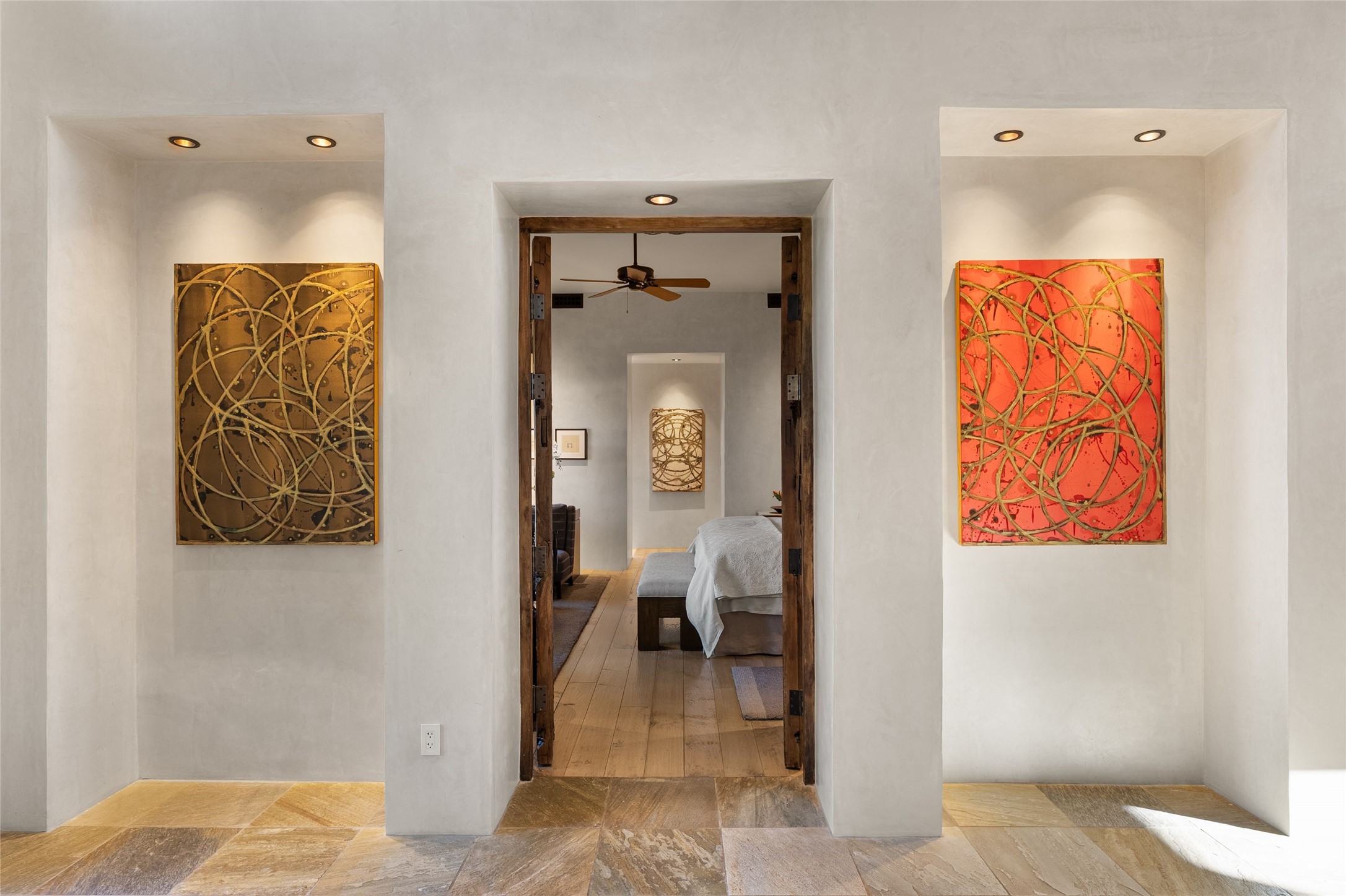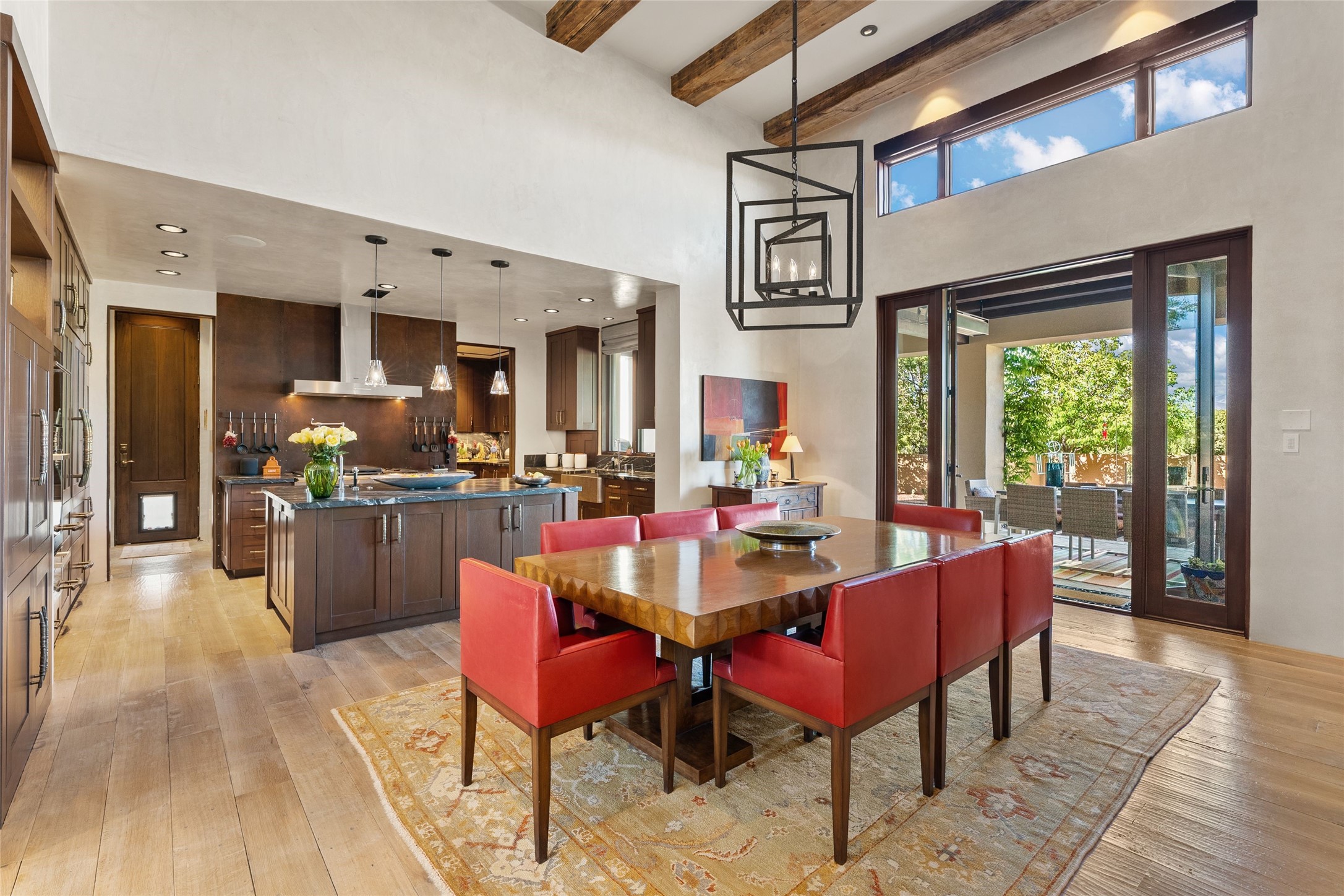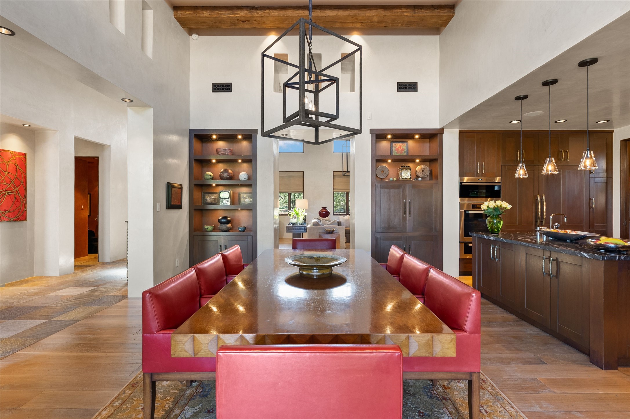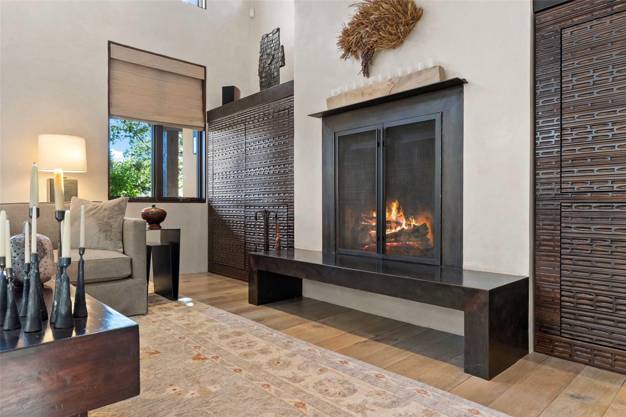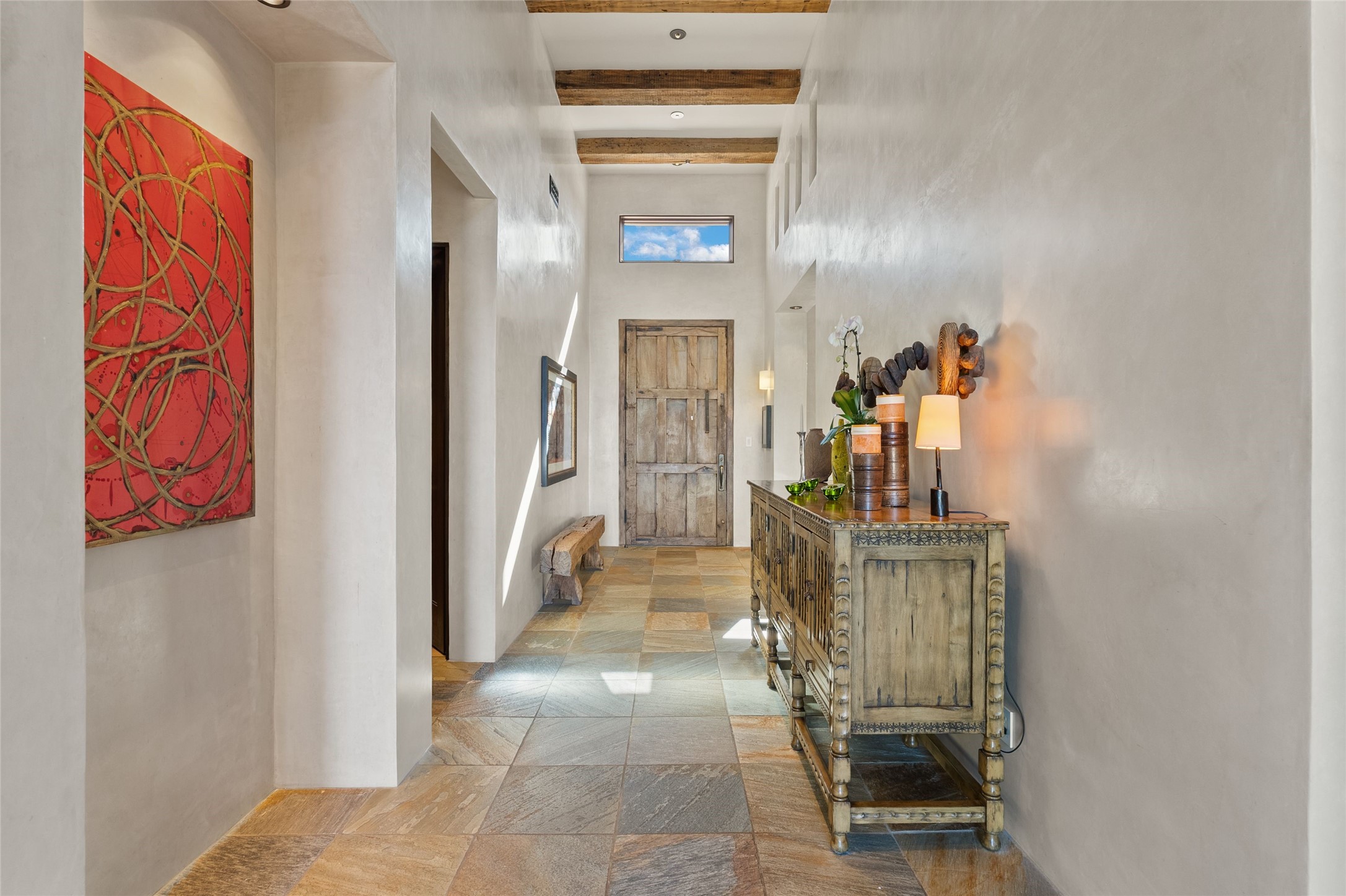 Nestled on nearly two secluded acres in prestigious Las Campanas, this extraordinary, custom interior designer's residence offers an unparalleled connection to Santa Fe's natural splendor. Wake to the majestic Sangre de Cristo mountains, painting an ever-changing canvas outside your window--snow-capped peaks in winter, golden sunset light at dusk, and songbirds as your daily companions. This isn't just a home; it's a masterpiece where every custom detail tells a story. The architecture is by acclaimed architect David Lorimer, and the interiors and furnishings are by award-winning ASID interior designer Jeannie Brown. From century-old reclaimed beams, antique Mexican doors to hand-hewn oak floors, each element was personally selected and designed. The result? A living work of art that only a designer's own sanctuary can achieve.The heart of the home flows seamlessly from the stunning Rumford fireplace to the gourmet kitchen with professional-grade appliances to an entertainer's portal, where you'll find yourself lingering over morning coffee or evening wine, mesmerized by the mountain vistas. Three thoughtfully designed bedrooms include a luxurious master retreat and private guest suite. Premium finishes throughout feature diamond plaster and custom lighting that creates pure magic at the golden hour. When you're ready, downtown Santa Fe's acclaimed restaurants and galleries await just minutes away. This home is more than luxury living--it's a lifestyle immersed in beauty, nature, and the unique spirit of Santa Fe, where luxury meets the land of enchantment.