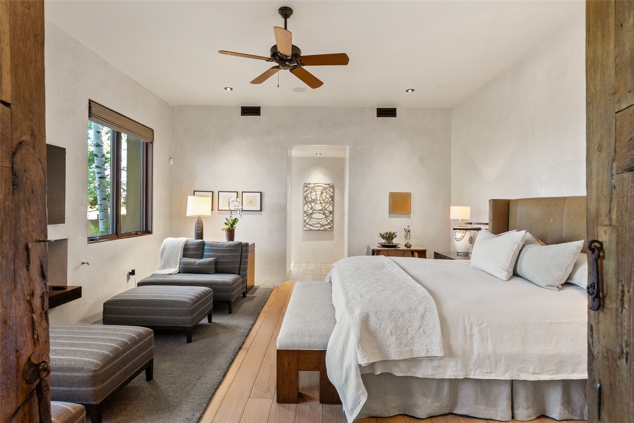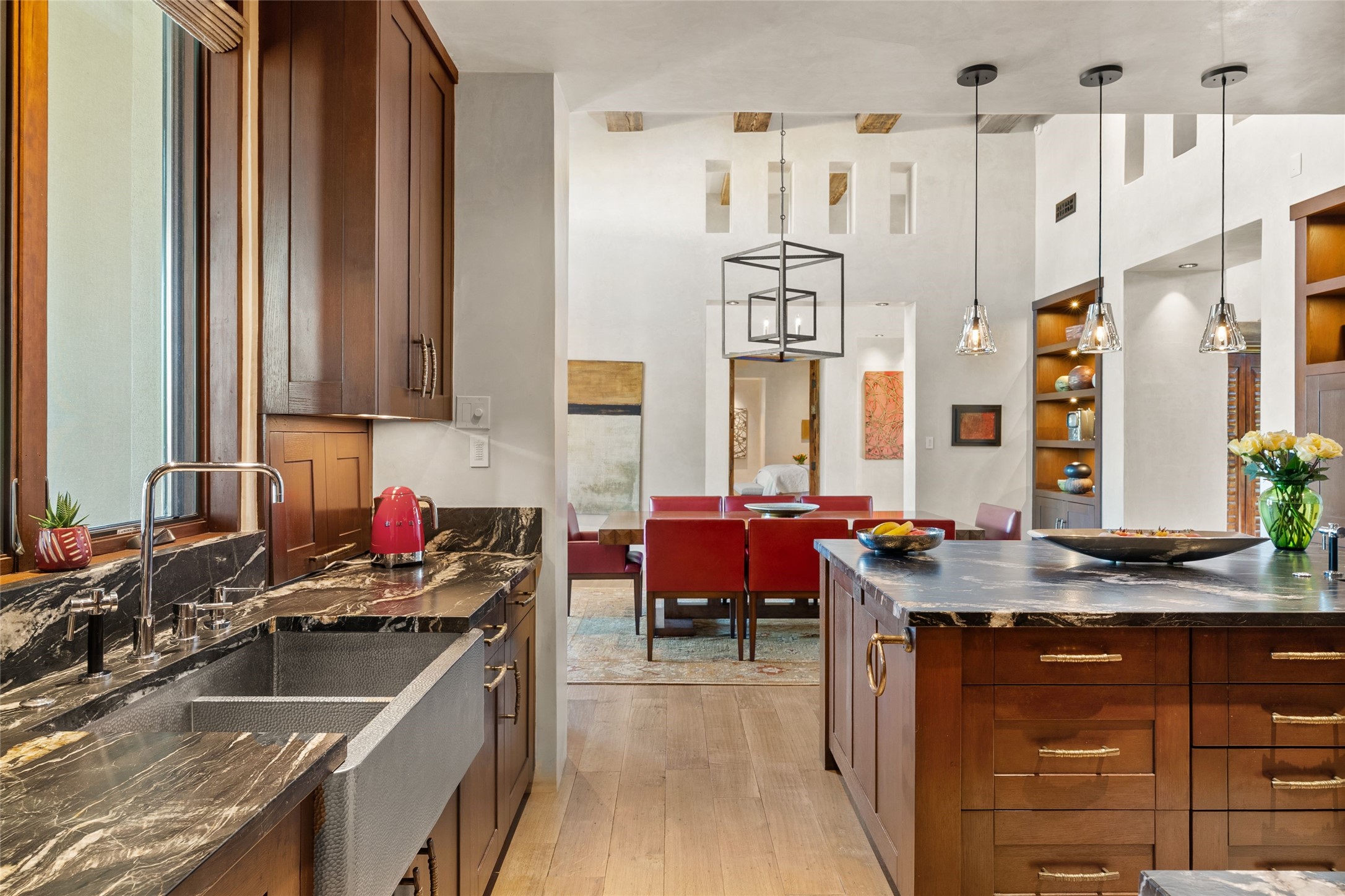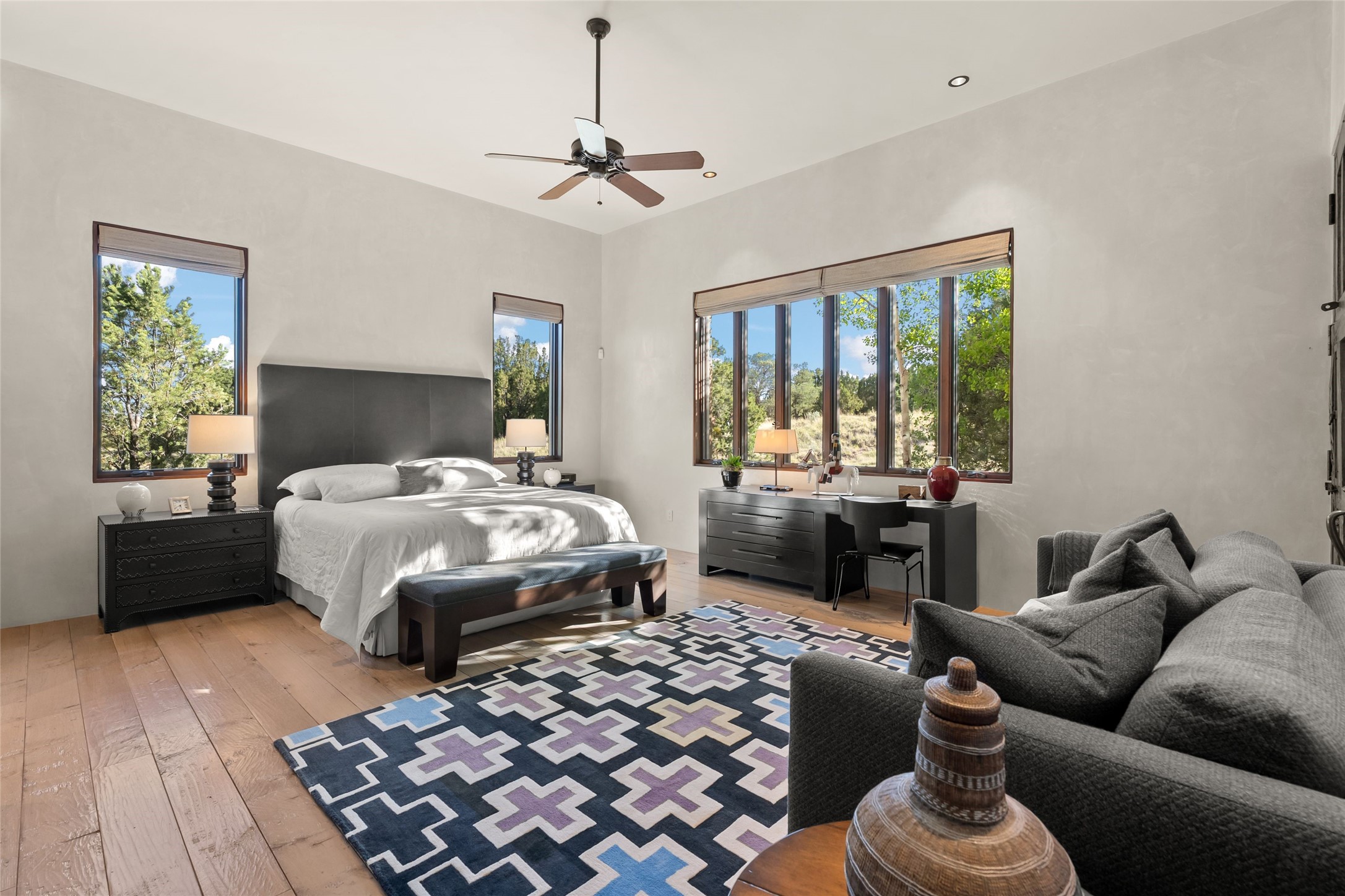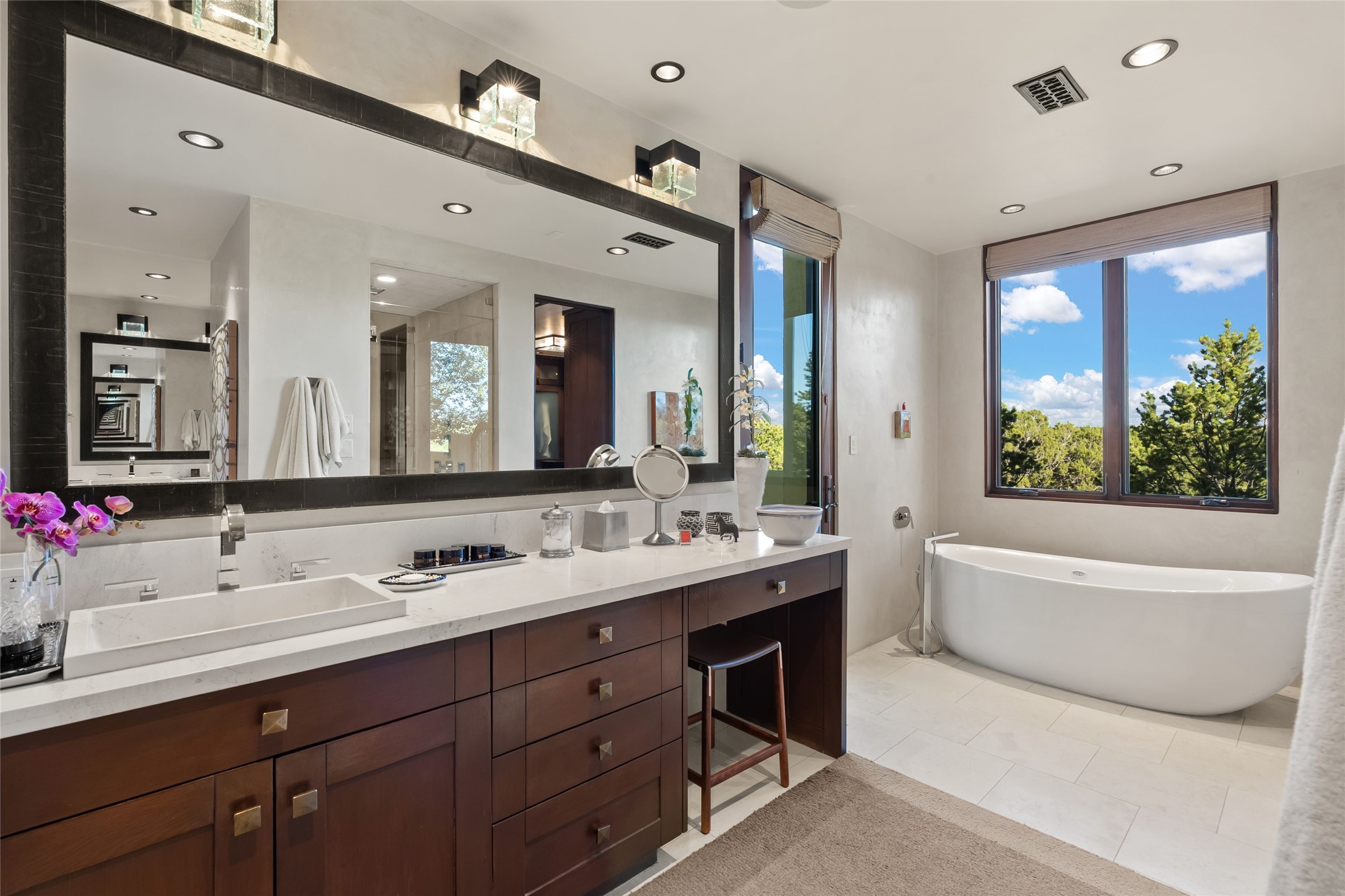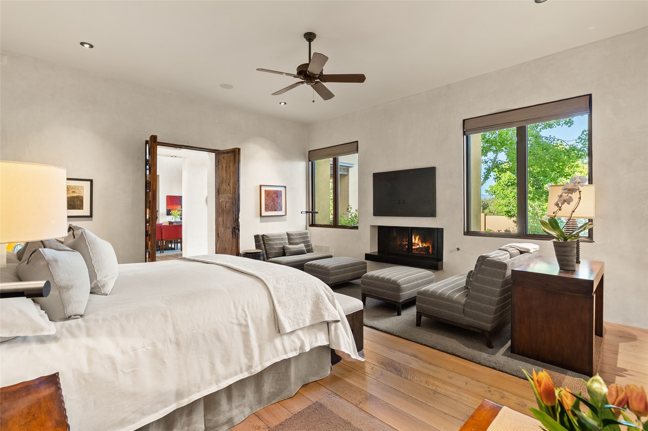 Nestled on nearly two secluded acres in prestigious Las Campanas, this extraordinary, custom interior designer's residence offers an unparalleled connection to Santa Fe's natural splendor. Wake to the majestic Sangre de Cristo mountains, painting an ever-changing canvas outside your window--snow-capped peaks in winter, golden sunset light at dusk, and songbirds as your daily companions. This isn't just a home; it's a masterpiece where every custom detail tells a story. The architecture is by acclaimed architect David Lorimer, and the interiors and furnishings are by award-winning ASID interior designer Jeannie Brown. From century-old reclaimed beams, antique Mexican doors to hand-hewn oak floors, each element was personally selected and designed. The result? A living work of art that only a designer's own sanctuary can achieve.The heart of the home flows seamlessly from the stunning Rumford fireplace to the gourmet kitchen with professional-grade appliances to an entertainer's portal, where you'll find yourself lingering over morning coffee or evening wine, mesmerized by the mountain vistas. Three thoughtfully designed bedrooms include a luxurious master retreat and private guest suite. Premium finishes throughout feature diamond plaster and custom lighting that creates pure magic at the golden hour. When you're ready, downtown Santa Fe's acclaimed restaurants and galleries await just minutes away. This home is more than luxury living--it's a lifestyle immersed in beauty, nature, and the unique spirit of Santa Fe, where luxury meets the land of enchantment.