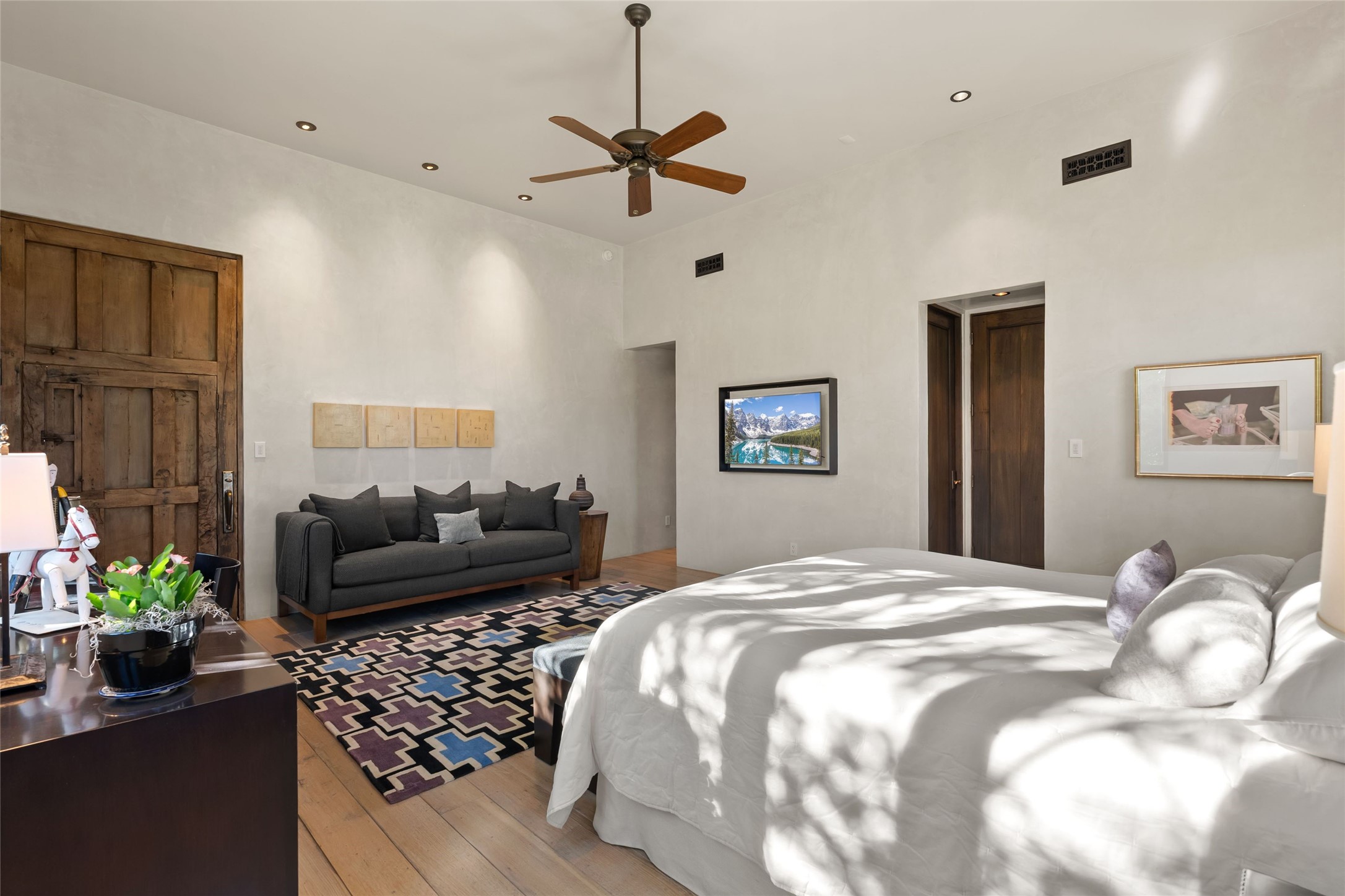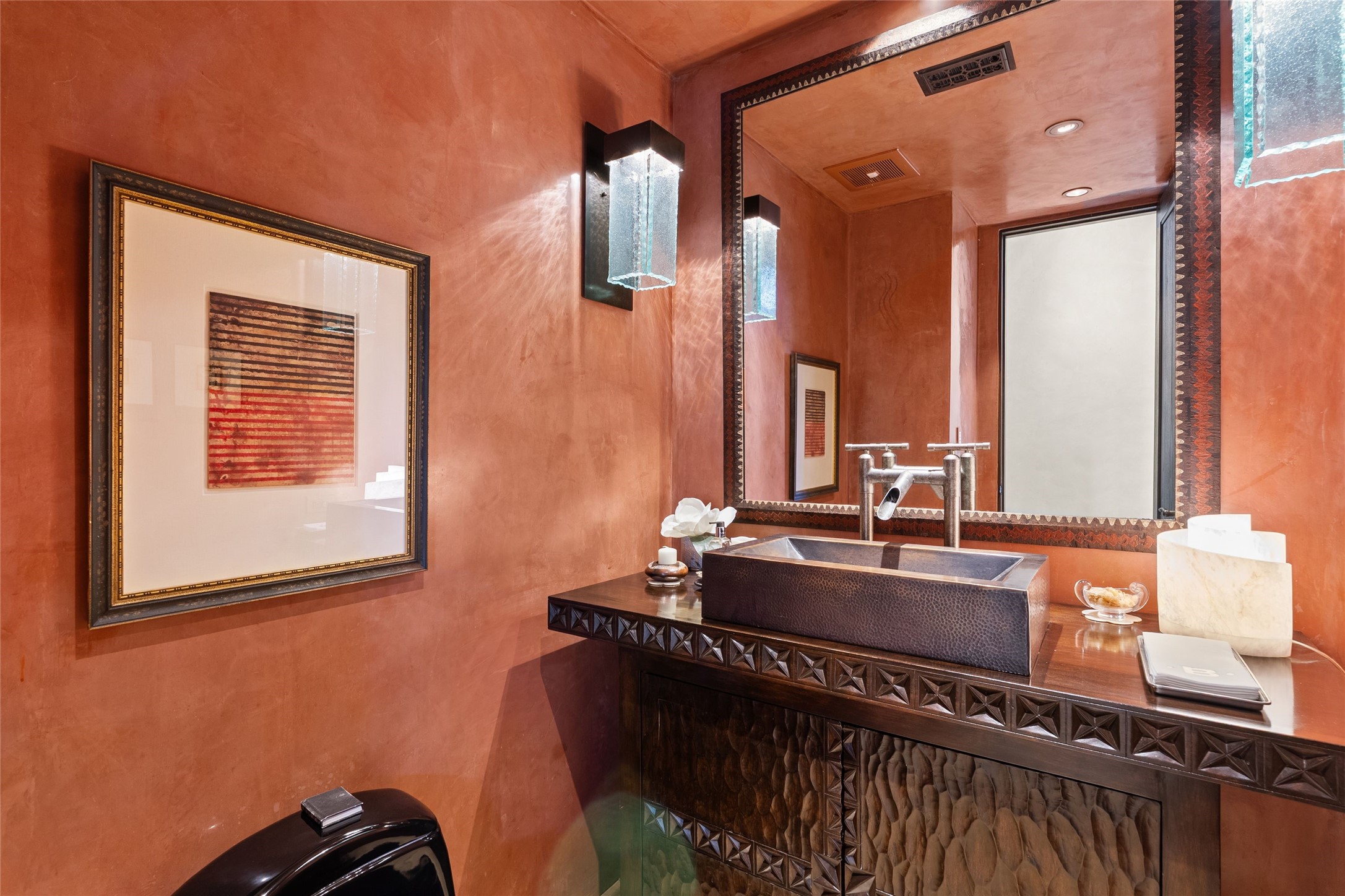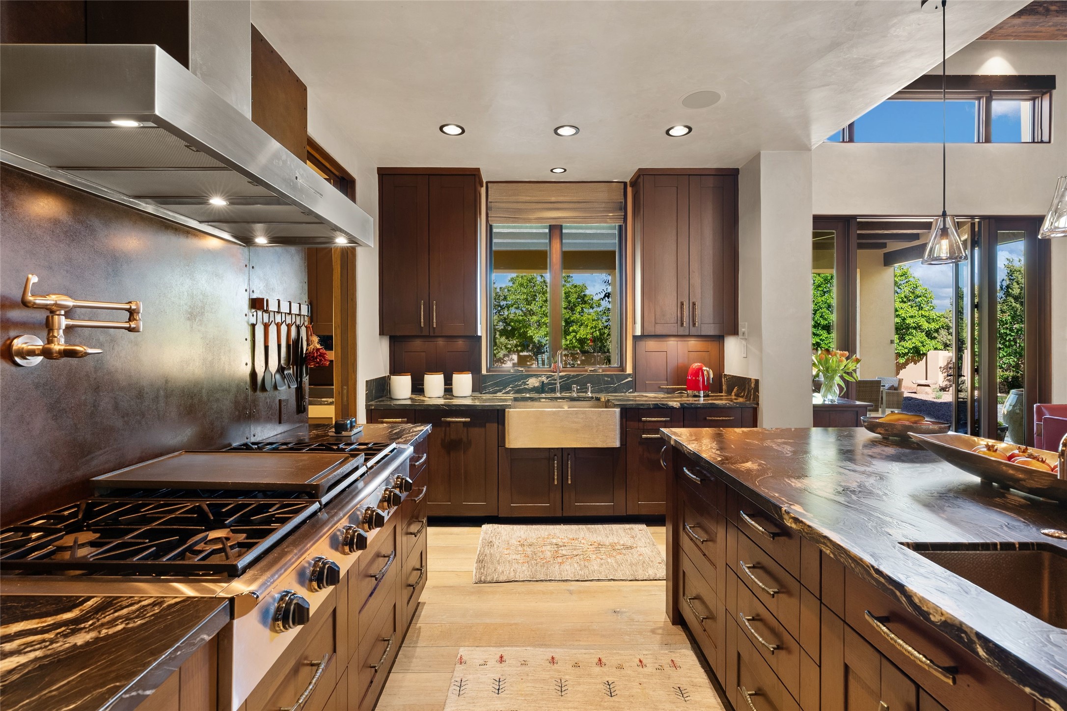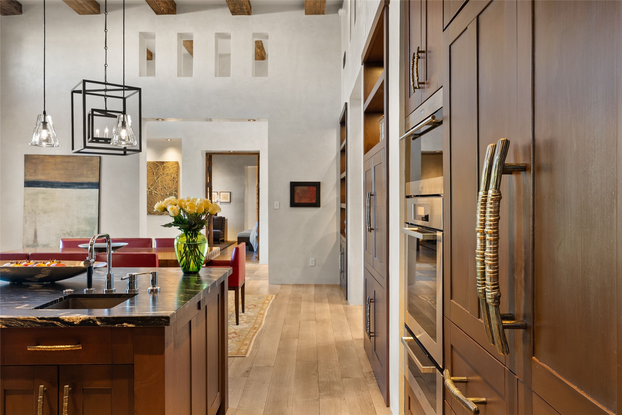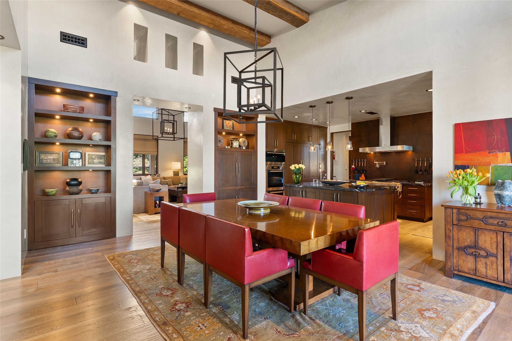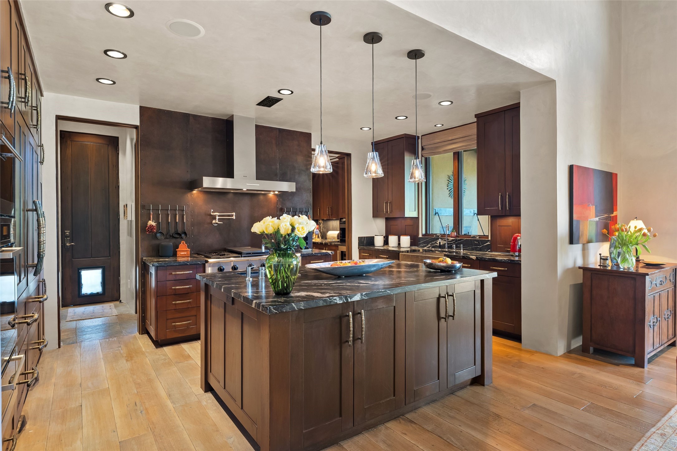 Nestled on nearly two secluded acres in prestigious Las Campanas, this extraordinary, custom interior designer's residence offers an unparalleled connection to Santa Fe's natural splendor. Wake to the majestic Sangre de Cristo mountains, painting an ever-changing canvas outside your window--snow-capped peaks in winter, golden sunset light at dusk, and songbirds as your daily companions. This isn't just a home; it's a masterpiece where every custom detail tells a story. The architecture is by acclaimed architect David Lorimer, and the interiors and furnishings are by award-winning ASID interior designer Jeannie Brown. From century-old reclaimed beams, antique Mexican doors to hand-hewn oak floors, each element was personally selected and designed. The result? A living work of art that only a designer's own sanctuary can achieve.The heart of the home flows seamlessly from the stunning Rumford fireplace to the gourmet kitchen with professional-grade appliances to an entertainer's portal, where you'll find yourself lingering over morning coffee or evening wine, mesmerized by the mountain vistas. Three thoughtfully designed bedrooms include a luxurious master retreat and private guest suite. Premium finishes throughout feature diamond plaster and custom lighting that creates pure magic at the golden hour. When you're ready, downtown Santa Fe's acclaimed restaurants and galleries await just minutes away. This home is more than luxury living--it's a lifestyle immersed in beauty, nature, and the unique spirit of Santa Fe, where luxury meets the land of enchantment.