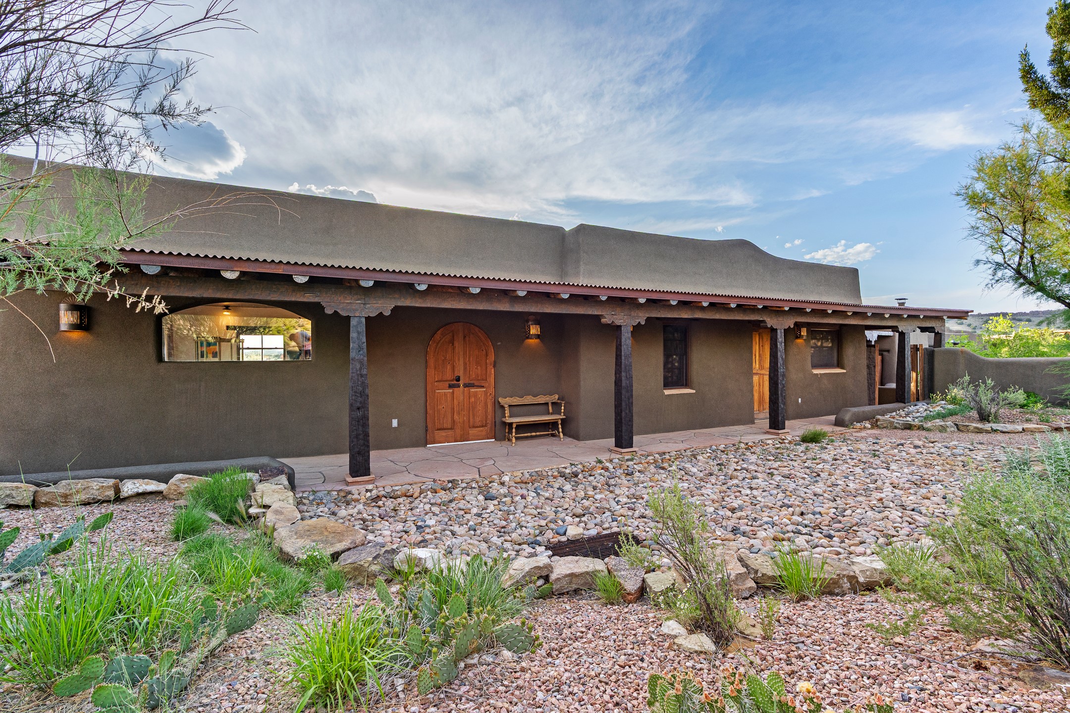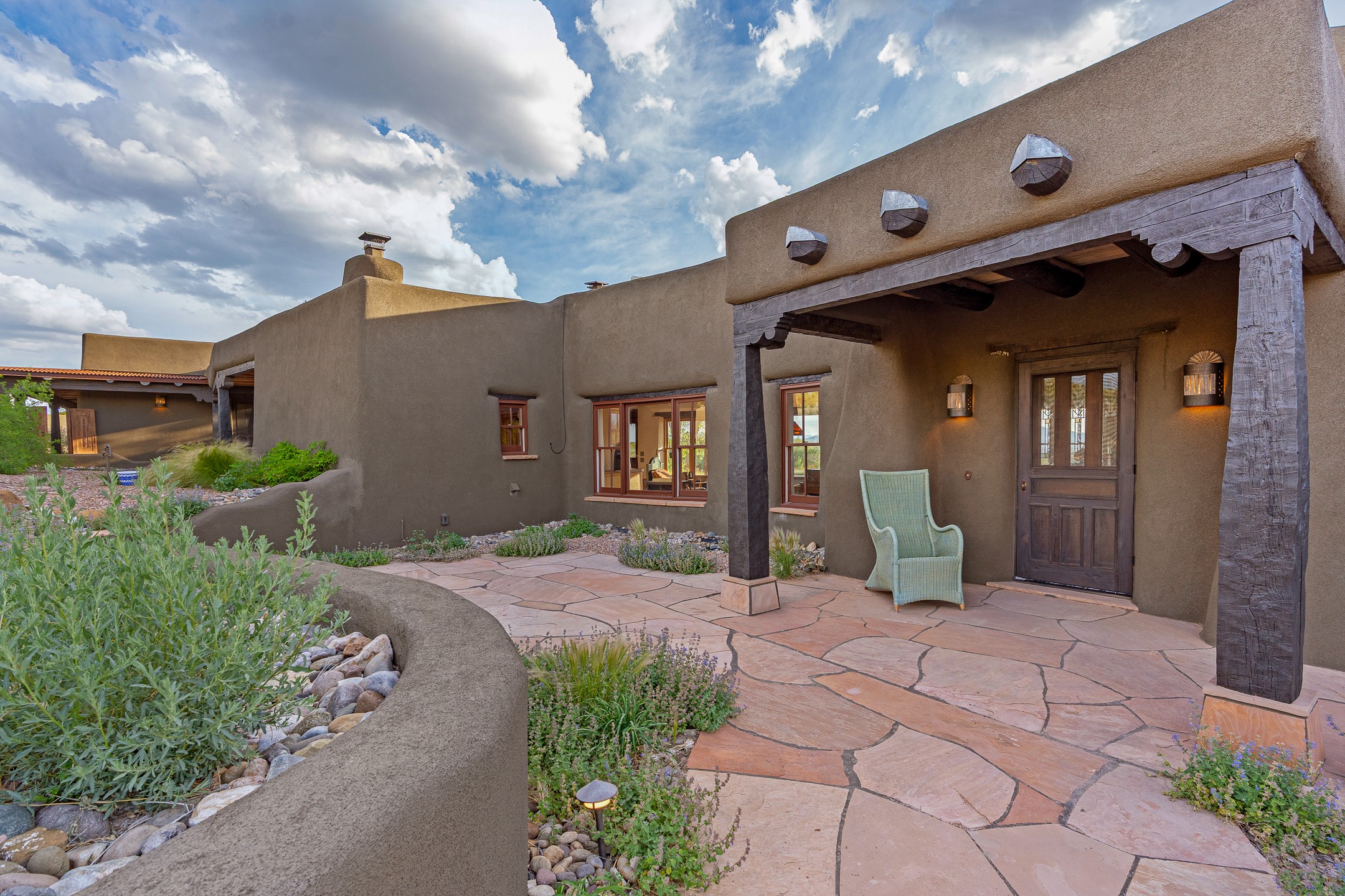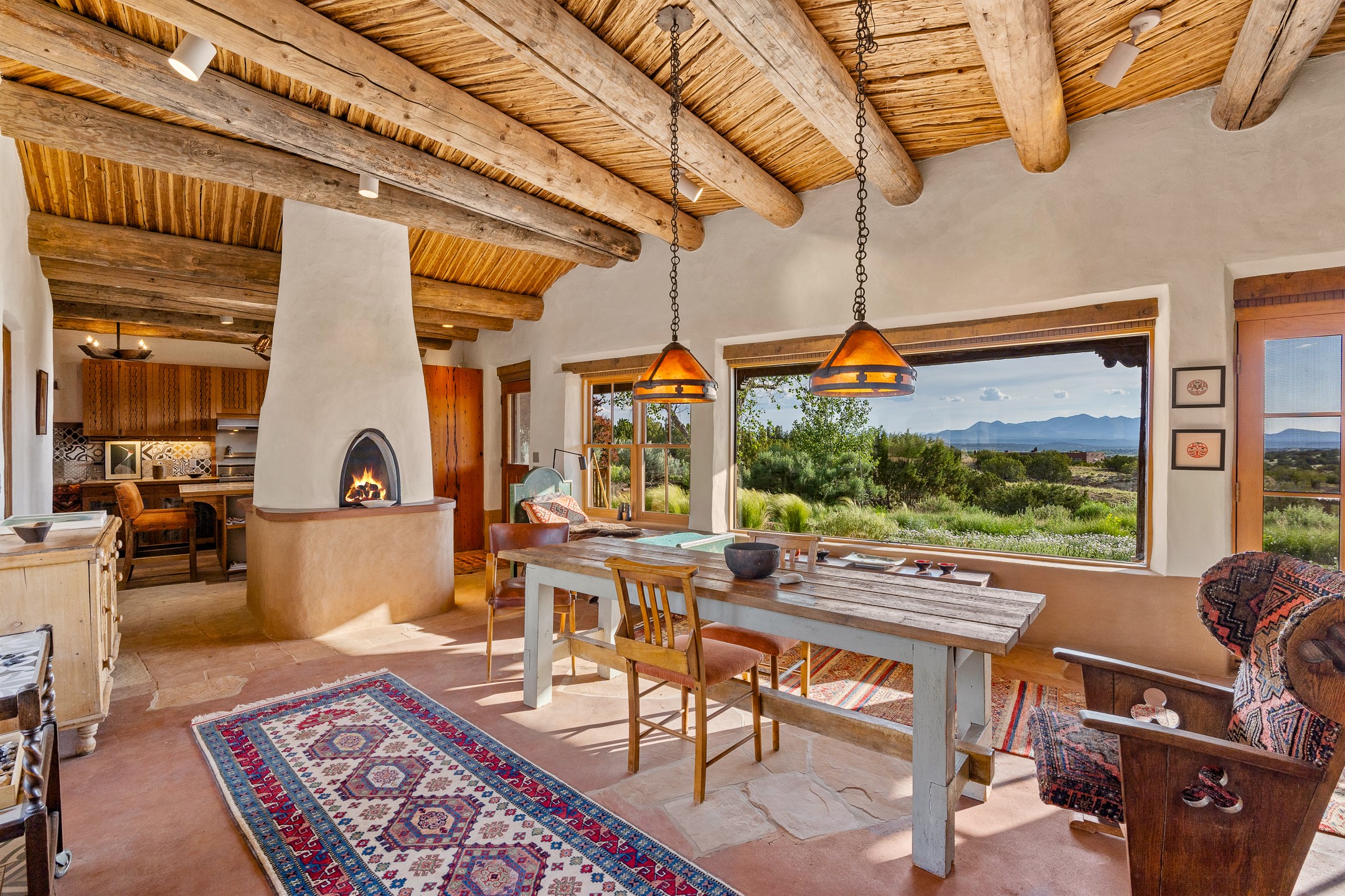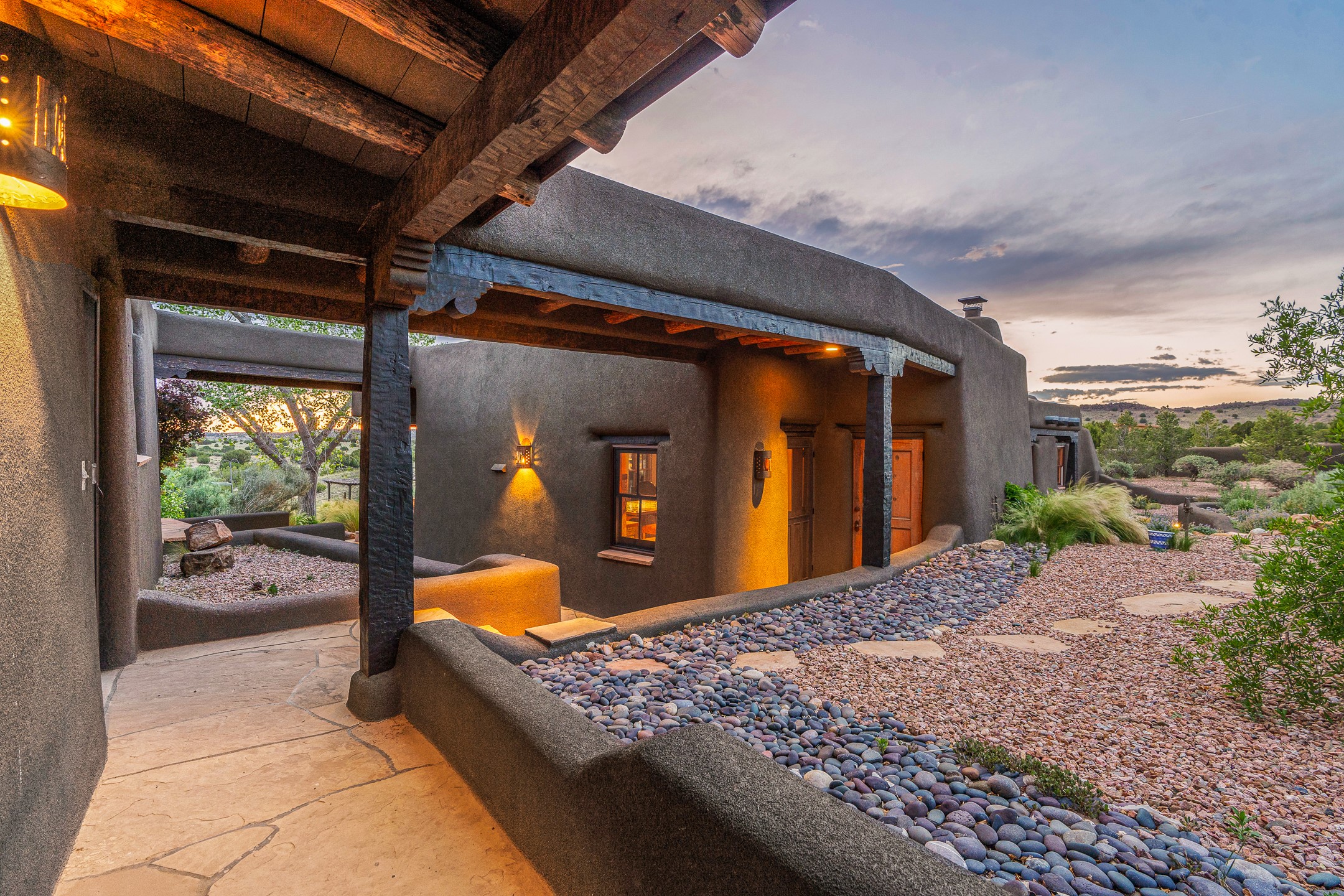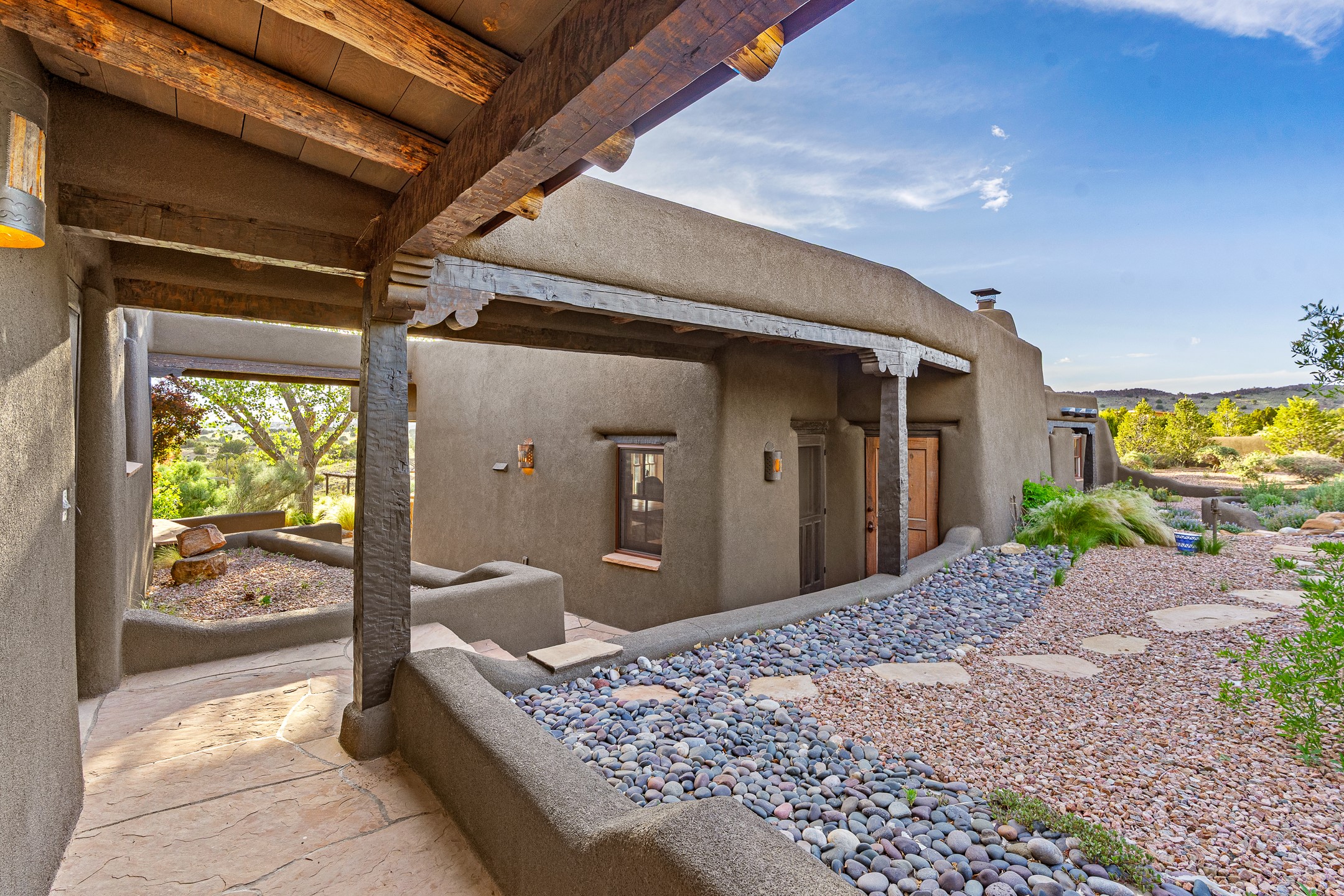Stunning exemplary Architectural Masterpiece in Galisteo, constructed of solid adobe on 4.95 scenic acres with spectacular Ortiz Mountain views from almost every room. This gorgeous compound, recently refurbished, includes a main residence, guest house, art studio, and 1200 Sq. Ft of portal. Seamlessly integrating authentic techniques and materials with timeless and soulful elements, this home offers all the beauty, harmony and serenity one could desire. An Old Mexican archway and wooden gate lead to a zen-like courtyard with established xeriscaping. The traditional Latilla entry opens to a pitched ceiling of massive, antique, hand-hewn vigas with Arkansas split-cedar herringbone inlay. Adobe poured floors with flagstone. Clay slip wainscoted interior walls with plaster. Hand-adzed posts, beams and lintels. 80 year old hand-crafted, carved wood doors. Huge picture window and French doors to the portal. The kitchen showcases 100 year old river-retrieved heart of pine thunderbolt kitchen cabinets, Italian Bruno travertine counters, spacious island, sculptural double kiva, Viking range and cooktop, and walk-in pantry. Split bedroom plan offers maximum privacy. Primary suite is a true sanctuary with expansive, inspiring views, and an ensuite bath with double vanity, soaking tub for deep relaxation and walk-in shower. Detached Casita has an open kitchen and living area with French doors, bedroom with French doors, bath with double sink, and private portal with a kiva. The casita joins a heated and cooled attached Art studio, with carriage doors, making it possible to use as a garage. The portal leads to a charming study or sleeping nook. Professionally landscaped, there are two driveways and many quaint and private sitting areas surrounding the home, including an extraordinary Ramada with fire pit and hammocks to gaze at the stars. The adjoining walking trail leads to ancient pueblo ruins. Galisteo amenities include: community center, monthly brunches, 2 playgrounds, fire department, hiking, art tour, and Bosque River Reserve. 22 Solar panel array, whole house water purification, and underfloor heating. All baths have Noche travertine.