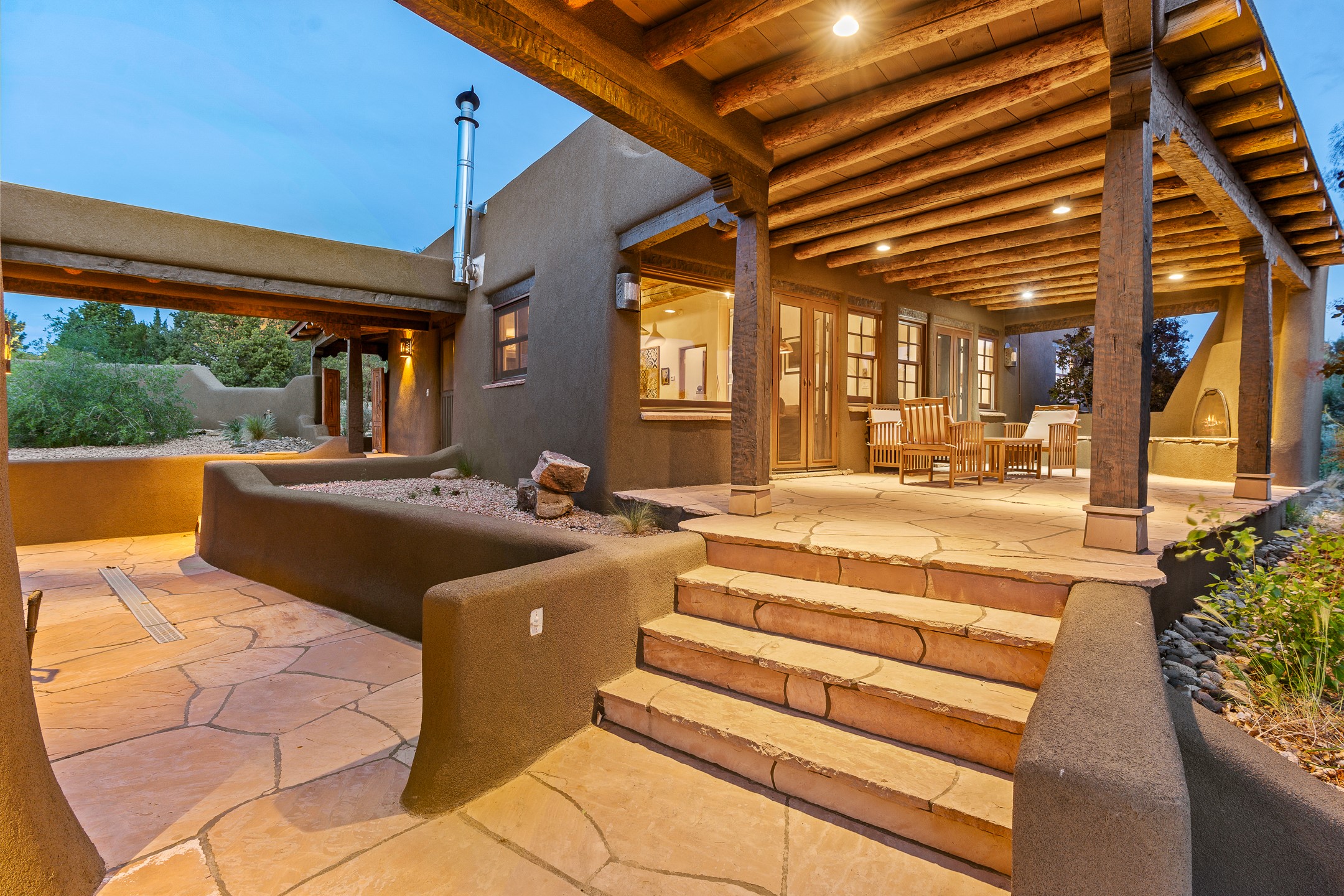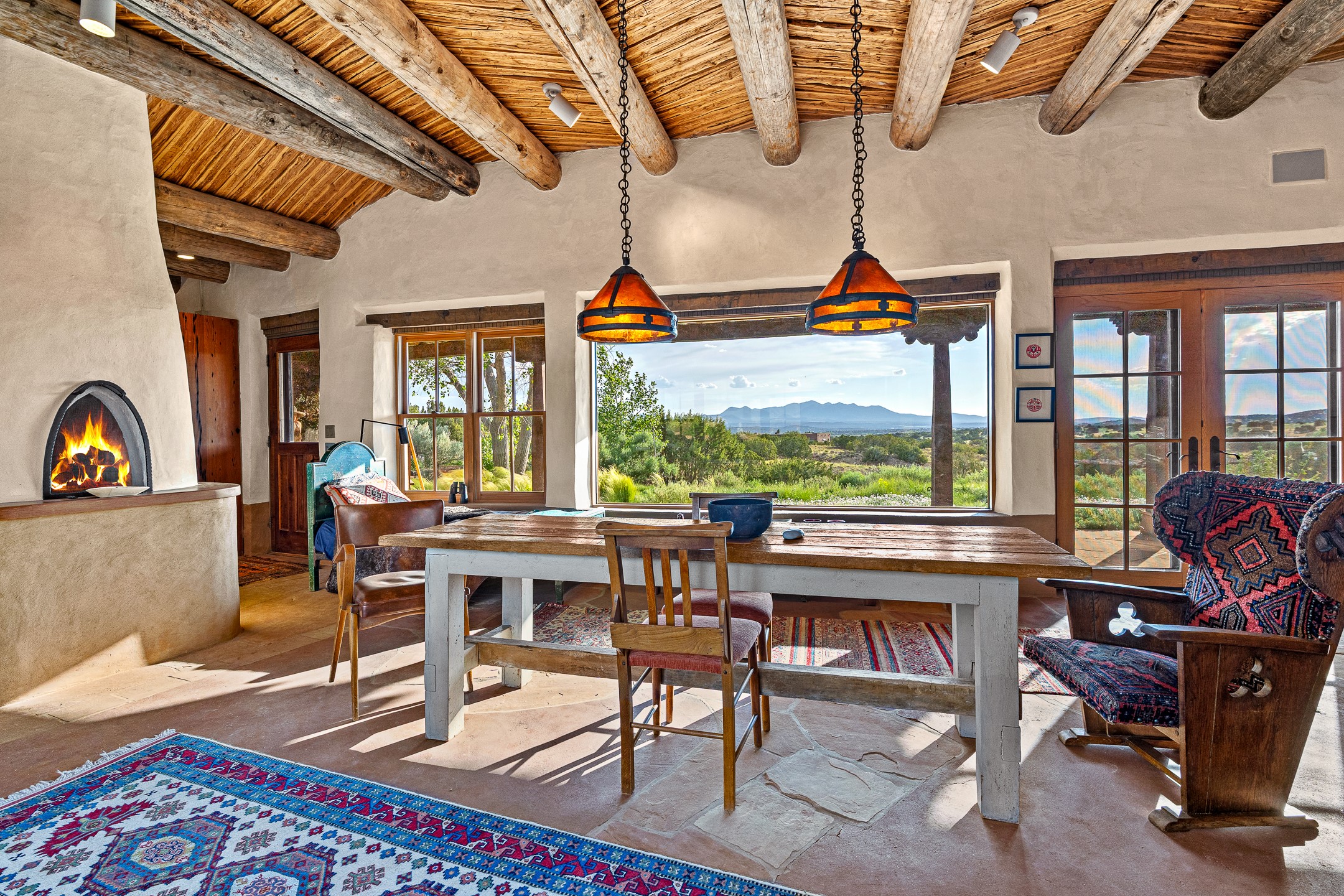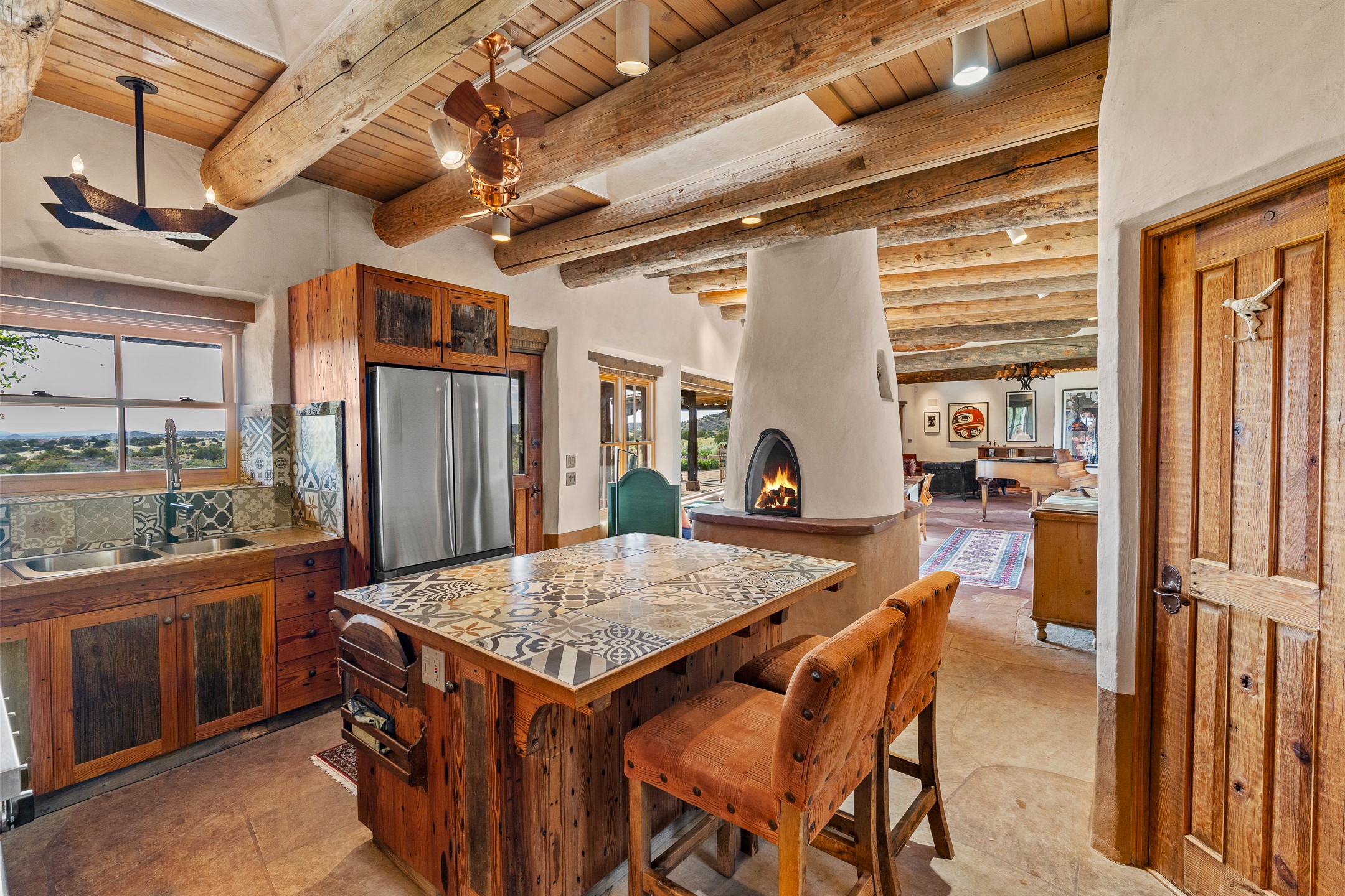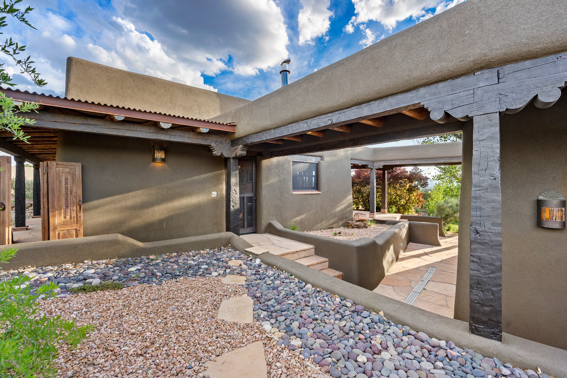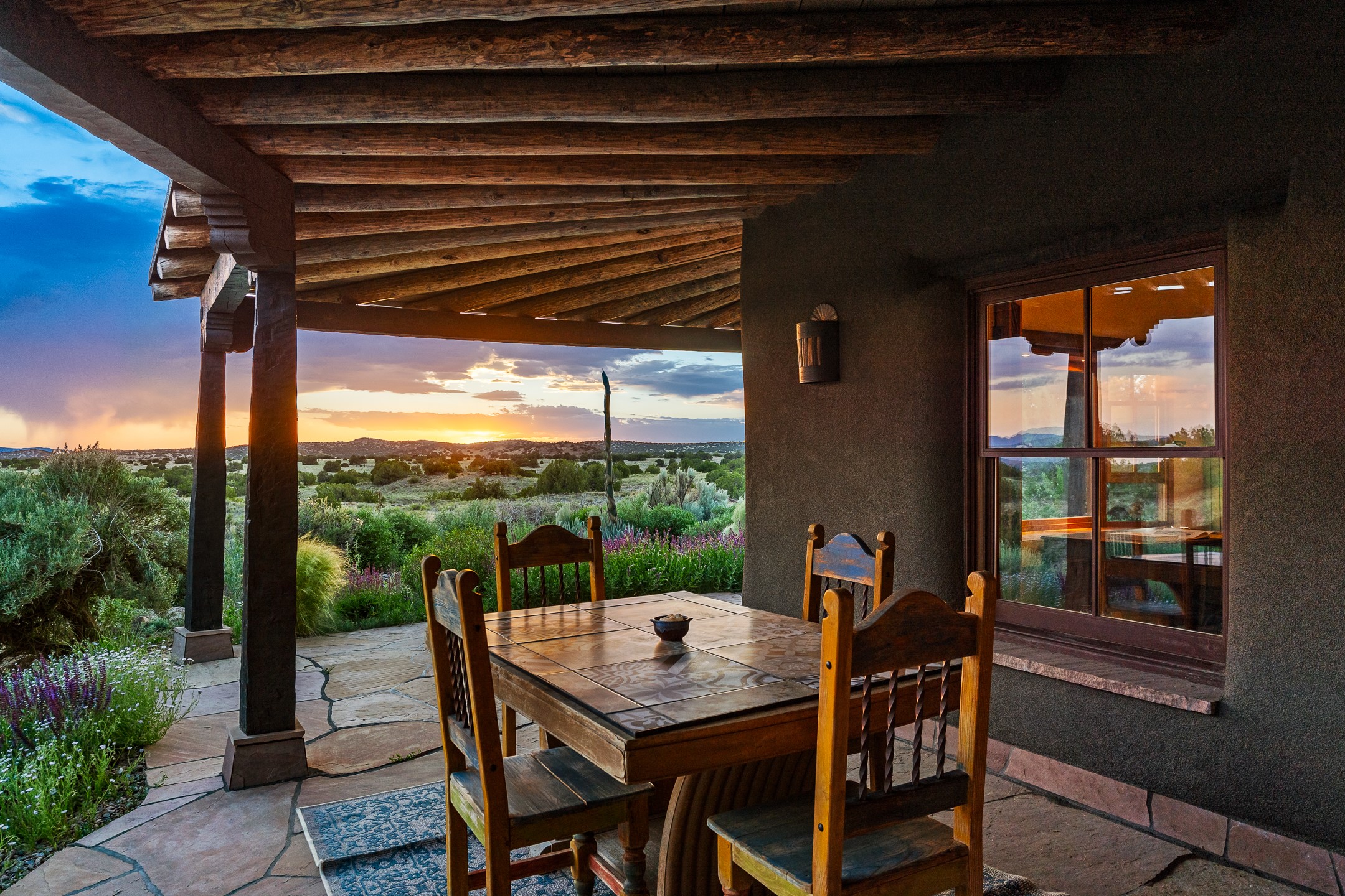 Stunning exemplary Architectural Masterpiece in Galisteo, constructed of solid adobe on 4.95 scenic acres with spectacular Ortiz Mountain views from almost every room. This gorgeous compound, recently refurbished, includes a main residence, guest house, art studio, and 1200 Sq. Ft of portal. Seamlessly integrating authentic techniques and materials with timeless and soulful elements, this home offers all the beauty, harmony and serenity one could desire. An Old Mexican archway and wooden gate lead to a zen-like courtyard with established xeriscaping. The traditional Latilla entry opens to a pitched ceiling of massive, antique, hand-hewn vigas with Arkansas split-cedar herringbone inlay. Adobe poured floors with flagstone. Clay slip wainscoted interior walls with plaster. Hand-adzed posts, beams and lintels. 80 year old hand-crafted, carved wood doors. Huge picture window and French doors to the portal. The kitchen showcases 100 year old river-retrieved heart of pine thunderbolt kitchen cabinets, Italian Bruno travertine counters, spacious island, sculptural double kiva, Viking range and cooktop, and walk-in pantry. Split bedroom plan offers maximum privacy. Primary suite is a true sanctuary with expansive, inspiring views, and an ensuite bath with double vanity, soaking tub for deep relaxation and walk-in shower. Detached Casita has an open kitchen and living area with French doors, bedroom with French doors, bath with double sink, and private portal with a kiva. The casita joins a heated and cooled attached Art studio, with carriage doors, making it possible to use as a garage. The portal leads to a charming study or sleeping nook. Professionally landscaped, there are two driveways and many quaint and private sitting areas surrounding the home, including an extraordinary Ramada with fire pit and hammocks to gaze at the stars. The adjoining walking trail leads to ancient pueblo ruins. Galisteo amenities include: community center, monthly brunches, 2 playgrounds, fire department, hiking, art tour, and Bosque River Reserve. 22 Solar panel array, whole house water purification, and underfloor heating. All baths have Noche travertine.