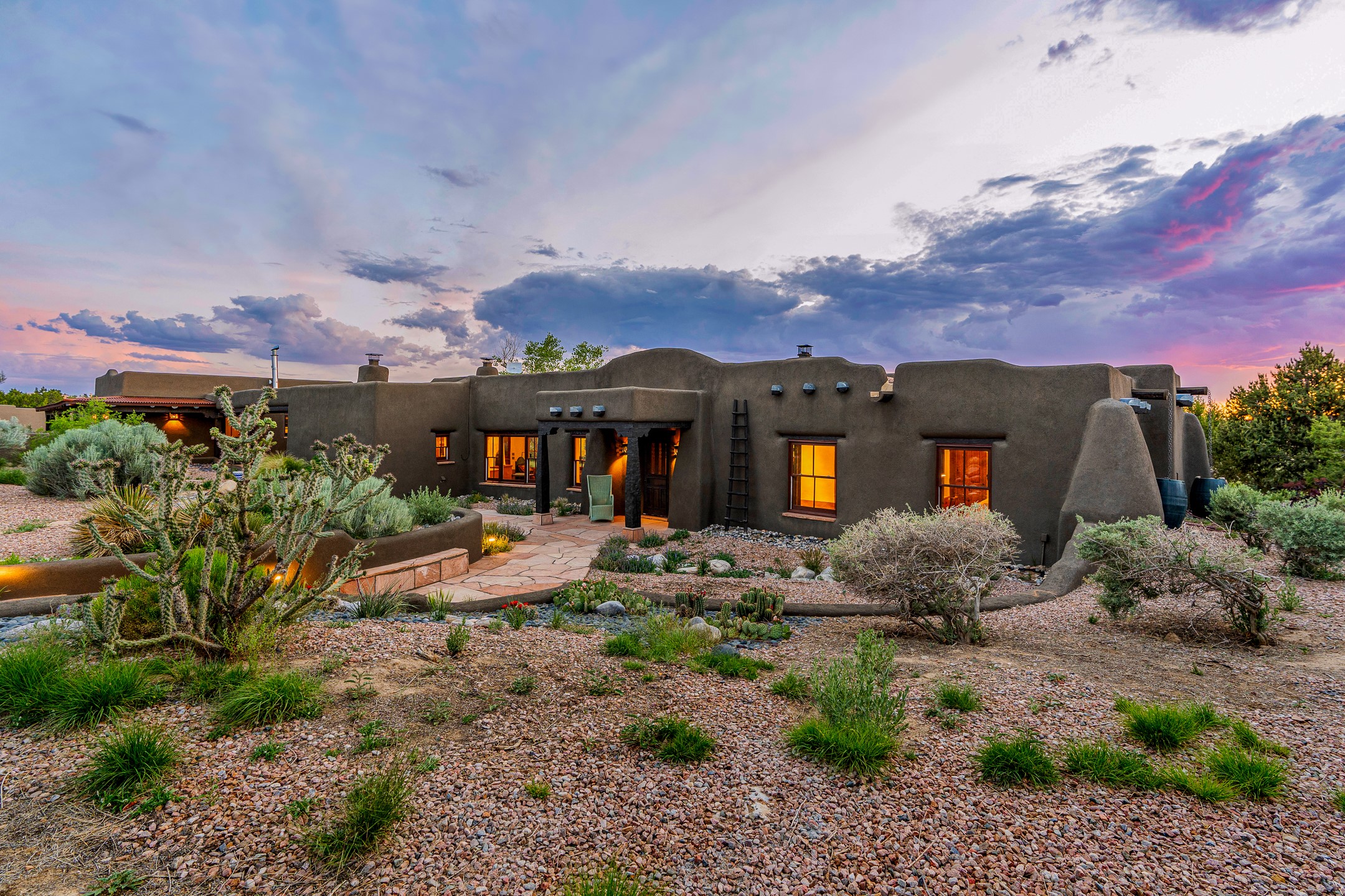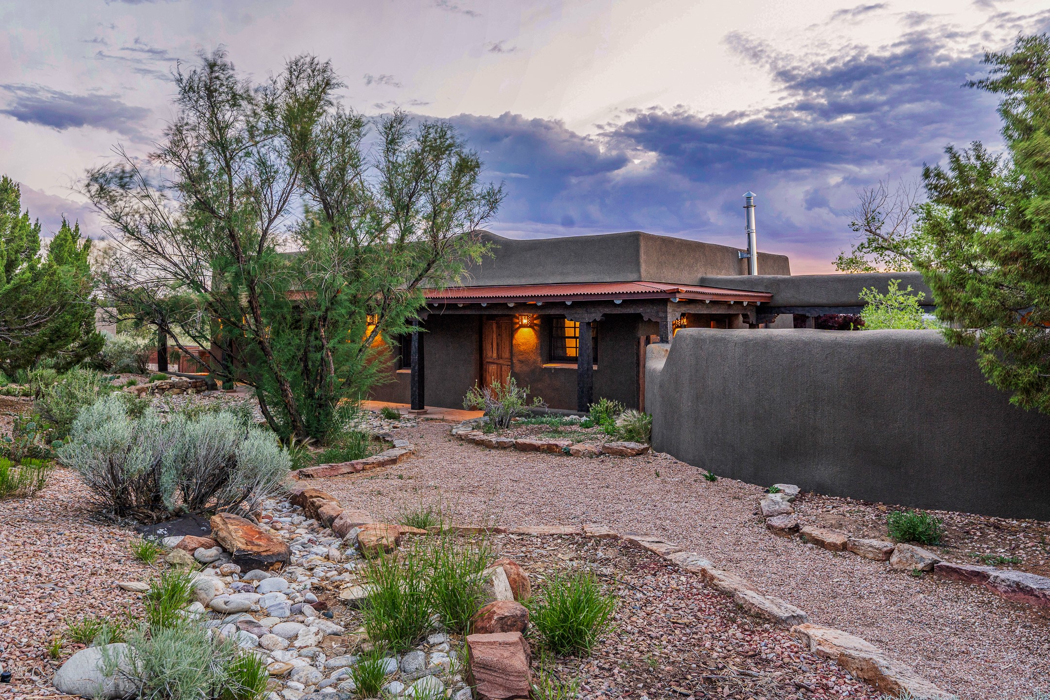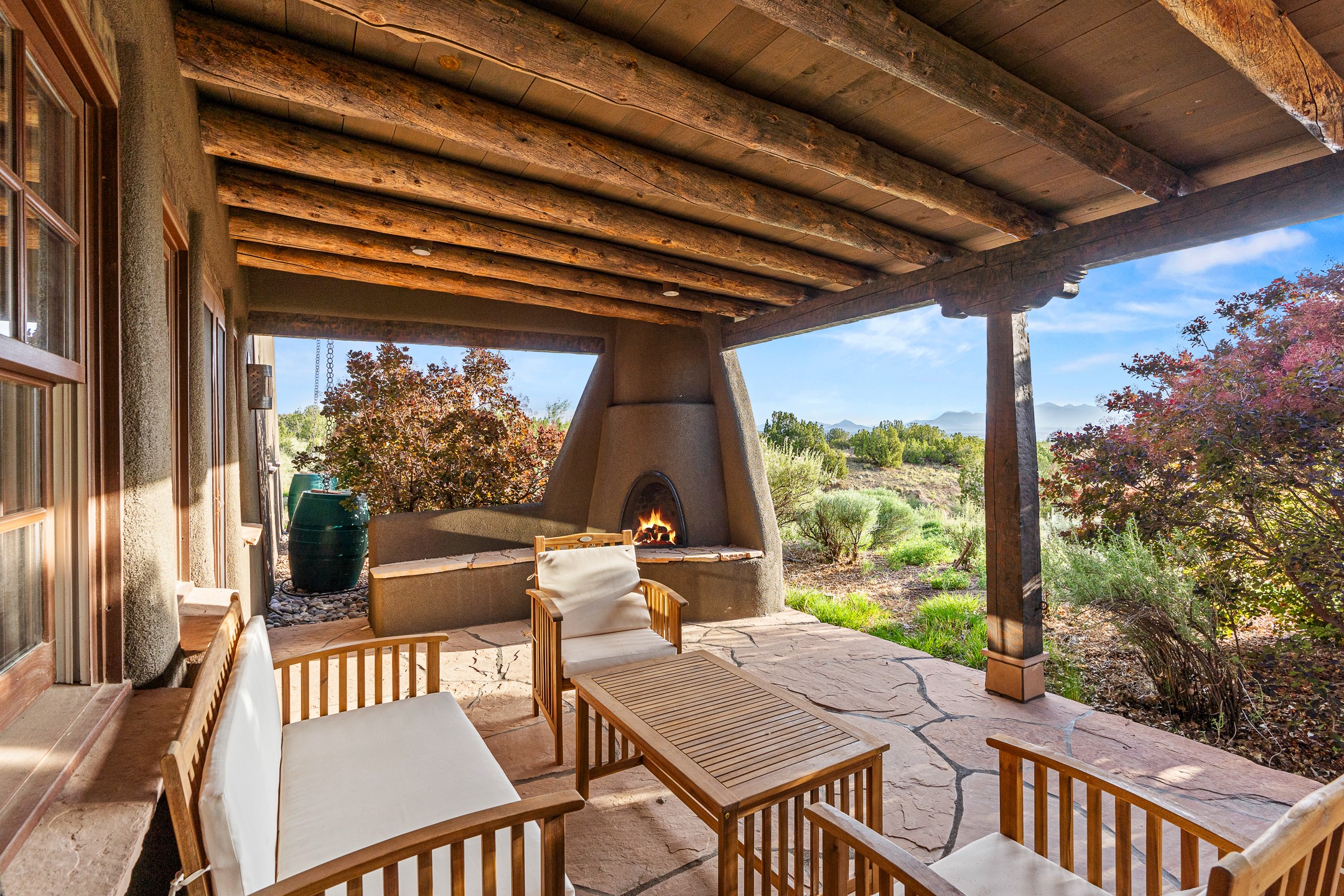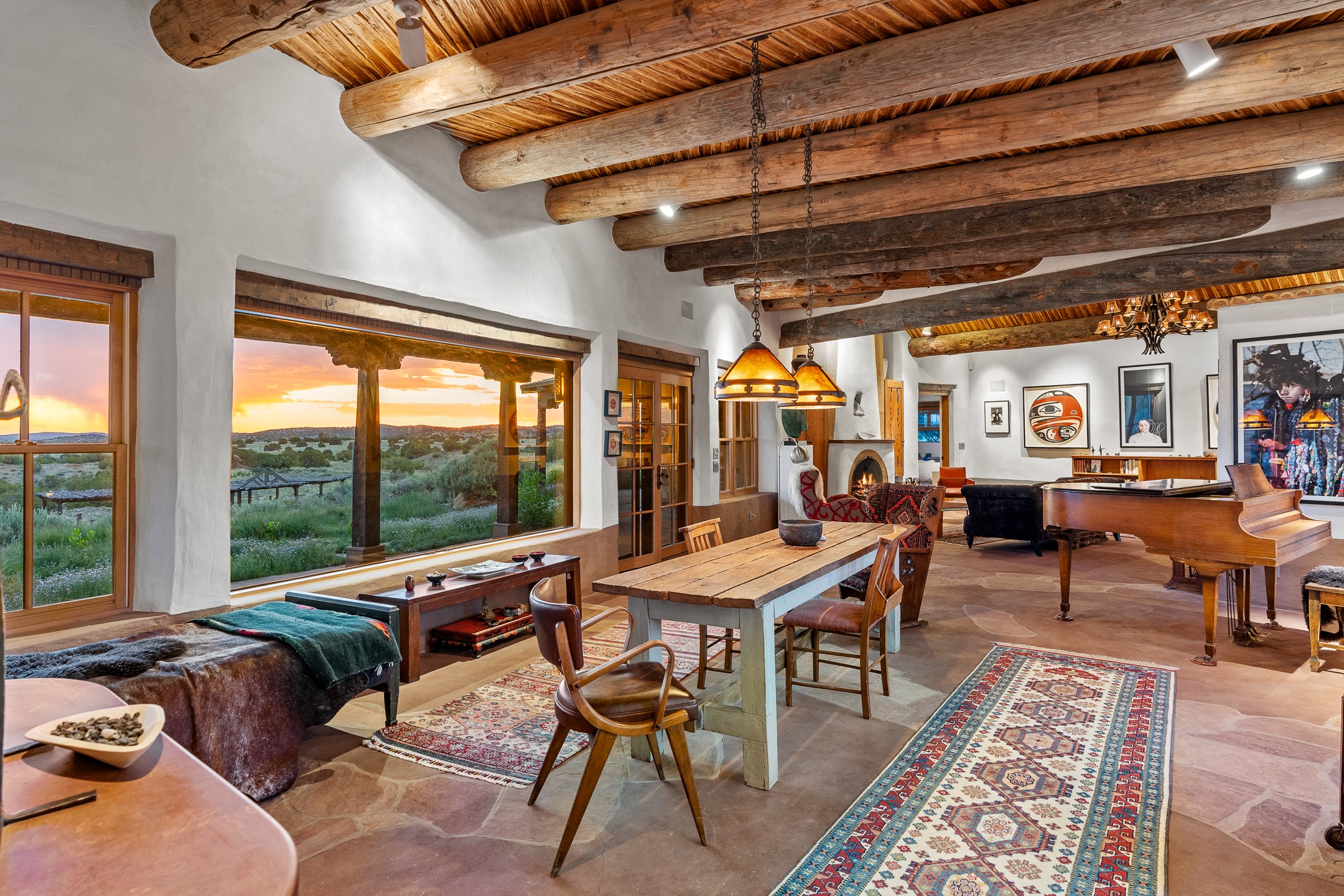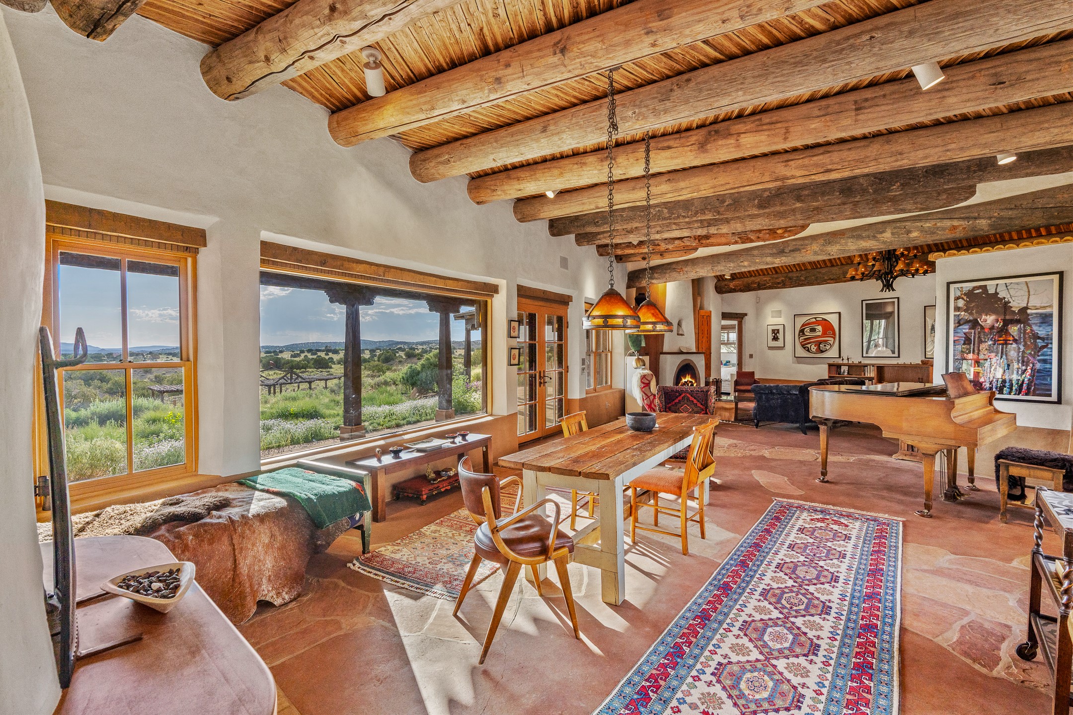 Stunning exemplary Architectural Masterpiece in Galisteo, constructed of solid adobe on 4.95 scenic acres with spectacular Ortiz Mountain views from almost every room. This gorgeous compound, recently refurbished, includes a main residence, guest house, art studio, and 1200 Sq. Ft of portal. Seamlessly integrating authentic techniques and materials with timeless and soulful elements, this home offers all the beauty, harmony and serenity one could desire. An Old Mexican archway and wooden gate lead to a zen-like courtyard with established xeriscaping. The traditional Latilla entry opens to a pitched ceiling of massive, antique, hand-hewn vigas with Arkansas split-cedar herringbone inlay. Adobe poured floors with flagstone. Clay slip wainscoted interior walls with plaster. Hand-adzed posts, beams and lintels. 80 year old hand-crafted, carved wood doors. Huge picture window and French doors to the portal. The kitchen showcases 100 year old river-retrieved heart of pine thunderbolt kitchen cabinets, Italian Bruno travertine counters, spacious island, sculptural double kiva, Viking range and cooktop, and walk-in pantry. Split bedroom plan offers maximum privacy. Primary suite is a true sanctuary with expansive, inspiring views, and an ensuite bath with double vanity, soaking tub for deep relaxation and walk-in shower. Detached Casita has an open kitchen and living area with French doors, bedroom with French doors, bath with double sink, and private portal with a kiva. The casita joins a heated and cooled attached Art studio, with carriage doors, making it possible to use as a garage. The portal leads to a charming study or sleeping nook. Professionally landscaped, there are two driveways and many quaint and private sitting areas surrounding the home, including an extraordinary Ramada with fire pit and hammocks to gaze at the stars. The adjoining walking trail leads to ancient pueblo ruins. Galisteo amenities include: community center, monthly brunches, 2 playgrounds, fire department, hiking, art tour, and Bosque River Reserve. 22 Solar panel array, whole house water purification, and underfloor heating. All baths have Noche travertine.