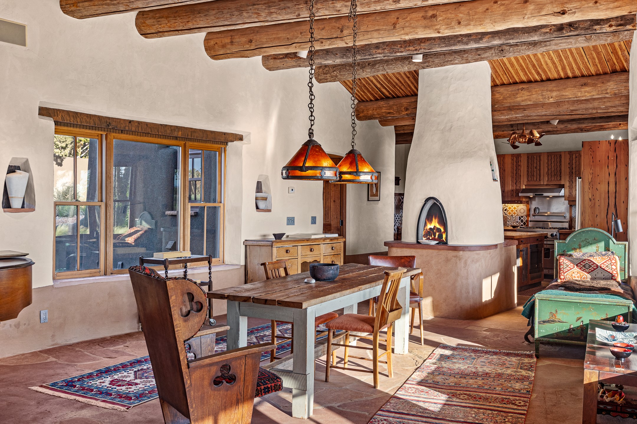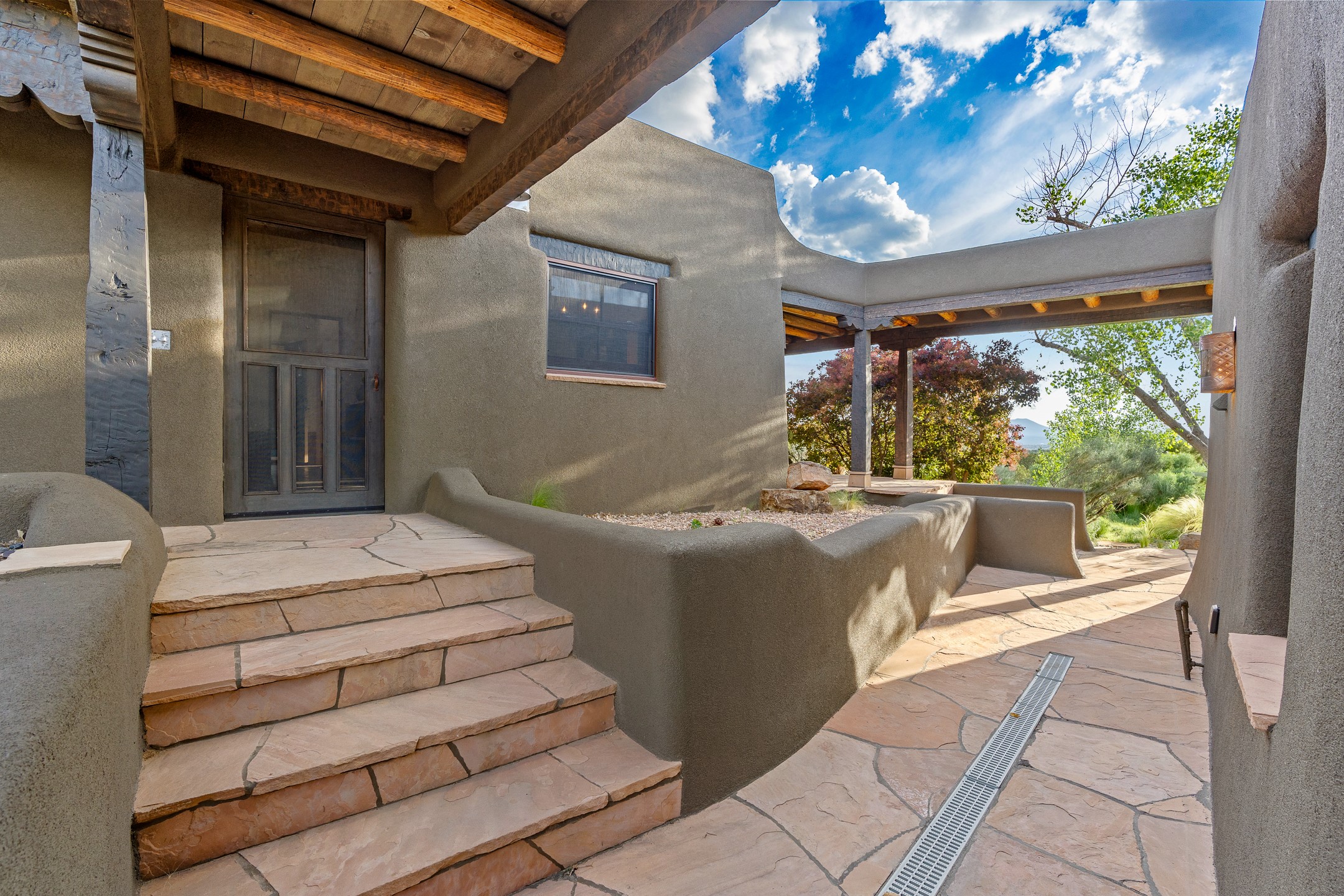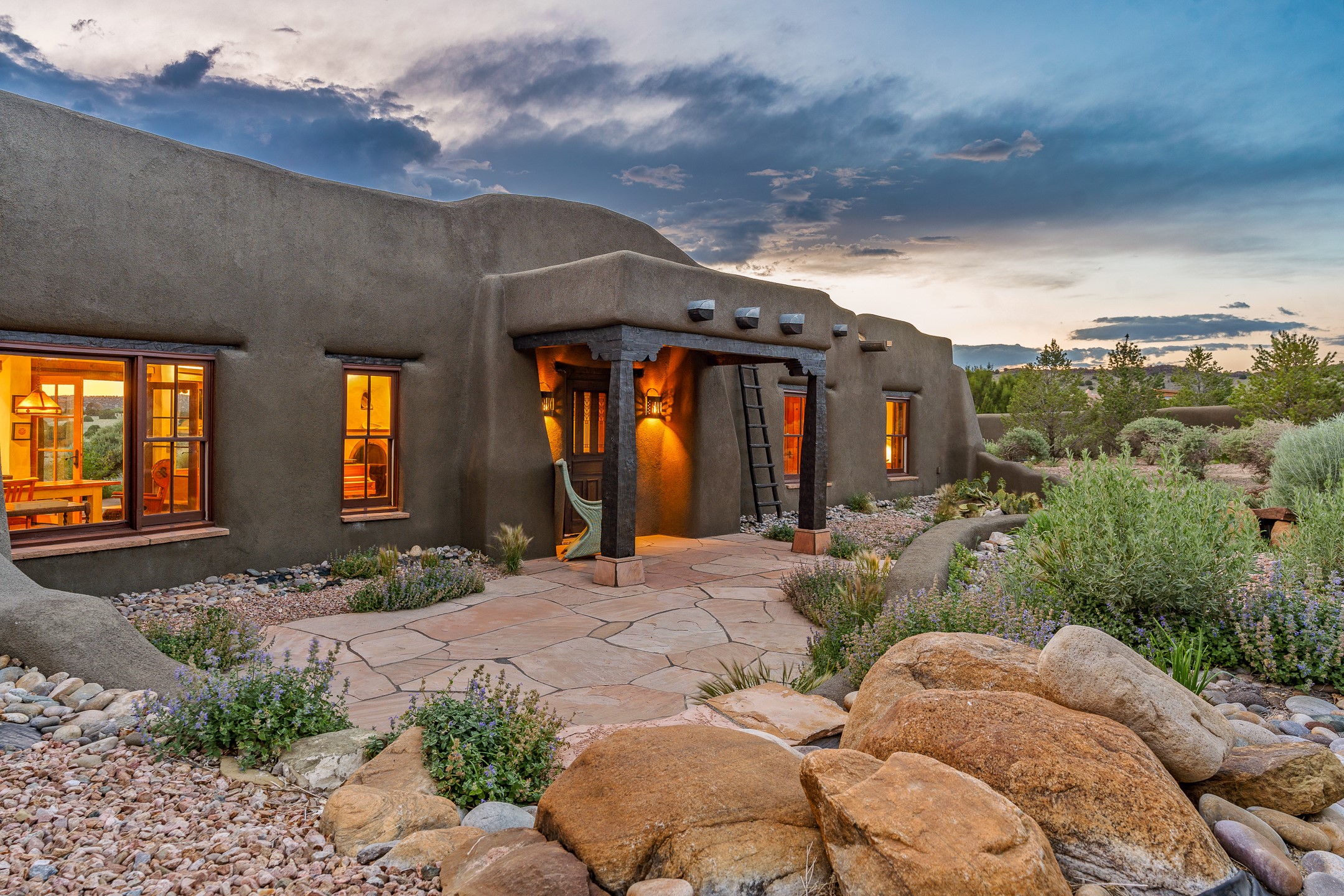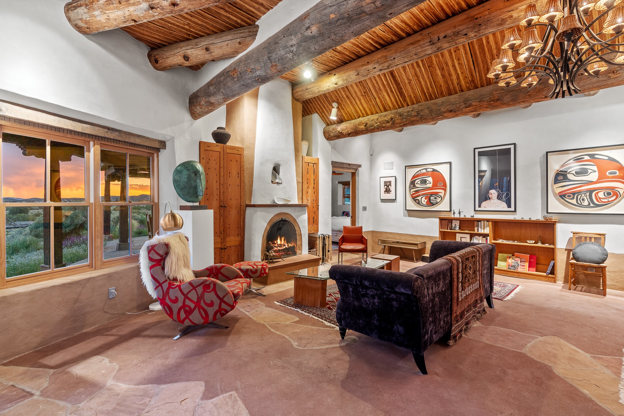 Stunning exemplary Architectural Masterpiece in Galisteo, constructed of solid adobe on 4.95 scenic acres with spectacular Ortiz Mountain views from almost every room. This gorgeous compound, recently refurbished, includes a main residence, guest house, art studio, and 1200 Sq. Ft of portal. Seamlessly integrating authentic techniques and materials with timeless and soulful elements, this home offers all the beauty, harmony and serenity one could desire. An Old Mexican archway and wooden gate lead to a zen-like courtyard with established xeriscaping. The traditional Latilla entry opens to a pitched ceiling of massive, antique, hand-hewn vigas with Arkansas split-cedar herringbone inlay. Adobe poured floors with flagstone. Clay slip wainscoted interior walls with plaster. Hand-adzed posts, beams and lintels. 80 year old hand-crafted, carved wood doors. Huge picture window and French doors to the portal. The kitchen showcases 100 year old river-retrieved heart of pine thunderbolt kitchen cabinets, Italian Bruno travertine counters, spacious island, sculptural double kiva, Viking range and cooktop, and walk-in pantry. Split bedroom plan offers maximum privacy. Primary suite is a true sanctuary with expansive, inspiring views, and an ensuite bath with double vanity, soaking tub for deep relaxation and walk-in shower. Detached Casita has an open kitchen and living area with French doors, bedroom with French doors, bath with double sink, and private portal with a kiva. The casita joins a heated and cooled attached Art studio, with carriage doors, making it possible to use as a garage. The portal leads to a charming study or sleeping nook. Professionally landscaped, there are two driveways and many quaint and private sitting areas surrounding the home, including an extraordinary Ramada with fire pit and hammocks to gaze at the stars. The adjoining walking trail leads to ancient pueblo ruins. Galisteo amenities include: community center, monthly brunches, 2 playgrounds, fire department, hiking, art tour, and Bosque River Reserve. 22 Solar panel array, whole house water purification, and underfloor heating. All baths have Noche travertine.