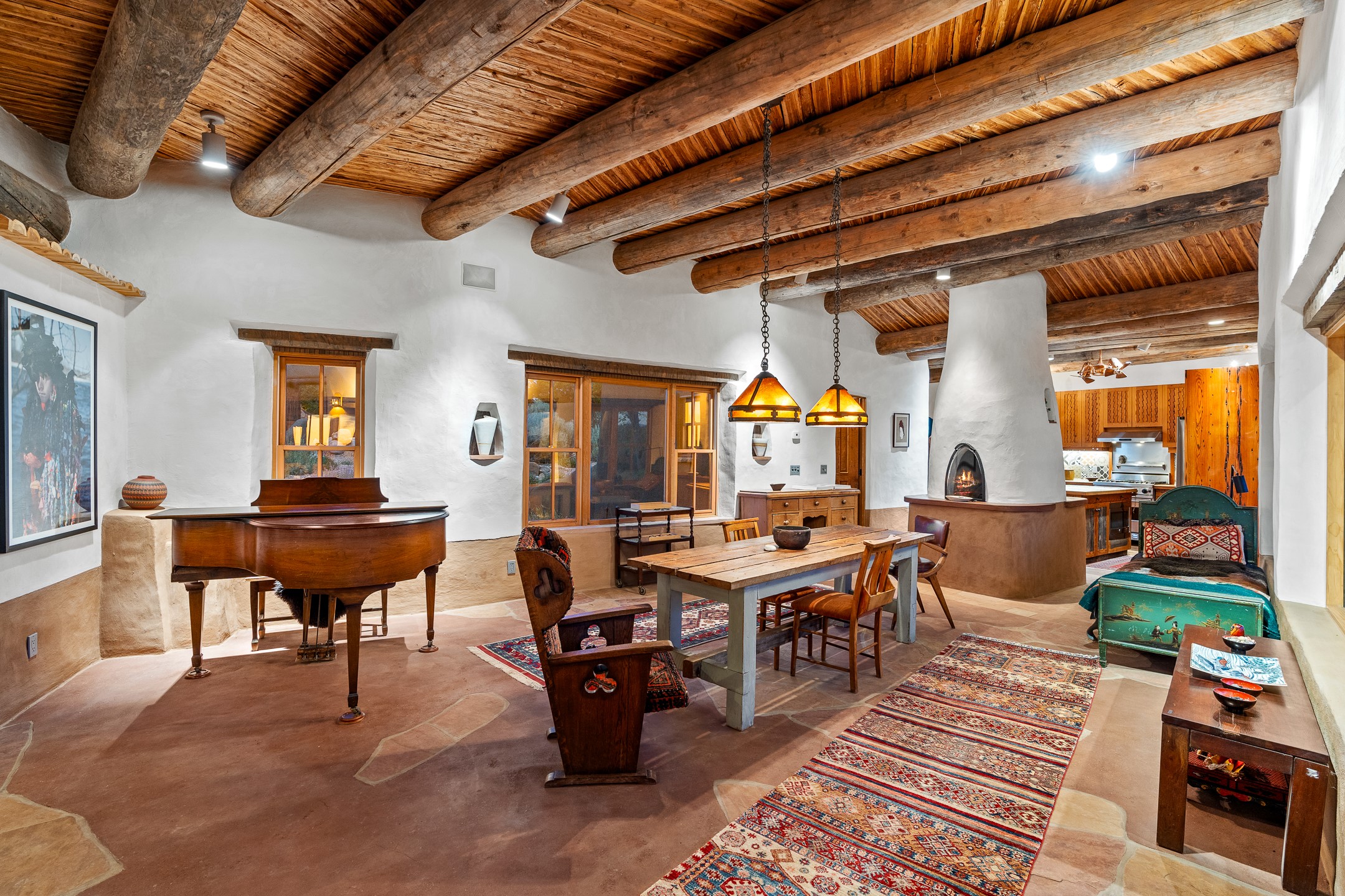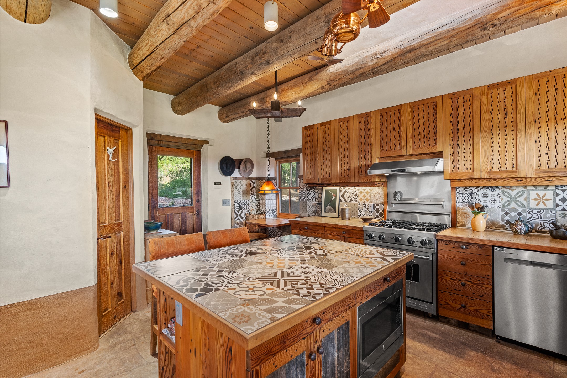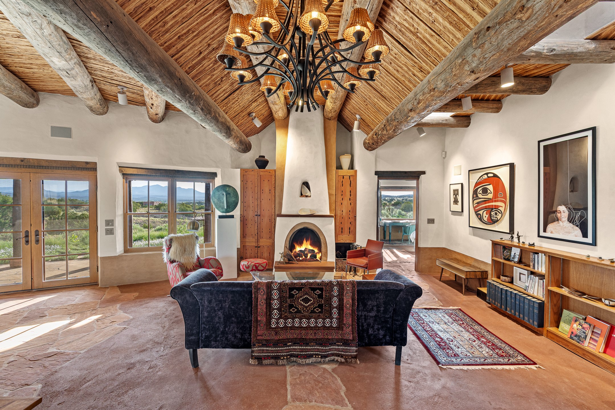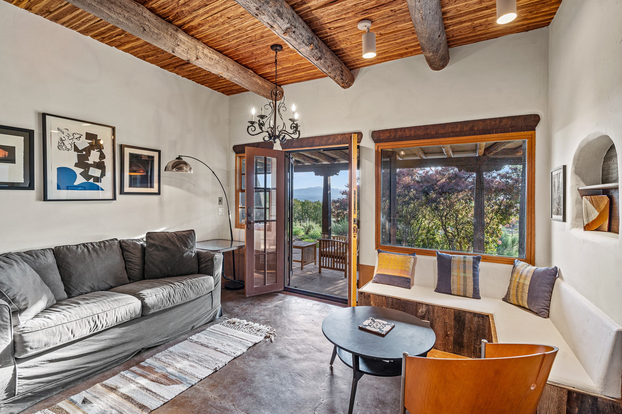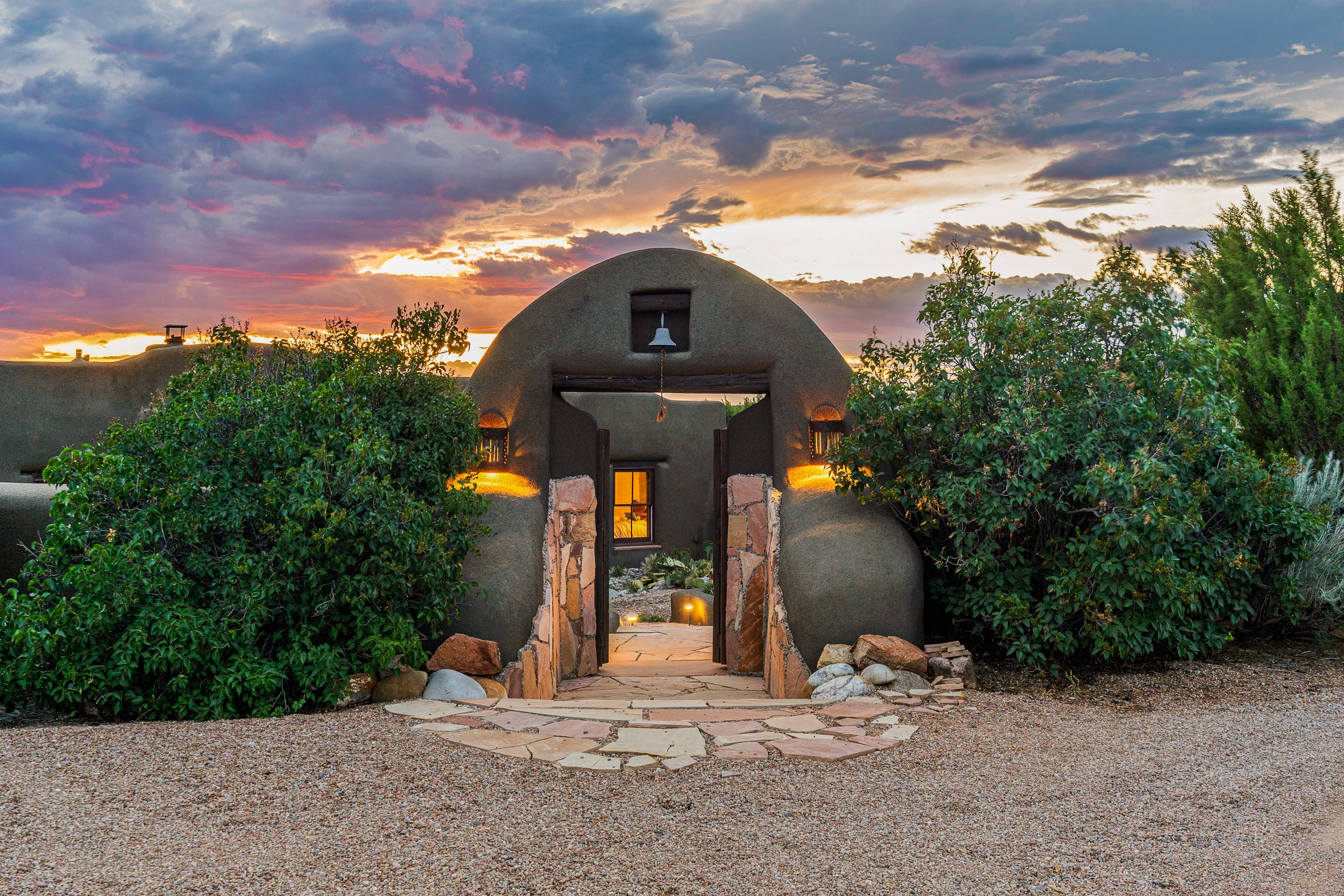 Stunning exemplary Architectural Masterpiece in Galisteo, constructed of solid adobe on 4.95 scenic acres with spectacular Ortiz Mountain views from almost every room. This gorgeous compound, recently refurbished, includes a main residence, guest house, art studio, and 1200 Sq. Ft of portal. Seamlessly integrating authentic techniques and materials with timeless and soulful elements, this home offers all the beauty, harmony and serenity one could desire. An Old Mexican archway and wooden gate lead to a zen-like courtyard with established xeriscaping. The traditional Latilla entry opens to a pitched ceiling of massive, antique, hand-hewn vigas with Arkansas split-cedar herringbone inlay. Adobe poured floors with flagstone. Clay slip wainscoted interior walls with plaster. Hand-adzed posts, beams and lintels. 80 year old hand-crafted, carved wood doors. Huge picture window and French doors to the portal. The kitchen showcases 100 year old river-retrieved heart of pine thunderbolt kitchen cabinets, Italian Bruno travertine counters, spacious island, sculptural double kiva, Viking range and cooktop, and walk-in pantry. Split bedroom plan offers maximum privacy. Primary suite is a true sanctuary with expansive, inspiring views, and an ensuite bath with double vanity, soaking tub for deep relaxation and walk-in shower. Detached Casita has an open kitchen and living area with French doors, bedroom with French doors, bath with double sink, and private portal with a kiva. The casita joins a heated and cooled attached Art studio, with carriage doors, making it possible to use as a garage. The portal leads to a charming study or sleeping nook. Professionally landscaped, there are two driveways and many quaint and private sitting areas surrounding the home, including an extraordinary Ramada with fire pit and hammocks to gaze at the stars. The adjoining walking trail leads to ancient pueblo ruins. Galisteo amenities include: community center, monthly brunches, 2 playgrounds, fire department, hiking, art tour, and Bosque River Reserve. 22 Solar panel array, whole house water purification, and underfloor heating. All baths have Noche travertine.