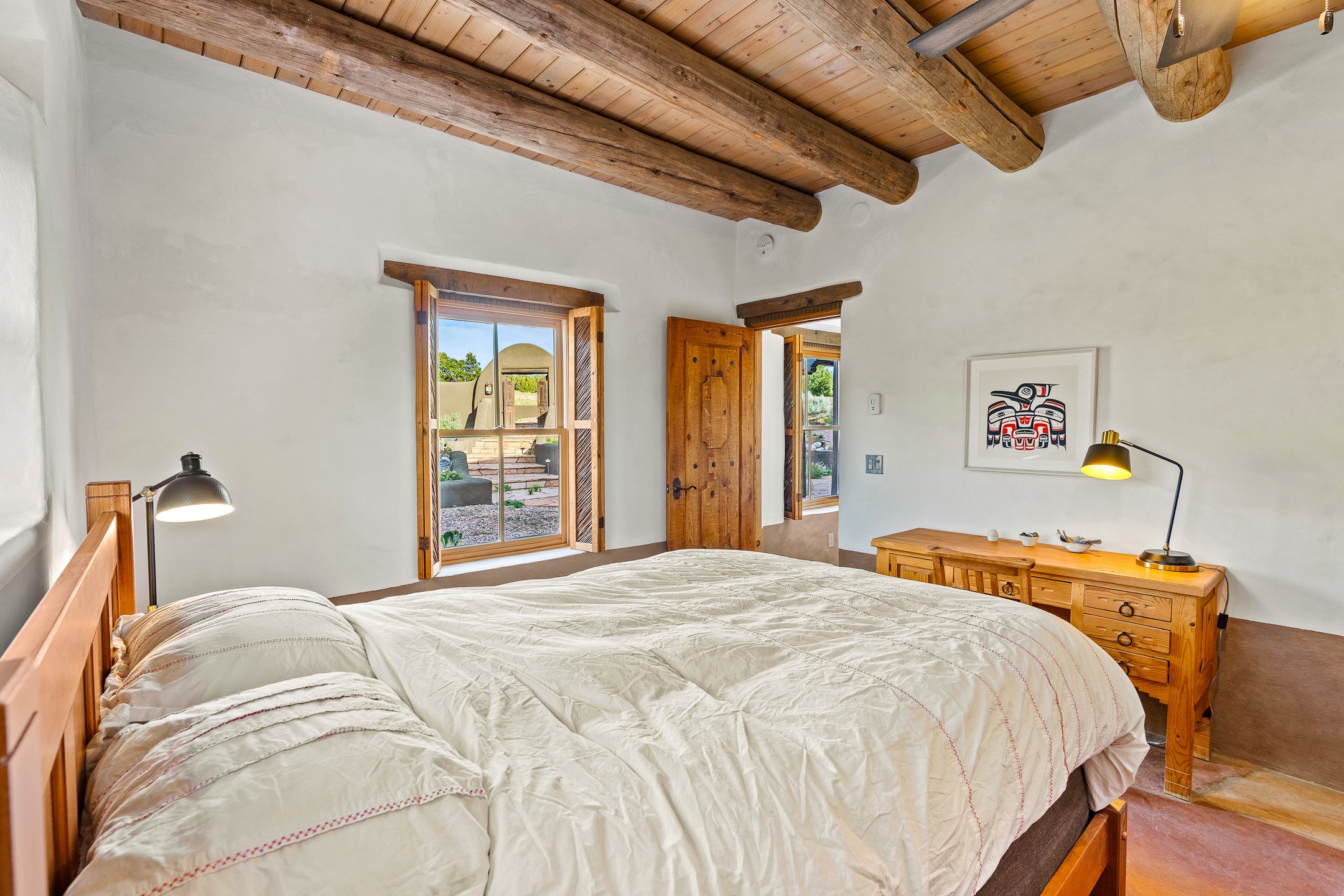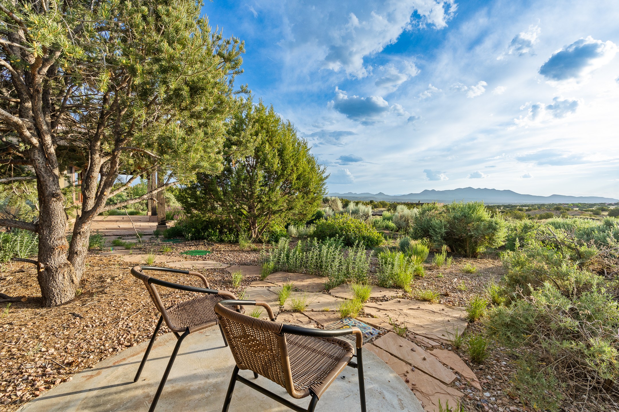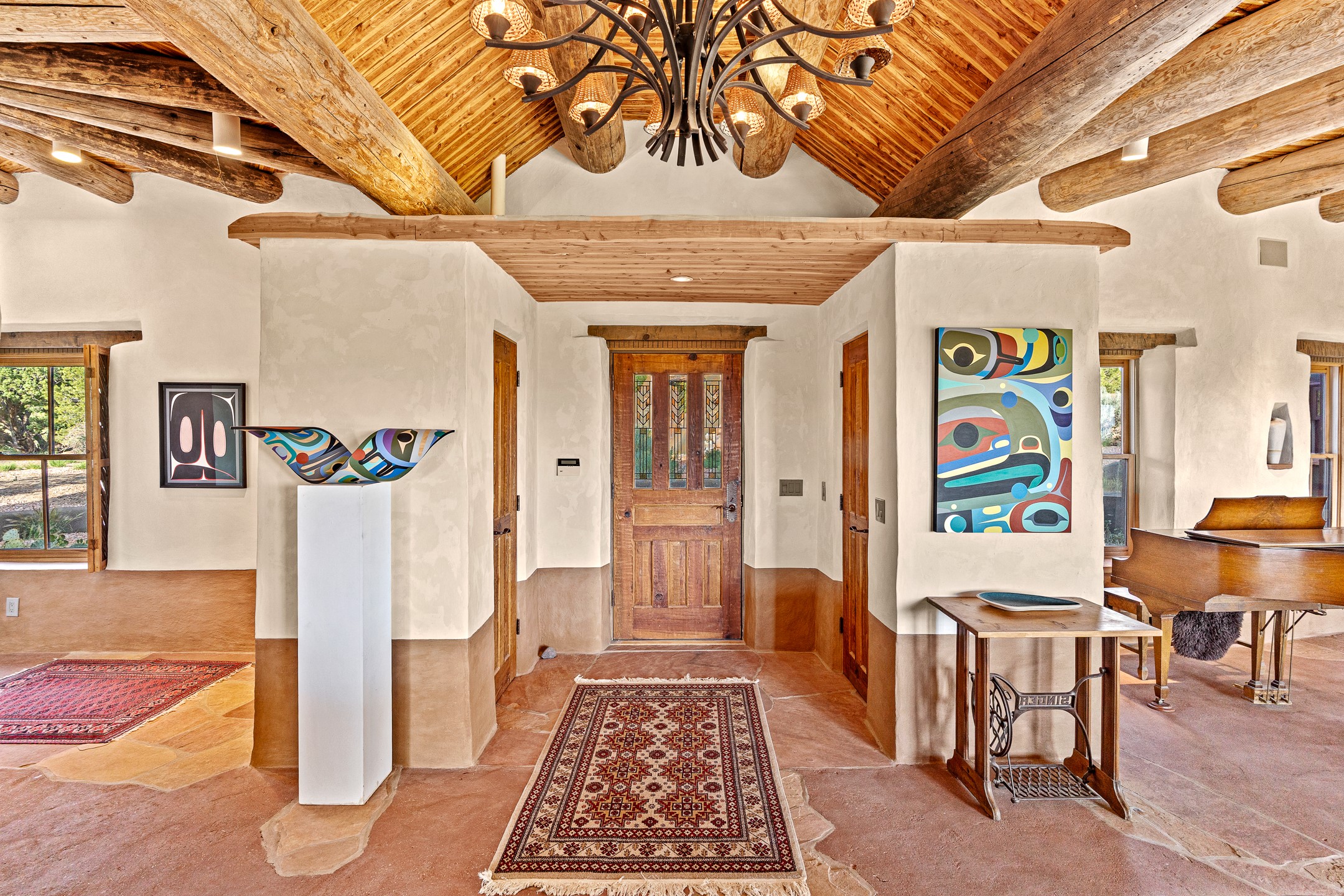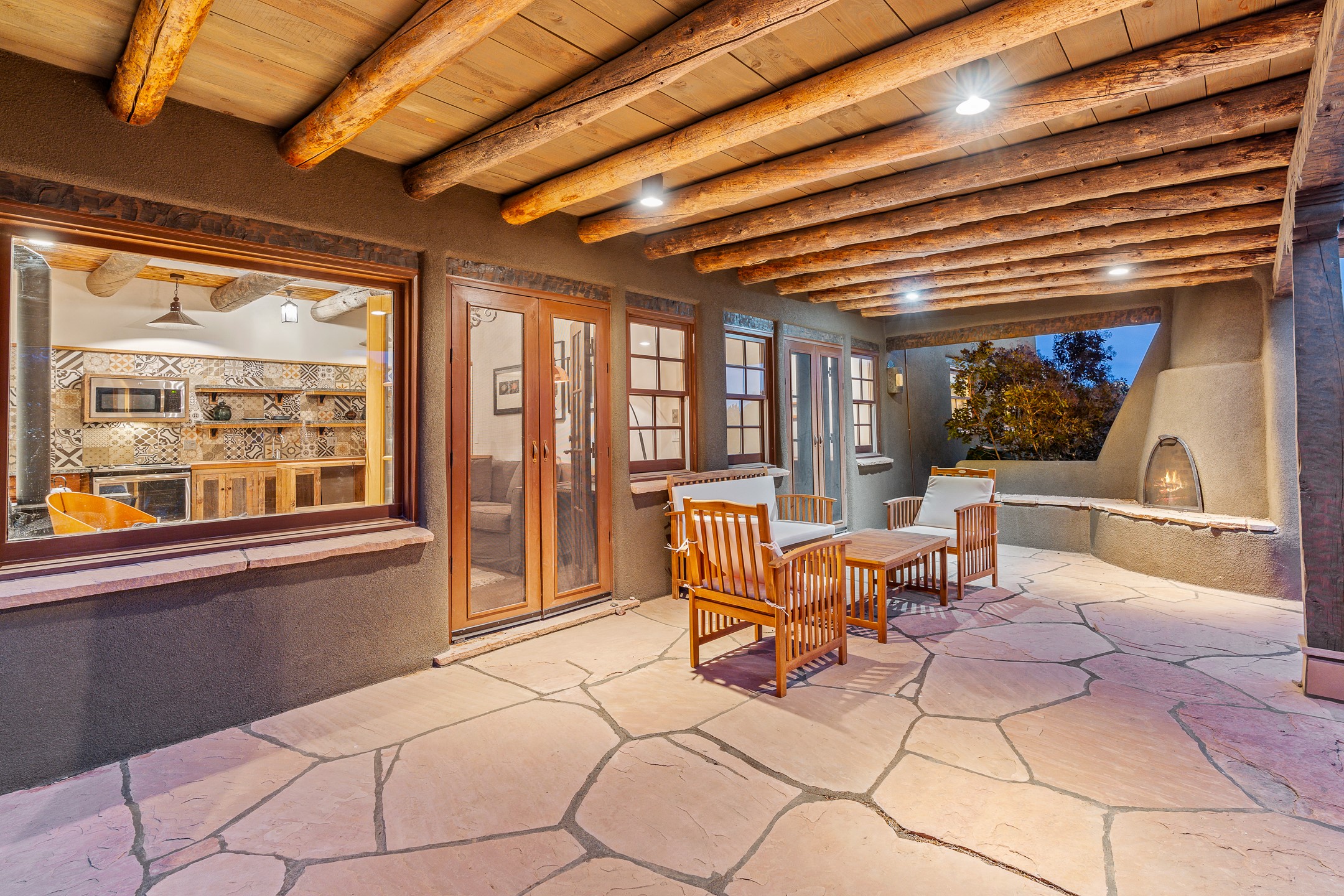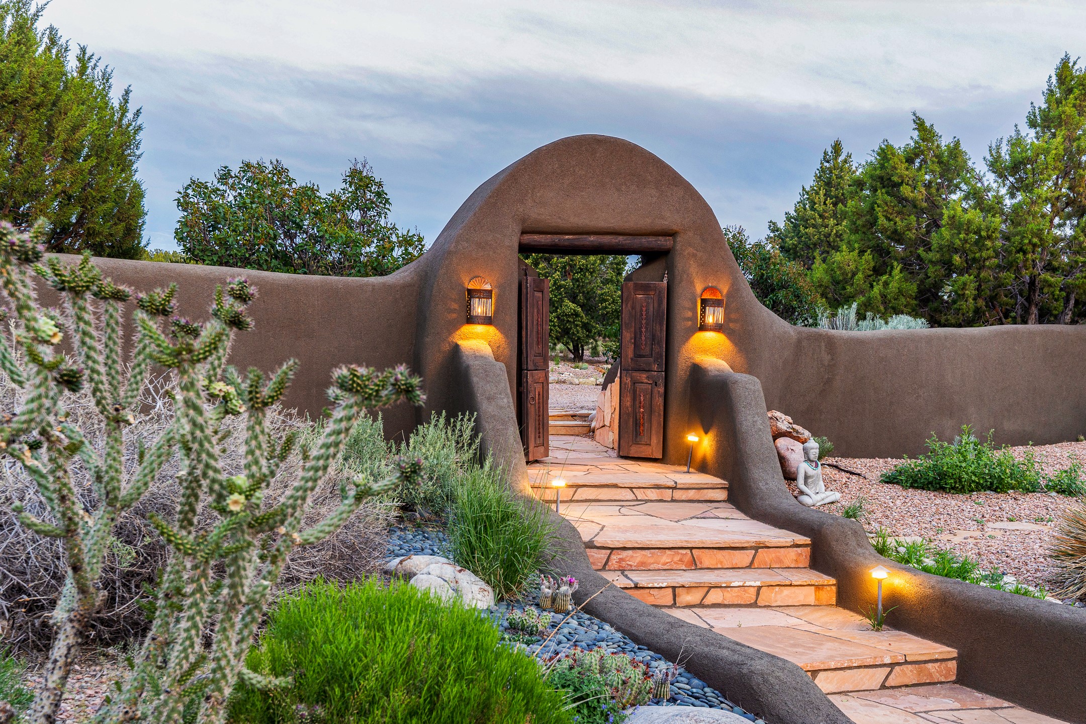 Stunning exemplary Architectural Masterpiece in Galisteo, constructed of solid adobe on 4.95 scenic acres with spectacular Ortiz Mountain views from almost every room. This gorgeous compound, recently refurbished, includes a main residence, guest house, art studio, and 1200 Sq. Ft of portal. Seamlessly integrating authentic techniques and materials with timeless and soulful elements, this home offers all the beauty, harmony and serenity one could desire. An Old Mexican archway and wooden gate lead to a zen-like courtyard with established xeriscaping. The traditional Latilla entry opens to a pitched ceiling of massive, antique, hand-hewn vigas with Arkansas split-cedar herringbone inlay. Adobe poured floors with flagstone. Clay slip wainscoted interior walls with plaster. Hand-adzed posts, beams and lintels. 80 year old hand-crafted, carved wood doors. Huge picture window and French doors to the portal. The kitchen showcases 100 year old river-retrieved heart of pine thunderbolt kitchen cabinets, Italian Bruno travertine counters, spacious island, sculptural double kiva, Viking range and cooktop, and walk-in pantry. Split bedroom plan offers maximum privacy. Primary suite is a true sanctuary with expansive, inspiring views, and an ensuite bath with double vanity, soaking tub for deep relaxation and walk-in shower. Detached Casita has an open kitchen and living area with French doors, bedroom with French doors, bath with double sink, and private portal with a kiva. The casita joins a heated and cooled attached Art studio, with carriage doors, making it possible to use as a garage. The portal leads to a charming study or sleeping nook. Professionally landscaped, there are two driveways and many quaint and private sitting areas surrounding the home, including an extraordinary Ramada with fire pit and hammocks to gaze at the stars. The adjoining walking trail leads to ancient pueblo ruins. Galisteo amenities include: community center, monthly brunches, 2 playgrounds, fire department, hiking, art tour, and Bosque River Reserve. 22 Solar panel array, whole house water purification, and underfloor heating. All baths have Noche travertine.