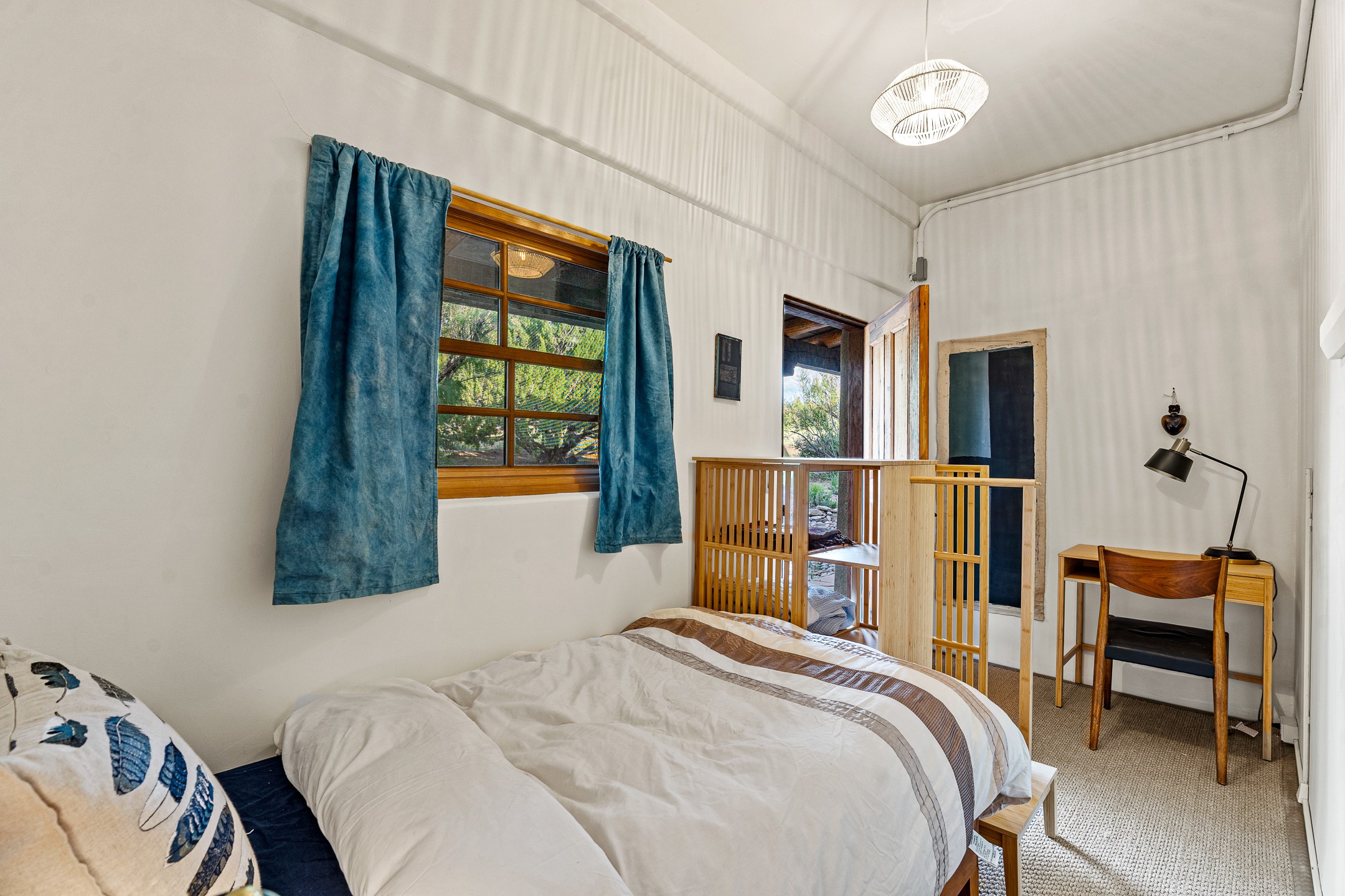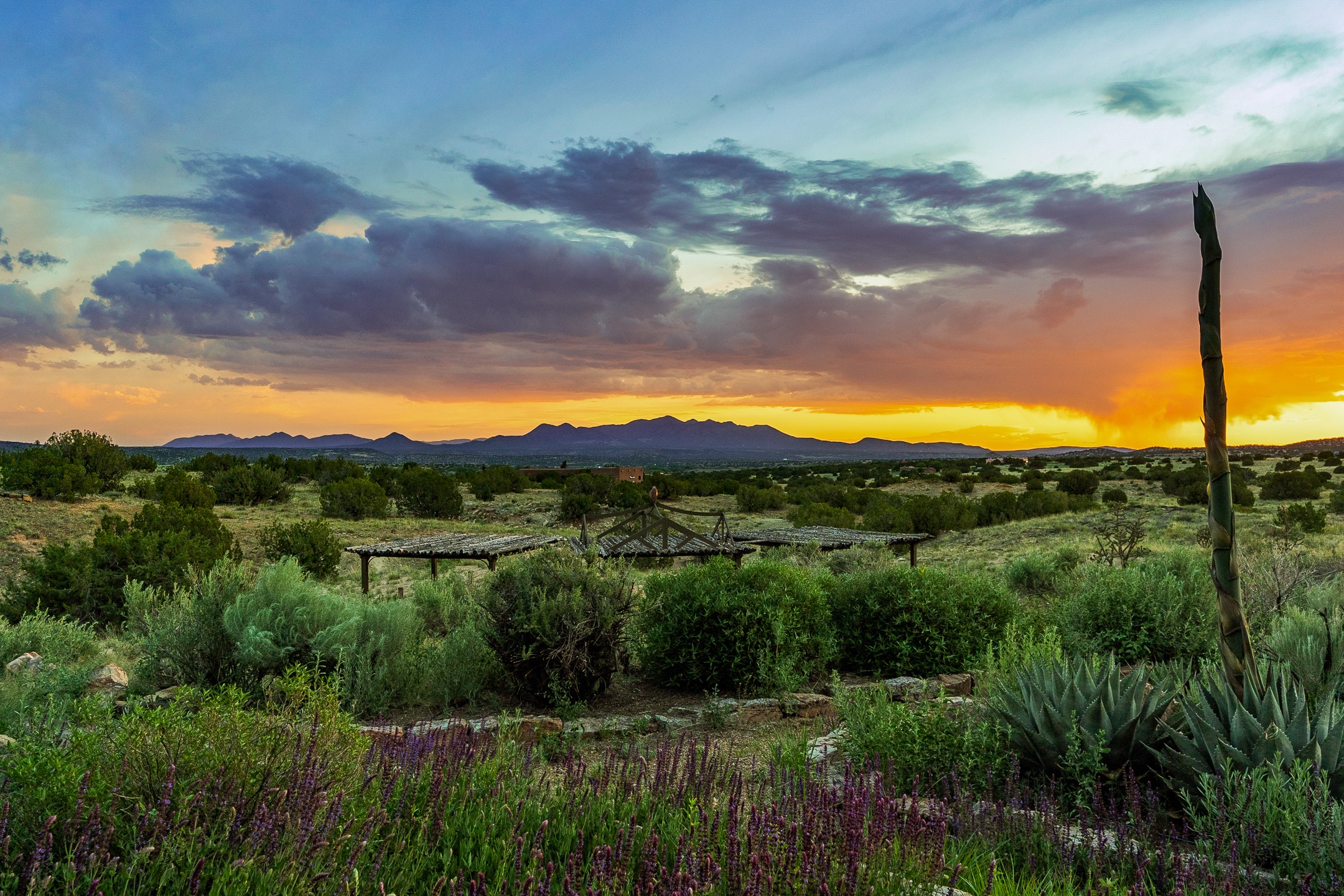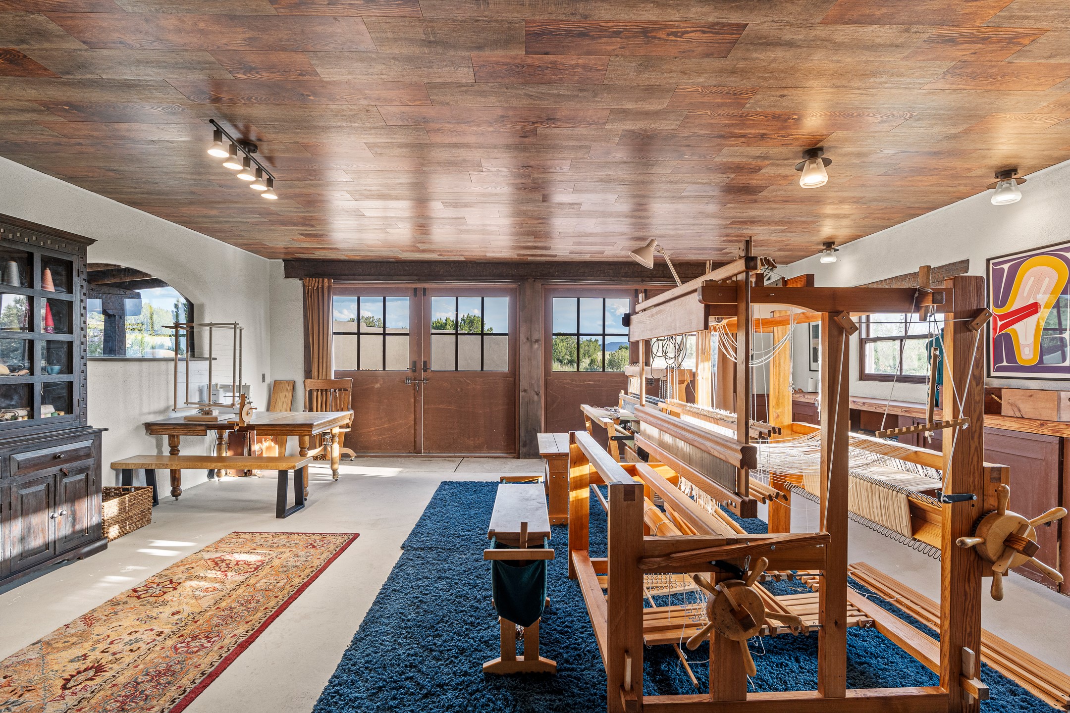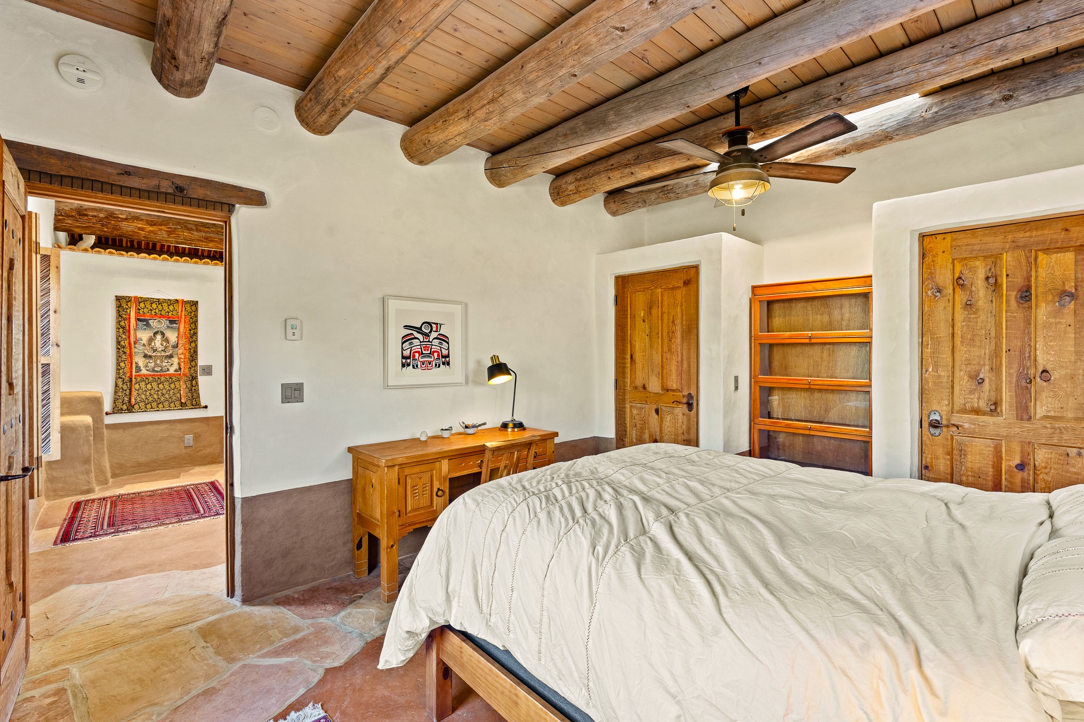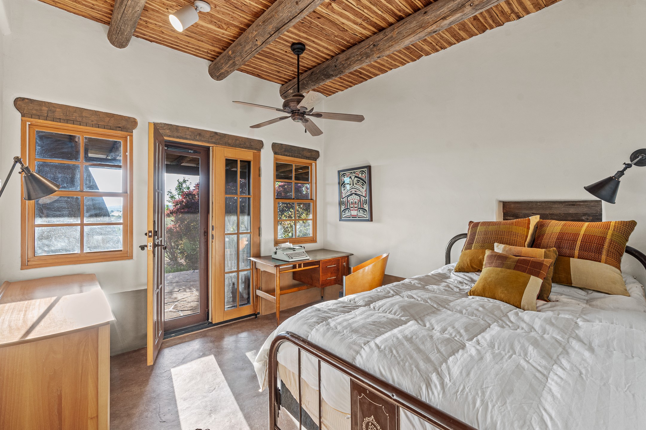 Stunning exemplary Architectural Masterpiece in Galisteo, constructed of solid adobe on 4.95 scenic acres with spectacular Ortiz Mountain views from almost every room. This gorgeous compound, recently refurbished, includes a main residence, guest house, art studio, and 1200 Sq. Ft of portal. Seamlessly integrating authentic techniques and materials with timeless and soulful elements, this home offers all the beauty, harmony and serenity one could desire. An Old Mexican archway and wooden gate lead to a zen-like courtyard with established xeriscaping. The traditional Latilla entry opens to a pitched ceiling of massive, antique, hand-hewn vigas with Arkansas split-cedar herringbone inlay. Adobe poured floors with flagstone. Clay slip wainscoted interior walls with plaster. Hand-adzed posts, beams and lintels. 80 year old hand-crafted, carved wood doors. Huge picture window and French doors to the portal. The kitchen showcases 100 year old river-retrieved heart of pine thunderbolt kitchen cabinets, Italian Bruno travertine counters, spacious island, sculptural double kiva, Viking range and cooktop, and walk-in pantry. Split bedroom plan offers maximum privacy. Primary suite is a true sanctuary with expansive, inspiring views, and an ensuite bath with double vanity, soaking tub for deep relaxation and walk-in shower. Detached Casita has an open kitchen and living area with French doors, bedroom with French doors, bath with double sink, and private portal with a kiva. The casita joins a heated and cooled attached Art studio, with carriage doors, making it possible to use as a garage. The portal leads to a charming study or sleeping nook. Professionally landscaped, there are two driveways and many quaint and private sitting areas surrounding the home, including an extraordinary Ramada with fire pit and hammocks to gaze at the stars. The adjoining walking trail leads to ancient pueblo ruins. Galisteo amenities include: community center, monthly brunches, 2 playgrounds, fire department, hiking, art tour, and Bosque River Reserve. 22 Solar panel array, whole house water purification, and underfloor heating. All baths have Noche travertine.