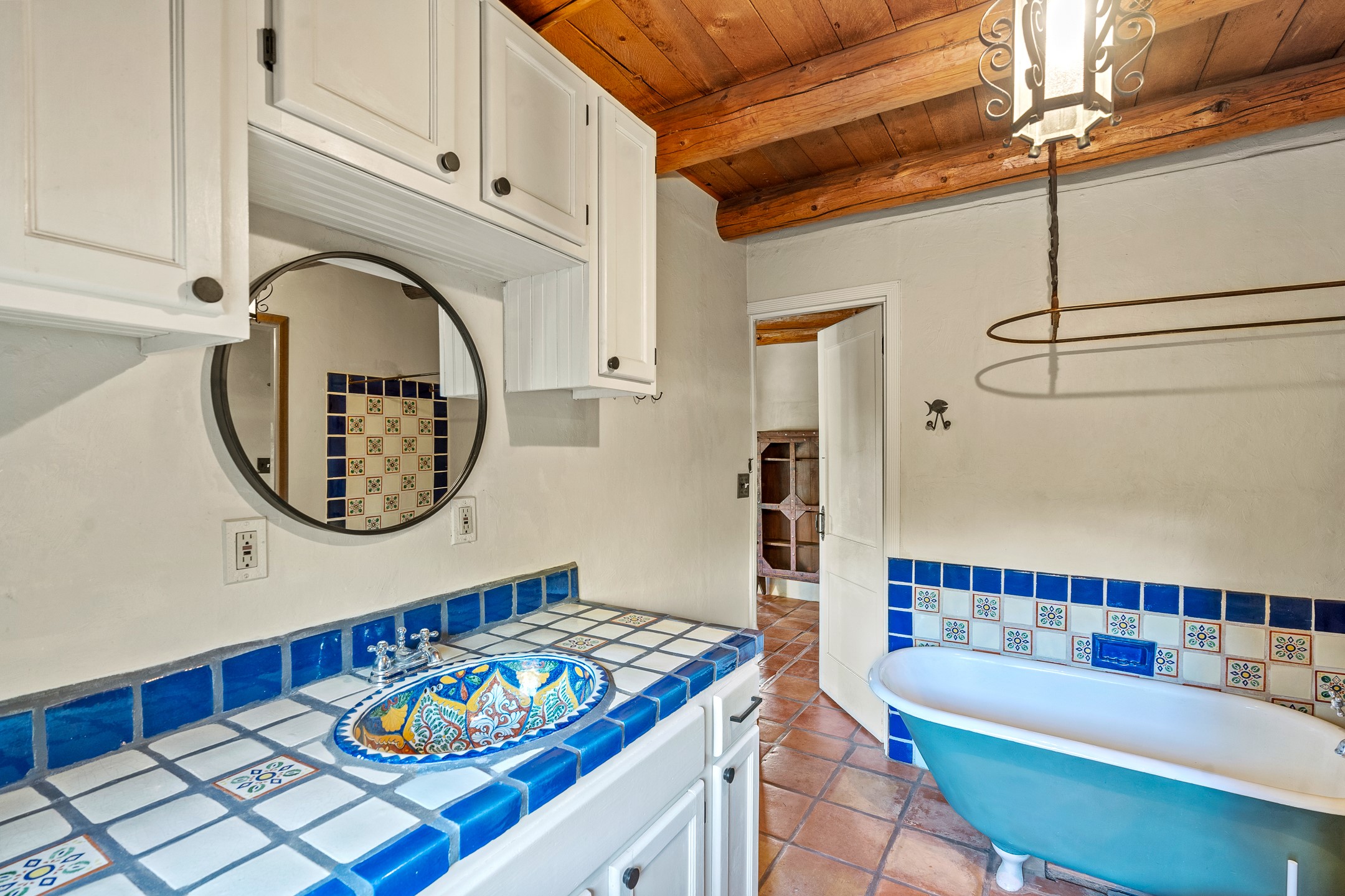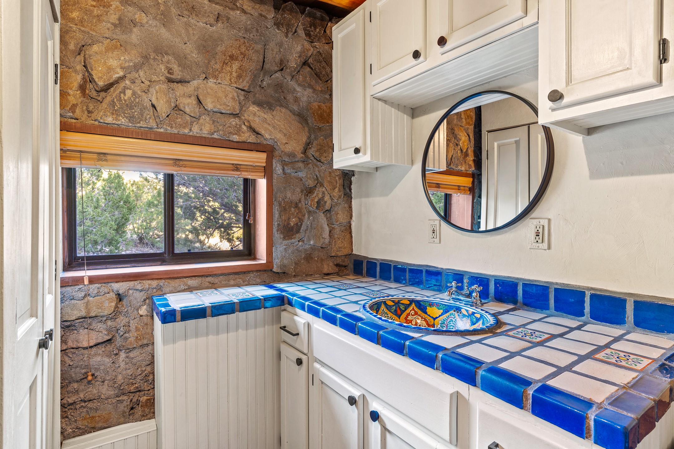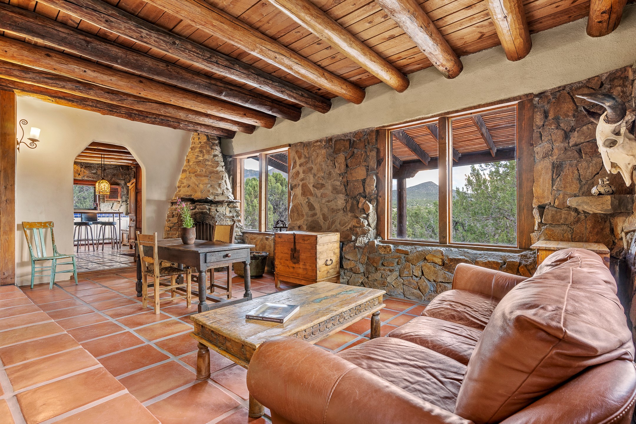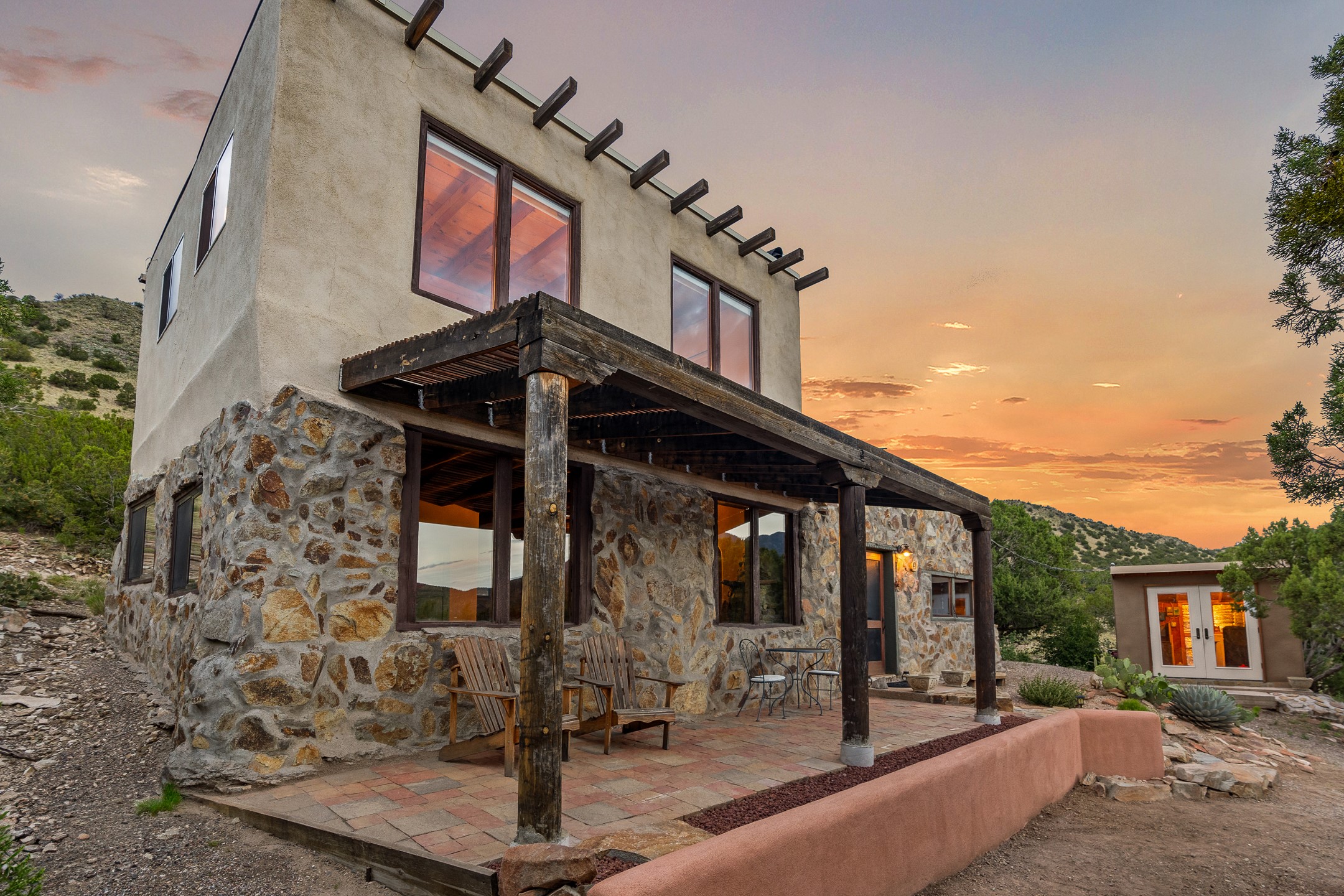 Experience sustainable Off-Grid living in a truly unique and artistically designed home. A One bedroom, one full bath Artist retreat in Madrid, New Mexico with solidly built craftsmanship. Every detail speaks to inspiration and integrity--from the hand-poured, etched entry threshold, the turquoise inlay to the artisan stone walls, hand-hewn vigas, and thick reclaimed timber beam window ledges. A mosaic tile inlay graces the foot of the richly grained hardwood staircase, and a striking stone-clad fireplace anchors the living space with warmth and enduring character. Designed for comfort and sustainability, this home offers a holistic lifestyle in a truly inspiring setting. The spacious bedroom opens to sweeping, unobstructed views set at the base of Cerro Chato and facing the majestic Ortiz Mountains. This solar-powered sanctuary offers privacy and breathtaking mountain vistas on over 10 rolling acres--just 3 minutes from the historic Turquoise Trail, under two miles from the Cultural Hub and Historic mining village of Madrid, and a short drive to Santa Fe. Live off-grid with confidence thanks to an upgraded solar system, backup generator, owned propane tank, private well 85-95 feet deep with 10-12 gallons per minute, new Norwesco 350 gallon well holding tank for the well water that fills in 40 minutes, new septic system and new leach field 2025 (infiltrator model wm-11-03-100, a newly built portal -2025, and 2021 roof. A bright, versatile outbuilding houses the solar batteries and offers additional space for storage, an office, or a creative studio. Bring your chickens, mini goats or a burro; the property includes a single stall, feed shed, and ample room for expansion. Whether you're hiking, stargazing, or simply soaking in the beauty of the high desert, this land invites deep connection with nature. For anyone dreaming of an Off-grid lifestyle- whether you're a homesteader, hobby farmer, or simply seeking peace and regeneration. Experience a rare blend of tranquility, creativity, and connection to the land--just moments from the vibrant arts, culture, and dining of Madrid and Santa Fe.