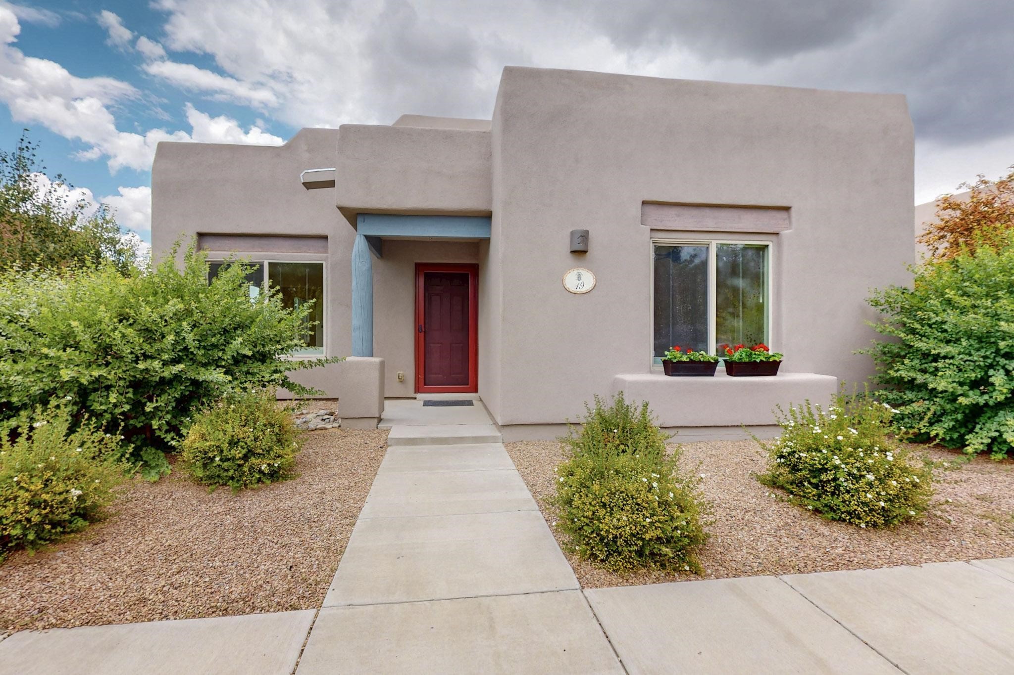 Discover the perfect sanctuary in this darling Rancho Viejo home. This inviting home offers 2 bedrooms, 2 bathrooms and a large walk-in master closet. It has a great single level layout with plenty of natural light that creates a warm and welcoming atmosphere that instantly feels like home. Just outside the kitchen is your own private backyard retreat with 2 big apple trees bursting with apples ready to eat. The yard is filled with mounds of stunning hollyhocks that are abundant in the spring. It is perfect for outdoor entertaining and an ideal setting for your morning breakfast or alfresco dining. Catch a little view of Tetilla Peak, too. Plenty of parking and a 2 car garage that provides lots of room for storage. Just steps from the house are stunning and eye-popping views of the Sangre de Cristo Mountains that will take your breath away. You can hit miles of Rancho Viejos's walking and hiking trails that connect to the Santa Fe Rail Trail - perfect for outdoor lovers. Plenty of parks nearby that offer a perfect blend of comfort, beauty and sense of community. Come see it -- your new chapter starts here!