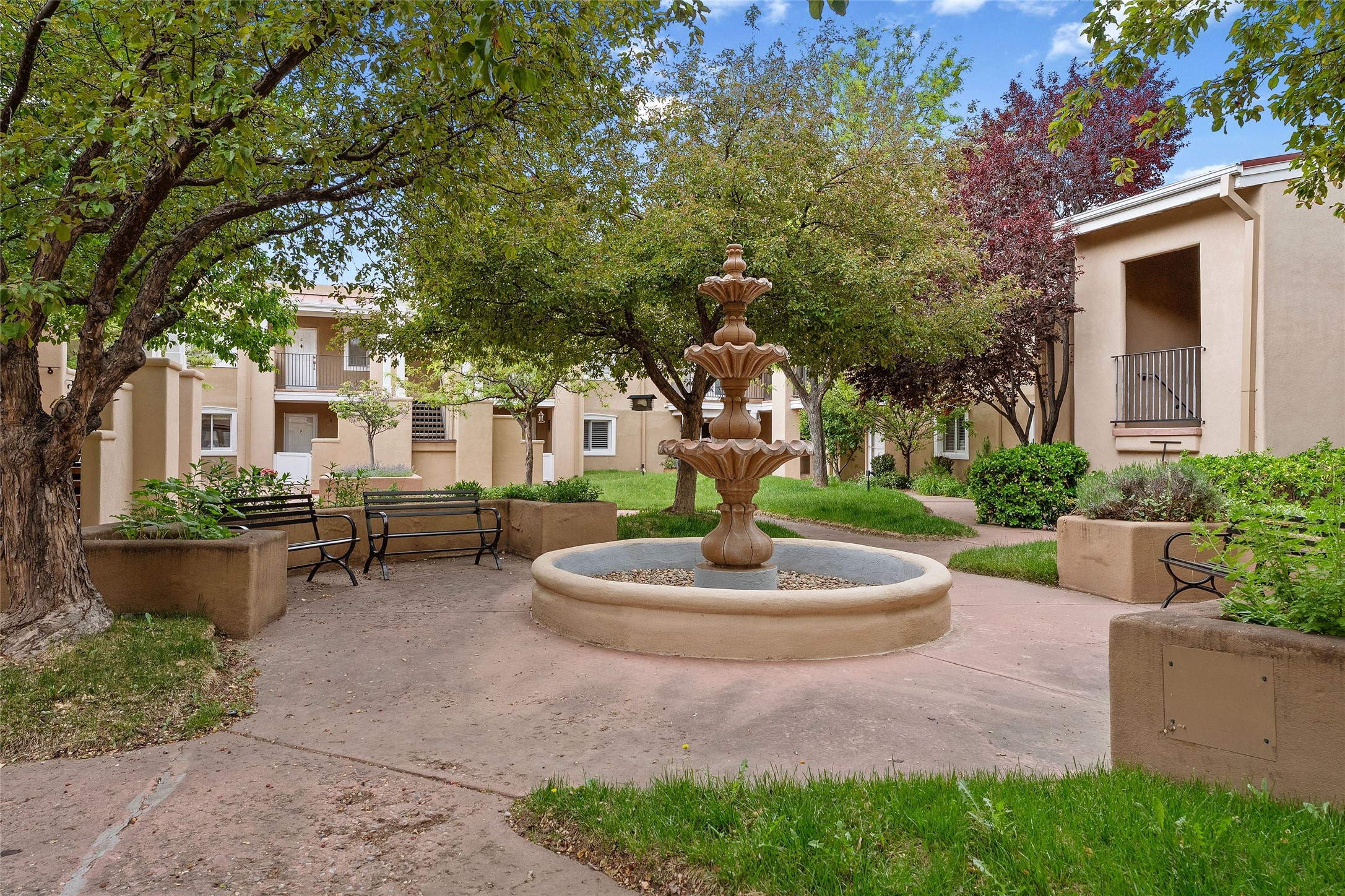 Absolutely ideal condo in coveted El Matador! Ideal because this unit is ground level, positioned to enjoy the gracious centered courtyard. Greenery is hard to find in Santa Fe and this "garden of eden" (to quote a neighbor) is a green oasis!You will often enjoy the shaded patio in the front: the white gate is low enough to encourage a chat with neighbors walking by. And off the bedroom is another more secluded patio, sunny for plants, and quiet for reading. This patio is a bonus because the bolted door opens to the parking spaces, and the parking spot for this unit is directly across. Think of the easy access for groceries, suitcases, etc.When you are looking at the photos keep in mind the unit comes completely furnished, with high-end furniture choices. The spaces are logical and well planned, there is a good flow from room to room, yet privacy in the bedrom if someone wants to go to bed early.This is a terrific location regardless of your agility. You can enjoy life just sitting in the front portal. Or, for a morning walk, a stroll through Ft Marcy Park would get your steps in for the day. This community park also has a swimming pool, exercise classes, small gym. And, if you have a dog, they would certainly enjoy this park - abundant dog smells! And, further walking can take you into the heart of town within a few blocks. Numerous restaurants in all prices ranges, local coffee shops, and truly excellent shopping possibilities - and of course, our Santa Fe Plaza. Festivals and activities year around, with numerous markets and celebrations, musical events and lots of happy people!