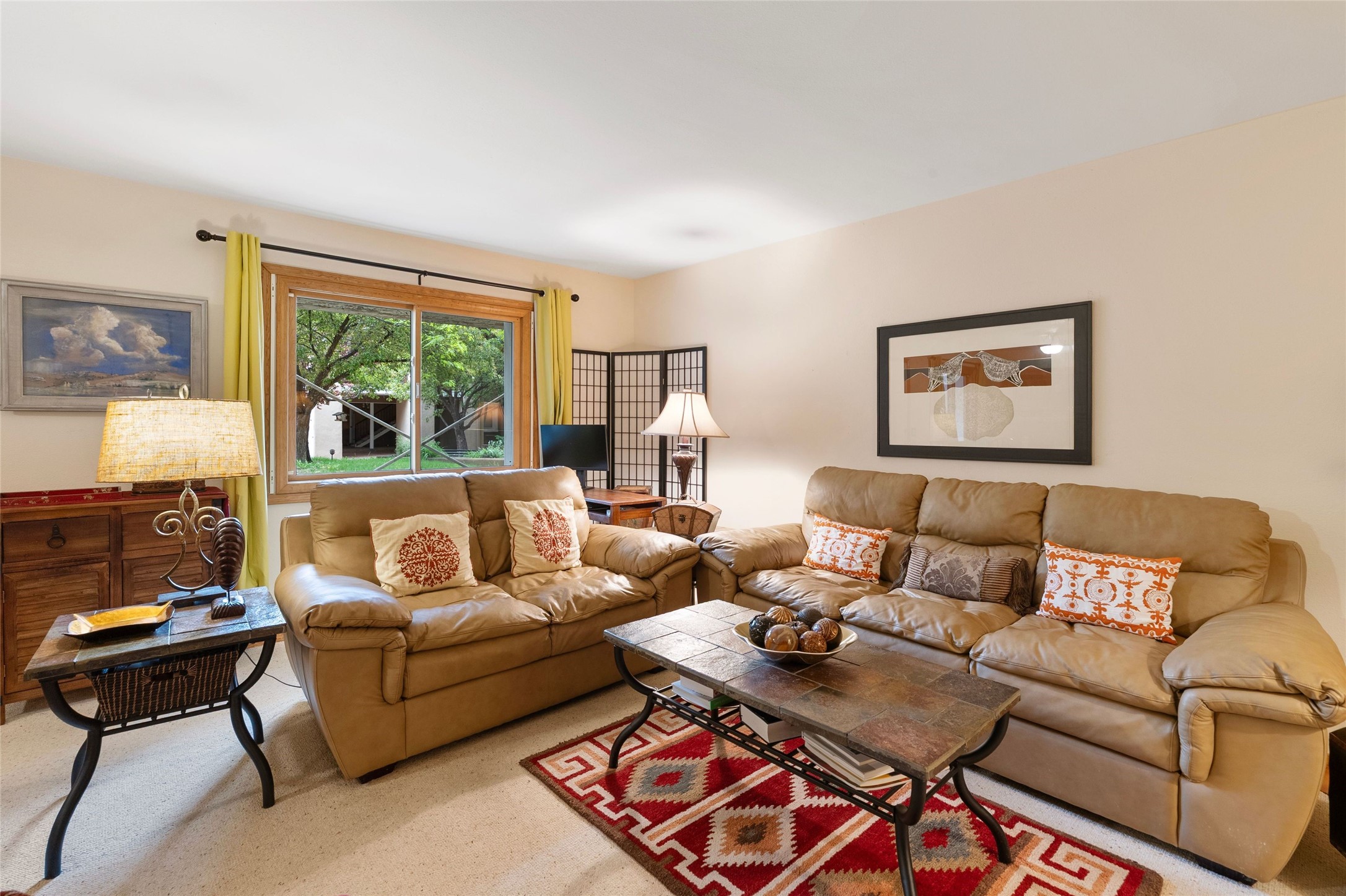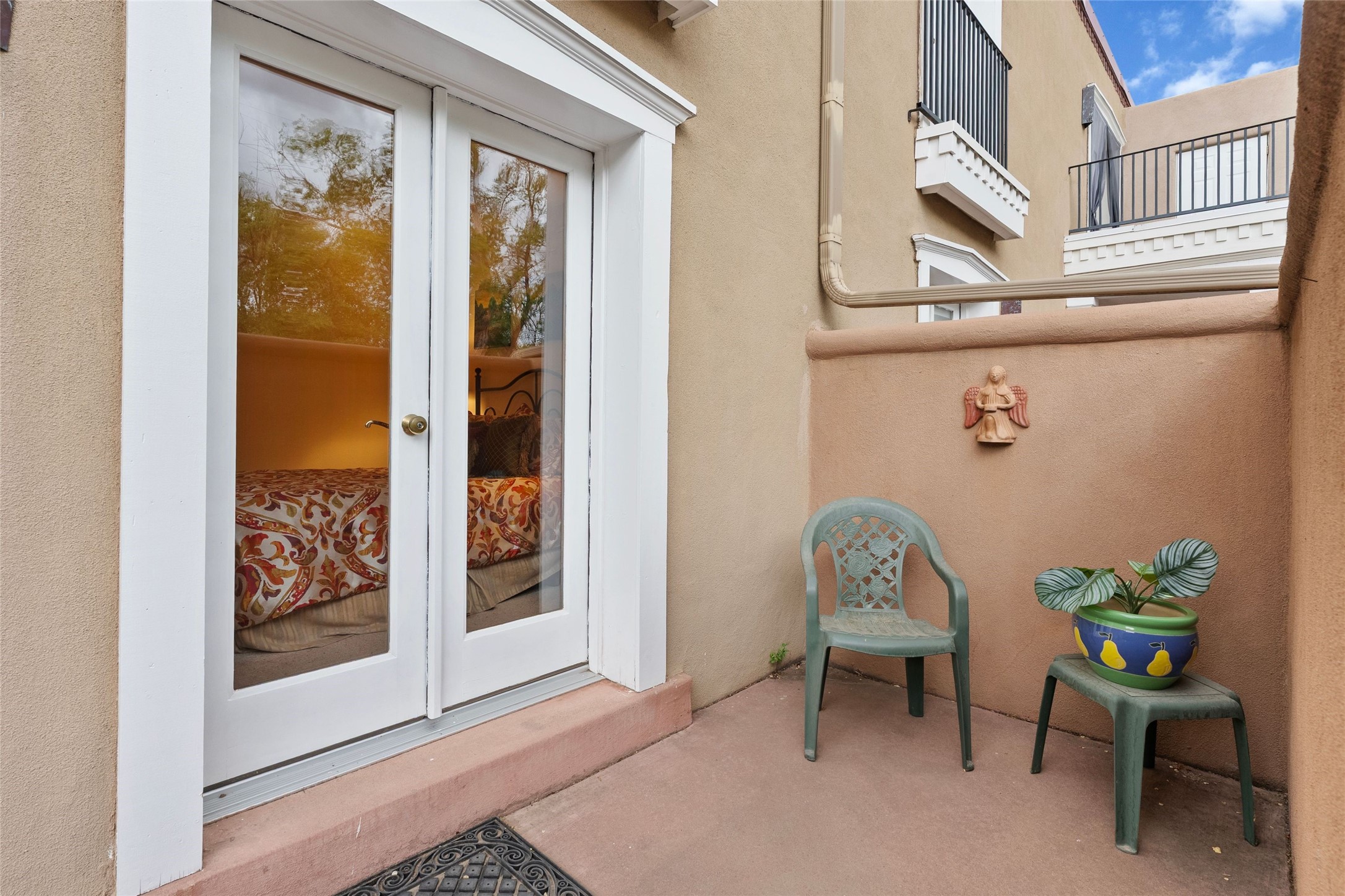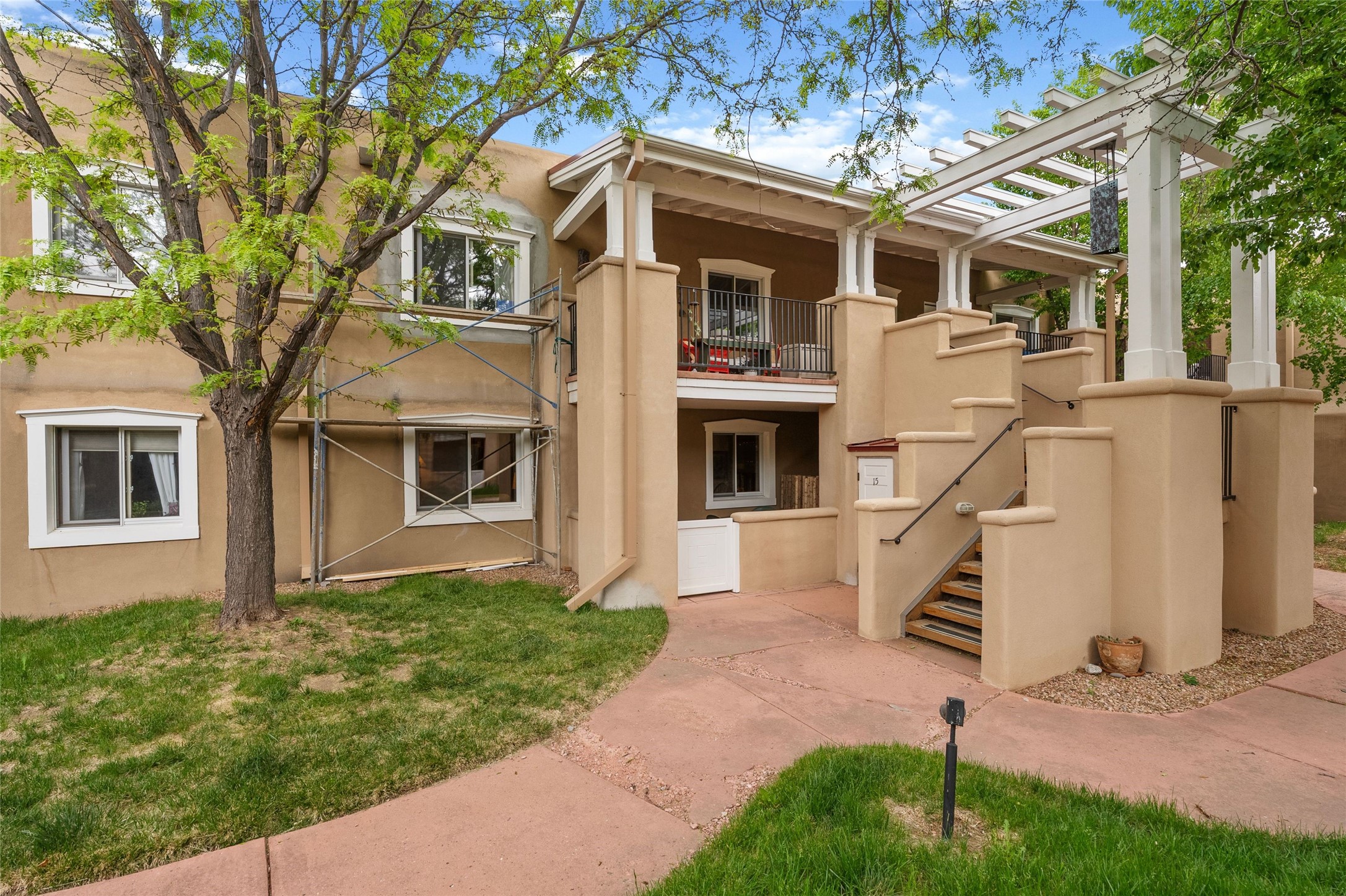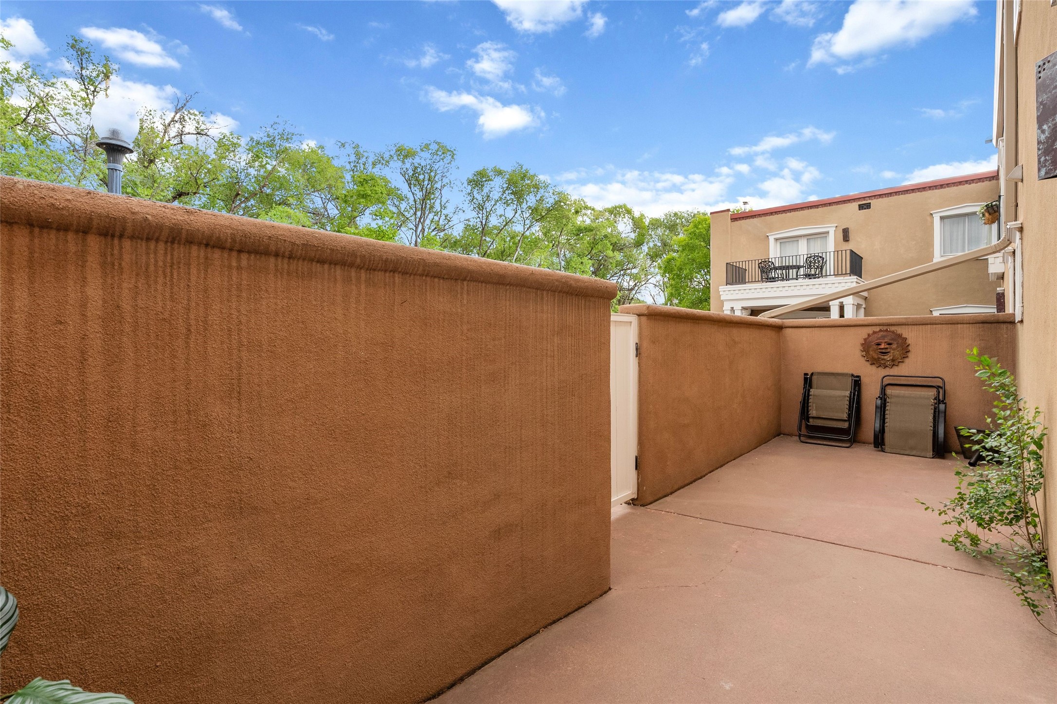 Absolutely ideal condo in coveted El Matador! Ideal because this unit is ground level, positioned to enjoy the gracious centered courtyard. Greenery is hard to find in Santa Fe and this "garden of eden" (to quote a neighbor) is a green oasis!You will often enjoy the shaded patio in the front: the white gate is low enough to encourage a chat with neighbors walking by. And off the bedroom is another more secluded patio, sunny for plants, and quiet for reading. This patio is a bonus because the bolted door opens to the parking spaces, and the parking spot for this unit is directly across. Think of the easy access for groceries, suitcases, etc.When you are looking at the photos keep in mind the unit comes completely furnished, with high-end furniture choices. The spaces are logical and well planned, there is a good flow from room to room, yet privacy in the bedrom if someone wants to go to bed early.This is a terrific location regardless of your agility. You can enjoy life just sitting in the front portal. Or, for a morning walk, a stroll through Ft Marcy Park would get your steps in for the day. This community park also has a swimming pool, exercise classes, small gym. And, if you have a dog, they would certainly enjoy this park - abundant dog smells! And, further walking can take you into the heart of town within a few blocks. Numerous restaurants in all prices ranges, local coffee shops, and truly excellent shopping possibilities - and of course, our Santa Fe Plaza. Festivals and activities year around, with numerous markets and celebrations, musical events and lots of happy people!