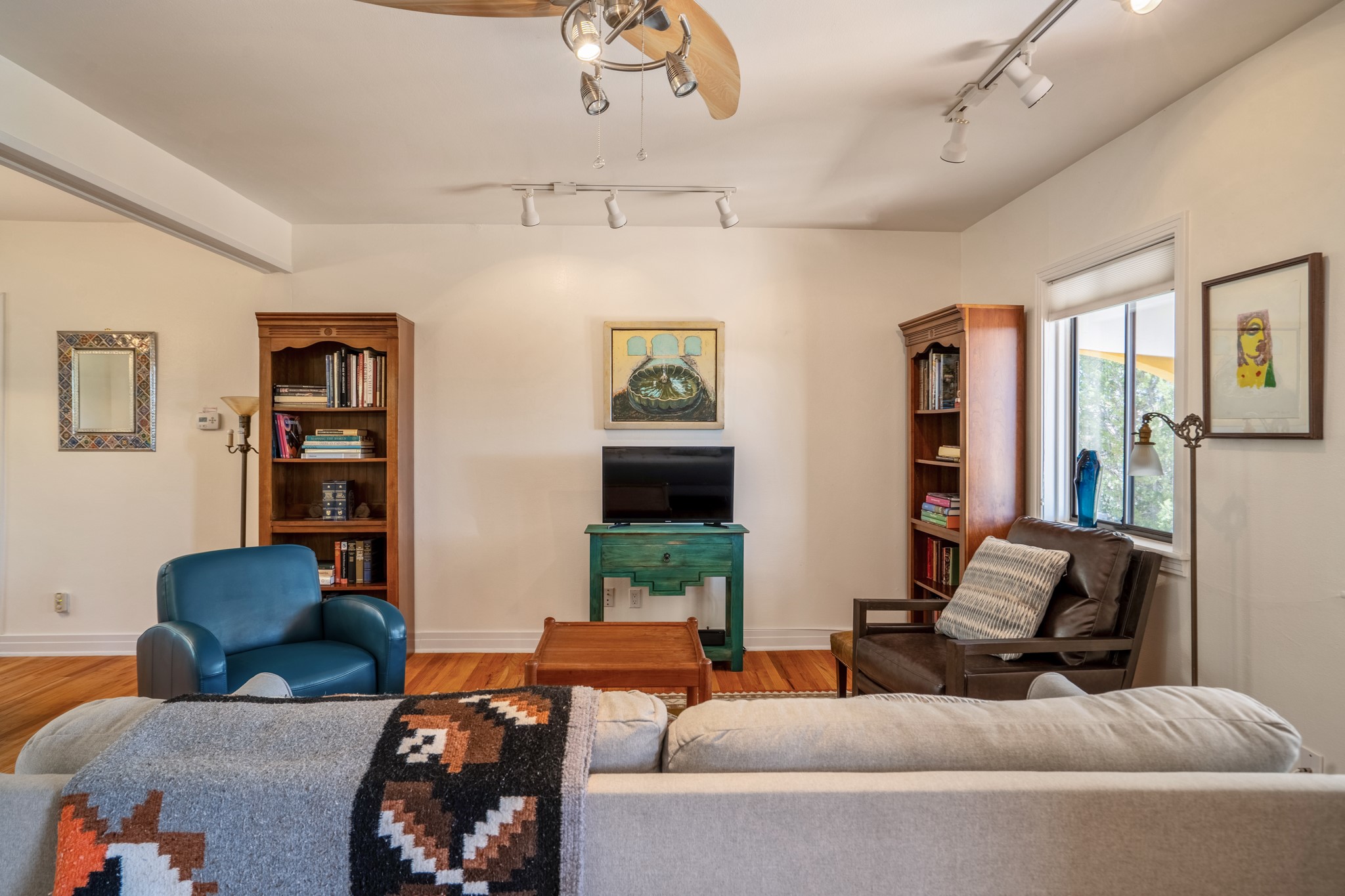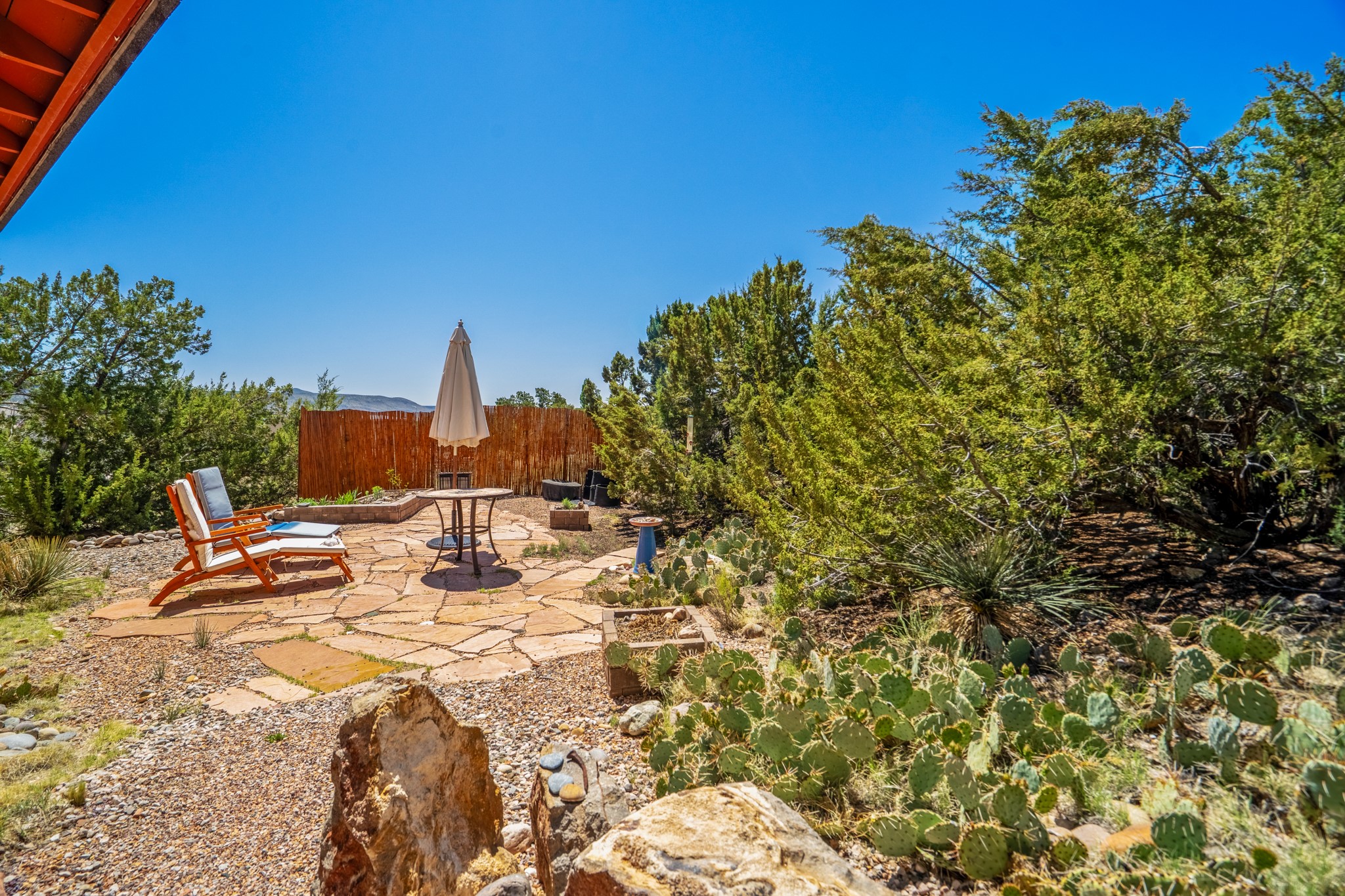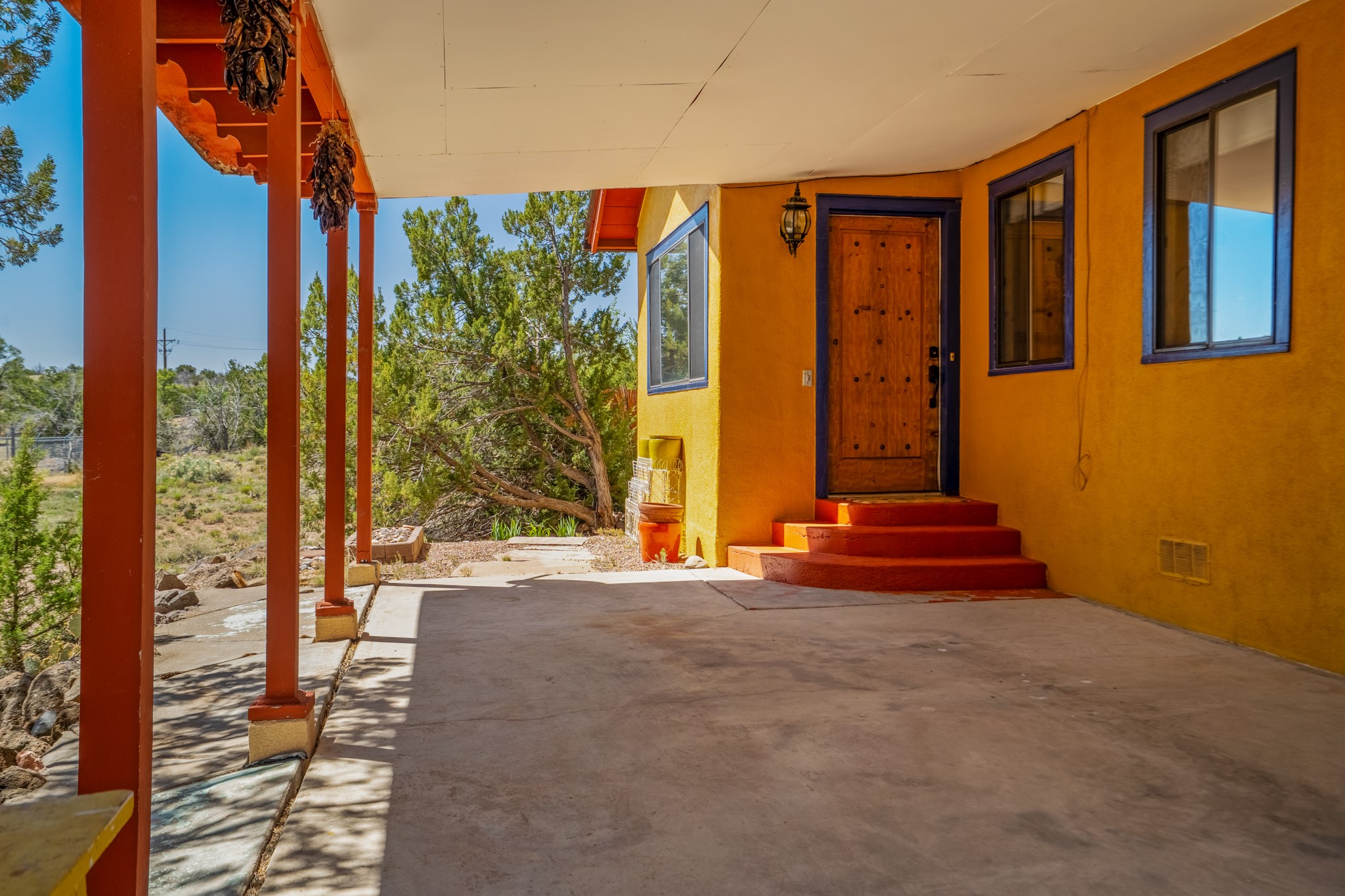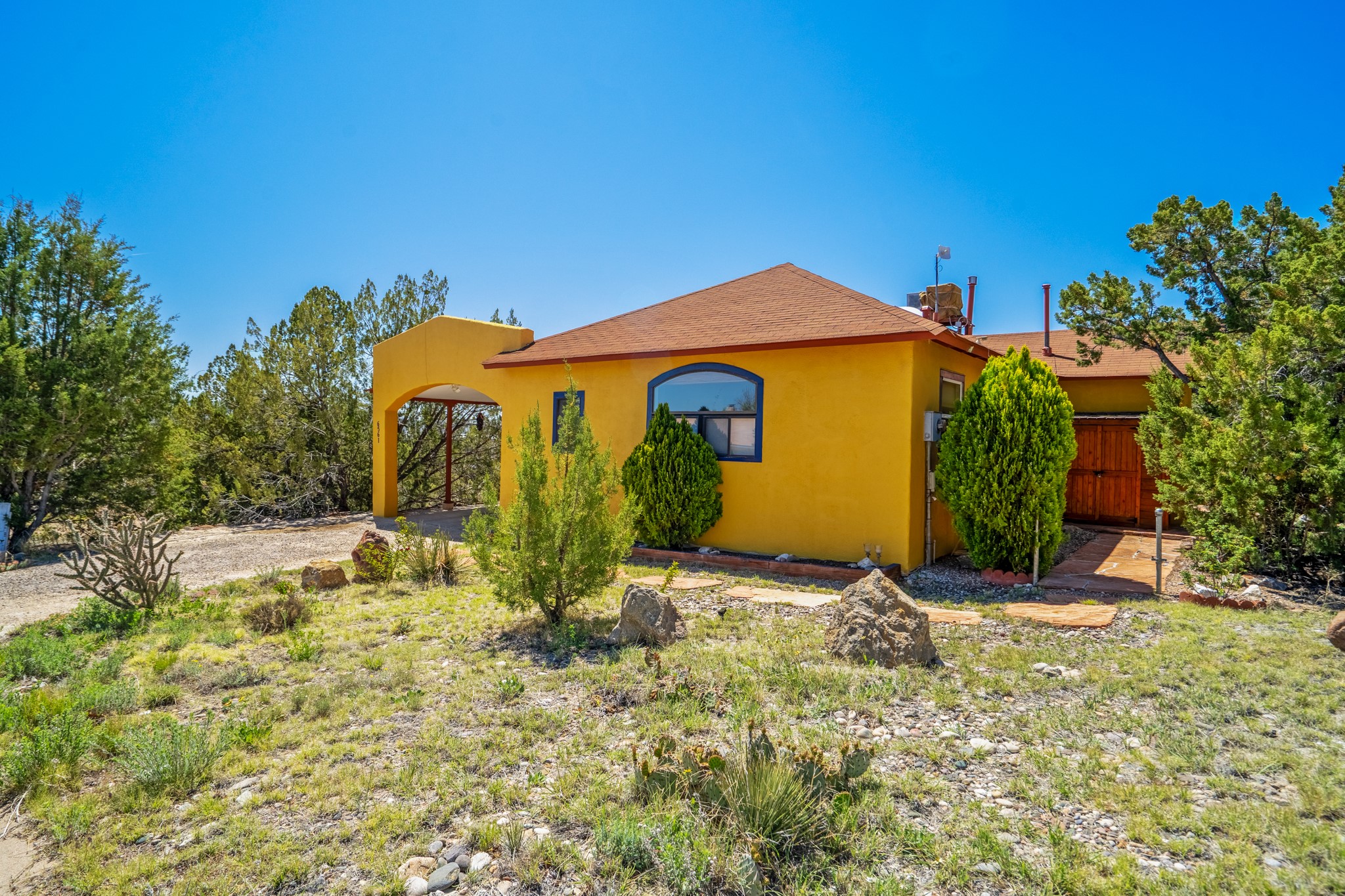 Nestled privately among Pinon and Juniper trees at Cochiti Lake, this well-maintained 3-bedroom, 2-bathroom home offers an inviting retreat. Step through the solid hardwood front door and discover real oak flooring flowing throughout most of the open floor plan, bathed in lots of natural light. Ceiling fans in every room ensure year-round comfort.The third bedroom is currently used as a versatile studio space and has its own bathroom, perfect for hobbies or a home office. Enjoy the convenience of a carport and an included storage shed. The landscaped back patio provides a peaceful outdoor oasis, with limited views of Tetilla Peak adding to the serene atmosphere. This cheery yellow home, with nearby lake access and golf, is an ideal sanctuary for those seeking a blend of comfort and nature. Schedule your showing today!