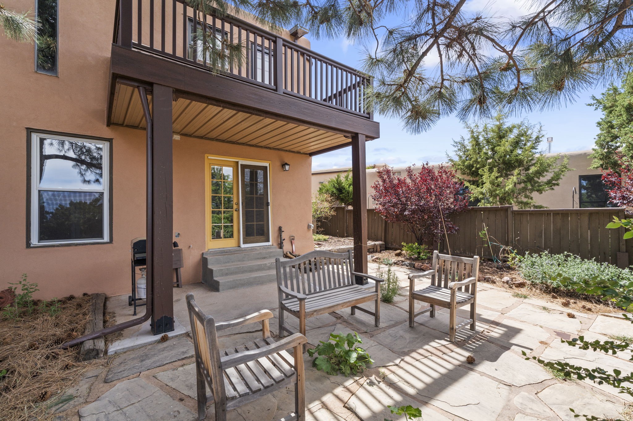 This stylish, freshly painted 3 bed, 2 bath tri-level home in the sought-after Park Plazas community blends Southwestern charm with modern updates.The spacious downstairs level invites you in with a tiled living room featuring striking two-story ceilings, interesting architectural detail and a dramatic Kiva fireplace--the perfect focal point for cozy gatherings. The open-concept dining area flows seamlessly into the well-appointed kitchen and provides direct access to a serene, shaded portal and flagstone patio, nestled beneath a majestic ponderosa pine. It's the ideal spot for al fresco dining or morning coffee, surrounded by the tranquility of a fully fenced backyard.This level also includes a bedroom, laundry area, and a convenient half bath, perfect for guests or multi-generational living.Upstairs, you'll find two generously sized bedrooms and a full bathroom with ample storage. The primary suite is a true retreat, opening to a sunny, recently rebuilt Trex deck--designed for low maintenance and long-lasting durability--where you can unwind while soaking in breathtaking sunset views of the Jemez and Sandia Mountains.With a newer roof (3 years old) and fresh stucco (2 years old), this home is move-in ready and built to last. A two-car garage adds practicality, while community amenities--including miles of walking trails, an off-leash dog park, tennis courts, a community garden, and more--elevate everyday living.Ideally located just minutes from shopping, dining, and all the cultural richness Santa Fe has to offer, this home is a rare find at a fantastic price. Don't miss your chance to own a slice of Southwestern paradise!