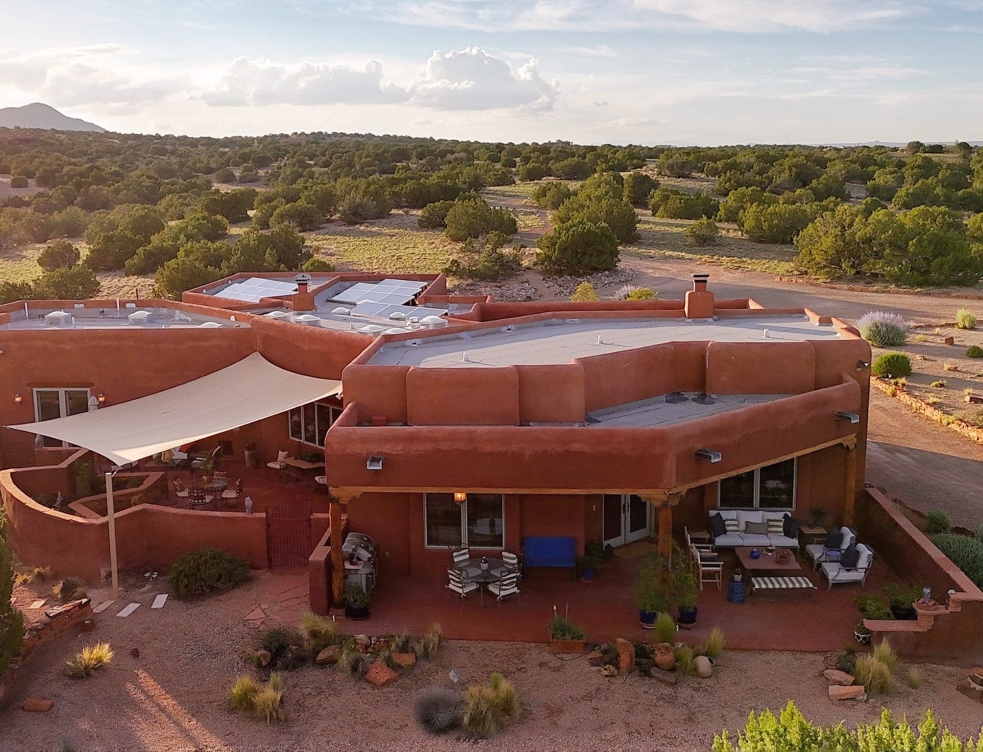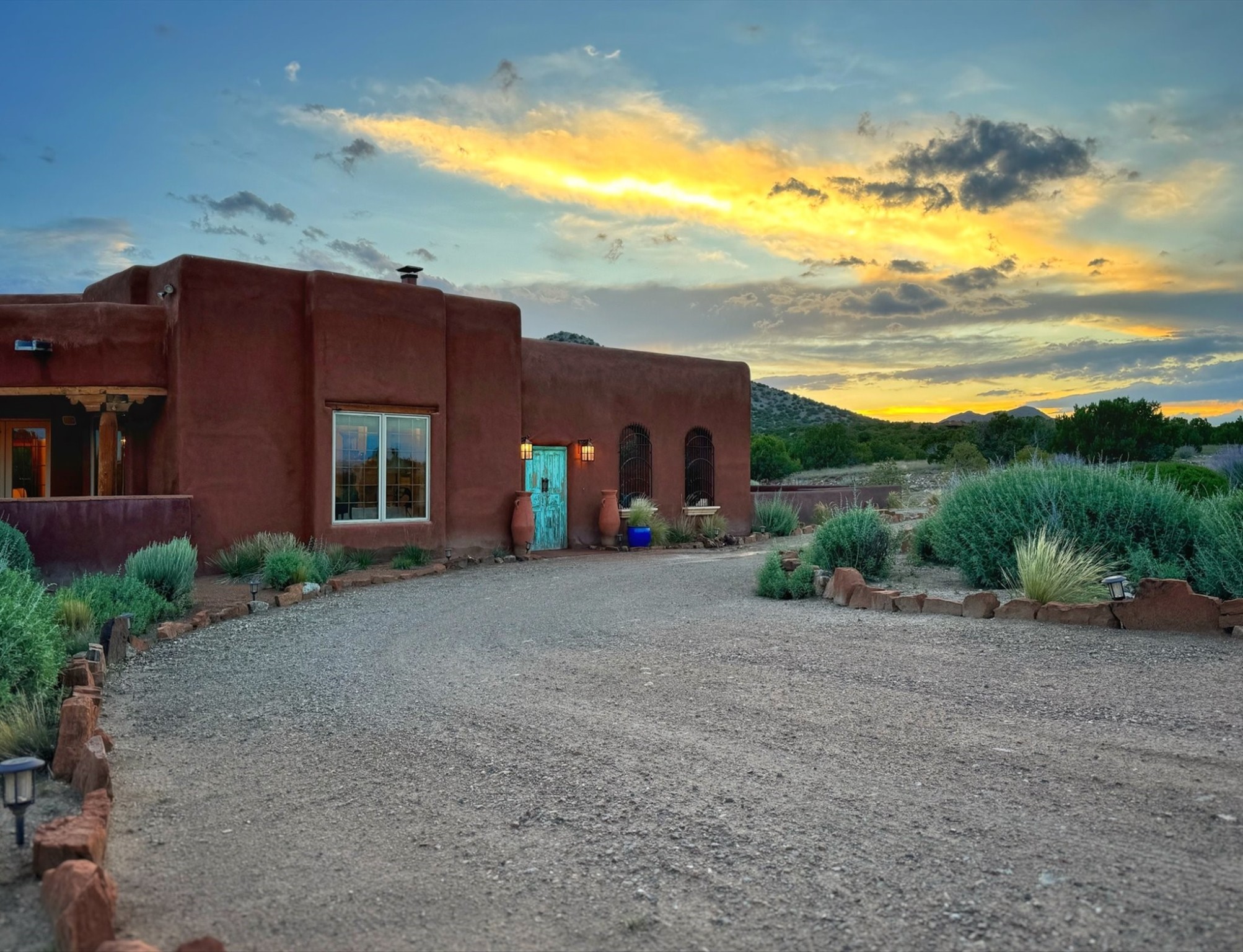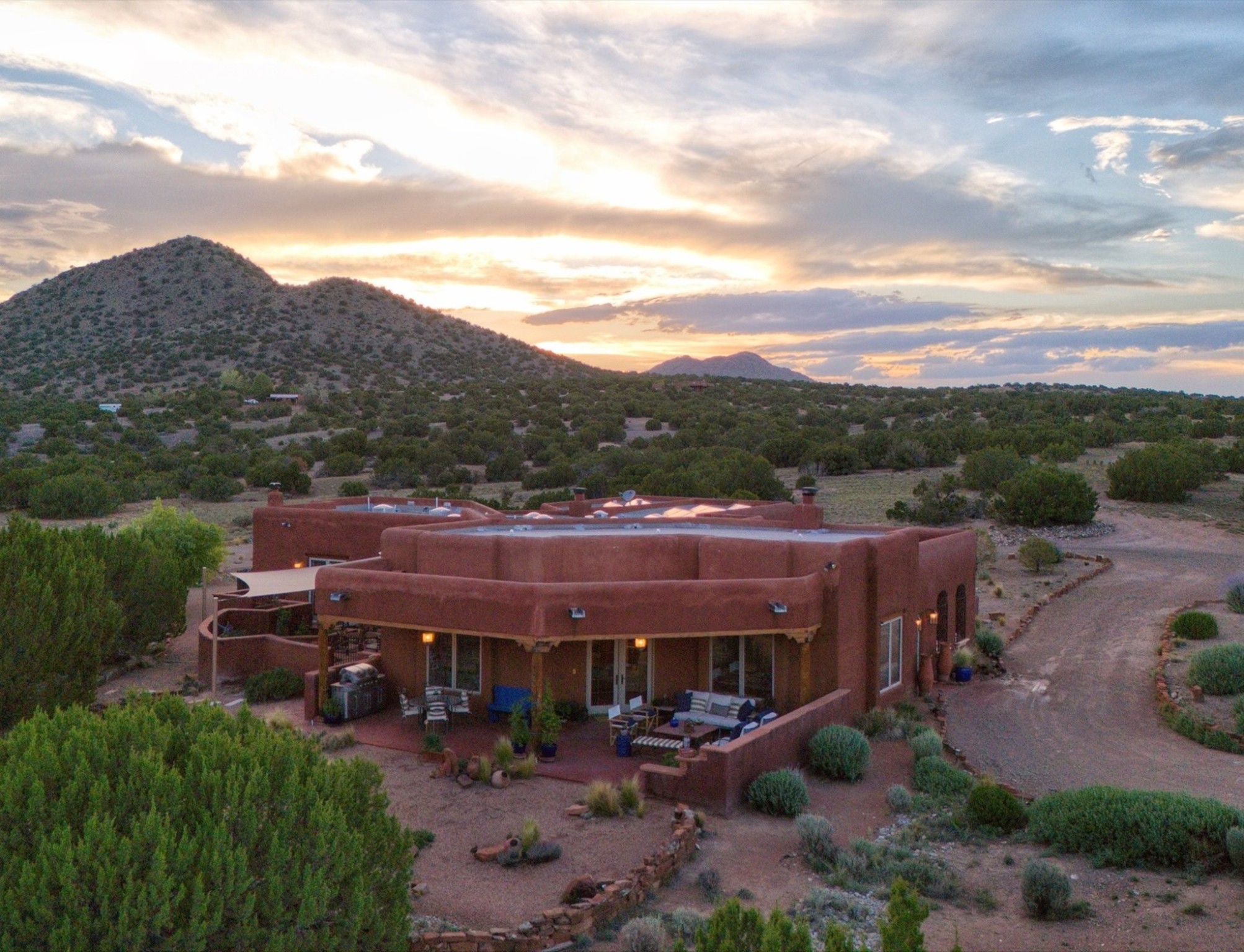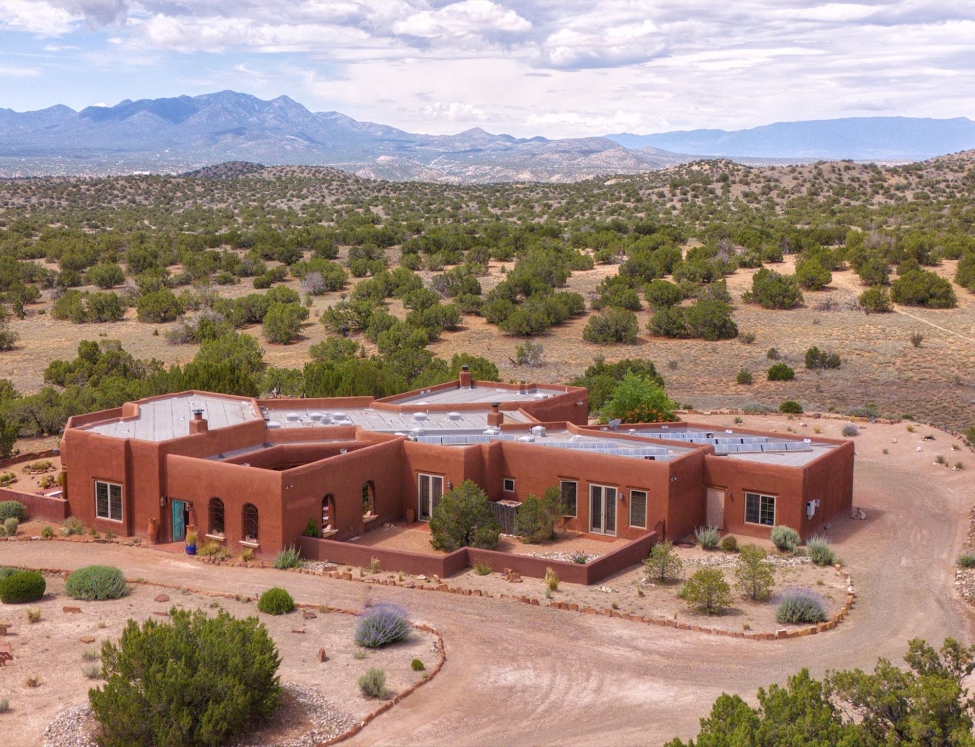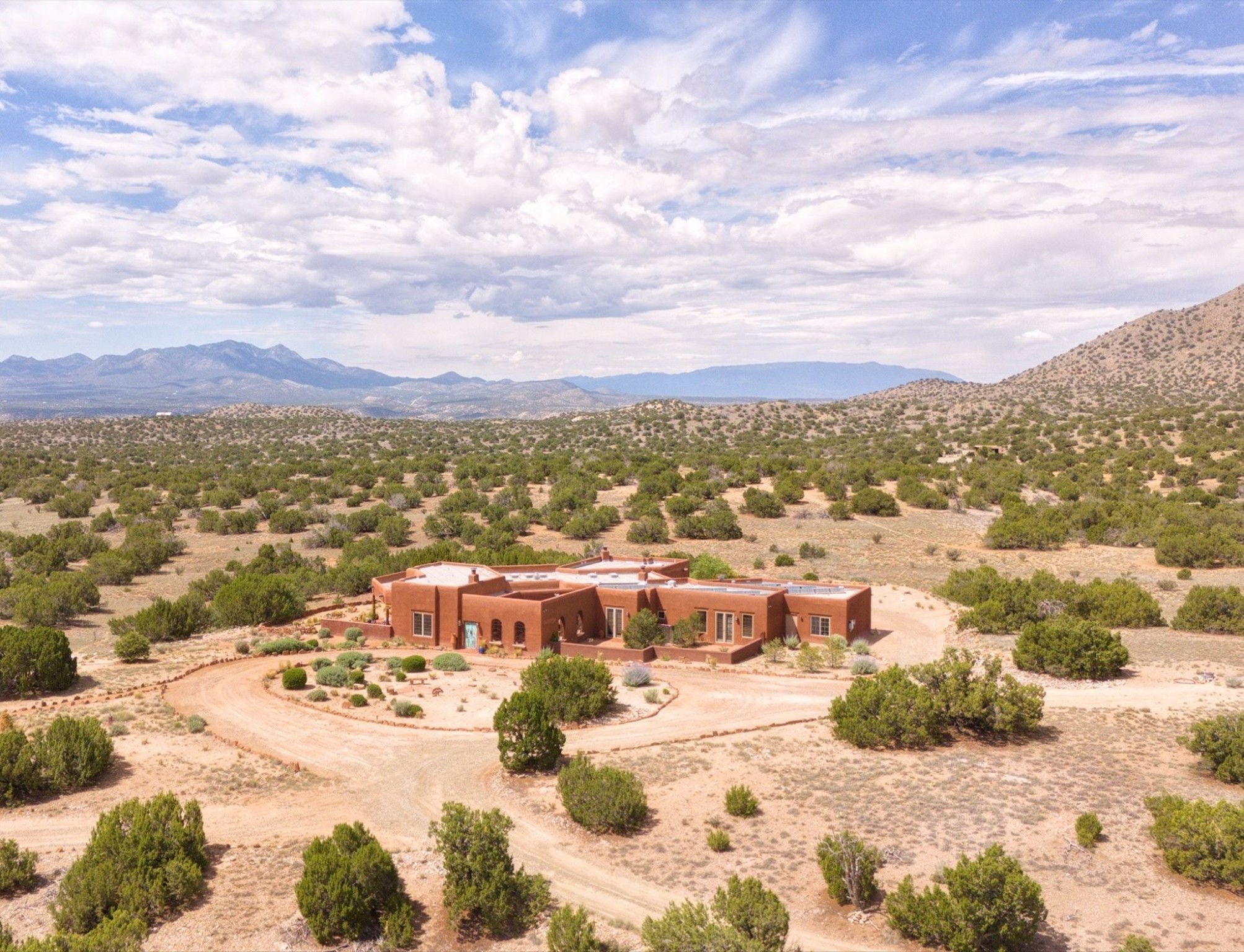 Luxurious single-level custom-built home in Silver Hills Ranch, just 20 mins from Santa Fe & 50 mins from Albuquerque International Sunport. Set on 14.37 acres adjacent to BLM and county open space, the property offers ample room to build equestrian facilities and accommodates up to 7 horses. The 3,360 sq ft main home--recently re-stuccoed--is paired with an 820 sq ft adobe casita--both enjoying 360 panoramic views of the Galisteo Basin, Cerrillos Hills, Sangre de Cristo, Sandia & Ortiz Mountains. The main home features 3 bedrooms, office/library, & 3 bathrooms (2 full, 1- 3/4), and welcomes you through a spacious courtyard with antique mesquite doors. Inside, the foyer features an exposed brick accent wall that adds character and warmth. The great room boasts soaring ceilings with wood beams & tongue-and-groove planks. A chef's kitchen offers Viking Pro appliances, alder cabinetry, honed granite & slate countertops, dual islands, custom hood, & two sinks (granite farm & copper). The primary suite includes a spacious walk-in closet and a luxurious full bathroom with dual marble sinks. Additional features include a library/flex room, media room, & 3 wood-burning fireplaces w/gas starters. Elegant finishes include herringbone brick & fossilized stone floors, hand-troweled plaster walls & Pella Architect Series windows. Seven sets of elegant 8-foot Pella French doors open effortlessly to five serene patios and courtyards, providing expansive outdoor living spaces perfect for entertaining, relaxing, and enjoying breathtaking panoramic views. Modern comforts: central A/C, in-floor radiant & forced-air heating, built-in fridge & whole-home stereo. Eco-friendly features include 24 solar panels, 500-gal propane tank, & 3 rainwater-harvesting cisterns. The casita offers stylish modern finishes & a bath--ideal for guests. Located in a desirable neighborhood w/low HOA fees & sensible CC&Rs. A rare blend of luxury, functionality & sustainability in an unmatched natural setting.