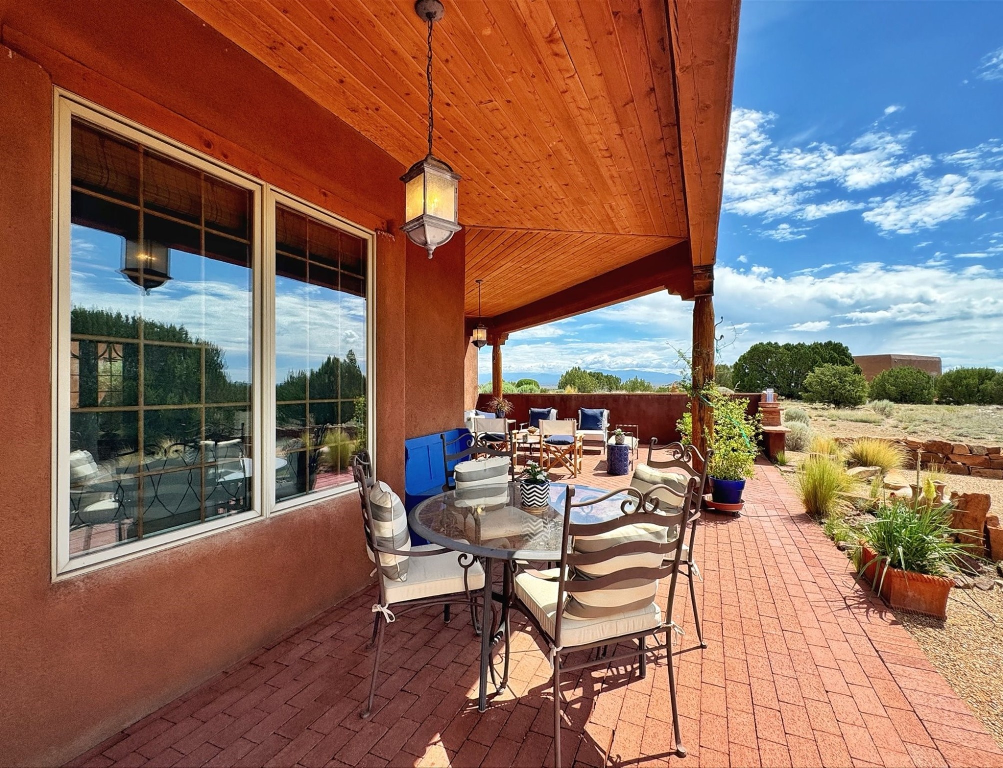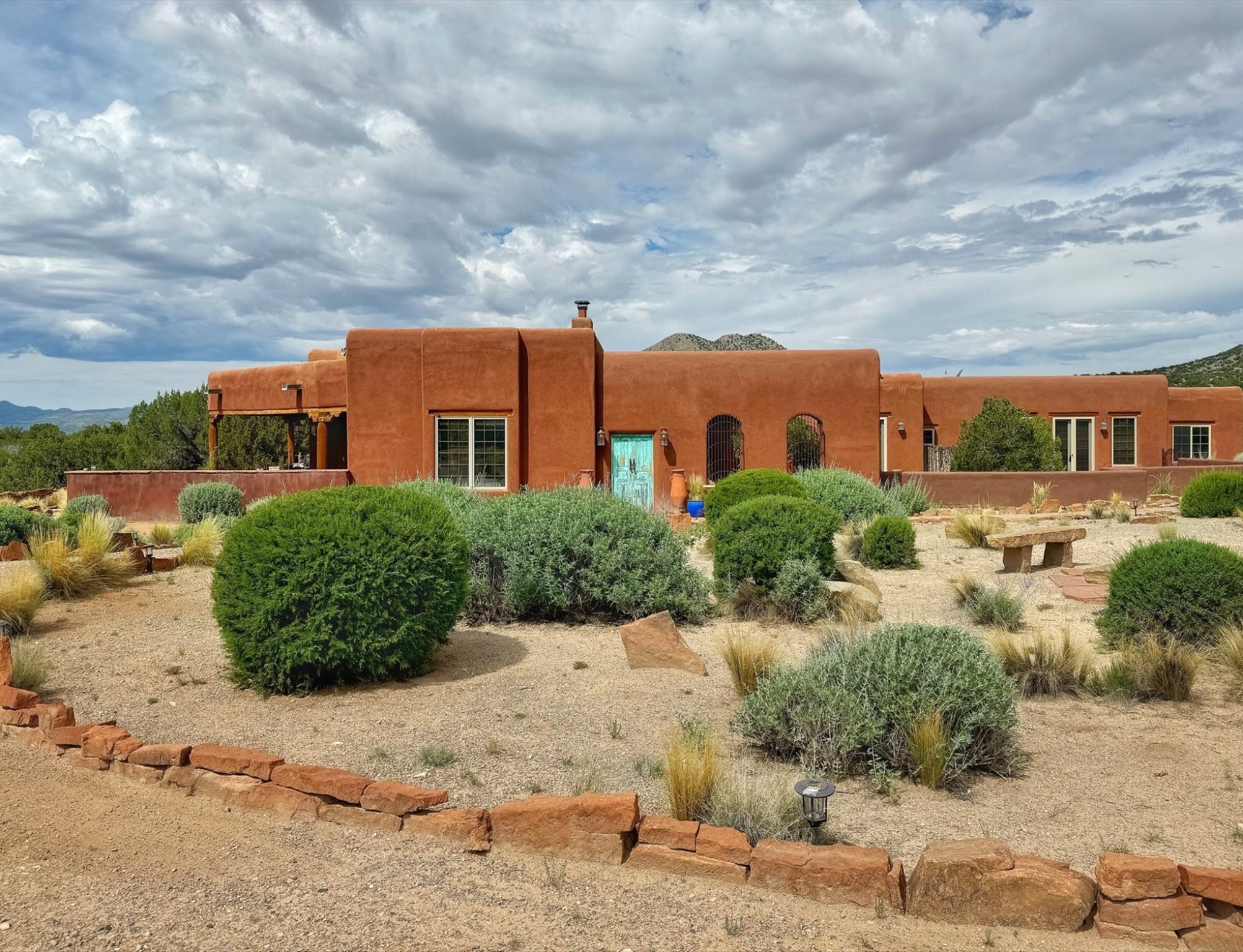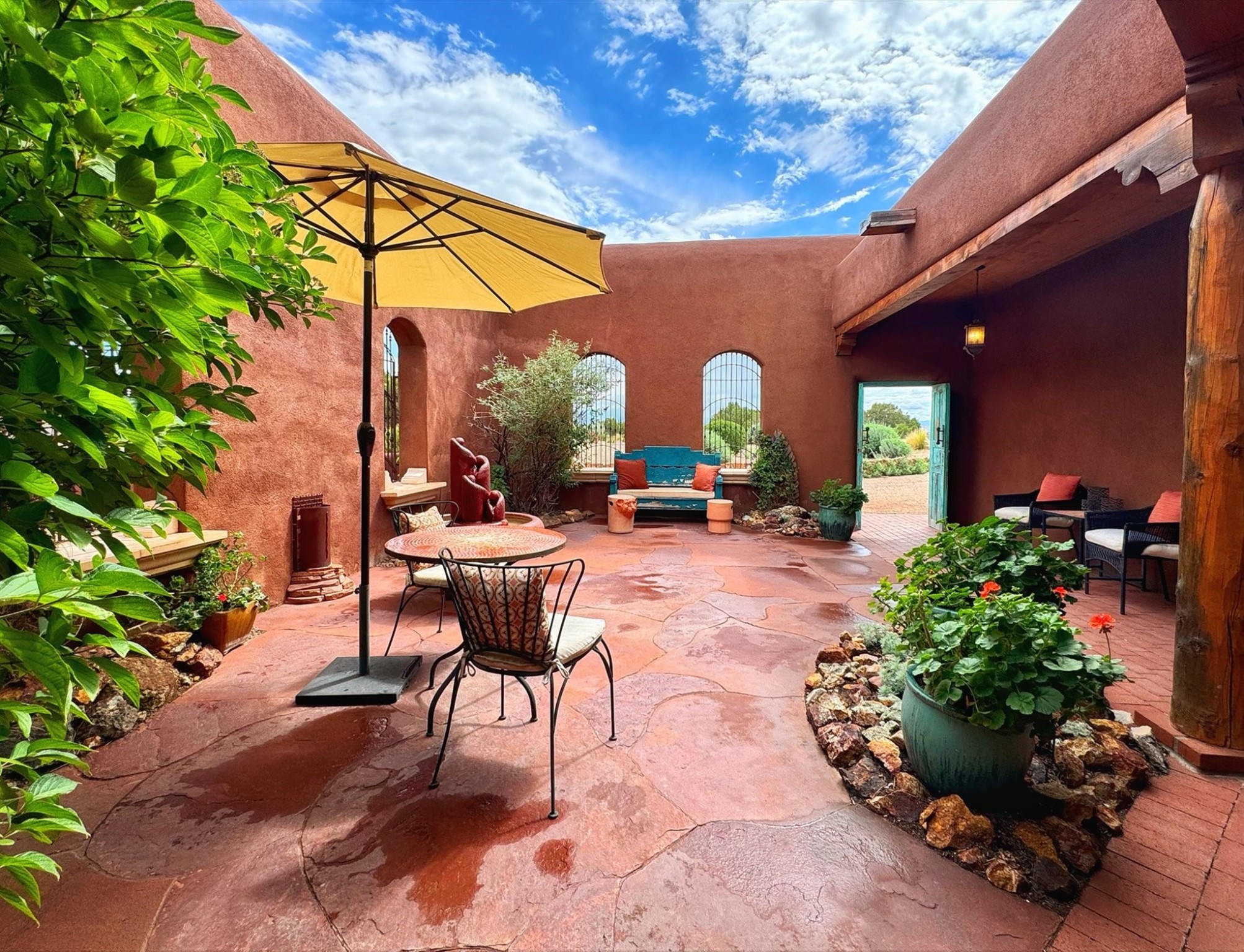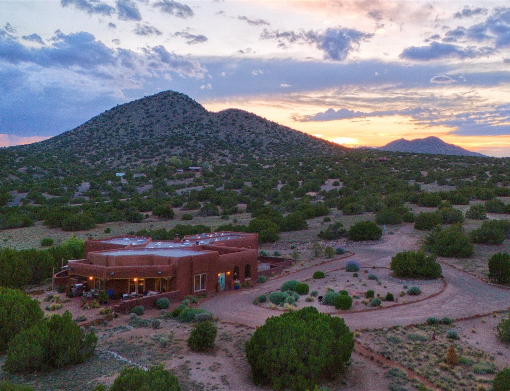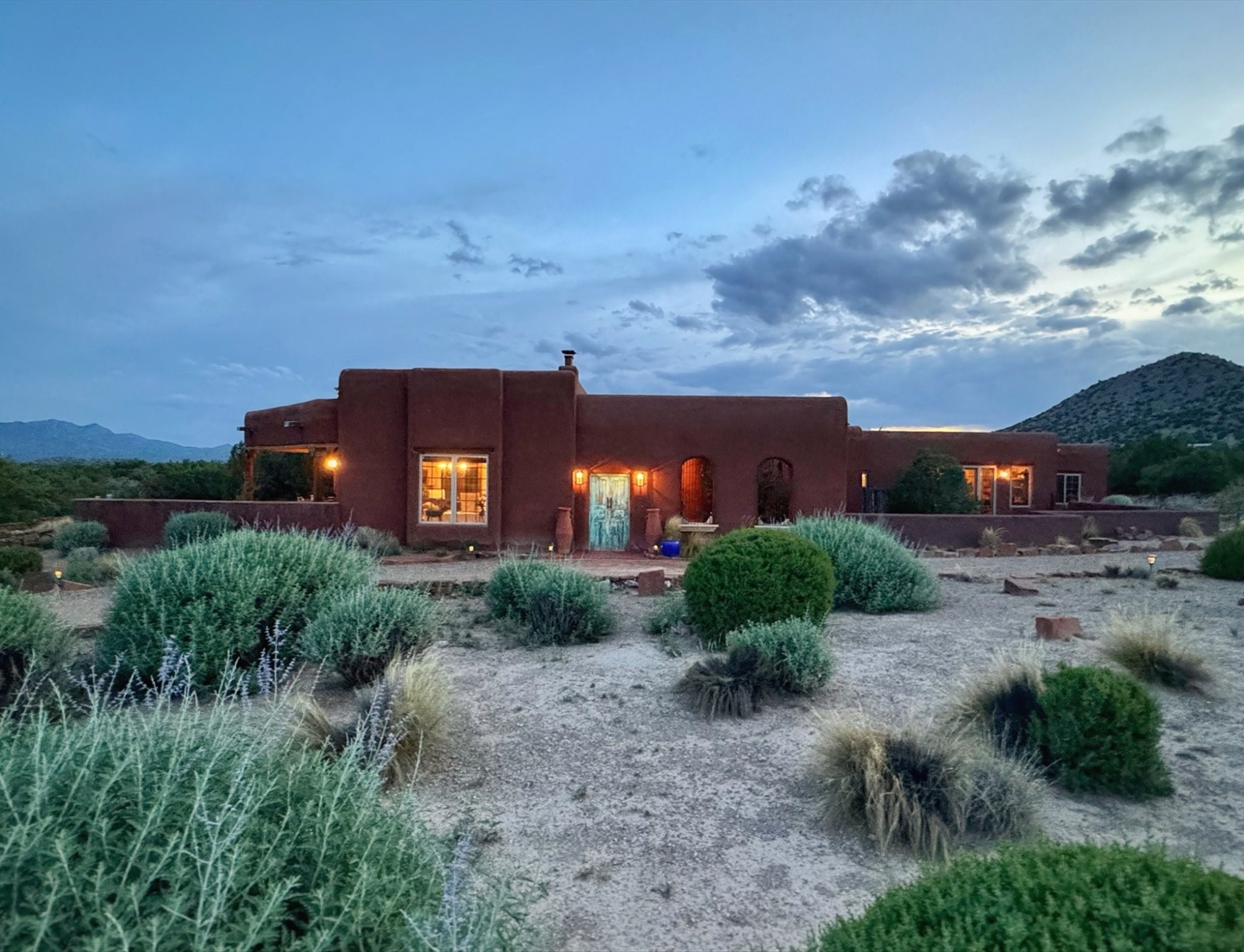 Luxurious single-level custom-built home in Silver Hills Ranch, just 20 mins from Santa Fe & 50 mins from Albuquerque International Sunport. Set on 14.37 acres adjacent to BLM and county open space, the property offers ample room to build equestrian facilities and accommodates up to 7 horses. The 3,360 sq ft main home--recently re-stuccoed--is paired with an 820 sq ft adobe casita--both enjoying 360 panoramic views of the Galisteo Basin, Cerrillos Hills, Sangre de Cristo, Sandia & Ortiz Mountains. The main home features 3 bedrooms, office/library, & 3 bathrooms (2 full, 1- 3/4), and welcomes you through a spacious courtyard with antique mesquite doors. Inside, the foyer features an exposed brick accent wall that adds character and warmth. The great room boasts soaring ceilings with wood beams & tongue-and-groove planks. A chef's kitchen offers Viking Pro appliances, alder cabinetry, honed granite & slate countertops, dual islands, custom hood, & two sinks (granite farm & copper). The primary suite includes a spacious walk-in closet and a luxurious full bathroom with dual marble sinks. Additional features include a library/flex room, media room, & 3 wood-burning fireplaces w/gas starters. Elegant finishes include herringbone brick & fossilized stone floors, hand-troweled plaster walls & Pella Architect Series windows. Seven sets of elegant 8-foot Pella French doors open effortlessly to five serene patios and courtyards, providing expansive outdoor living spaces perfect for entertaining, relaxing, and enjoying breathtaking panoramic views. Modern comforts: central A/C, in-floor radiant & forced-air heating, built-in fridge & whole-home stereo. Eco-friendly features include 24 solar panels, 500-gal propane tank, & 3 rainwater-harvesting cisterns. The casita offers stylish modern finishes & a bath--ideal for guests. Located in a desirable neighborhood w/low HOA fees & sensible CC&Rs. A rare blend of luxury, functionality & sustainability in an unmatched natural setting.
