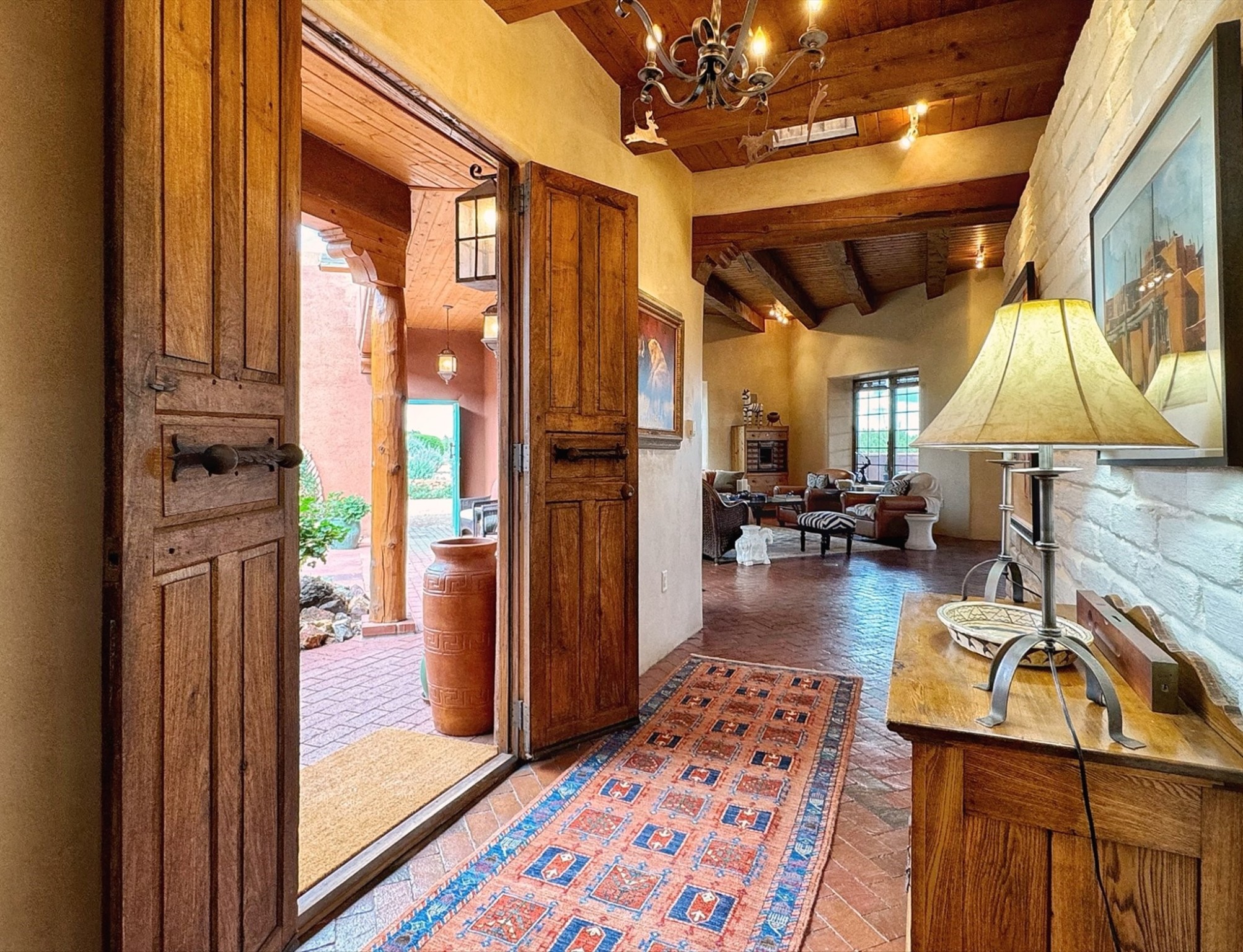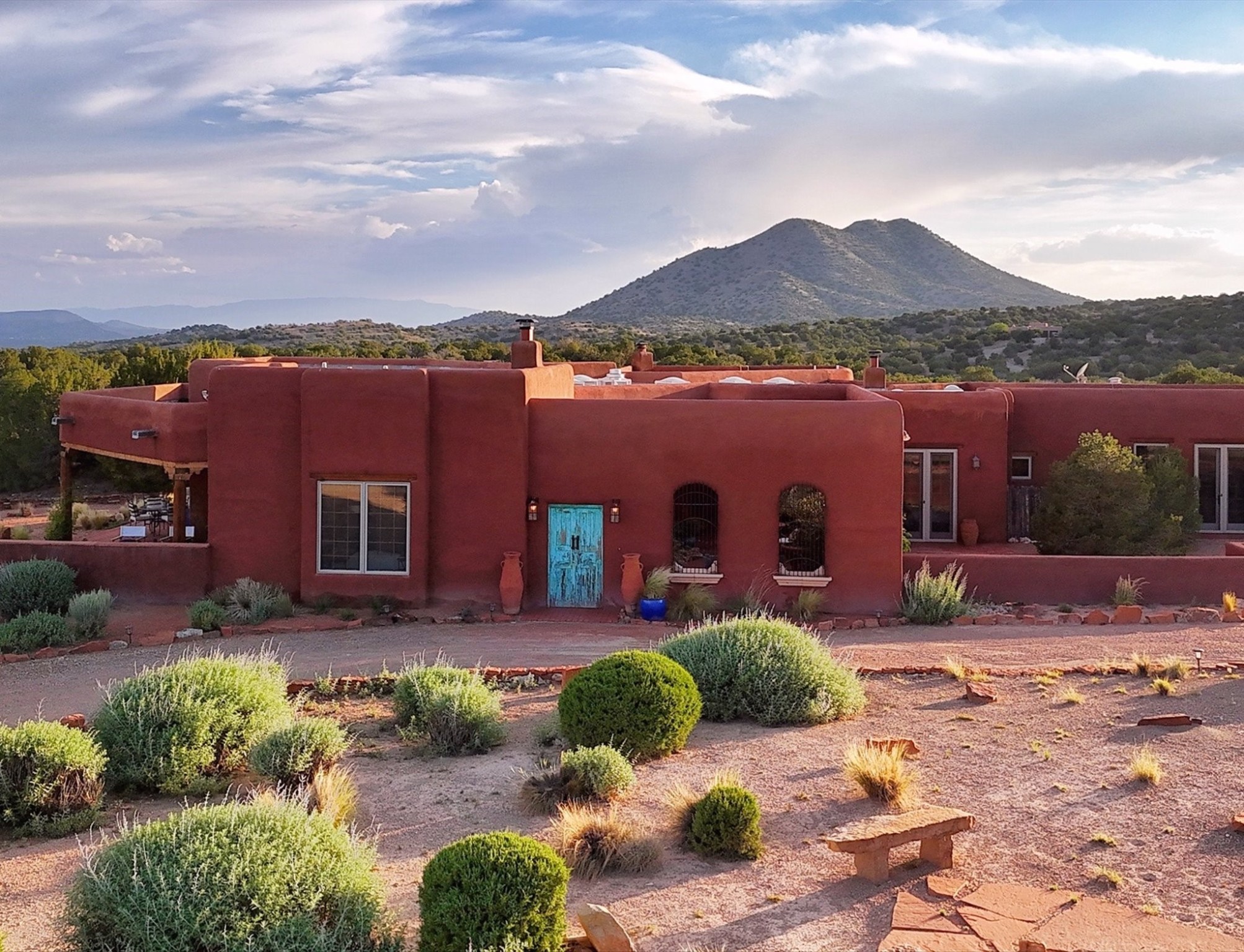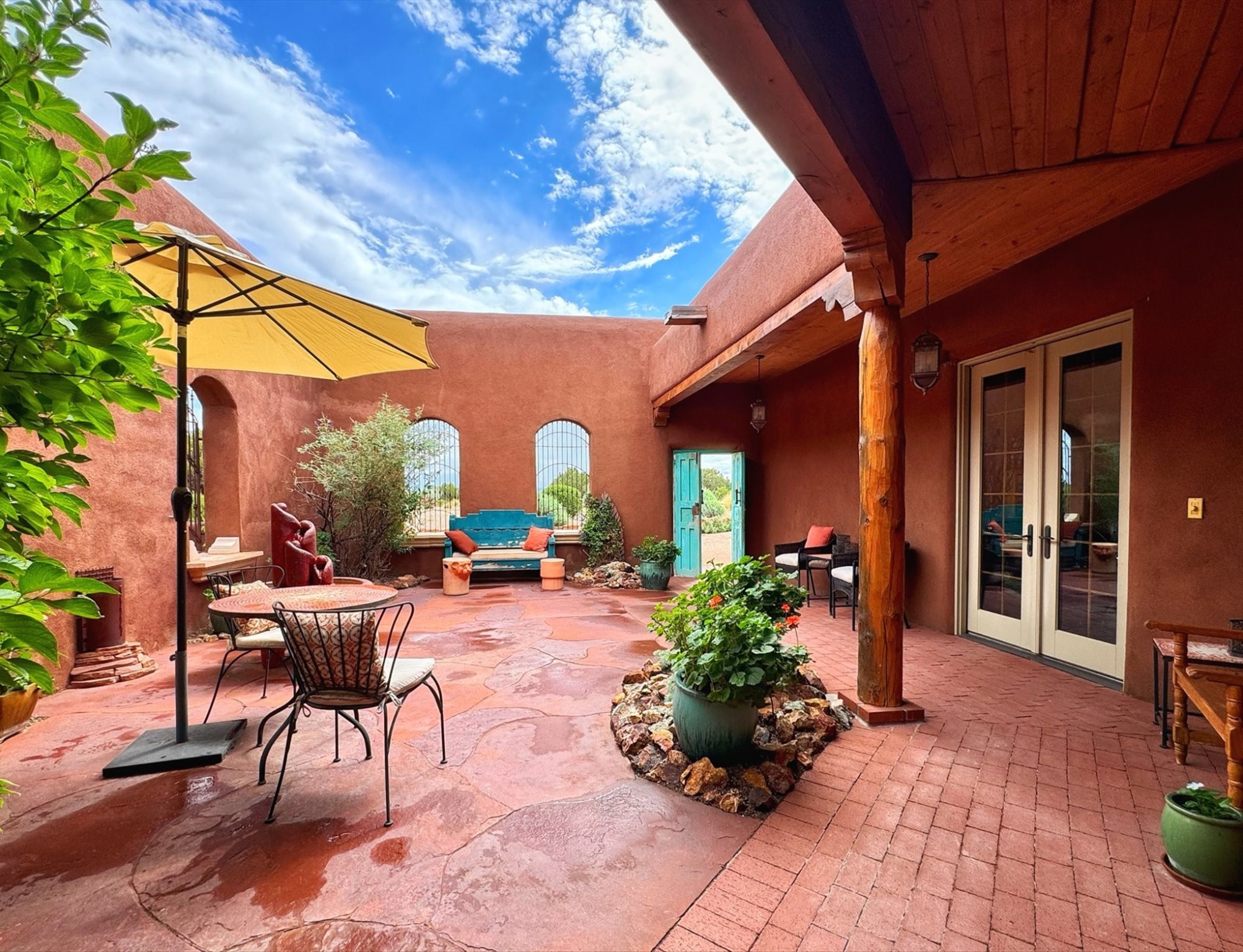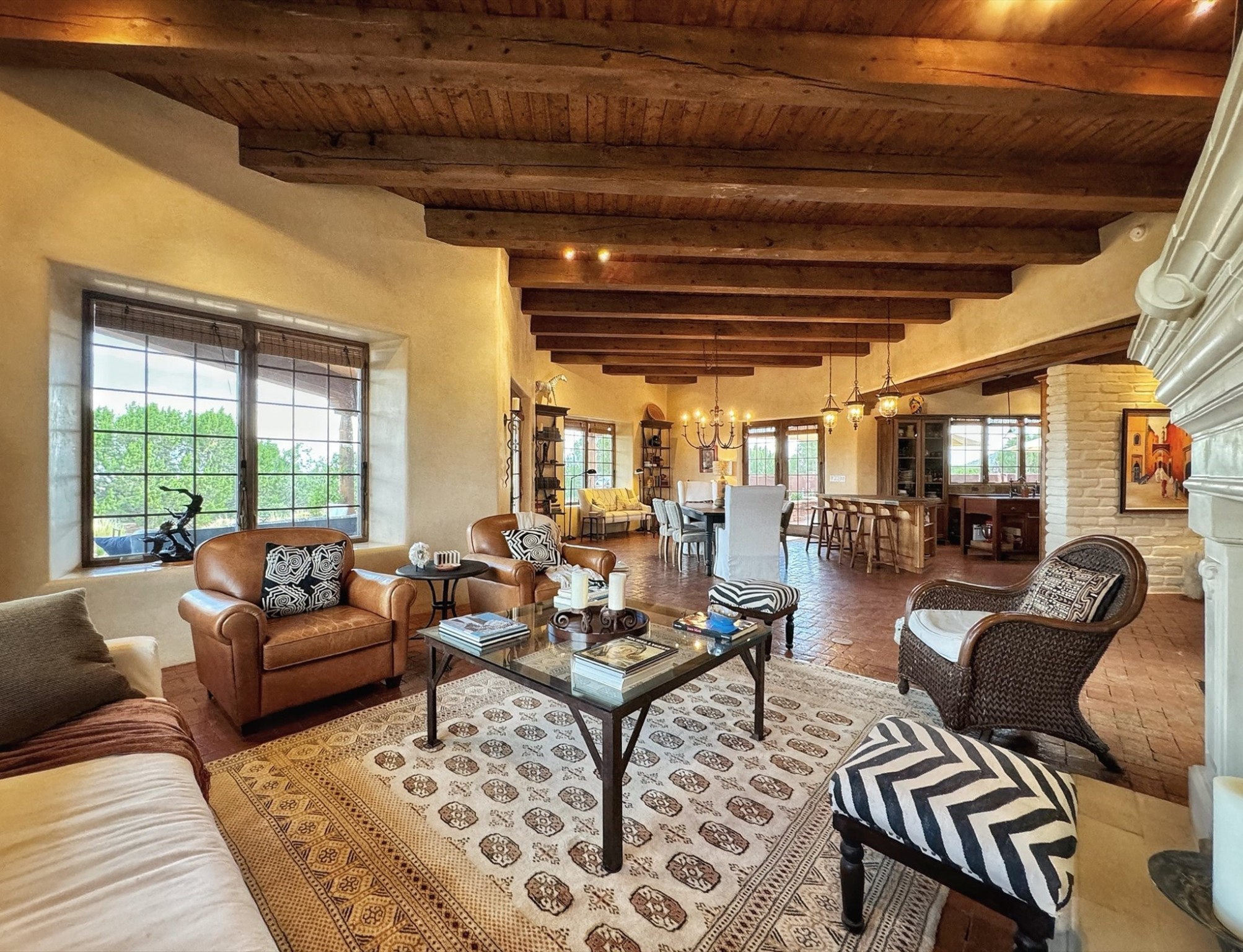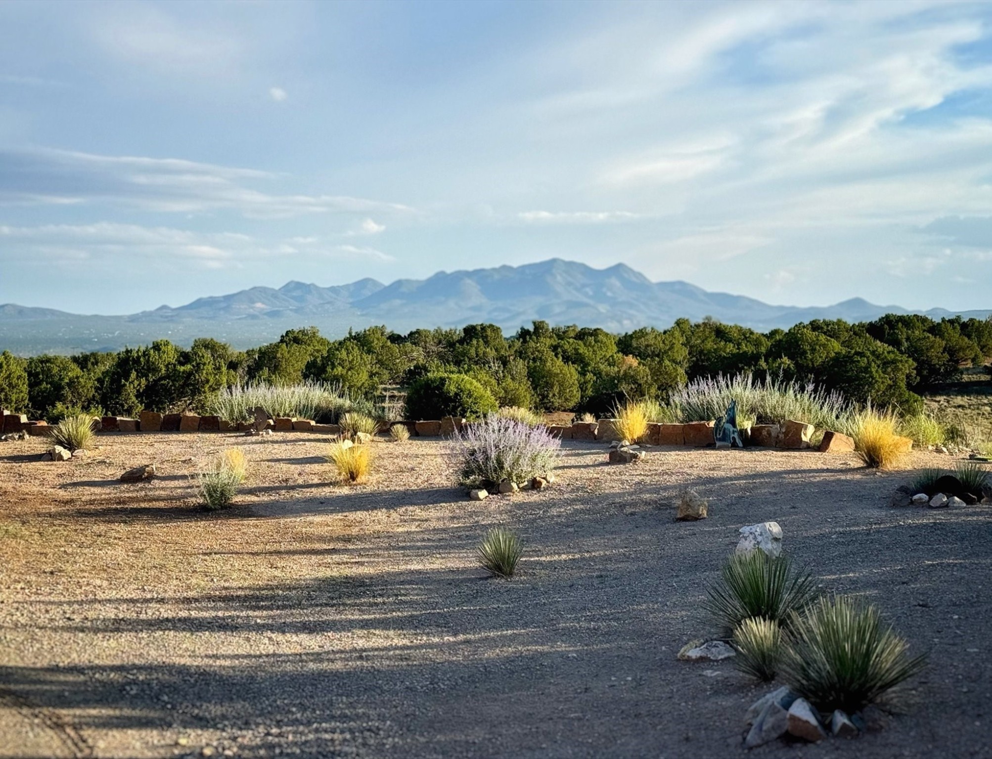 Luxurious single-level custom-built home in Silver Hills Ranch, just 20 mins from Santa Fe & 50 mins from Albuquerque International Sunport. Set on 14.37 acres adjacent to BLM and county open space, the property offers ample room to build equestrian facilities and accommodates up to 7 horses. The 3,360 sq ft main home--recently re-stuccoed--is paired with an 820 sq ft adobe casita--both enjoying 360 panoramic views of the Galisteo Basin, Cerrillos Hills, Sangre de Cristo, Sandia & Ortiz Mountains. The main home features 3 bedrooms, office/library, & 3 bathrooms (2 full, 1- 3/4), and welcomes you through a spacious courtyard with antique mesquite doors. Inside, the foyer features an exposed brick accent wall that adds character and warmth. The great room boasts soaring ceilings with wood beams & tongue-and-groove planks. A chef's kitchen offers Viking Pro appliances, alder cabinetry, honed granite & slate countertops, dual islands, custom hood, & two sinks (granite farm & copper). The primary suite includes a spacious walk-in closet and a luxurious full bathroom with dual marble sinks. Additional features include a library/flex room, media room, & 3 wood-burning fireplaces w/gas starters. Elegant finishes include herringbone brick & fossilized stone floors, hand-troweled plaster walls & Pella Architect Series windows. Seven sets of elegant 8-foot Pella French doors open effortlessly to five serene patios and courtyards, providing expansive outdoor living spaces perfect for entertaining, relaxing, and enjoying breathtaking panoramic views. Modern comforts: central A/C, in-floor radiant & forced-air heating, built-in fridge & whole-home stereo. Eco-friendly features include 24 solar panels, 500-gal propane tank, & 3 rainwater-harvesting cisterns. The casita offers stylish modern finishes & a bath--ideal for guests. Located in a desirable neighborhood w/low HOA fees & sensible CC&Rs. A rare blend of luxury, functionality & sustainability in an unmatched natural setting.