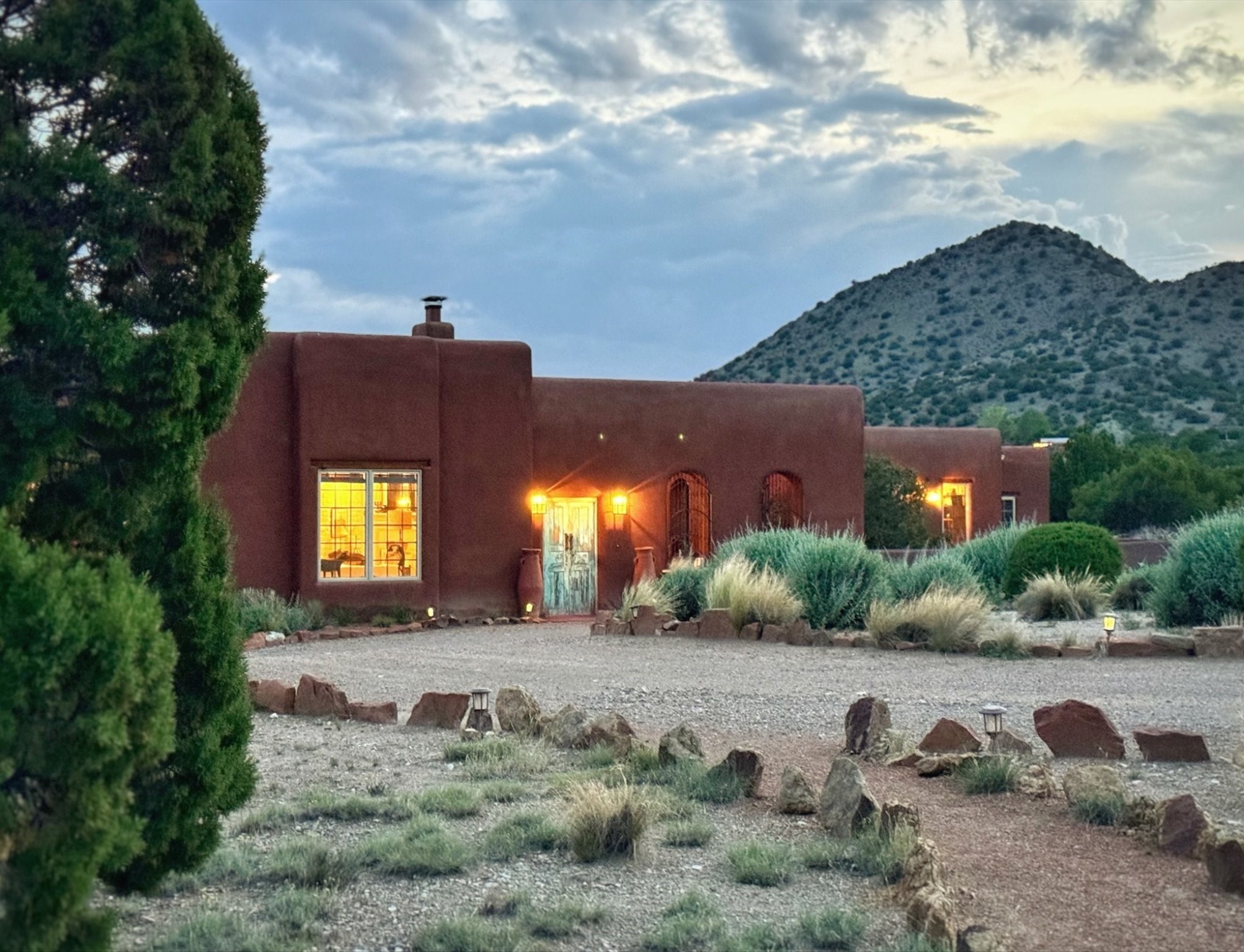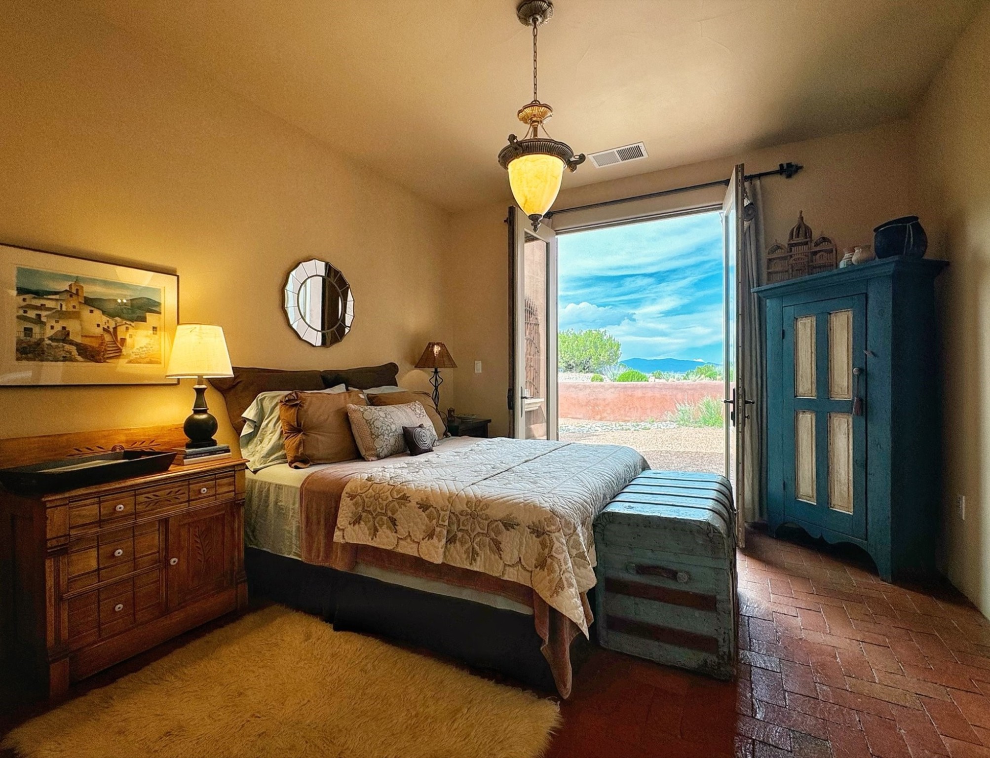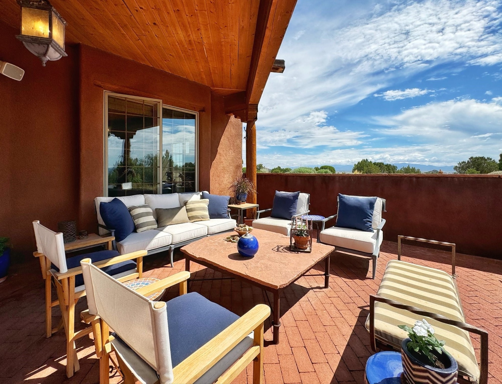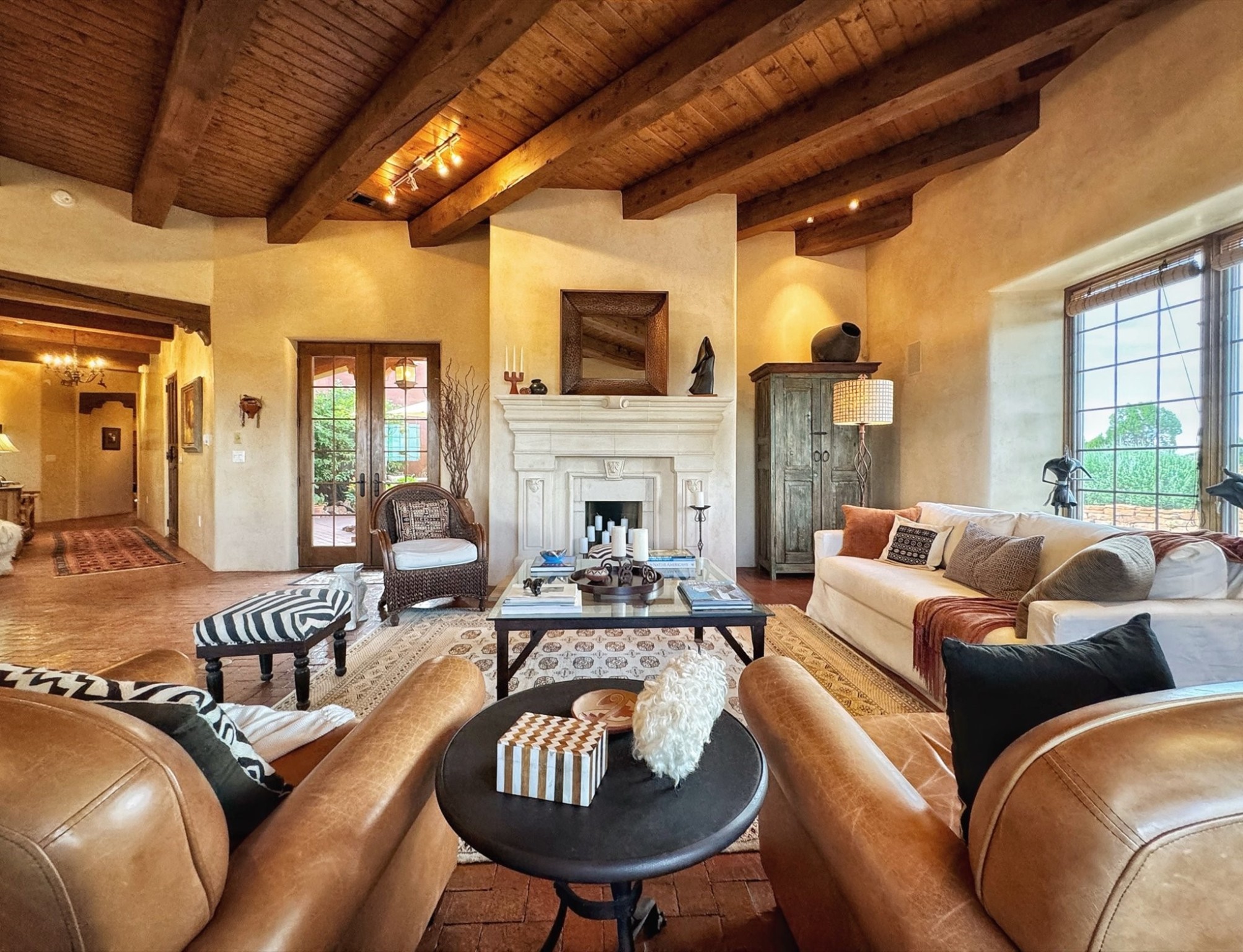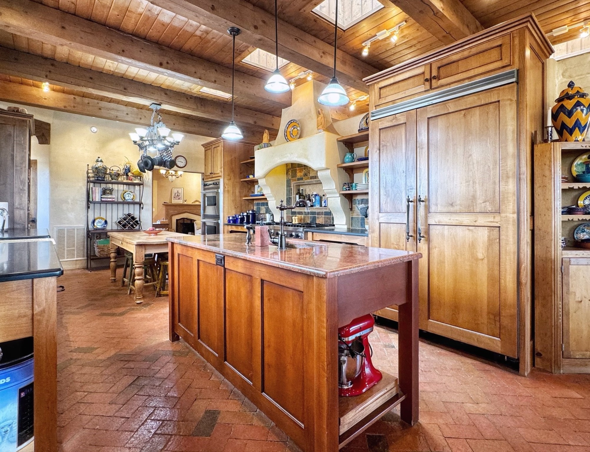 Luxurious single-level custom-built home in Silver Hills Ranch, just 20 mins from Santa Fe & 50 mins from Albuquerque International Sunport. Set on 14.37 acres adjacent to BLM and county open space, the property offers ample room to build equestrian facilities and accommodates up to 7 horses. The 3,360 sq ft main home--recently re-stuccoed--is paired with an 820 sq ft adobe casita--both enjoying 360 panoramic views of the Galisteo Basin, Cerrillos Hills, Sangre de Cristo, Sandia & Ortiz Mountains. The main home features 3 bedrooms, office/library, & 3 bathrooms (2 full, 1- 3/4), and welcomes you through a spacious courtyard with antique mesquite doors. Inside, the foyer features an exposed brick accent wall that adds character and warmth. The great room boasts soaring ceilings with wood beams & tongue-and-groove planks. A chef's kitchen offers Viking Pro appliances, alder cabinetry, honed granite & slate countertops, dual islands, custom hood, & two sinks (granite farm & copper). The primary suite includes a spacious walk-in closet and a luxurious full bathroom with dual marble sinks. Additional features include a library/flex room, media room, & 3 wood-burning fireplaces w/gas starters. Elegant finishes include herringbone brick & fossilized stone floors, hand-troweled plaster walls & Pella Architect Series windows. Seven sets of elegant 8-foot Pella French doors open effortlessly to five serene patios and courtyards, providing expansive outdoor living spaces perfect for entertaining, relaxing, and enjoying breathtaking panoramic views. Modern comforts: central A/C, in-floor radiant & forced-air heating, built-in fridge & whole-home stereo. Eco-friendly features include 24 solar panels, 500-gal propane tank, & 3 rainwater-harvesting cisterns. The casita offers stylish modern finishes & a bath--ideal for guests. Located in a desirable neighborhood w/low HOA fees & sensible CC&Rs. A rare blend of luxury, functionality & sustainability in an unmatched natural setting.