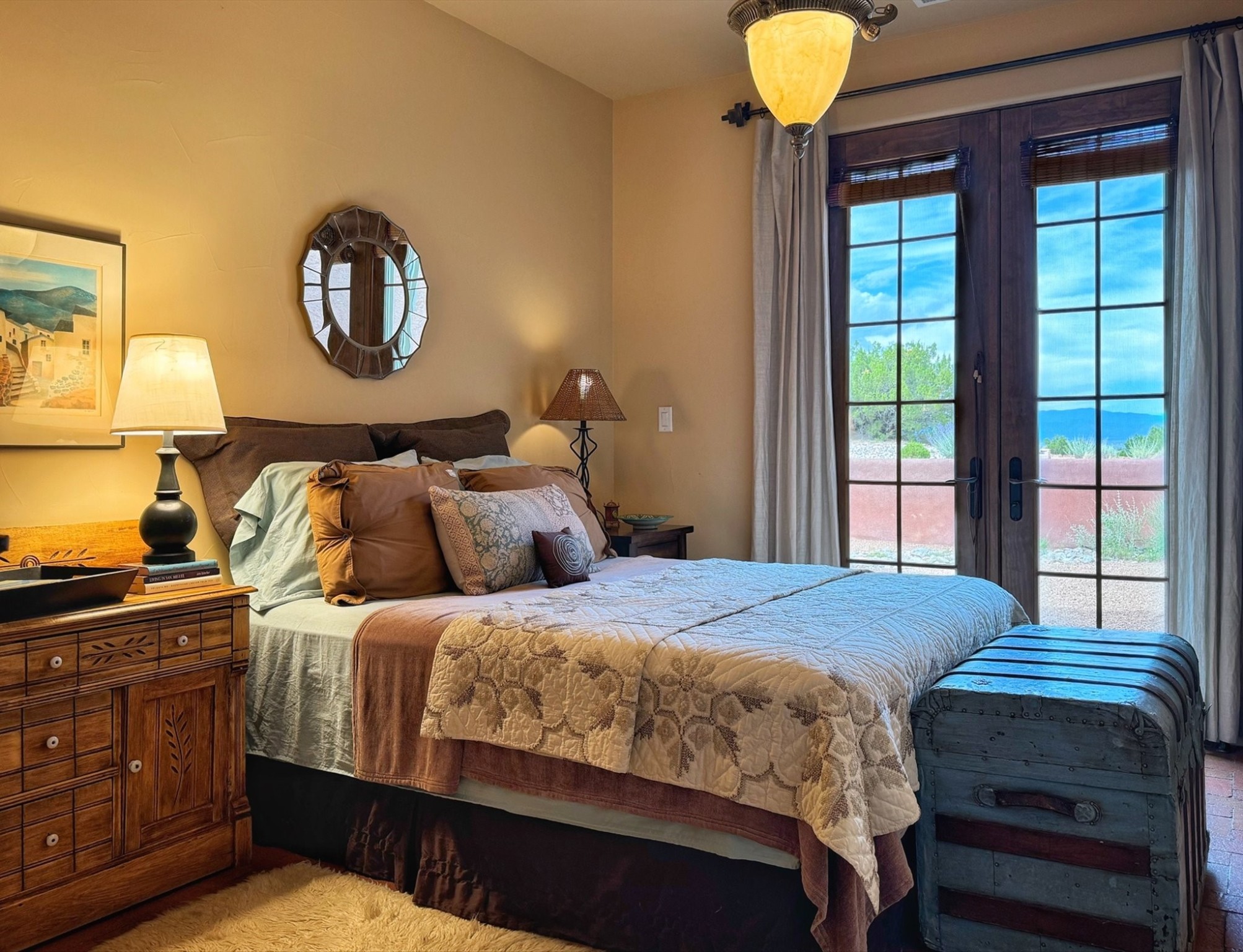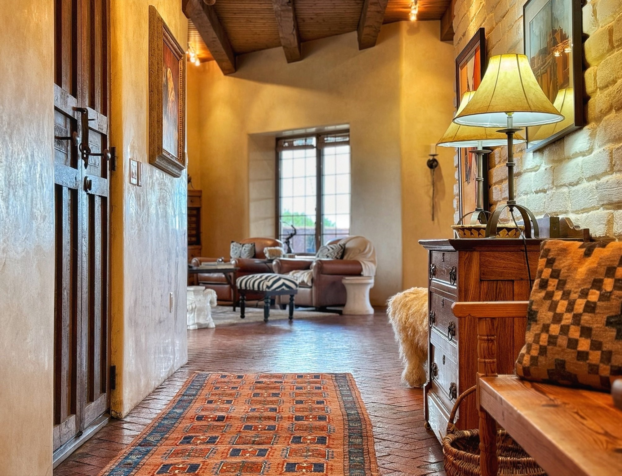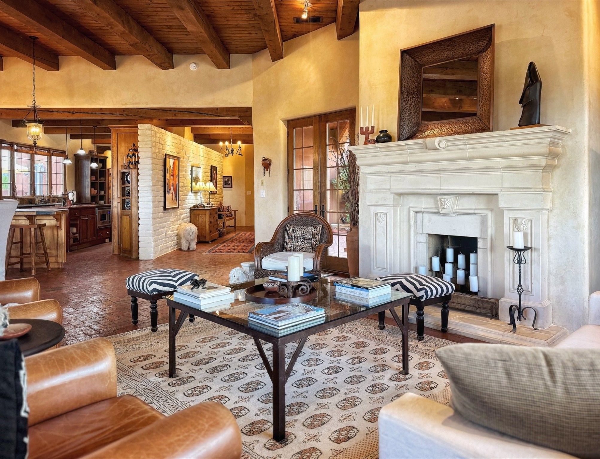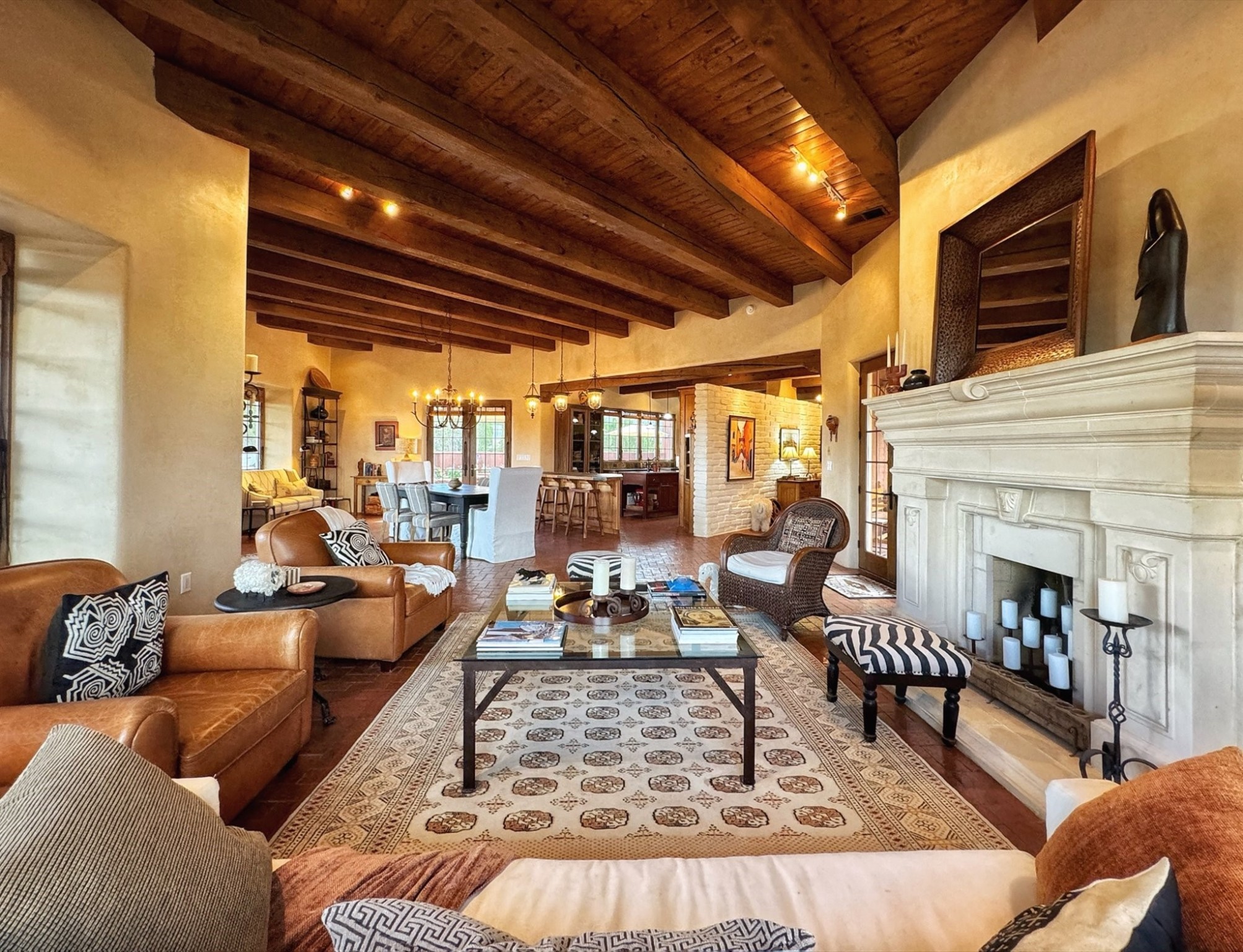 Luxurious single-level custom-built home in Silver Hills Ranch, just 20 mins from Santa Fe & 50 mins from Albuquerque International Sunport. Set on 14.37 acres adjacent to BLM and county open space, the property offers ample room to build equestrian facilities and accommodates up to 7 horses. The 3,360 sq ft main home--recently re-stuccoed--is paired with an 820 sq ft adobe casita--both enjoying 360 panoramic views of the Galisteo Basin, Cerrillos Hills, Sangre de Cristo, Sandia & Ortiz Mountains. The main home features 3 bedrooms, office/library, & 3 bathrooms (2 full, 1- 3/4), and welcomes you through a spacious courtyard with antique mesquite doors. Inside, the foyer features an exposed brick accent wall that adds character and warmth. The great room boasts soaring ceilings with wood beams & tongue-and-groove planks. A chef's kitchen offers Viking Pro appliances, alder cabinetry, honed granite & slate countertops, dual islands, custom hood, & two sinks (granite farm & copper). The primary suite includes a spacious walk-in closet and a luxurious full bathroom with dual marble sinks. Additional features include a library/flex room, media room, & 3 wood-burning fireplaces w/gas starters. Elegant finishes include herringbone brick & fossilized stone floors, hand-troweled plaster walls & Pella Architect Series windows. Seven sets of elegant 8-foot Pella French doors open effortlessly to five serene patios and courtyards, providing expansive outdoor living spaces perfect for entertaining, relaxing, and enjoying breathtaking panoramic views. Modern comforts: central A/C, in-floor radiant & forced-air heating, built-in fridge & whole-home stereo. Eco-friendly features include 24 solar panels, 500-gal propane tank, & 3 rainwater-harvesting cisterns. The casita offers stylish modern finishes & a bath--ideal for guests. Located in a desirable neighborhood w/low HOA fees & sensible CC&Rs. A rare blend of luxury, functionality & sustainability in an unmatched natural setting.