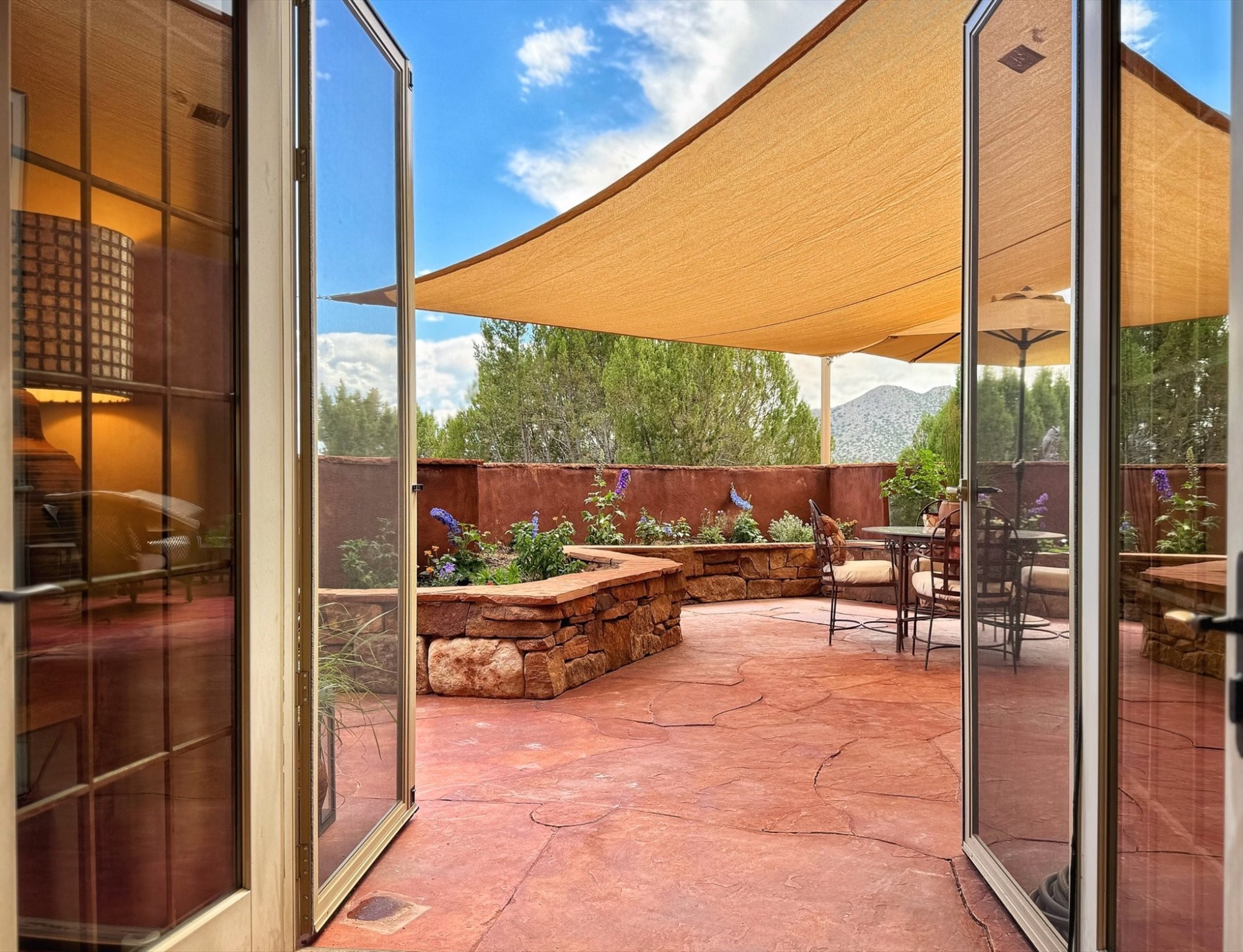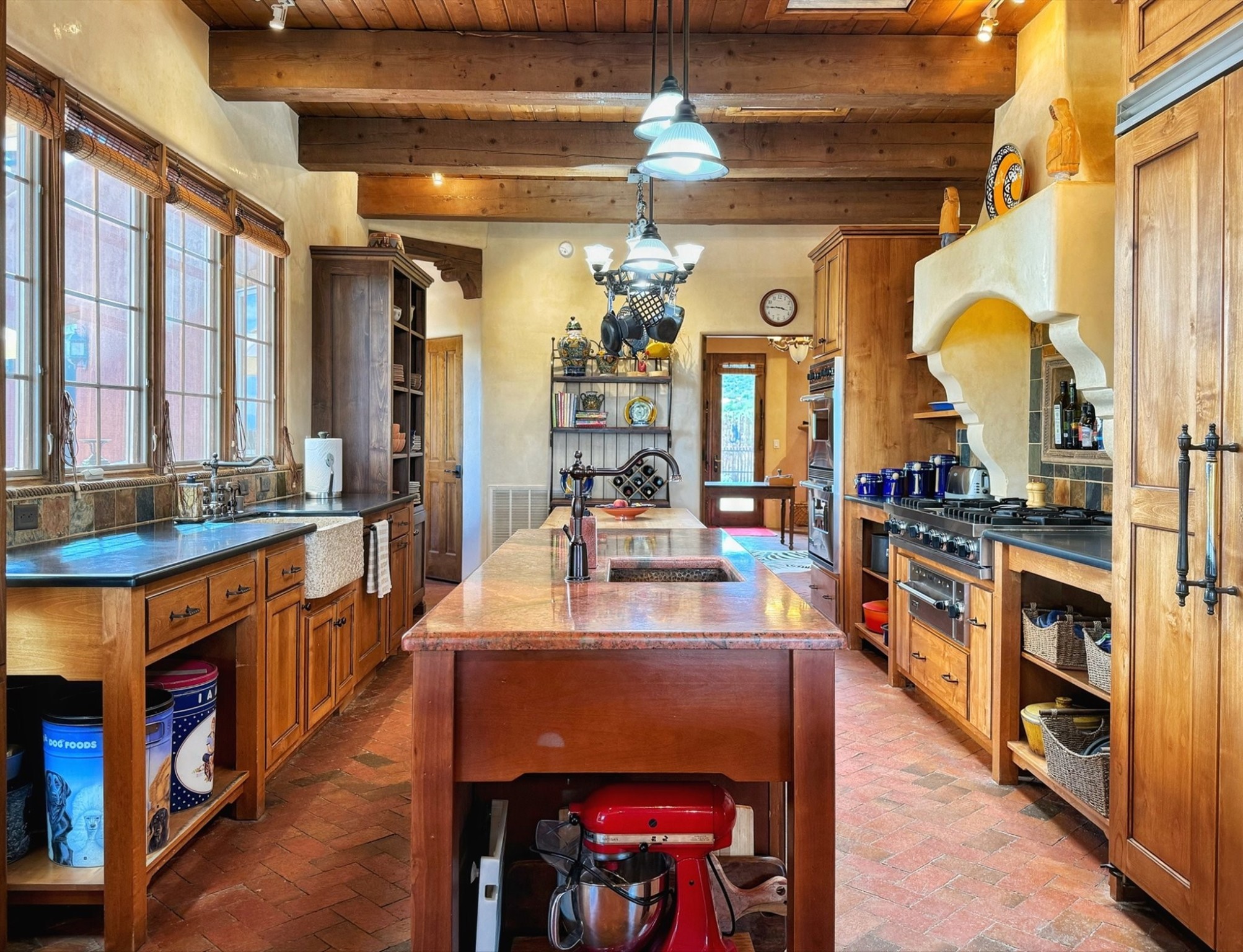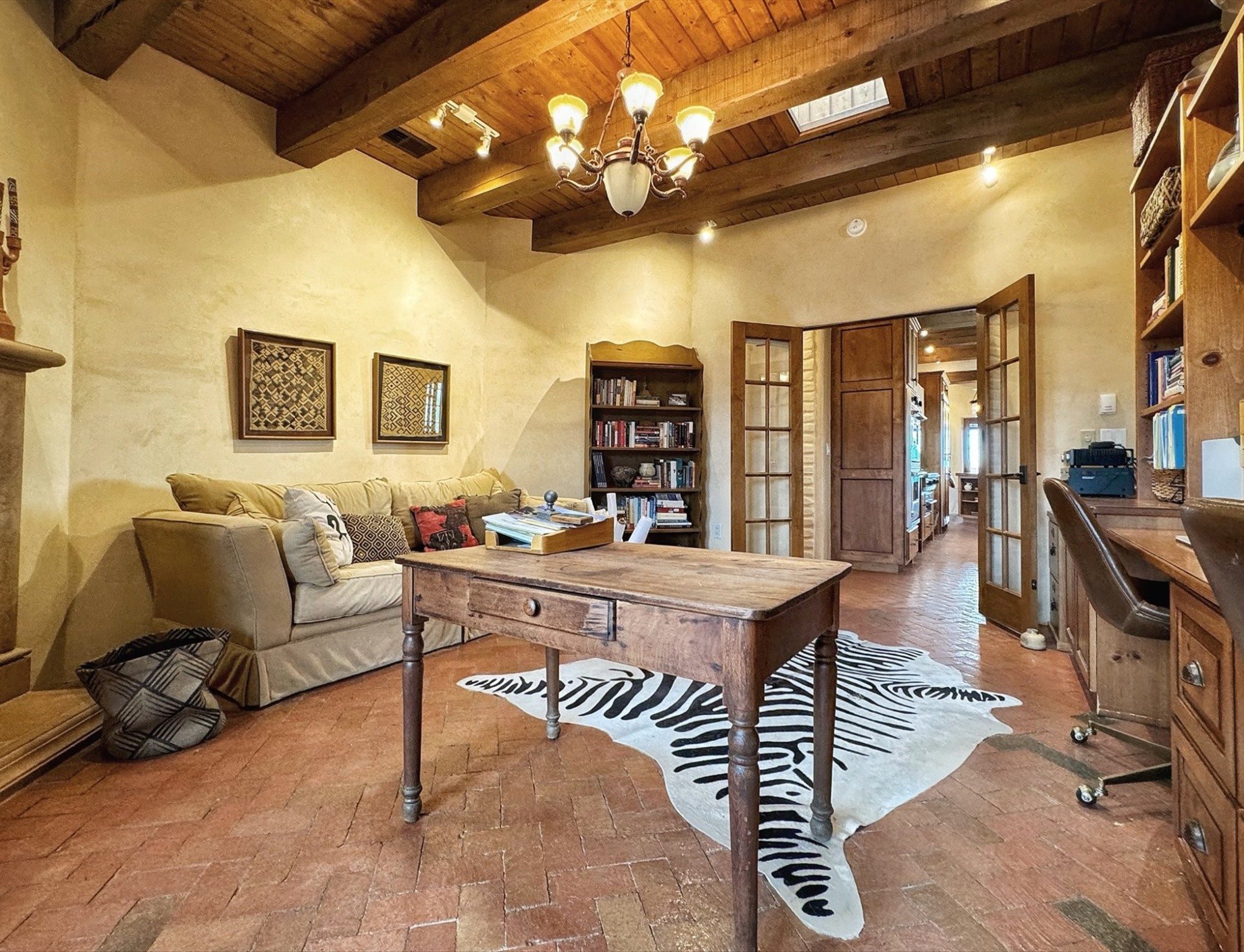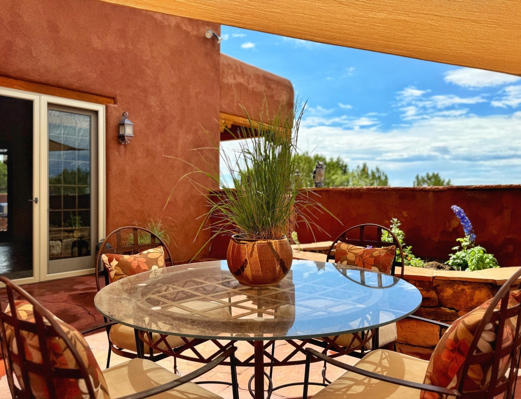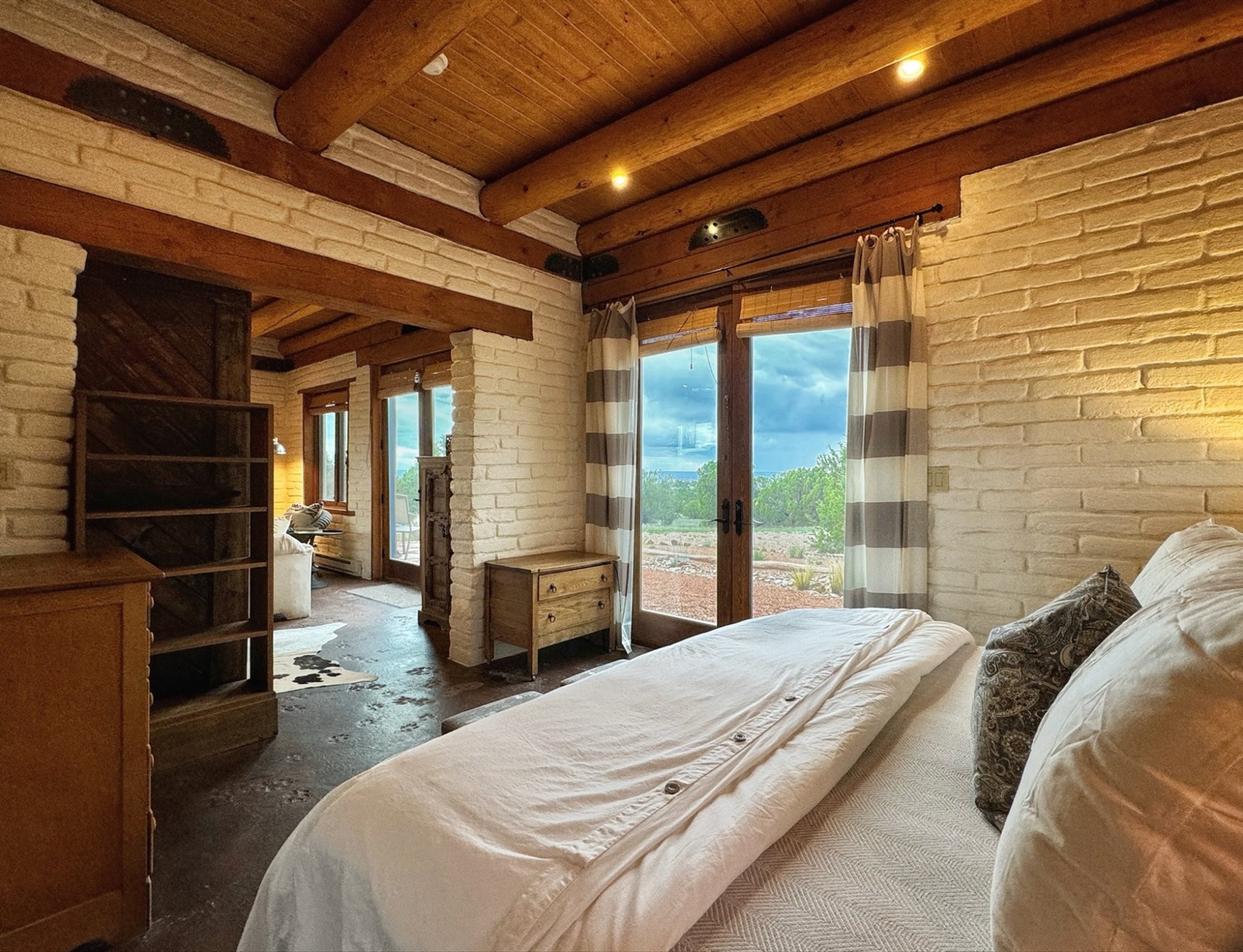 Luxurious single-level custom-built home in Silver Hills Ranch, just 20 mins from Santa Fe & 50 mins from Albuquerque International Sunport. Set on 14.37 acres adjacent to BLM and county open space, the property offers ample room to build equestrian facilities and accommodates up to 7 horses. The 3,360 sq ft main home--recently re-stuccoed--is paired with an 820 sq ft adobe casita--both enjoying 360 panoramic views of the Galisteo Basin, Cerrillos Hills, Sangre de Cristo, Sandia & Ortiz Mountains. The main home features 3 bedrooms, office/library, & 3 bathrooms (2 full, 1- 3/4), and welcomes you through a spacious courtyard with antique mesquite doors. Inside, the foyer features an exposed brick accent wall that adds character and warmth. The great room boasts soaring ceilings with wood beams & tongue-and-groove planks. A chef's kitchen offers Viking Pro appliances, alder cabinetry, honed granite & slate countertops, dual islands, custom hood, & two sinks (granite farm & copper). The primary suite includes a spacious walk-in closet and a luxurious full bathroom with dual marble sinks. Additional features include a library/flex room, media room, & 3 wood-burning fireplaces w/gas starters. Elegant finishes include herringbone brick & fossilized stone floors, hand-troweled plaster walls & Pella Architect Series windows. Seven sets of elegant 8-foot Pella French doors open effortlessly to five serene patios and courtyards, providing expansive outdoor living spaces perfect for entertaining, relaxing, and enjoying breathtaking panoramic views. Modern comforts: central A/C, in-floor radiant & forced-air heating, built-in fridge & whole-home stereo. Eco-friendly features include 24 solar panels, 500-gal propane tank, & 3 rainwater-harvesting cisterns. The casita offers stylish modern finishes & a bath--ideal for guests. Located in a desirable neighborhood w/low HOA fees & sensible CC&Rs. A rare blend of luxury, functionality & sustainability in an unmatched natural setting.