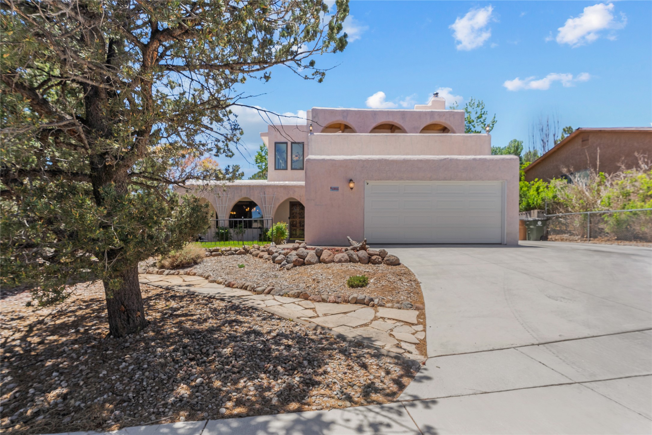 Charming Two-Story Corner Lot Home in North Mesa! Nestled behind a lush wall of mature trees and bushes, this home offers privacy, character, and a peaceful setting. Step inside through the brick-accented entry to discover warm vigas-beamed ceilings that carry throughout the main living spaces, adding rustic elegance. A cozy carpeted living room with a large front-facing window floods the space with natural light. Flowing seamlessly from the living room is the open great room, which combines the dining area and spacious family room anchored by a gas kiva fireplace and a tiled sunroom, offering a tranquil space to enjoy year-round. Adjacent to the great room is a white galley-style kitchen featuring quartz counters, stainless steel appliances, and a beautiful chandelier that highlights the ceiling beams. A convenient pass-through counter doubles as bar seating and opens to the family room, making it perfect for entertaining or casual meals. Down the hallway are two guest bedrooms and a guest bathroom. A spacious primary en-suite offers multiple closets and a bathroom with a walk-in shower. Also on this level is a laundry closet, as well as access to a two-car garage. Upstairs, the home continues to impress with a secondary family room featuring rich oak wood floors, a cozy wood-burning stove, and a wet bar--ideal for relaxing or hosting. A second tiled sunroom provides additional light-filled living space, while sliding doors open to a partially covered deck with ample room for lounge seating, outdoor dining, and entertaining. This upper level also includes an additional guest bedroom and a guest bathroom, offering flexible space for guests or hobbies. Throughout the home, you'll find double-pane windows with built-in blinds for energy efficiency and clean aesthetics. The backyard offers a private oasis with a grassy lawn with mature fruit trees. Also, take note of the large concrete driveway with RV parking and 30A RV power hookup.