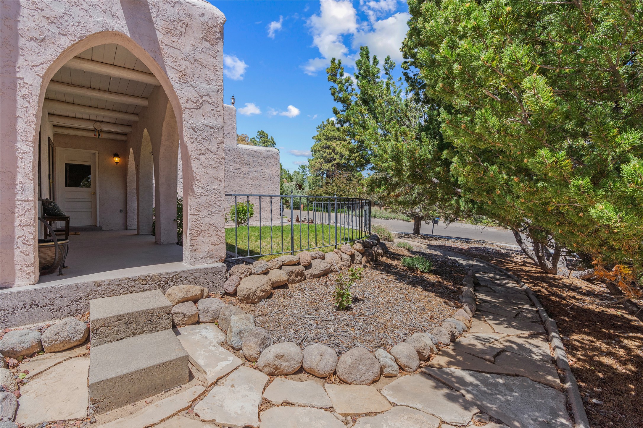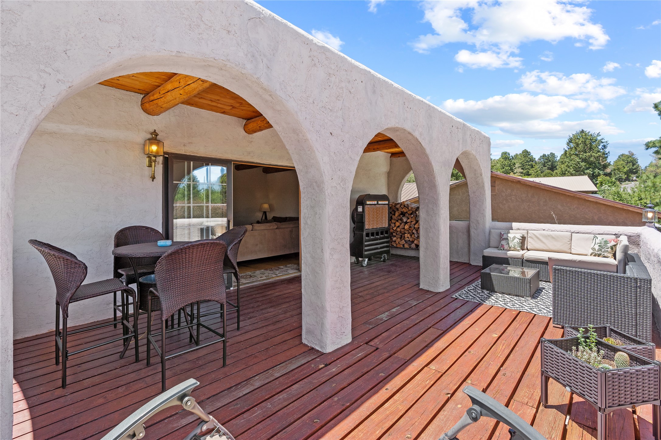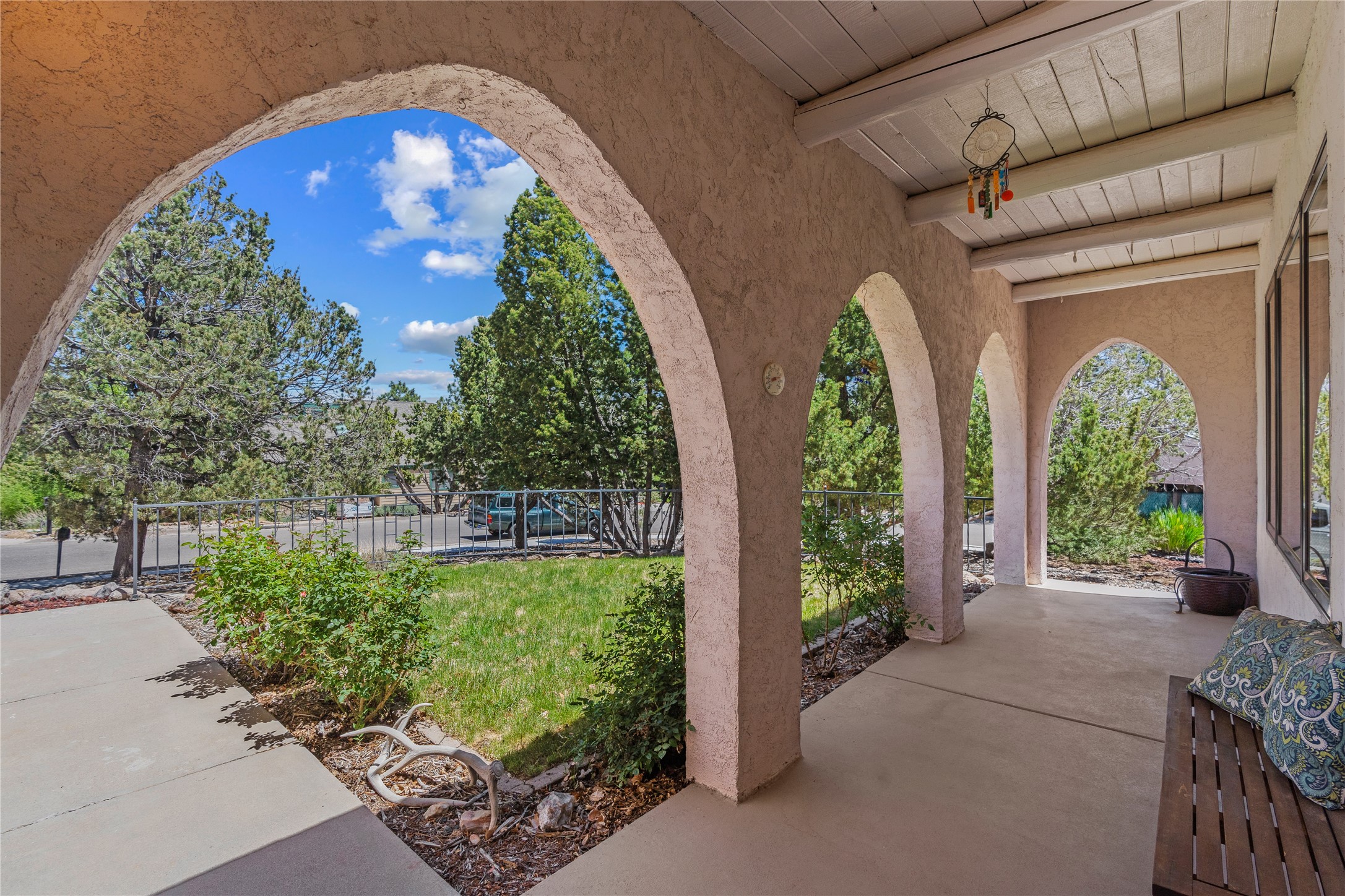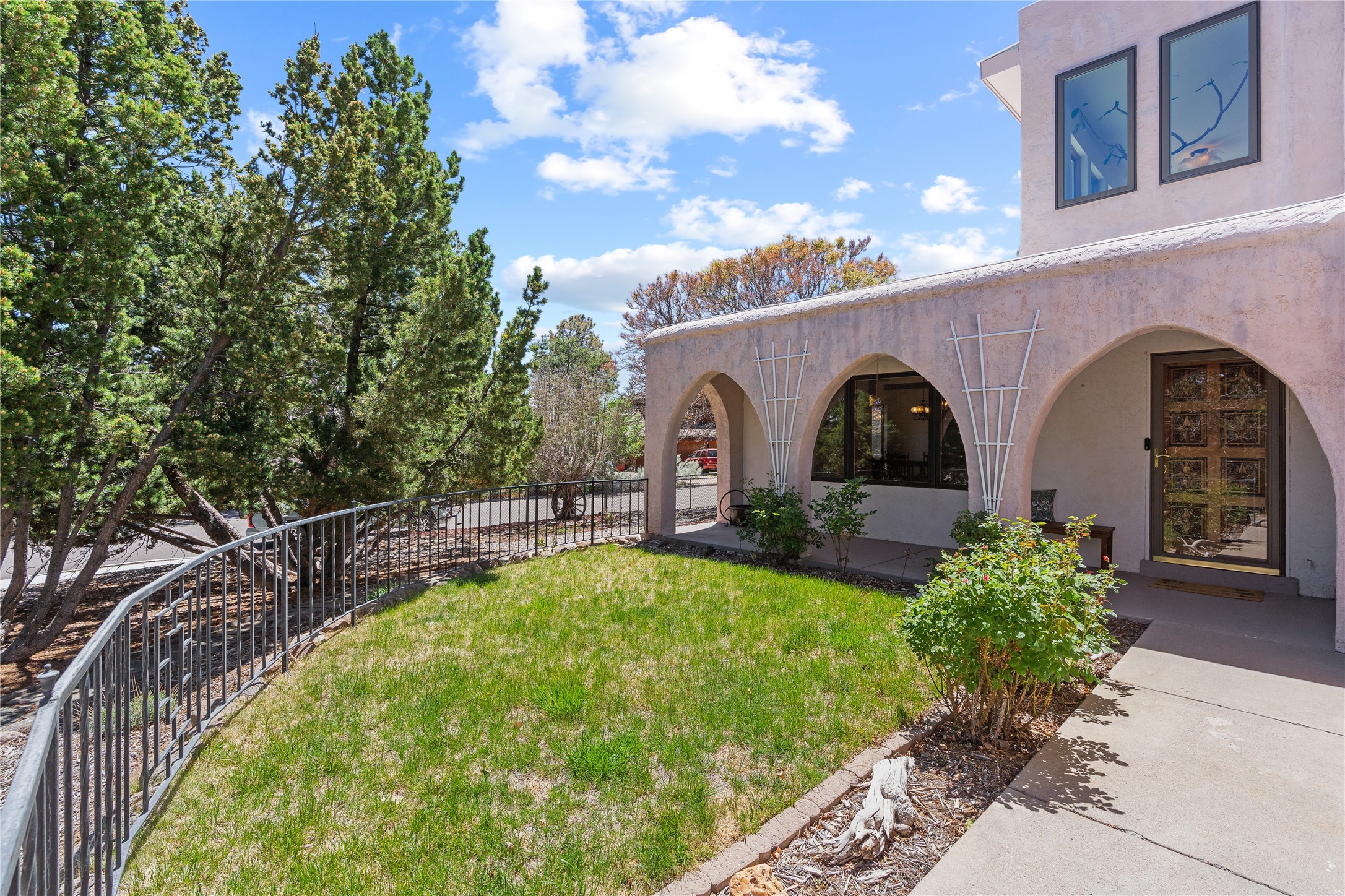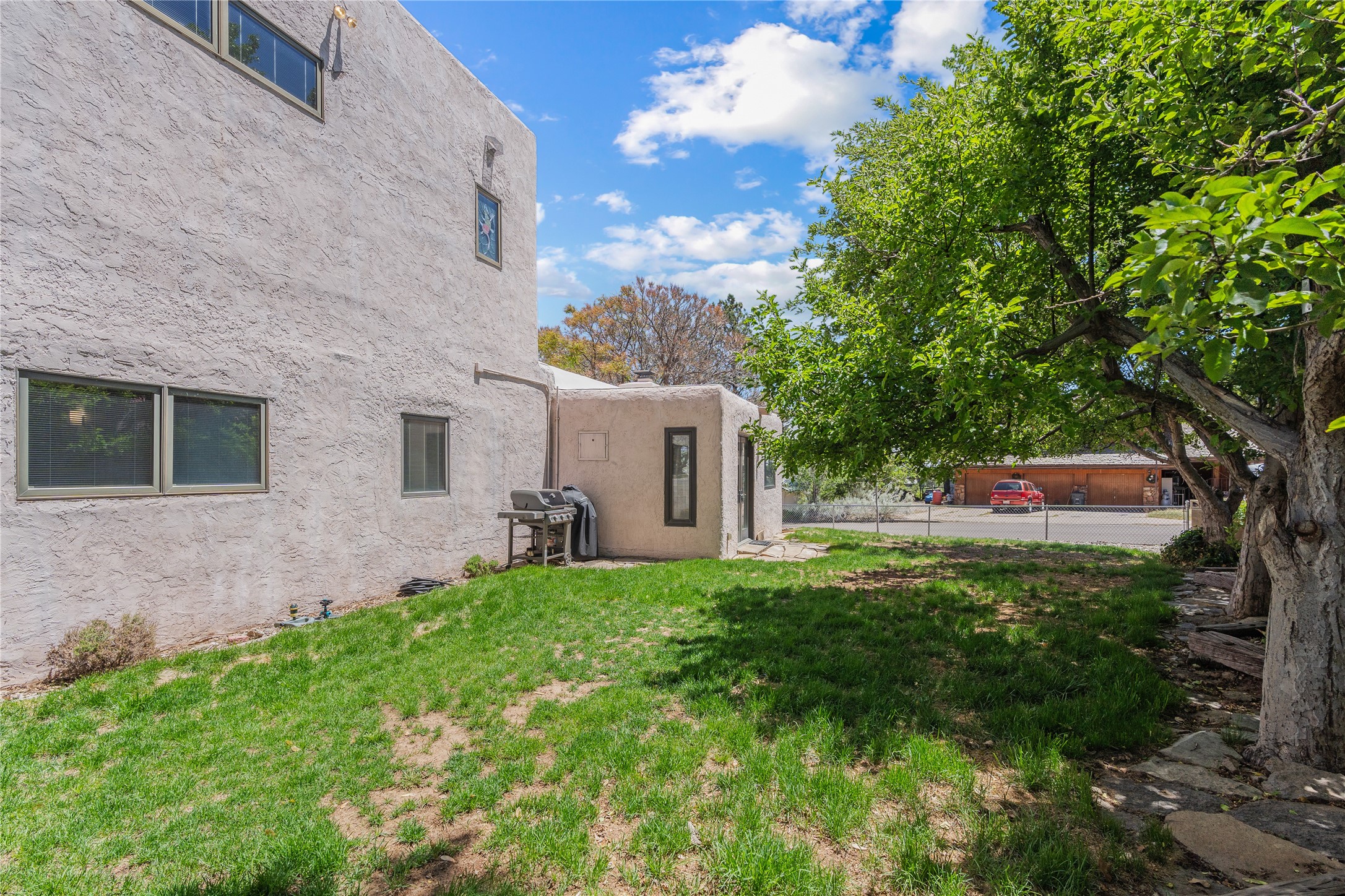 Charming Two-Story Corner Lot Home in North Mesa! Nestled behind a lush wall of mature trees and bushes, this home offers privacy, character, and a peaceful setting. Step inside through the brick-accented entry to discover warm vigas-beamed ceilings that carry throughout the main living spaces, adding rustic elegance. A cozy carpeted living room with a large front-facing window floods the space with natural light. Flowing seamlessly from the living room is the open great room, which combines the dining area and spacious family room anchored by a gas kiva fireplace and a tiled sunroom, offering a tranquil space to enjoy year-round. Adjacent to the great room is a white galley-style kitchen featuring quartz counters, stainless steel appliances, and a beautiful chandelier that highlights the ceiling beams. A convenient pass-through counter doubles as bar seating and opens to the family room, making it perfect for entertaining or casual meals. Down the hallway are two guest bedrooms and a guest bathroom. A spacious primary en-suite offers multiple closets and a bathroom with a walk-in shower. Also on this level is a laundry closet, as well as access to a two-car garage. Upstairs, the home continues to impress with a secondary family room featuring rich oak wood floors, a cozy wood-burning stove, and a wet bar--ideal for relaxing or hosting. A second tiled sunroom provides additional light-filled living space, while sliding doors open to a partially covered deck with ample room for lounge seating, outdoor dining, and entertaining. This upper level also includes an additional guest bedroom and a guest bathroom, offering flexible space for guests or hobbies. Throughout the home, you'll find double-pane windows with built-in blinds for energy efficiency and clean aesthetics. The backyard offers a private oasis with a grassy lawn with mature fruit trees. Also, take note of the large concrete driveway with RV parking and 30A RV power hookup.