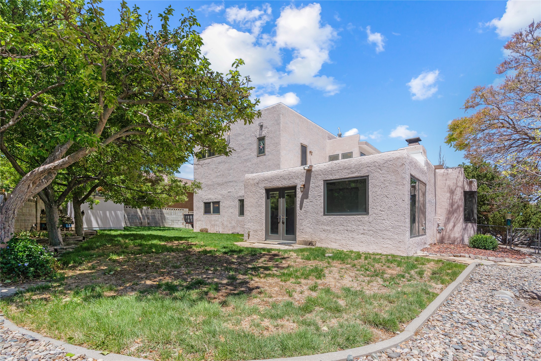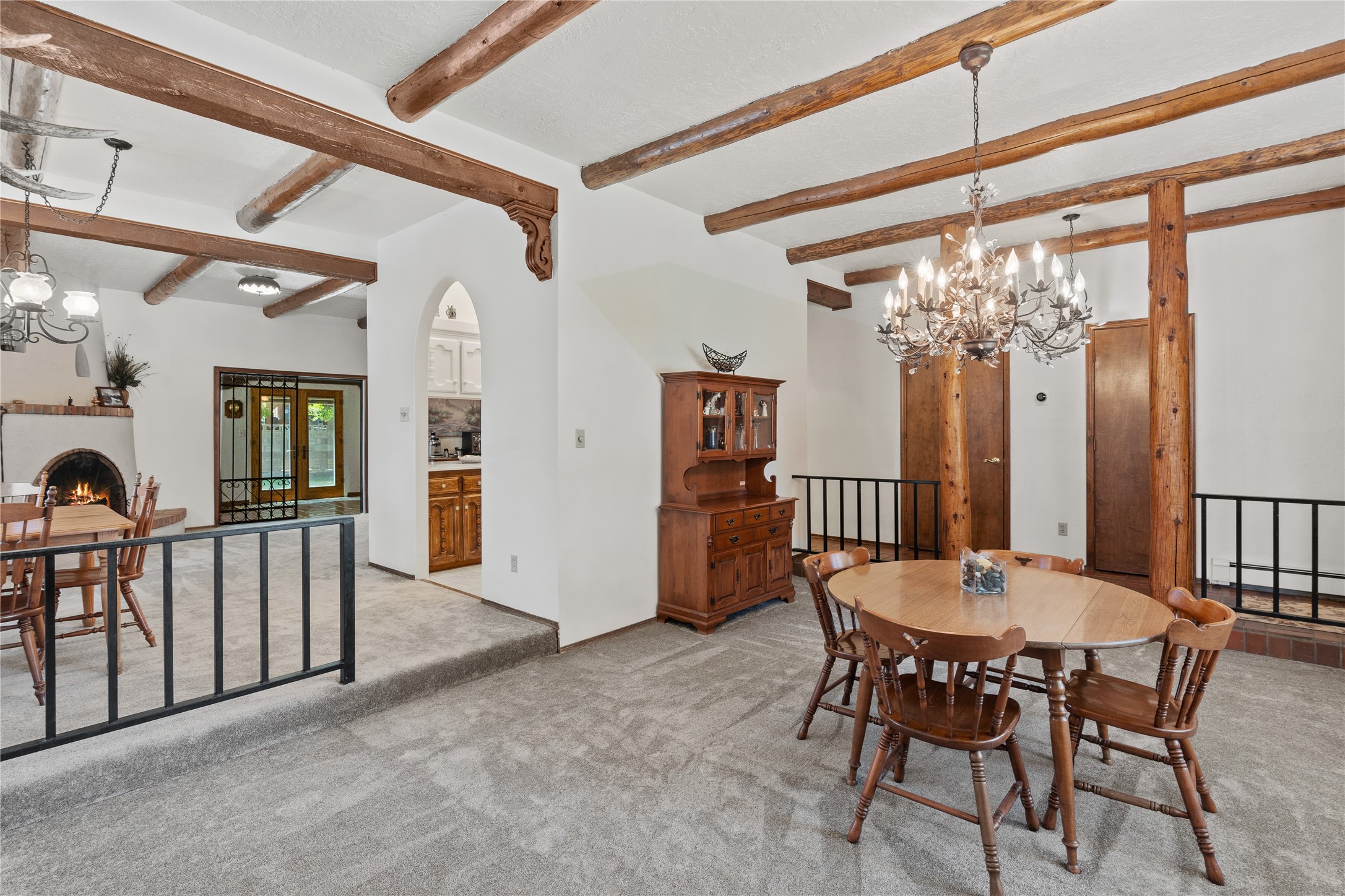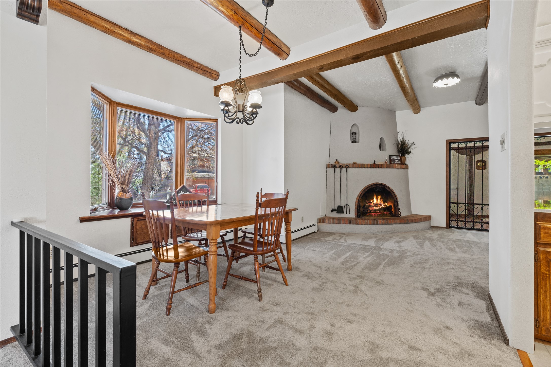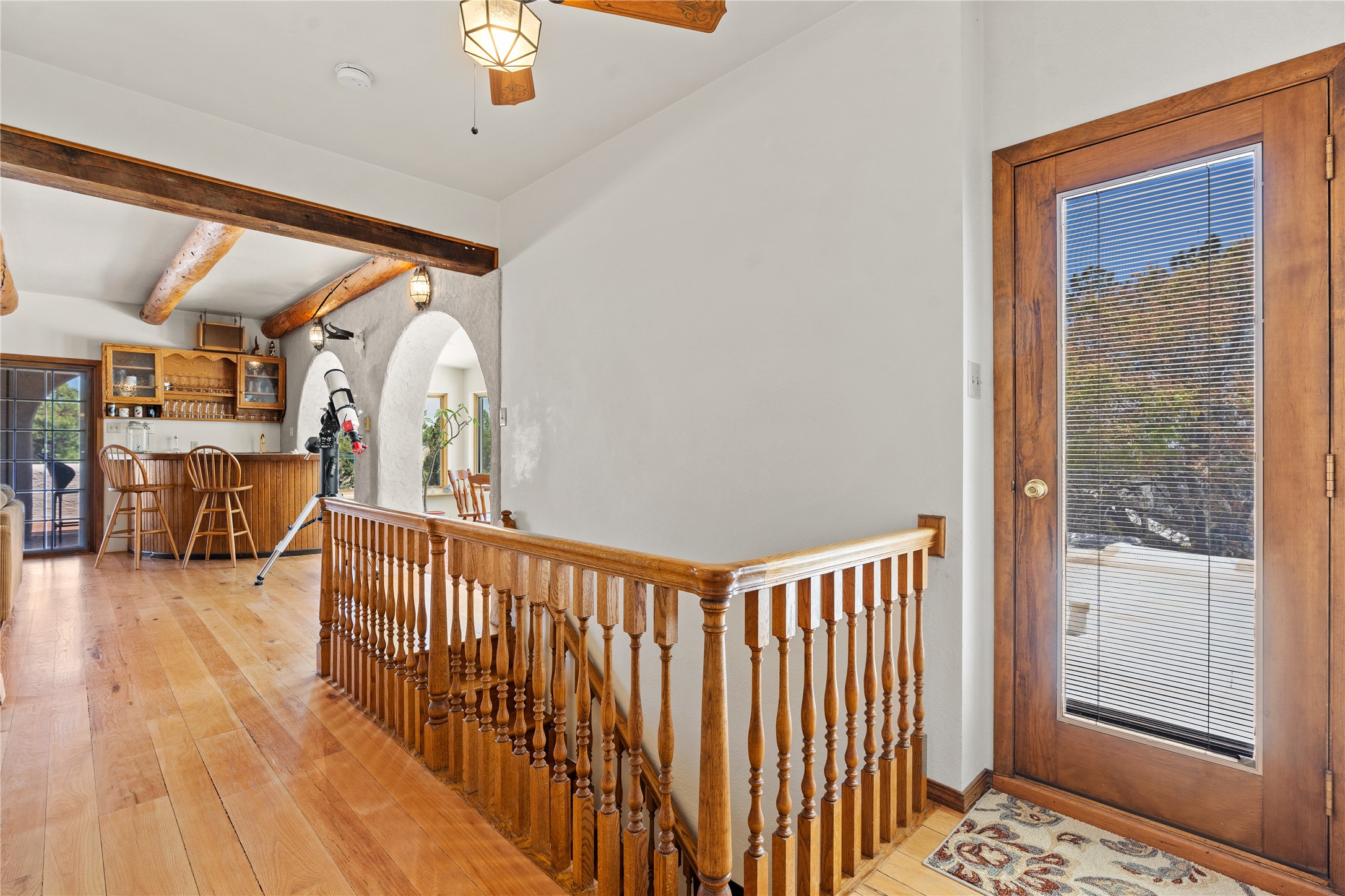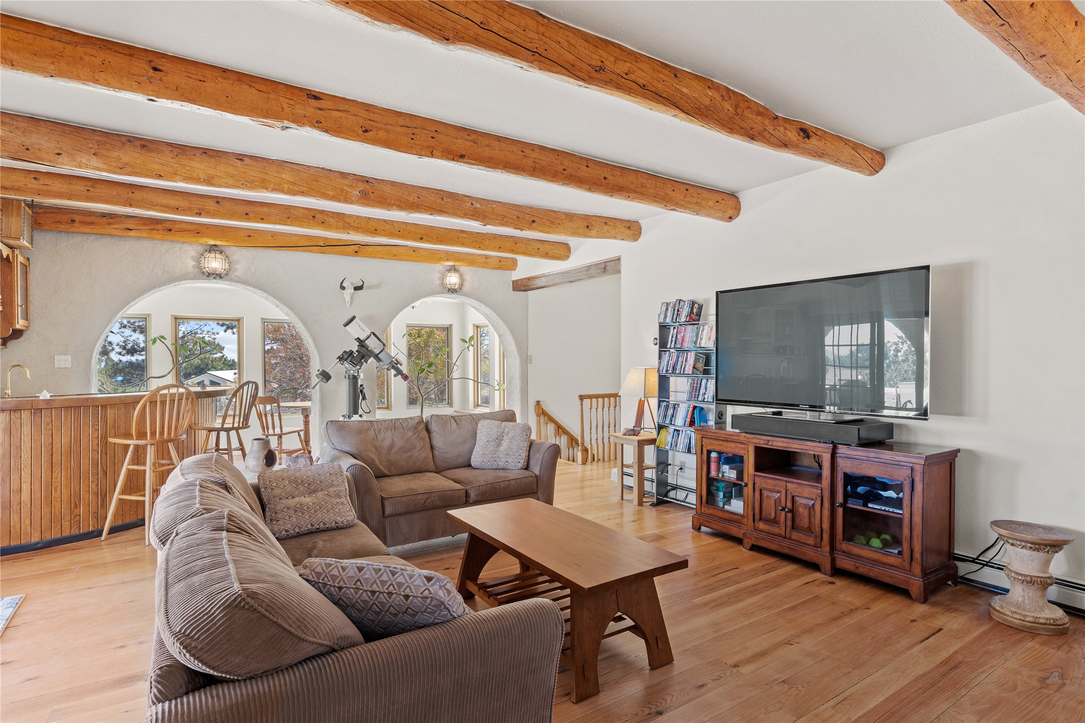 Charming Two-Story Corner Lot Home in North Mesa! Nestled behind a lush wall of mature trees and bushes, this home offers privacy, character, and a peaceful setting. Step inside through the brick-accented entry to discover warm vigas-beamed ceilings that carry throughout the main living spaces, adding rustic elegance. A cozy carpeted living room with a large front-facing window floods the space with natural light. Flowing seamlessly from the living room is the open great room, which combines the dining area and spacious family room anchored by a gas kiva fireplace and a tiled sunroom, offering a tranquil space to enjoy year-round. Adjacent to the great room is a white galley-style kitchen featuring quartz counters, stainless steel appliances, and a beautiful chandelier that highlights the ceiling beams. A convenient pass-through counter doubles as bar seating and opens to the family room, making it perfect for entertaining or casual meals. Down the hallway are two guest bedrooms and a guest bathroom. A spacious primary en-suite offers multiple closets and a bathroom with a walk-in shower. Also on this level is a laundry closet, as well as access to a two-car garage. Upstairs, the home continues to impress with a secondary family room featuring rich oak wood floors, a cozy wood-burning stove, and a wet bar--ideal for relaxing or hosting. A second tiled sunroom provides additional light-filled living space, while sliding doors open to a partially covered deck with ample room for lounge seating, outdoor dining, and entertaining. This upper level also includes an additional guest bedroom and a guest bathroom, offering flexible space for guests or hobbies. Throughout the home, you'll find double-pane windows with built-in blinds for energy efficiency and clean aesthetics. The backyard offers a private oasis with a grassy lawn with mature fruit trees. Also, take note of the large concrete driveway with RV parking and 30A RV power hookup.