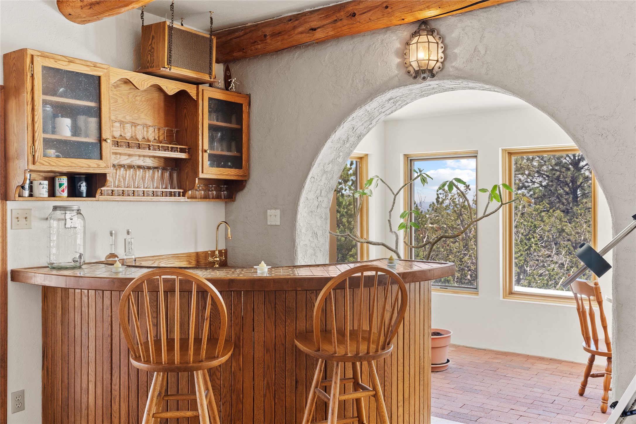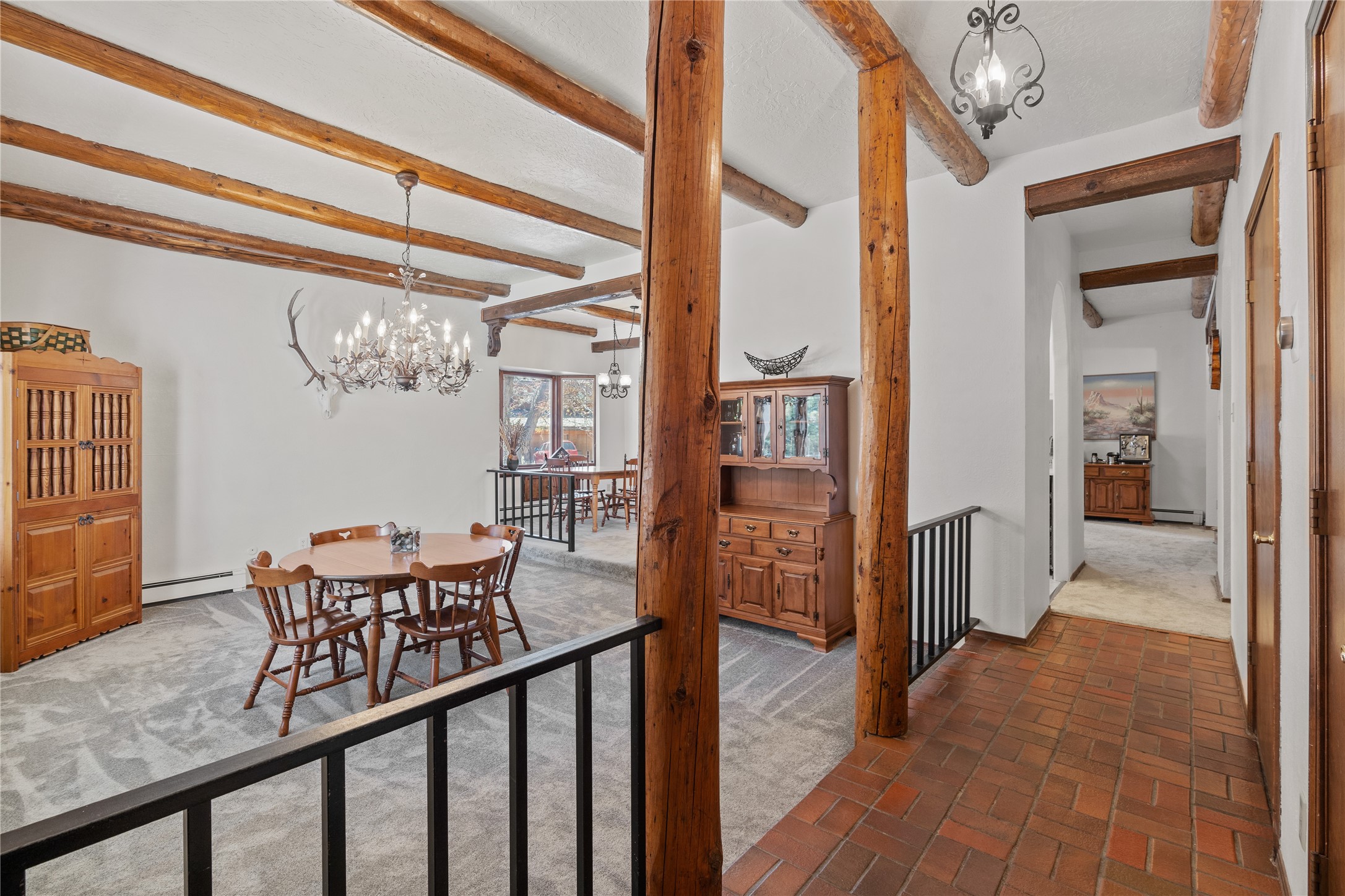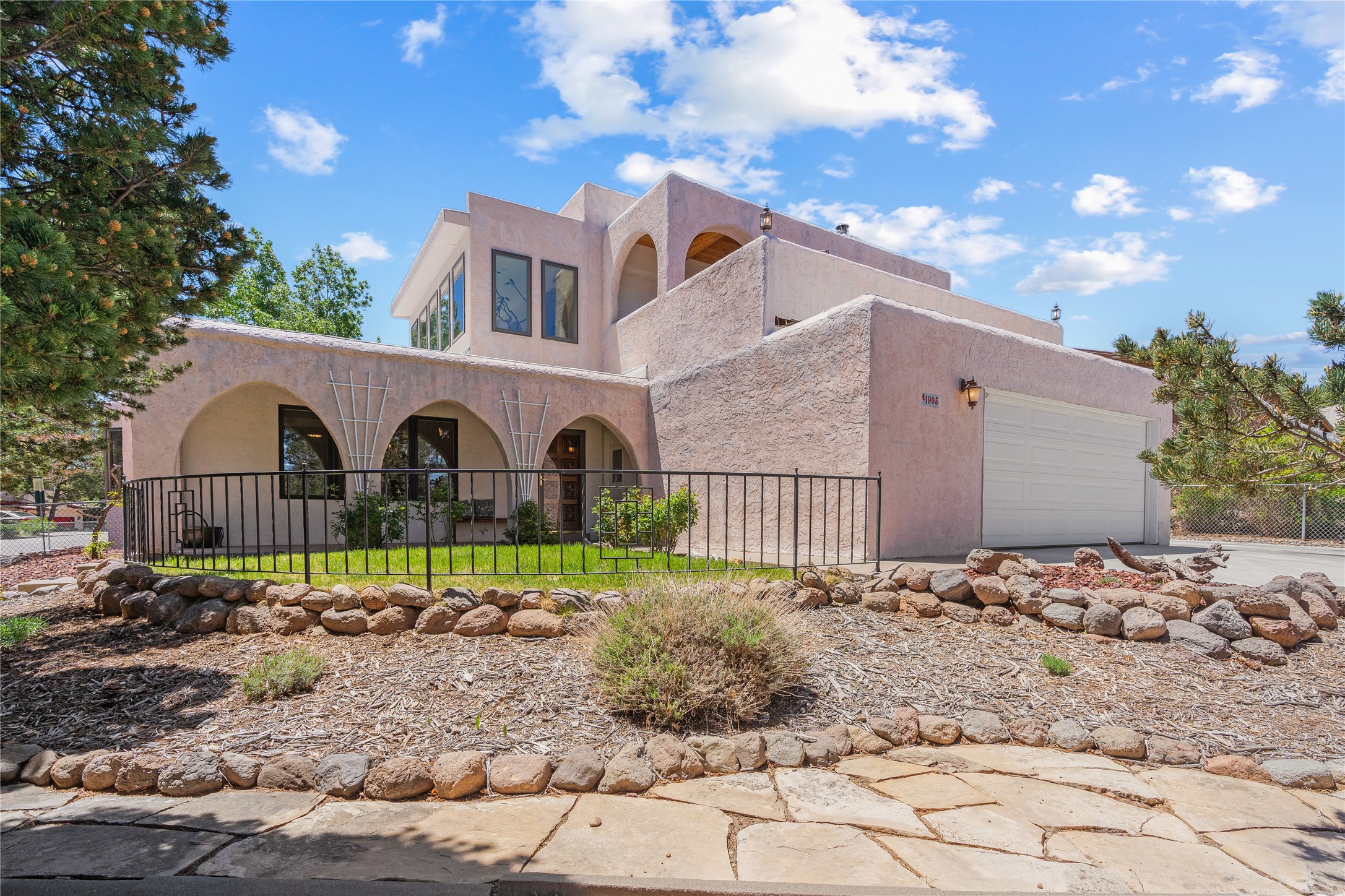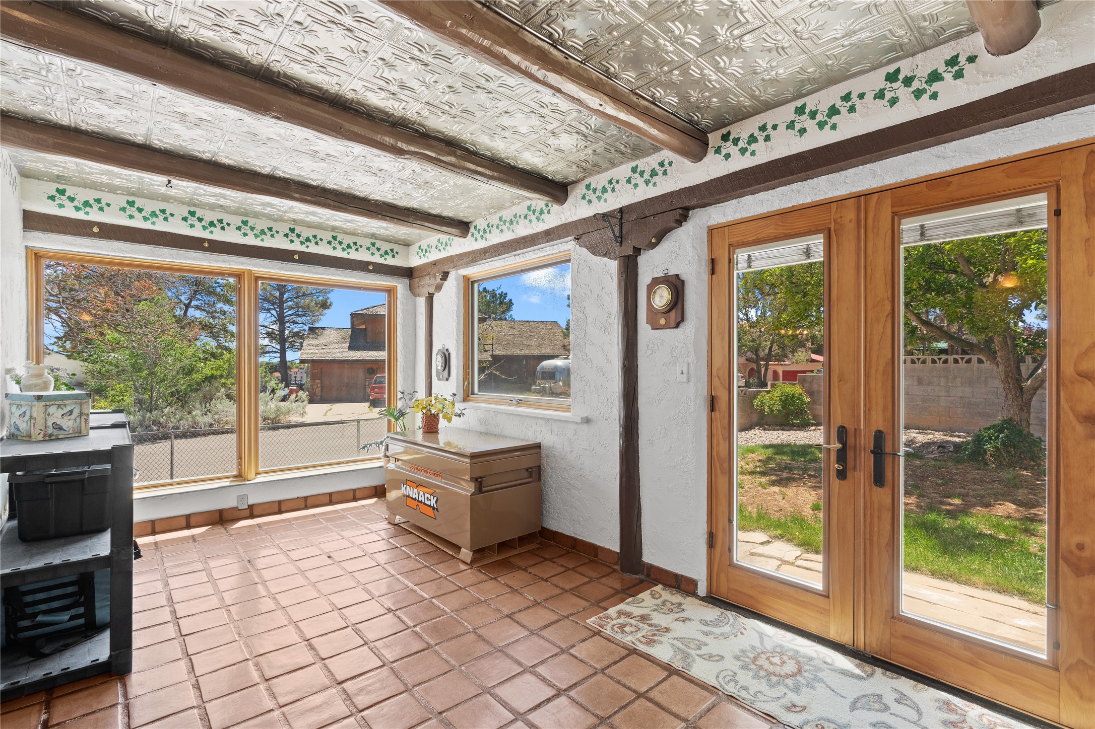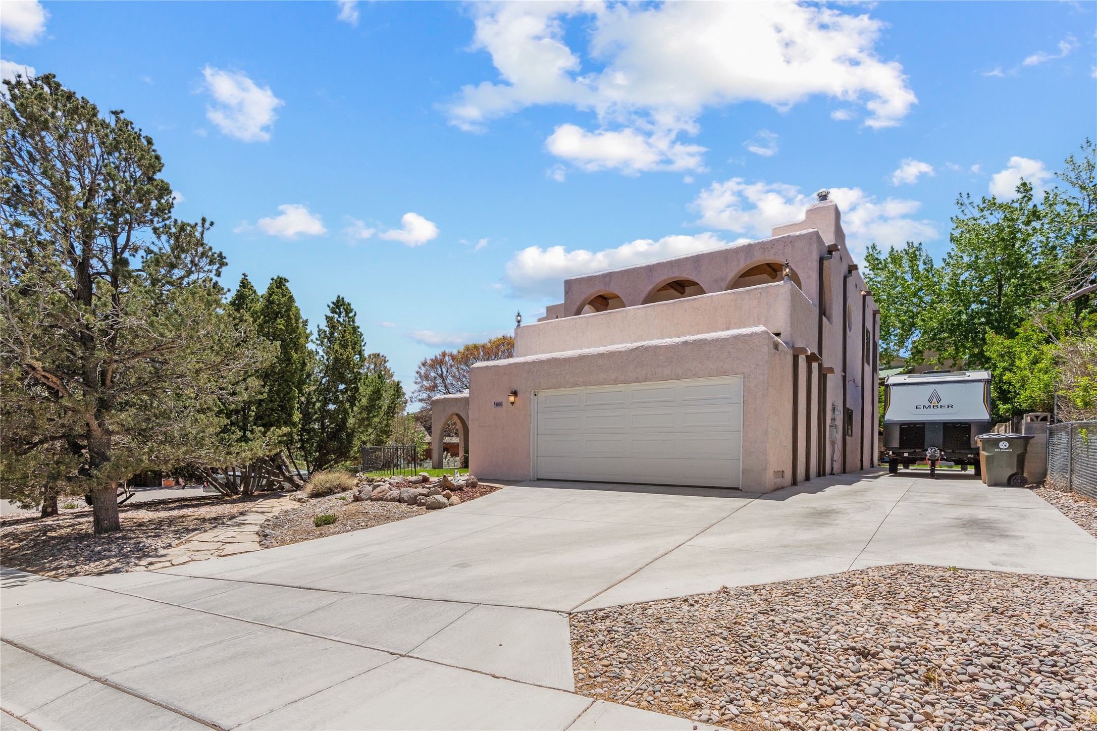 Charming Two-Story Corner Lot Home in North Mesa! Nestled behind a lush wall of mature trees and bushes, this home offers privacy, character, and a peaceful setting. Step inside through the brick-accented entry to discover warm vigas-beamed ceilings that carry throughout the main living spaces, adding rustic elegance. A cozy carpeted living room with a large front-facing window floods the space with natural light. Flowing seamlessly from the living room is the open great room, which combines the dining area and spacious family room anchored by a gas kiva fireplace and a tiled sunroom, offering a tranquil space to enjoy year-round. Adjacent to the great room is a white galley-style kitchen featuring quartz counters, stainless steel appliances, and a beautiful chandelier that highlights the ceiling beams. A convenient pass-through counter doubles as bar seating and opens to the family room, making it perfect for entertaining or casual meals. Down the hallway are two guest bedrooms and a guest bathroom. A spacious primary en-suite offers multiple closets and a bathroom with a walk-in shower. Also on this level is a laundry closet, as well as access to a two-car garage. Upstairs, the home continues to impress with a secondary family room featuring rich oak wood floors, a cozy wood-burning stove, and a wet bar--ideal for relaxing or hosting. A second tiled sunroom provides additional light-filled living space, while sliding doors open to a partially covered deck with ample room for lounge seating, outdoor dining, and entertaining. This upper level also includes an additional guest bedroom and a guest bathroom, offering flexible space for guests or hobbies. Throughout the home, you'll find double-pane windows with built-in blinds for energy efficiency and clean aesthetics. The backyard offers a private oasis with a grassy lawn with mature fruit trees. Also, take note of the large concrete driveway with RV parking and 30A RV power hookup.