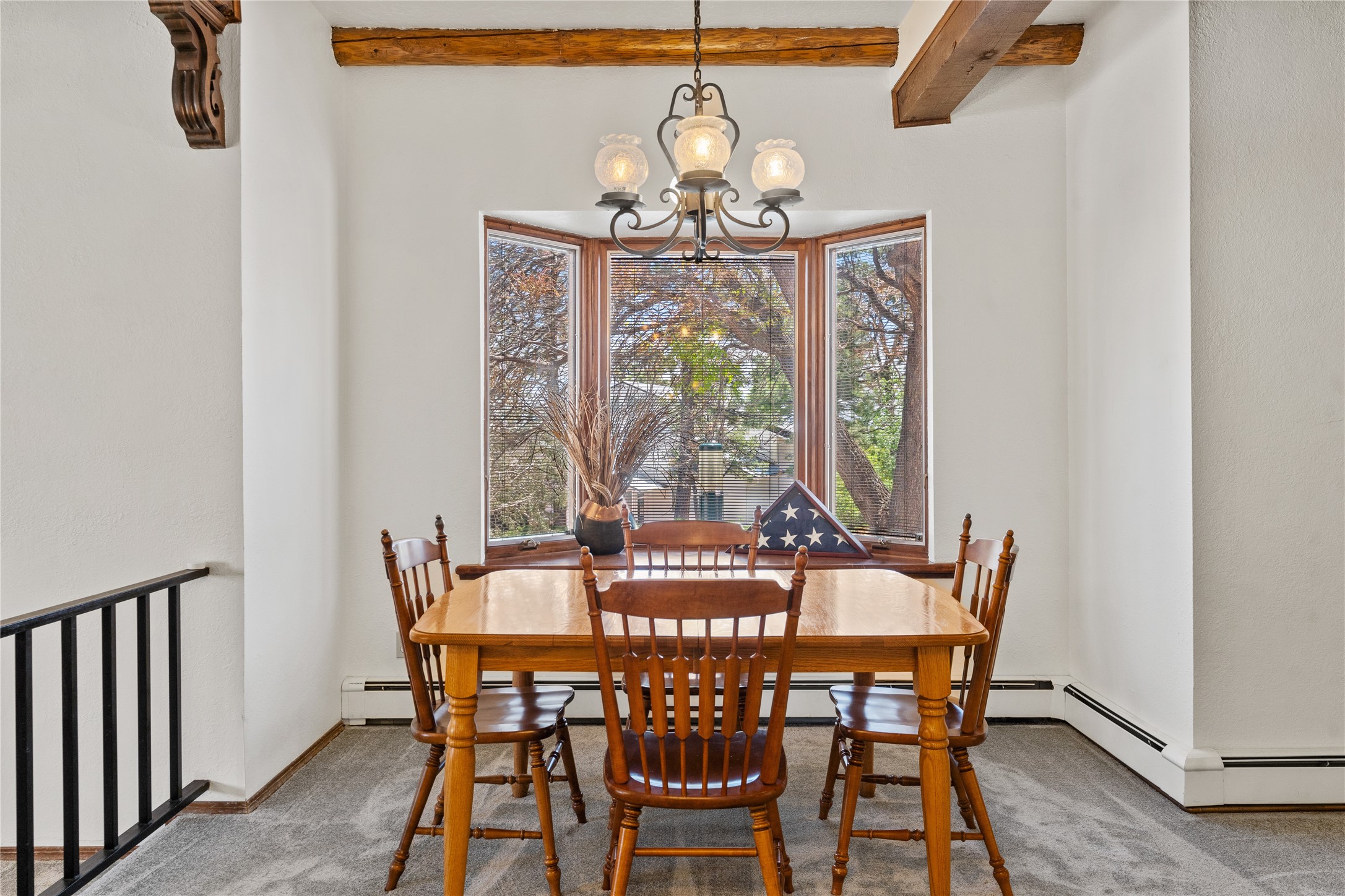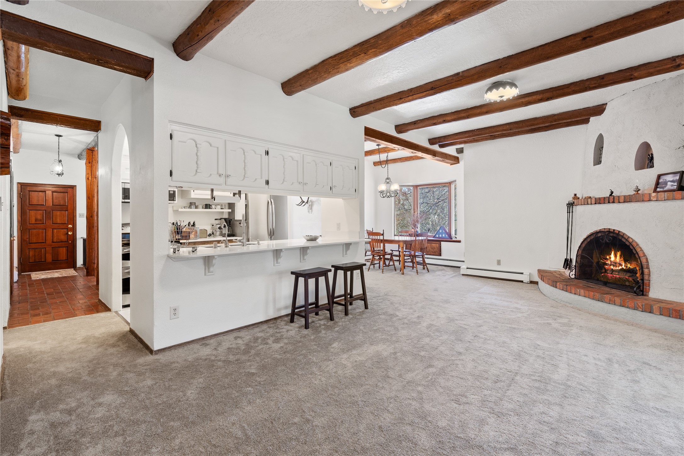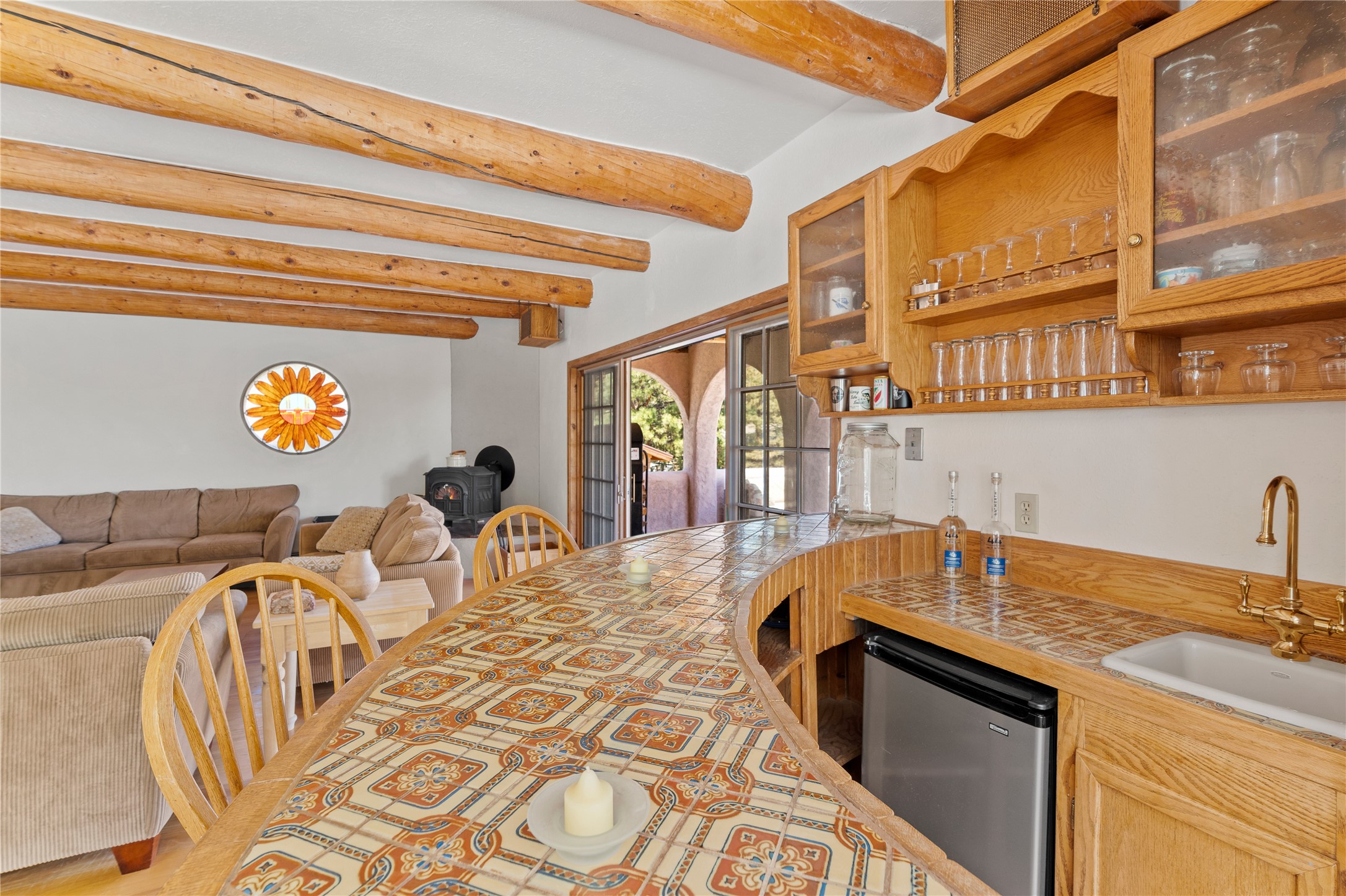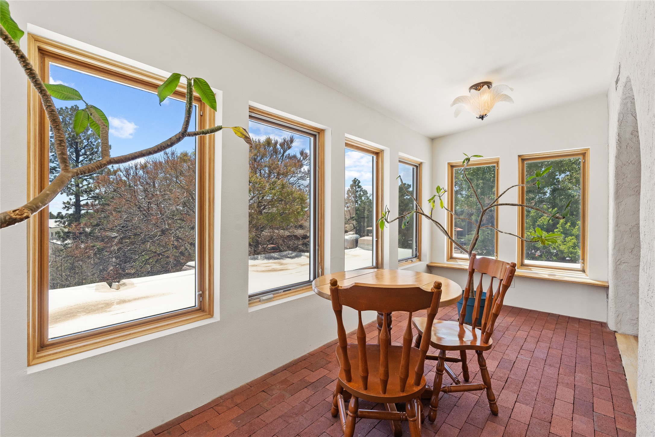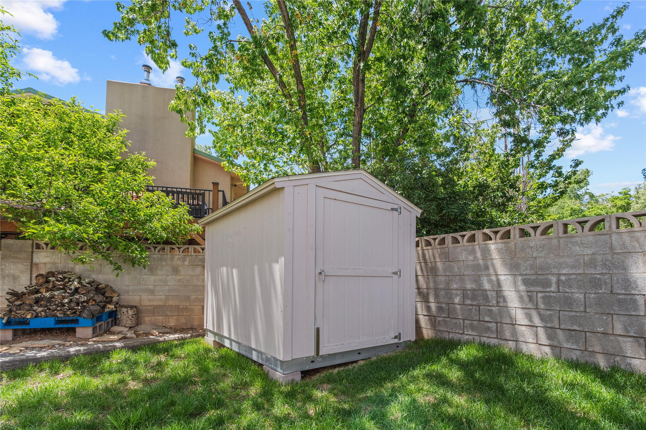 Charming Two-Story Corner Lot Home in North Mesa! Nestled behind a lush wall of mature trees and bushes, this home offers privacy, character, and a peaceful setting. Step inside through the brick-accented entry to discover warm vigas-beamed ceilings that carry throughout the main living spaces, adding rustic elegance. A cozy carpeted living room with a large front-facing window floods the space with natural light. Flowing seamlessly from the living room is the open great room, which combines the dining area and spacious family room anchored by a gas kiva fireplace and a tiled sunroom, offering a tranquil space to enjoy year-round. Adjacent to the great room is a white galley-style kitchen featuring quartz counters, stainless steel appliances, and a beautiful chandelier that highlights the ceiling beams. A convenient pass-through counter doubles as bar seating and opens to the family room, making it perfect for entertaining or casual meals. Down the hallway are two guest bedrooms and a guest bathroom. A spacious primary en-suite offers multiple closets and a bathroom with a walk-in shower. Also on this level is a laundry closet, as well as access to a two-car garage. Upstairs, the home continues to impress with a secondary family room featuring rich oak wood floors, a cozy wood-burning stove, and a wet bar--ideal for relaxing or hosting. A second tiled sunroom provides additional light-filled living space, while sliding doors open to a partially covered deck with ample room for lounge seating, outdoor dining, and entertaining. This upper level also includes an additional guest bedroom and a guest bathroom, offering flexible space for guests or hobbies. Throughout the home, you'll find double-pane windows with built-in blinds for energy efficiency and clean aesthetics. The backyard offers a private oasis with a grassy lawn with mature fruit trees. Also, take note of the large concrete driveway with RV parking and 30A RV power hookup.