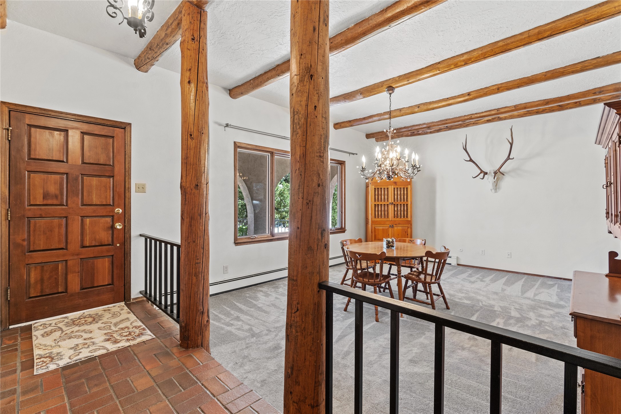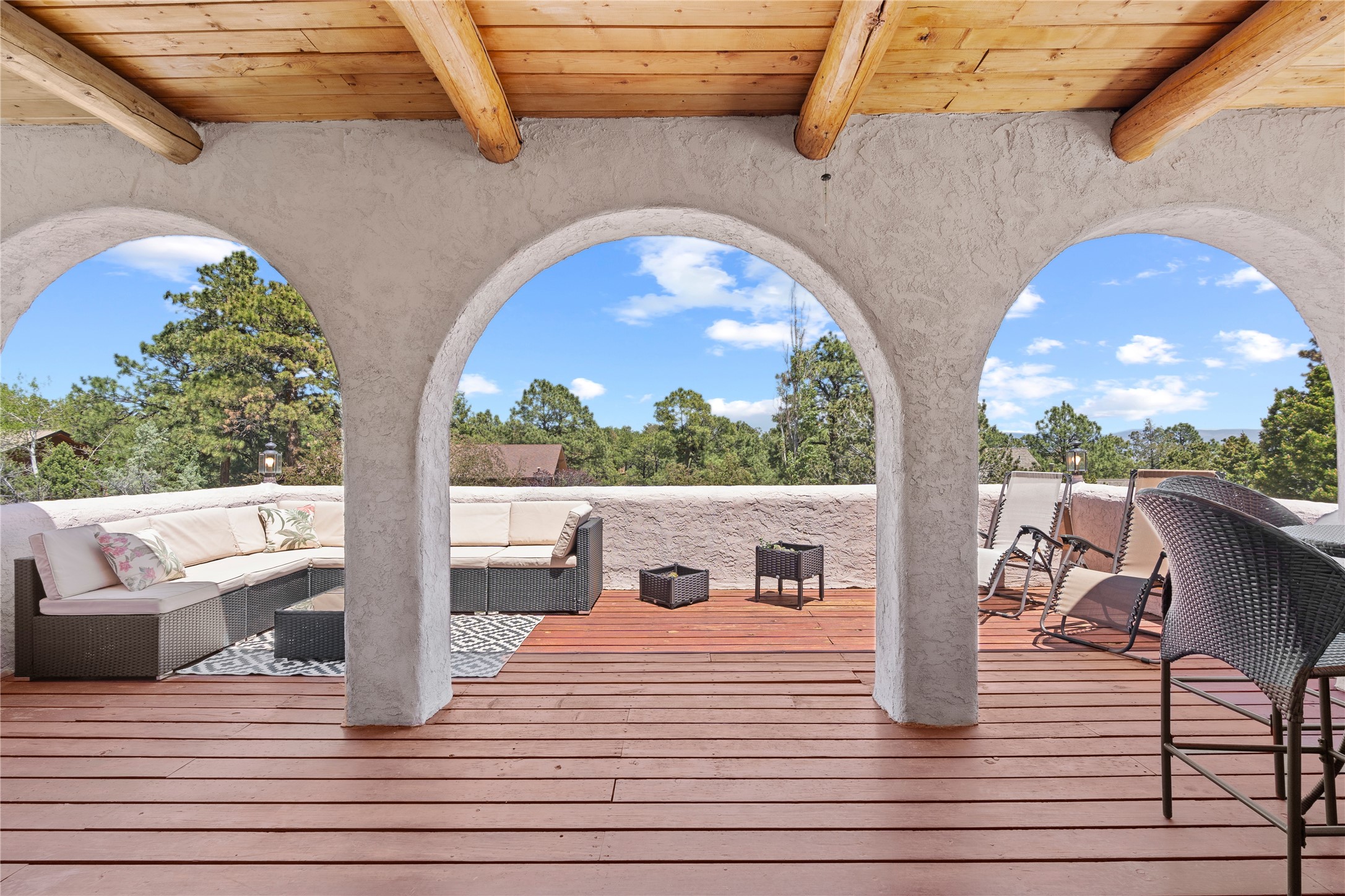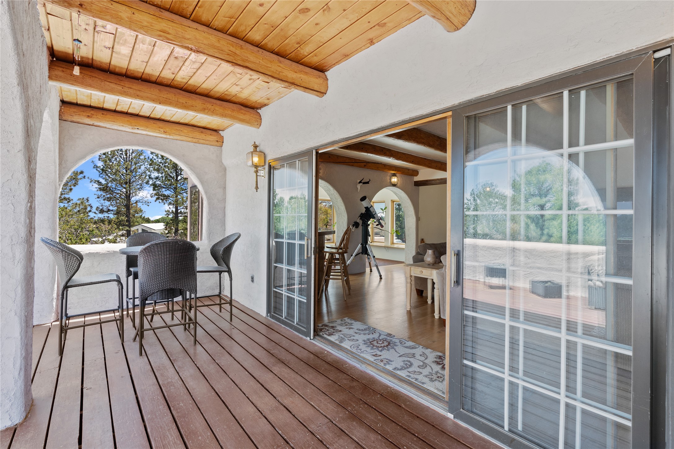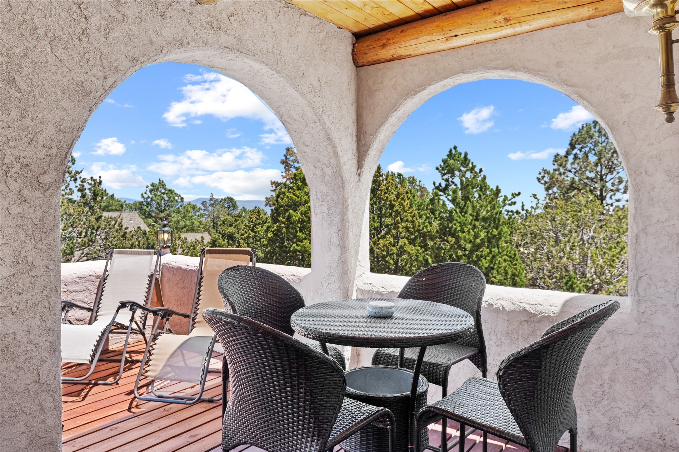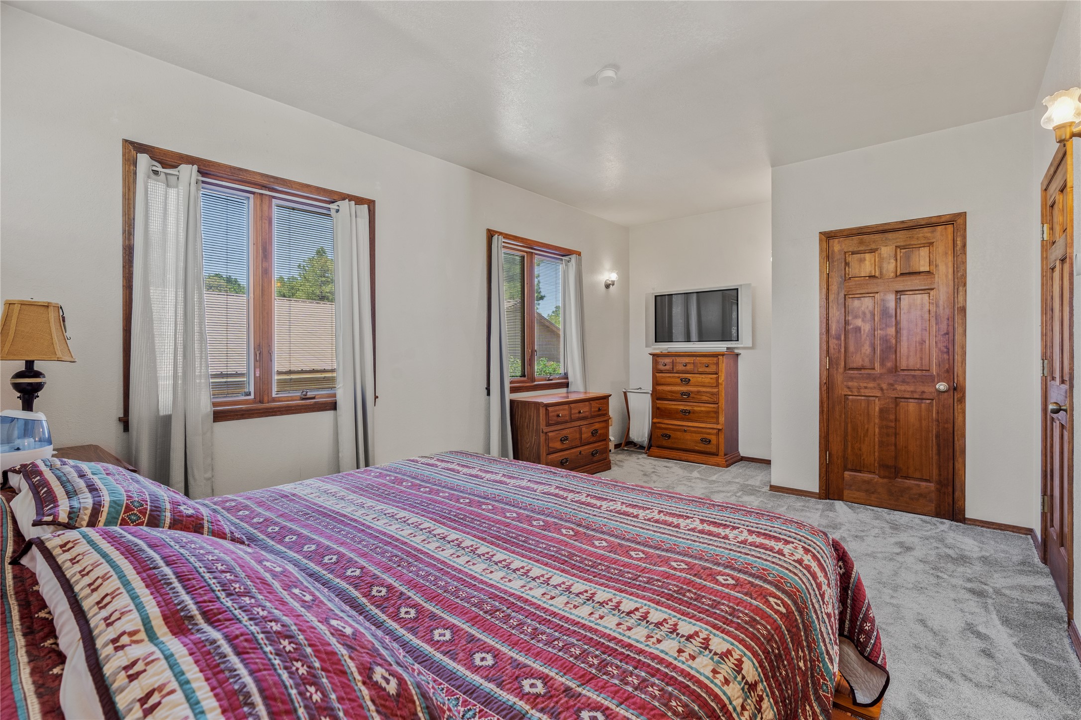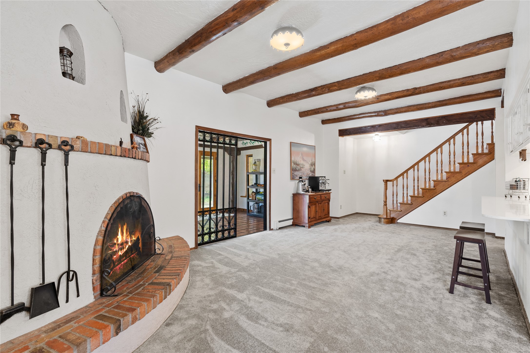 Charming Two-Story Corner Lot Home in North Mesa! Nestled behind a lush wall of mature trees and bushes, this home offers privacy, character, and a peaceful setting. Step inside through the brick-accented entry to discover warm vigas-beamed ceilings that carry throughout the main living spaces, adding rustic elegance. A cozy carpeted living room with a large front-facing window floods the space with natural light. Flowing seamlessly from the living room is the open great room, which combines the dining area and spacious family room anchored by a gas kiva fireplace and a tiled sunroom, offering a tranquil space to enjoy year-round. Adjacent to the great room is a white galley-style kitchen featuring quartz counters, stainless steel appliances, and a beautiful chandelier that highlights the ceiling beams. A convenient pass-through counter doubles as bar seating and opens to the family room, making it perfect for entertaining or casual meals. Down the hallway are two guest bedrooms and a guest bathroom. A spacious primary en-suite offers multiple closets and a bathroom with a walk-in shower. Also on this level is a laundry closet, as well as access to a two-car garage. Upstairs, the home continues to impress with a secondary family room featuring rich oak wood floors, a cozy wood-burning stove, and a wet bar--ideal for relaxing or hosting. A second tiled sunroom provides additional light-filled living space, while sliding doors open to a partially covered deck with ample room for lounge seating, outdoor dining, and entertaining. This upper level also includes an additional guest bedroom and a guest bathroom, offering flexible space for guests or hobbies. Throughout the home, you'll find double-pane windows with built-in blinds for energy efficiency and clean aesthetics. The backyard offers a private oasis with a grassy lawn with mature fruit trees. Also, take note of the large concrete driveway with RV parking and 30A RV power hookup.